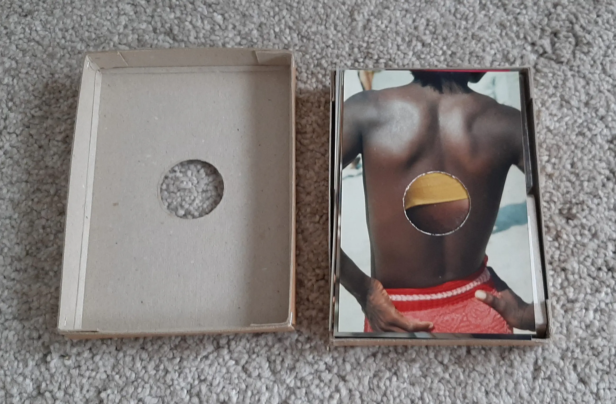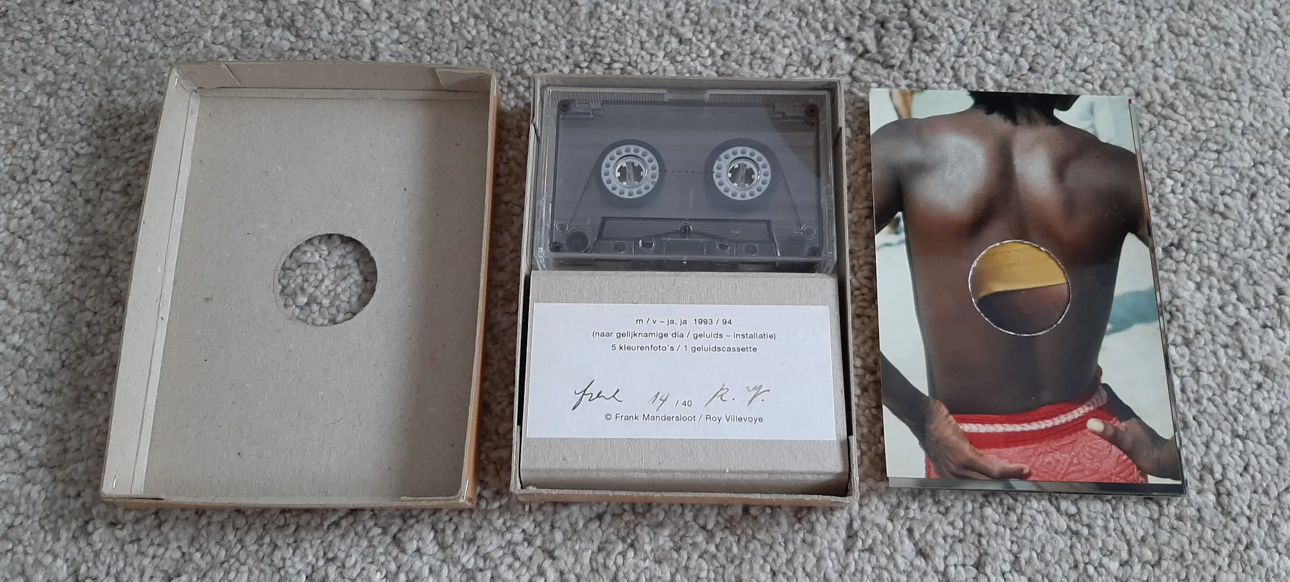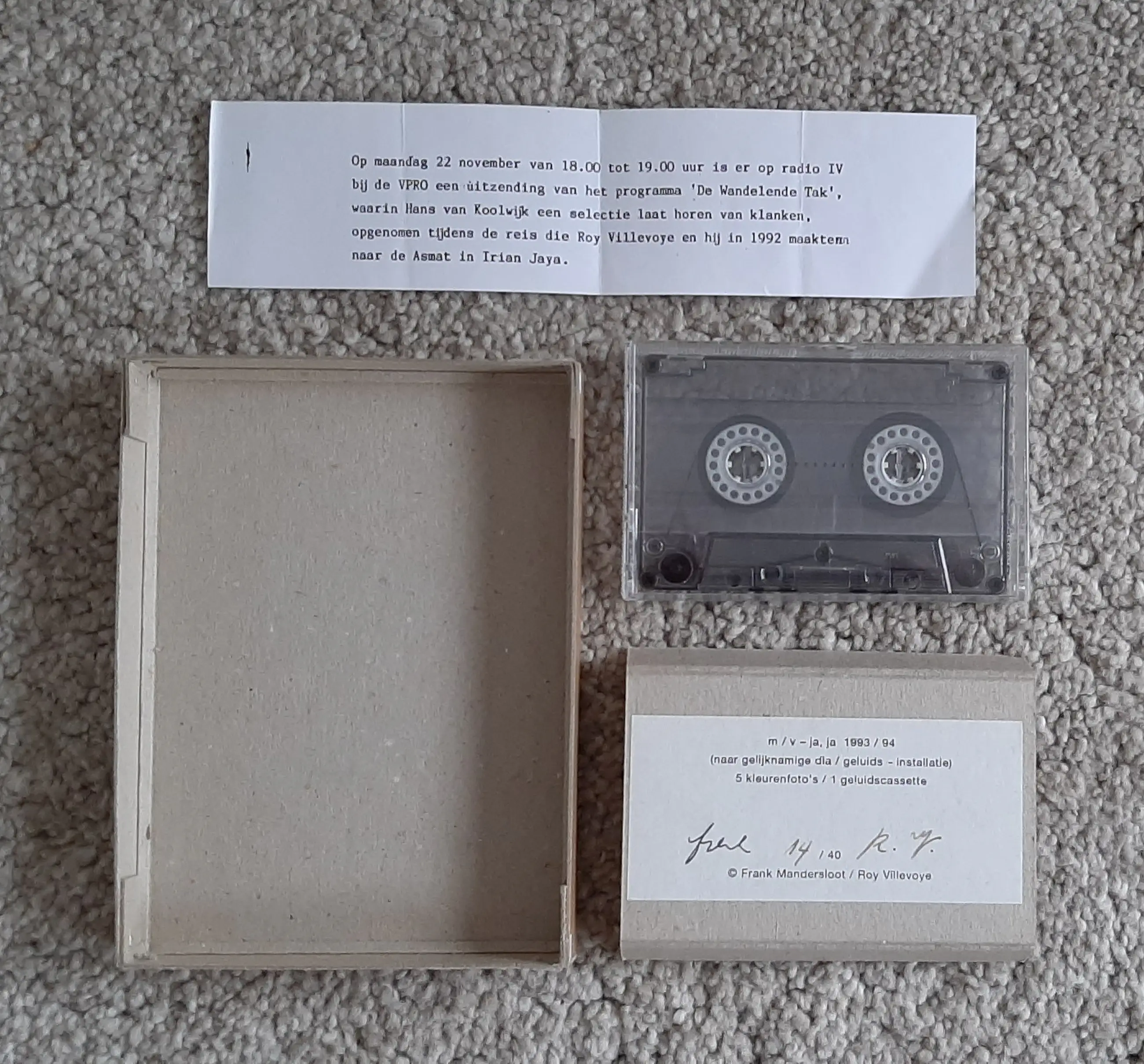 In doosje van 12x16 cm zijn opgenomen 5 foto's en een geluidscassette gemaakt en opgenomen tijdens een reis van Roy en Frank Mandersloot naar de Asmat in Irian Yaja in 1992.