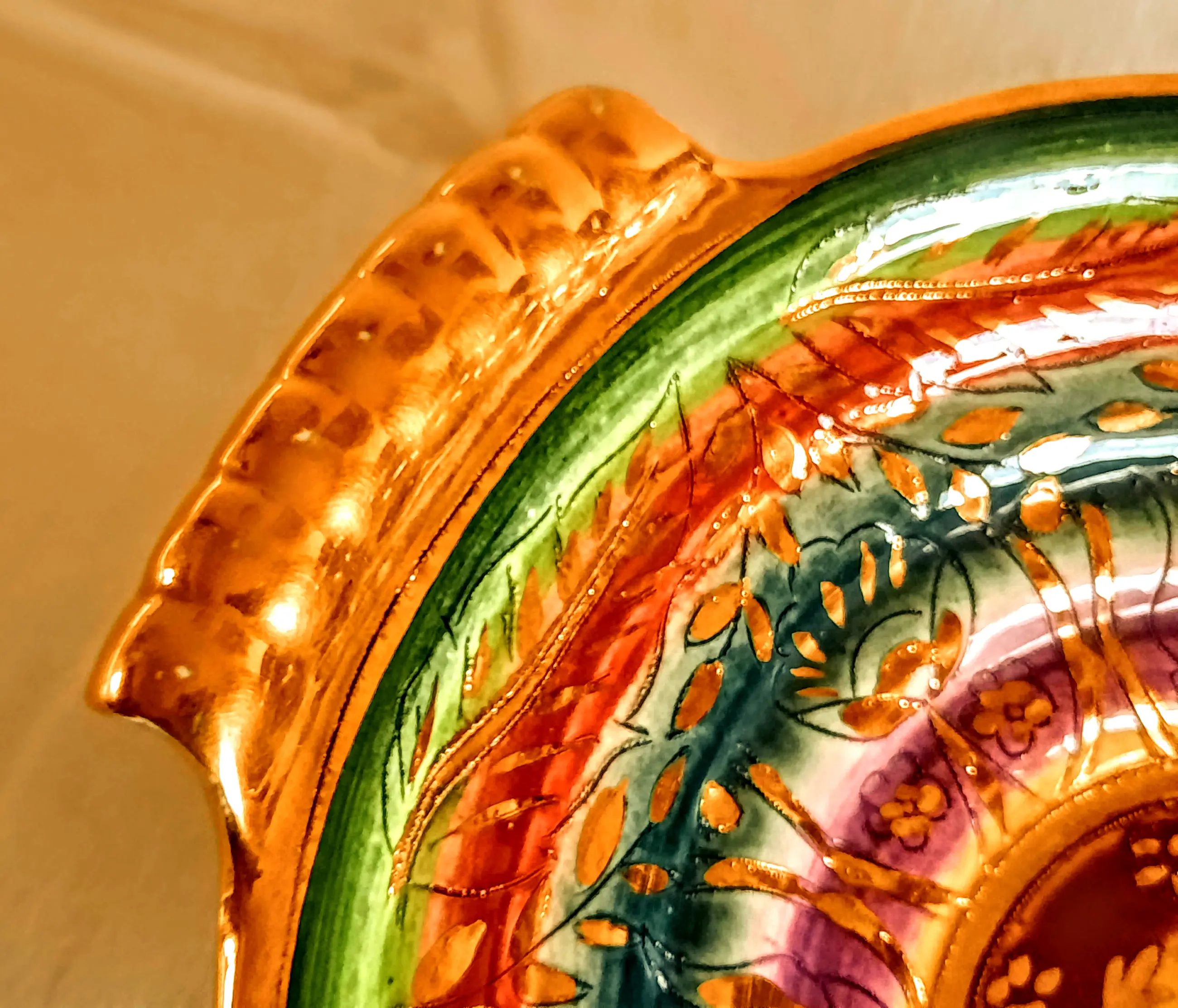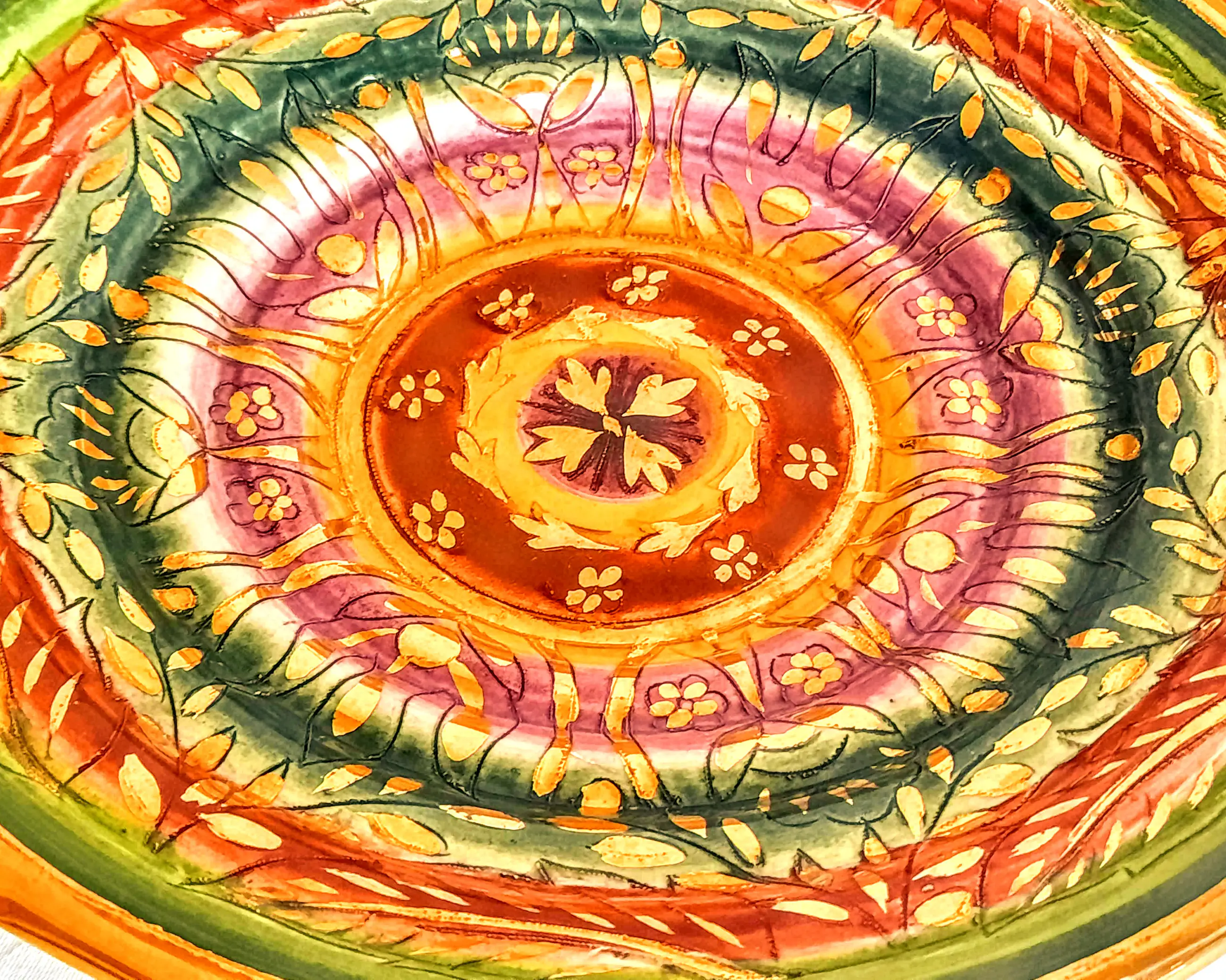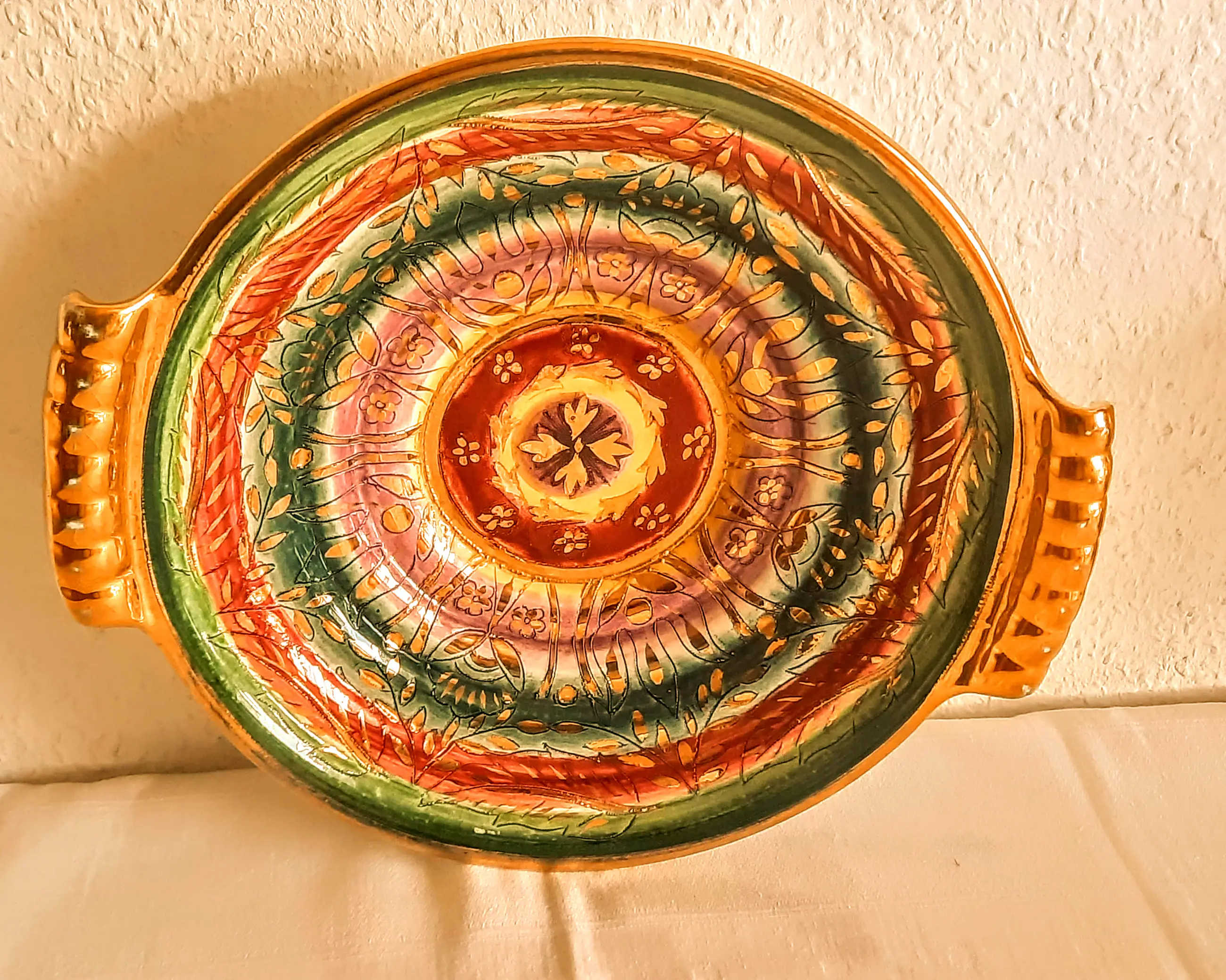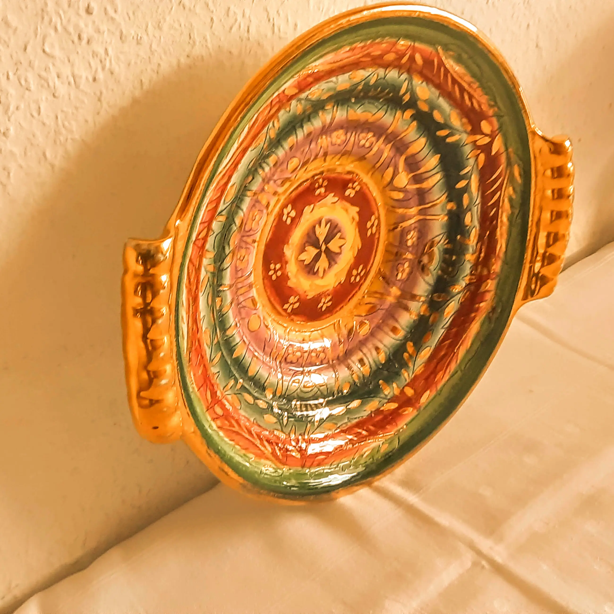 De kom is gemaakt van keramiek, heeft een kleurrijk, handgeschilderd concentrisch patroon met verguldsel en behoort tot de Sultane-serie.