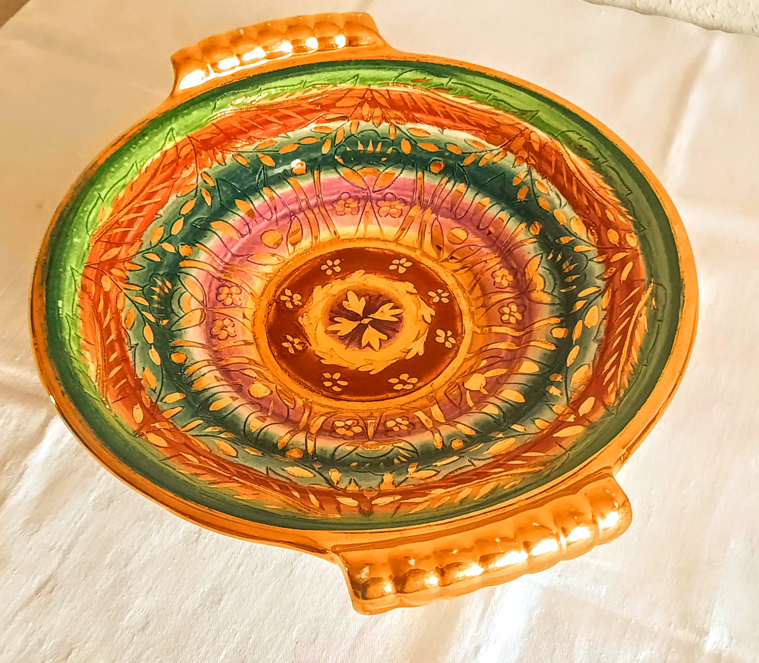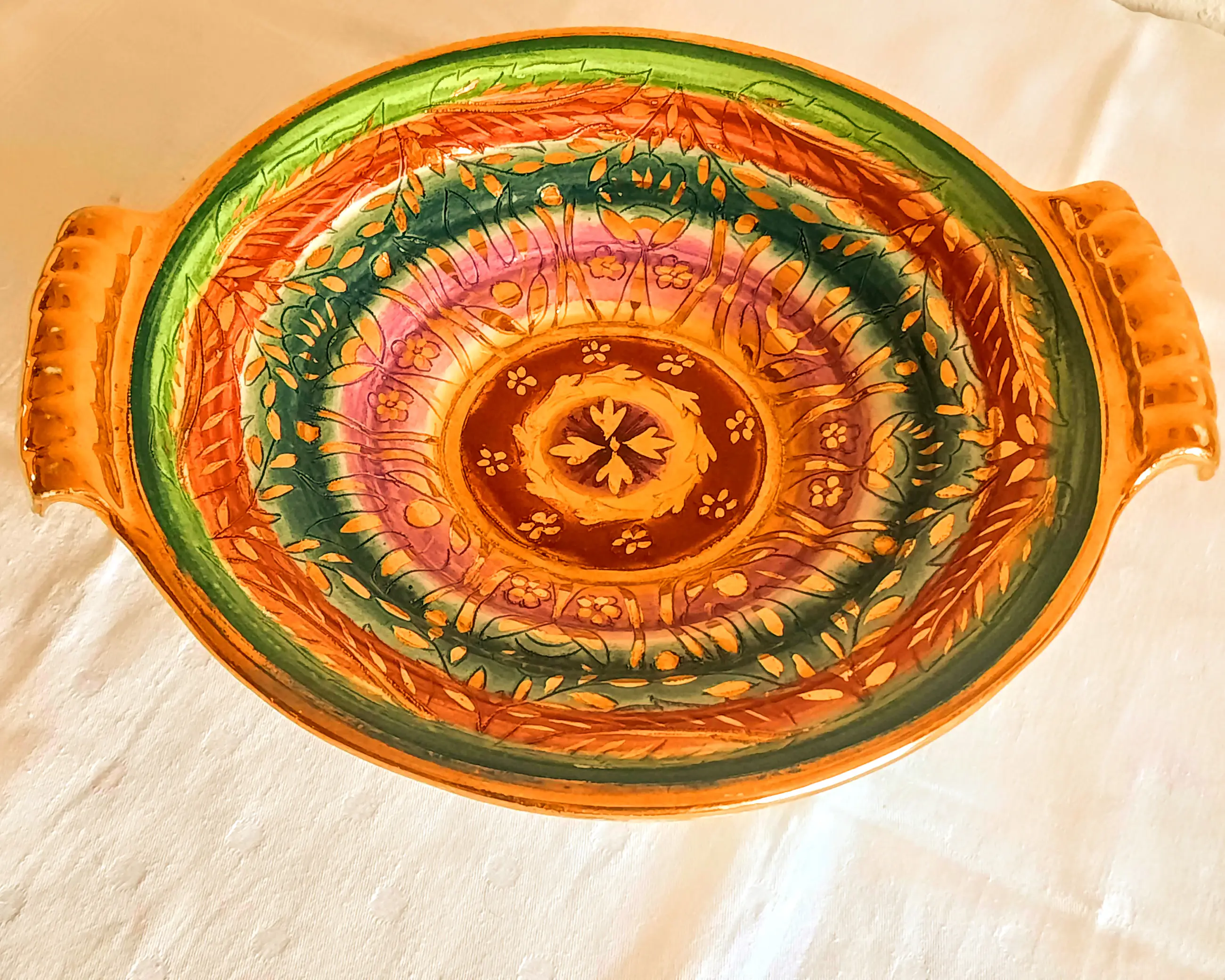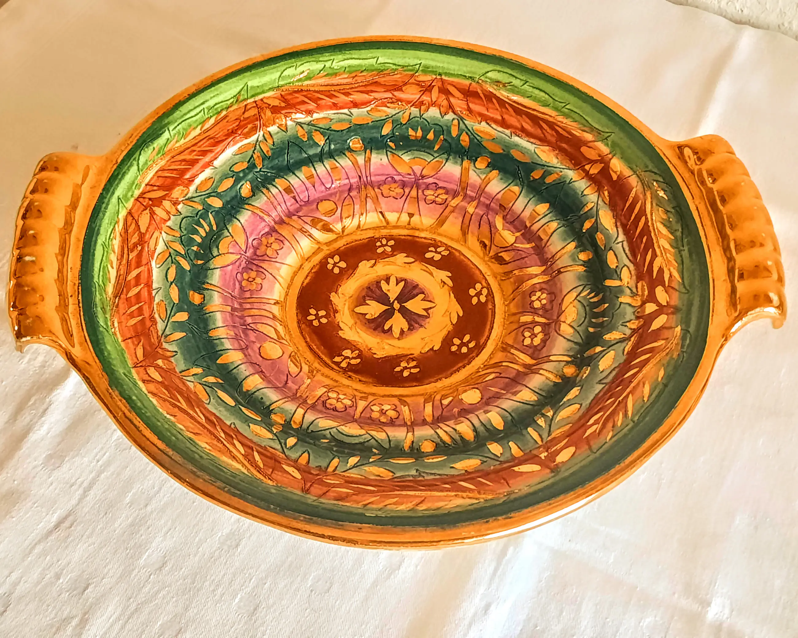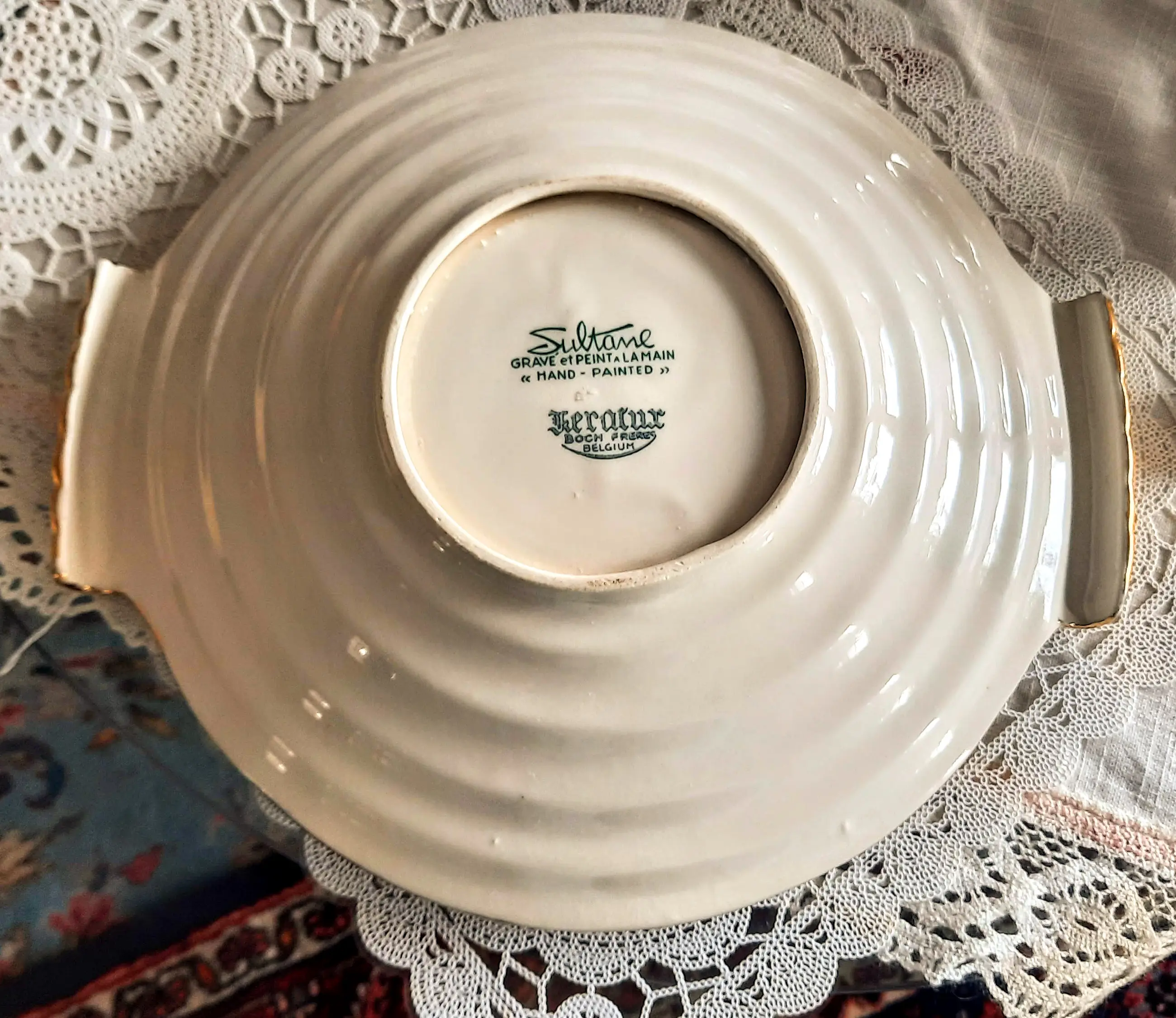 Een zeer mooie fruitschaal met 2 handvatten van het Belgische bedrijf Keralux Boch Freres Sultane.
