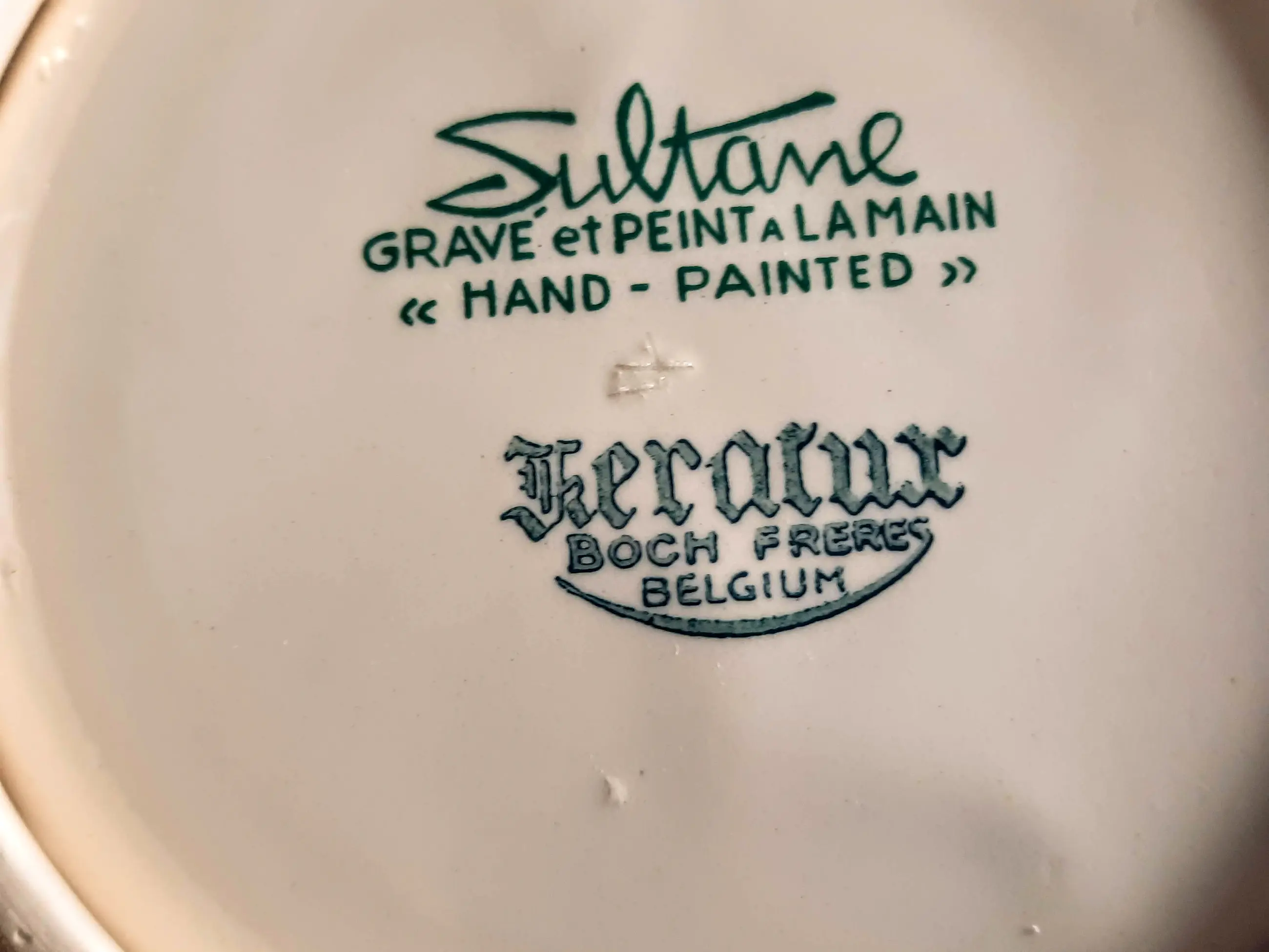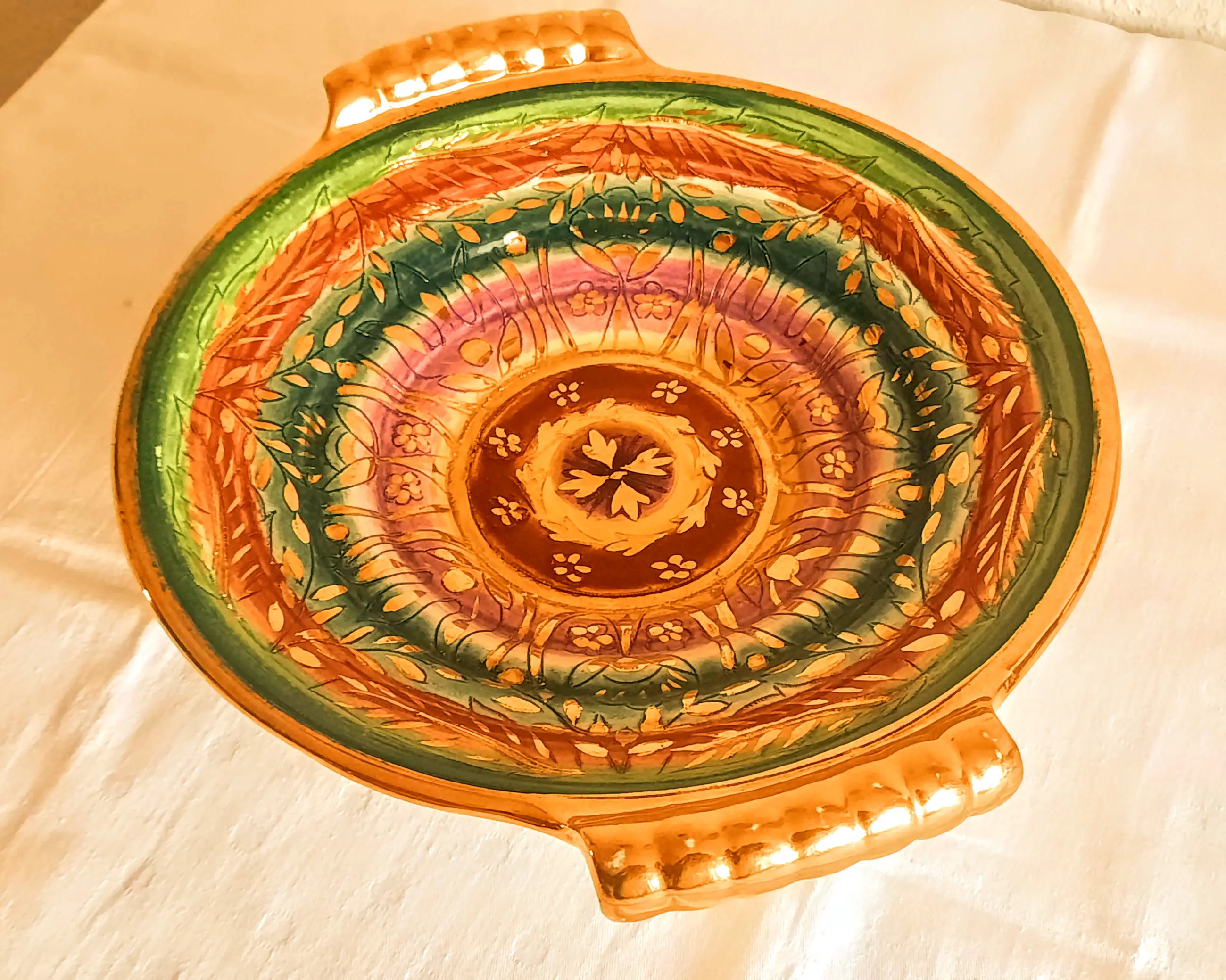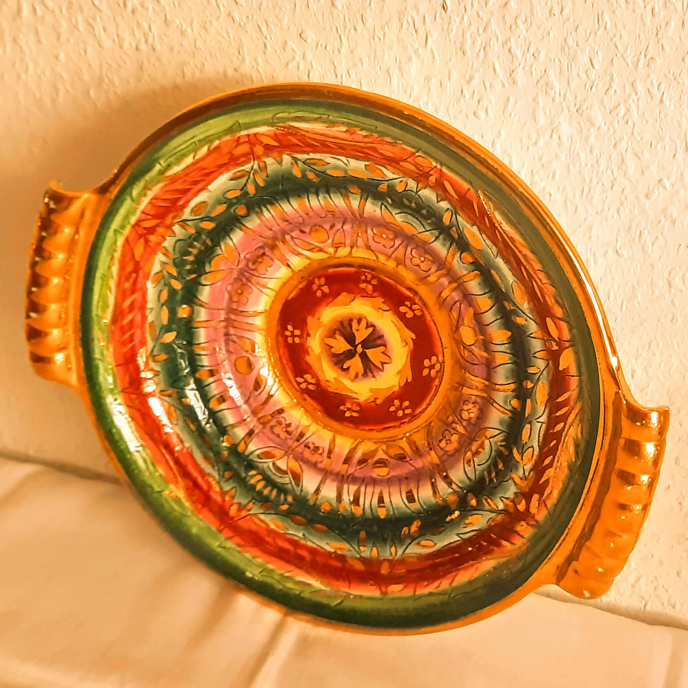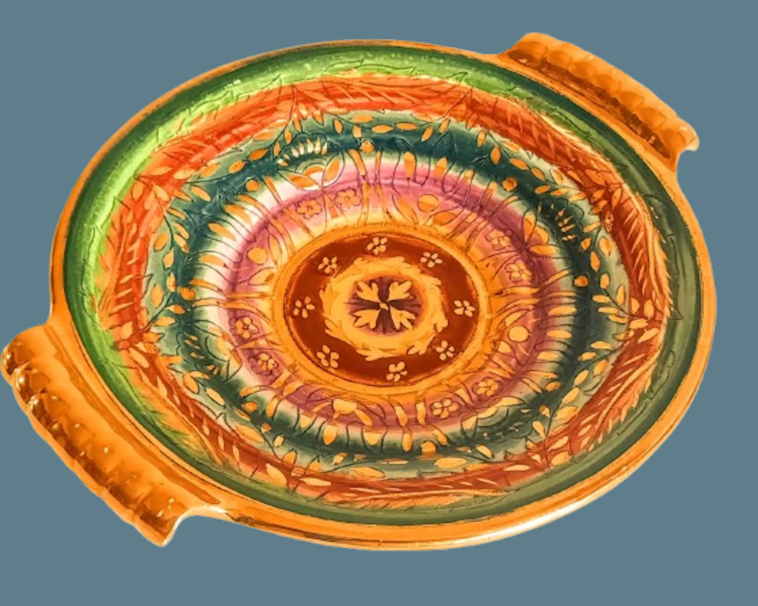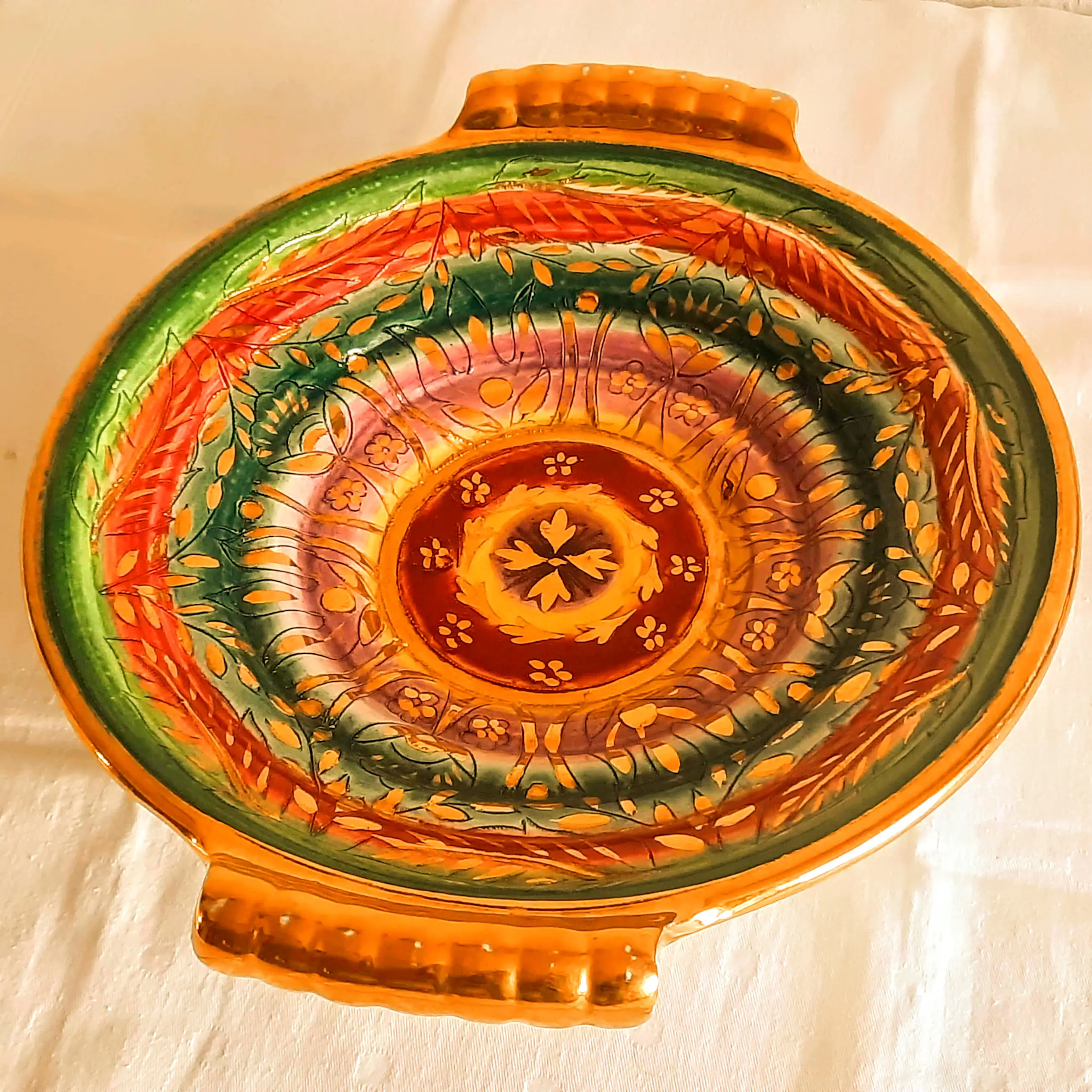 Een zeer mooie fruitschaal met 2 handvatten van het Belgische bedrijf Keralux Boch Freres Sultane.