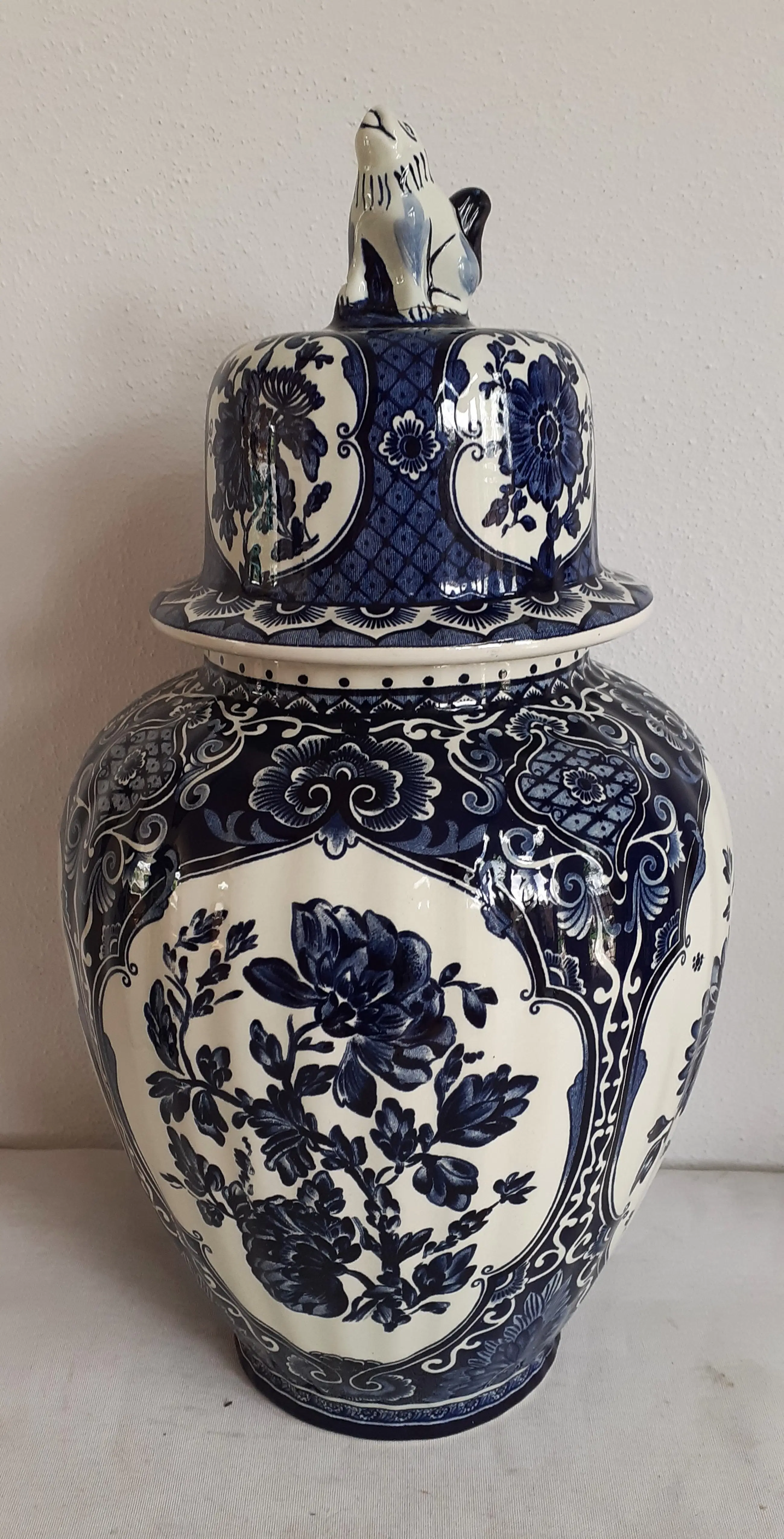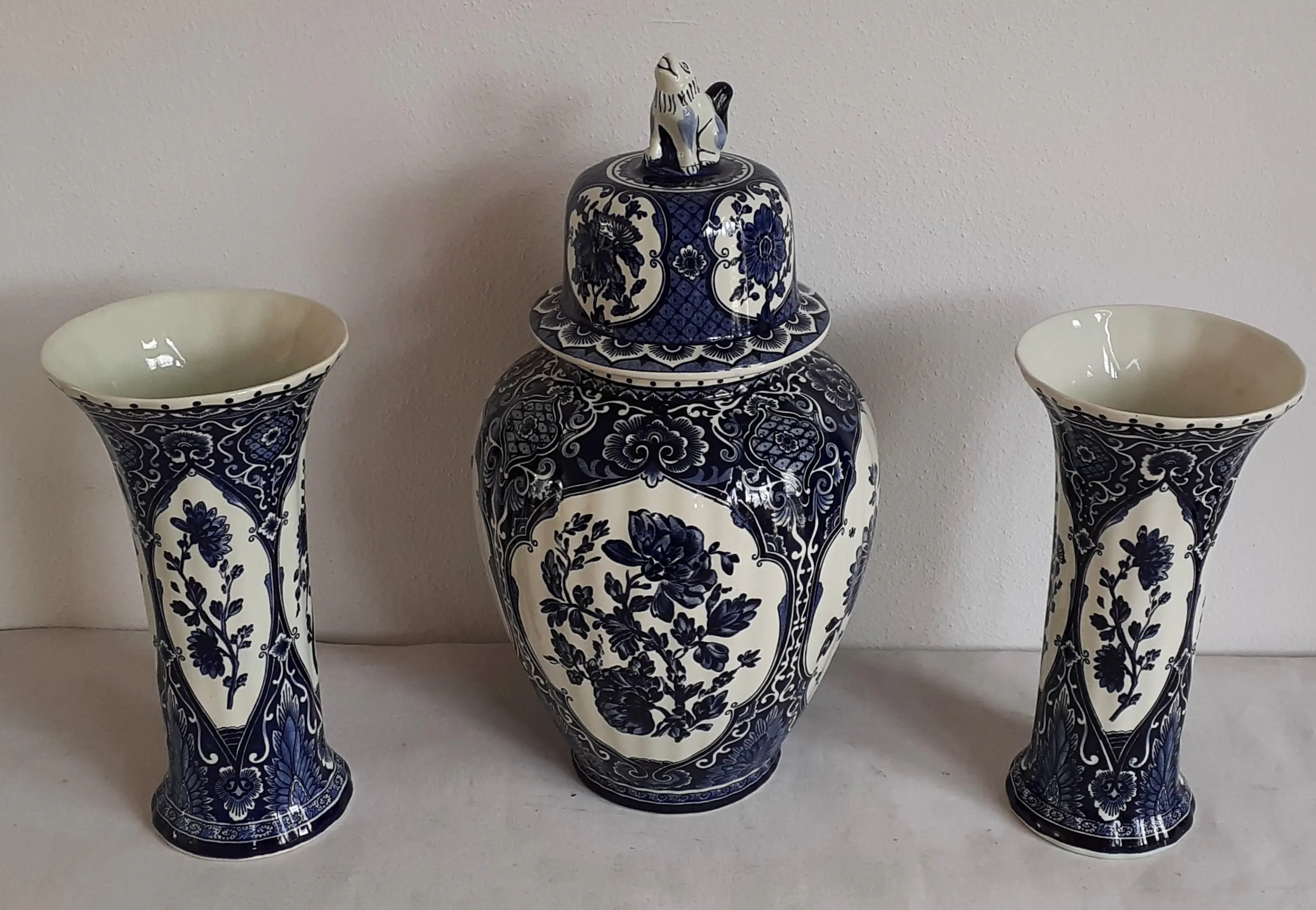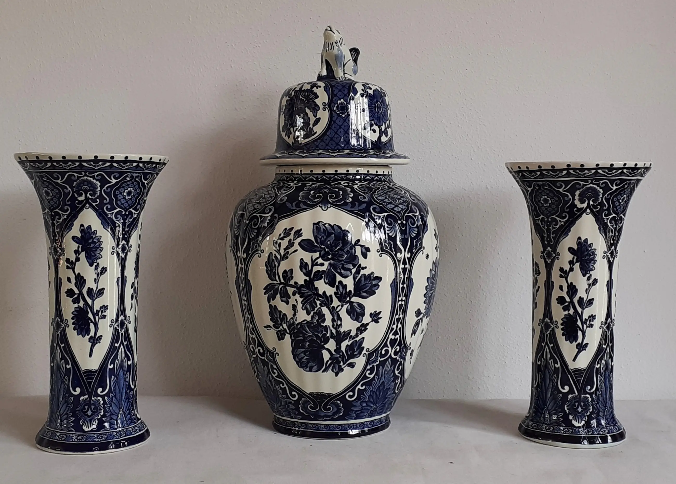 Kaststel bestaande uit drie vazen, waarvan een met deksel. Alle vazen zijn zeer gedetaileerd, met de hand, beschilderd in delfsblauwe bloemmotieven. De vazen zijn allen in zeer goede staat, geheel gaaf. Alleen de deksel is eens gevallen en heeft lichte schade (geringe gebruikssporen, maar kan naar achter gedraaid worden: zie laatste twee foto's) Zie voor een goede impressie en conditie de foto's, welk onderdeel zijn van de omschrijving.