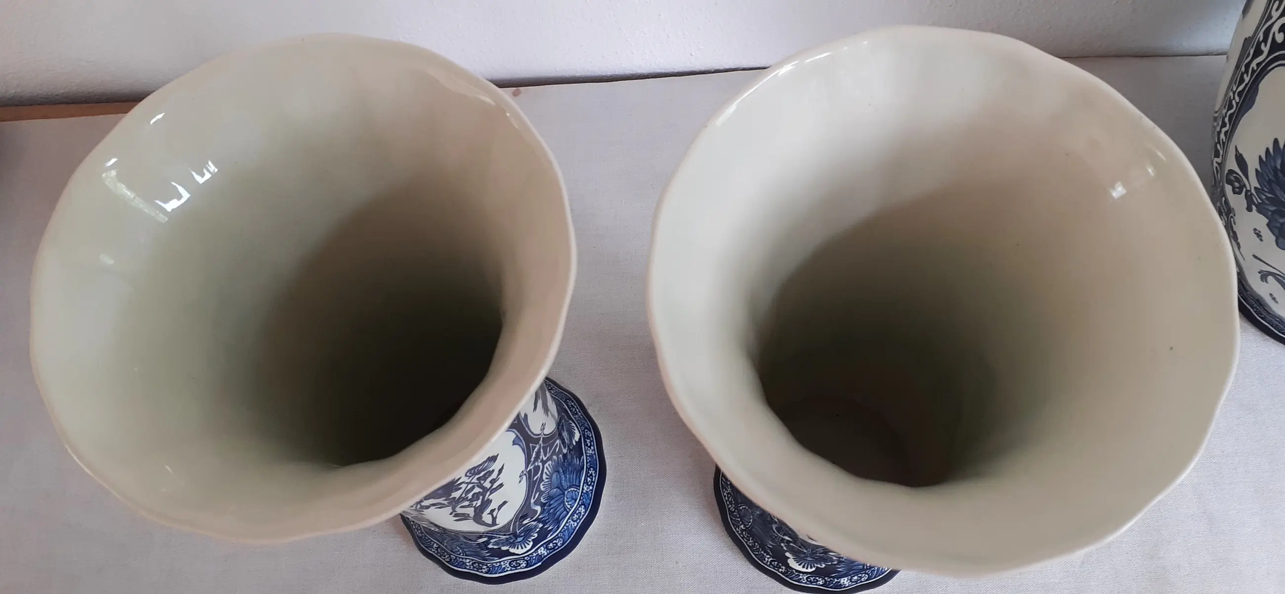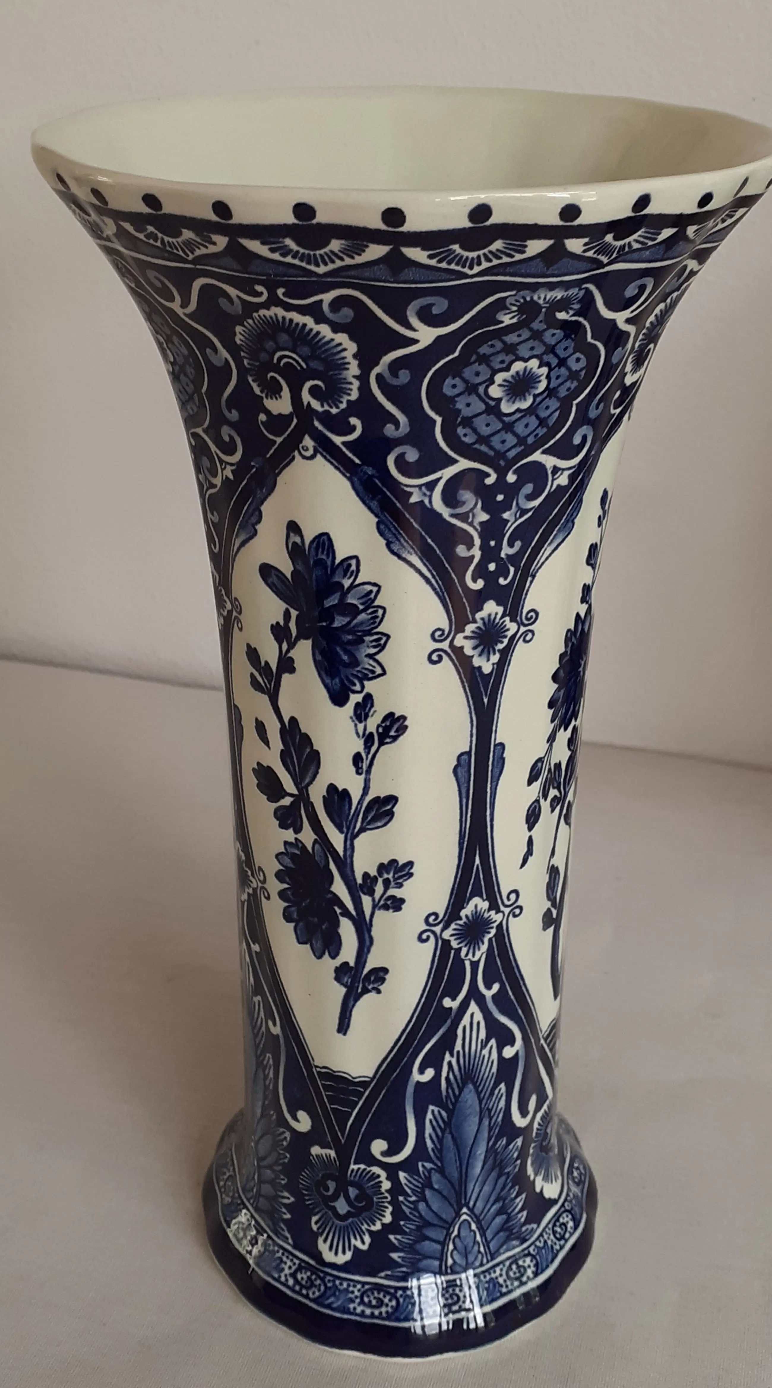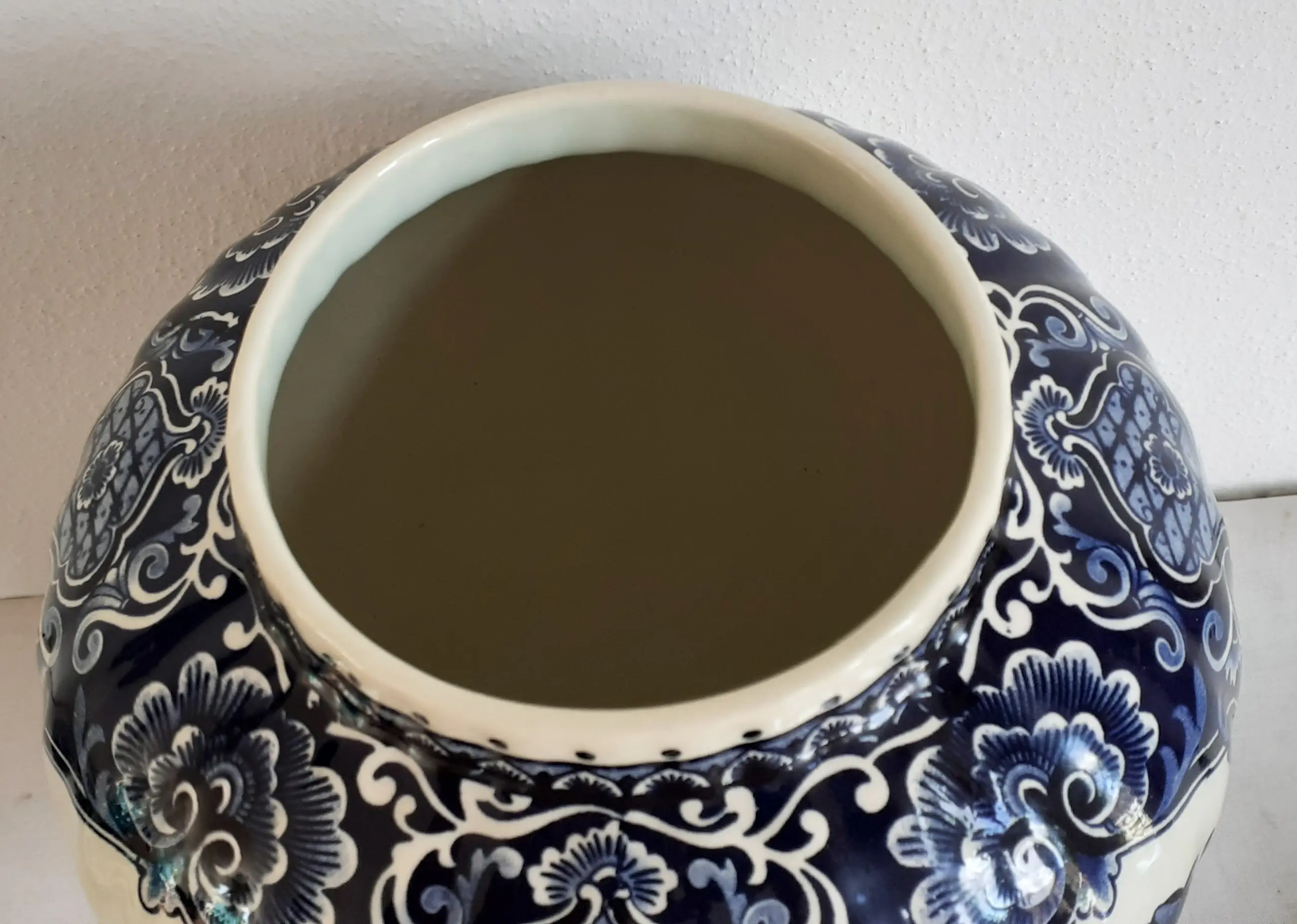Kaststel bestaande uit drie vazen, waarvan een met deksel. Alle vazen zijn zeer gedetaileerd, met de hand, beschilderd in delfsblauwe bloemmotieven. De vazen zijn allen in zeer goede staat, geheel gaaf. Alleen de deksel is eens gevallen en heeft lichte schade (geringe gebruikssporen, maar kan naar achter gedraaid worden: zie laatste twee foto's) Zie voor een goede impressie en conditie de foto's, welk onderdeel zijn van de omschrijving.