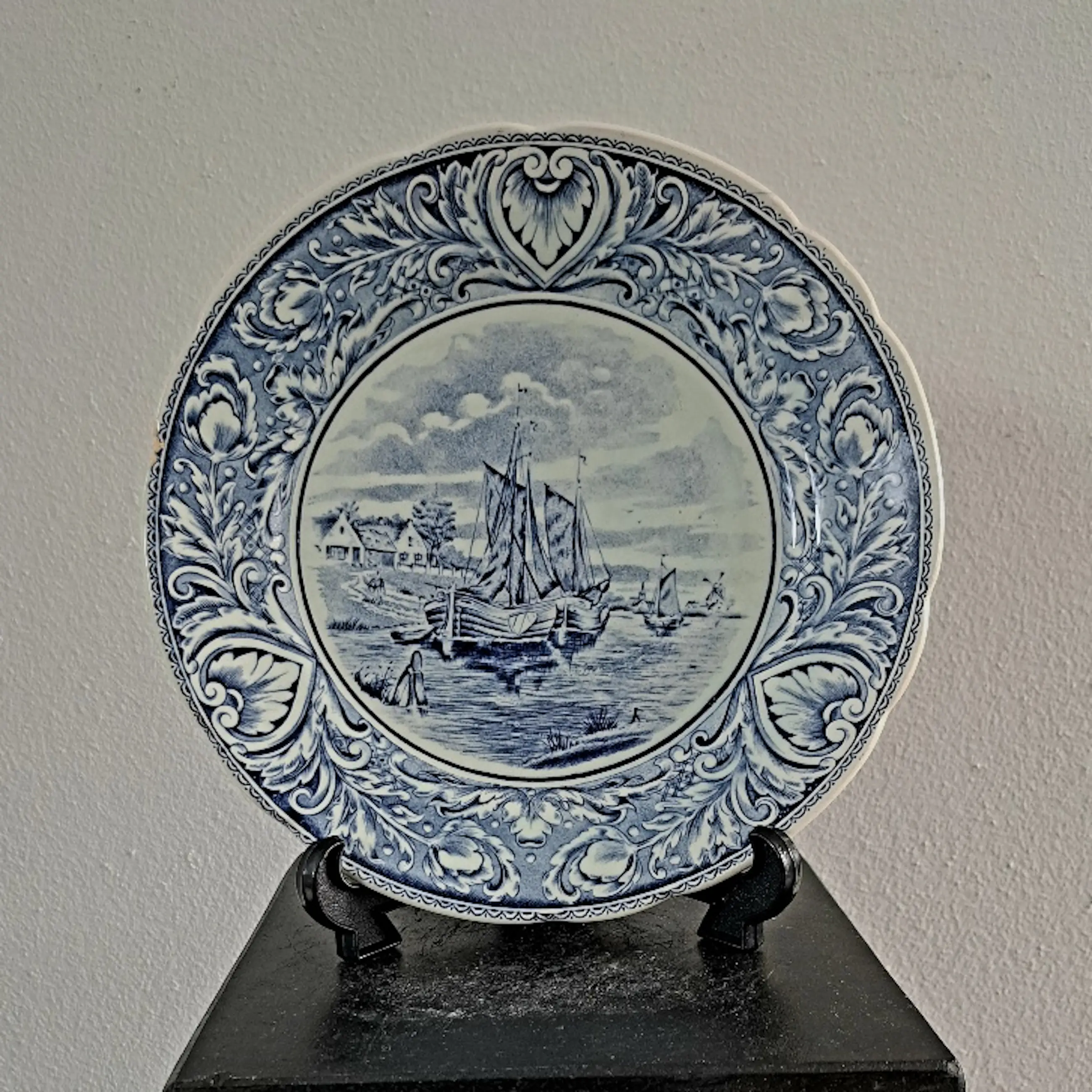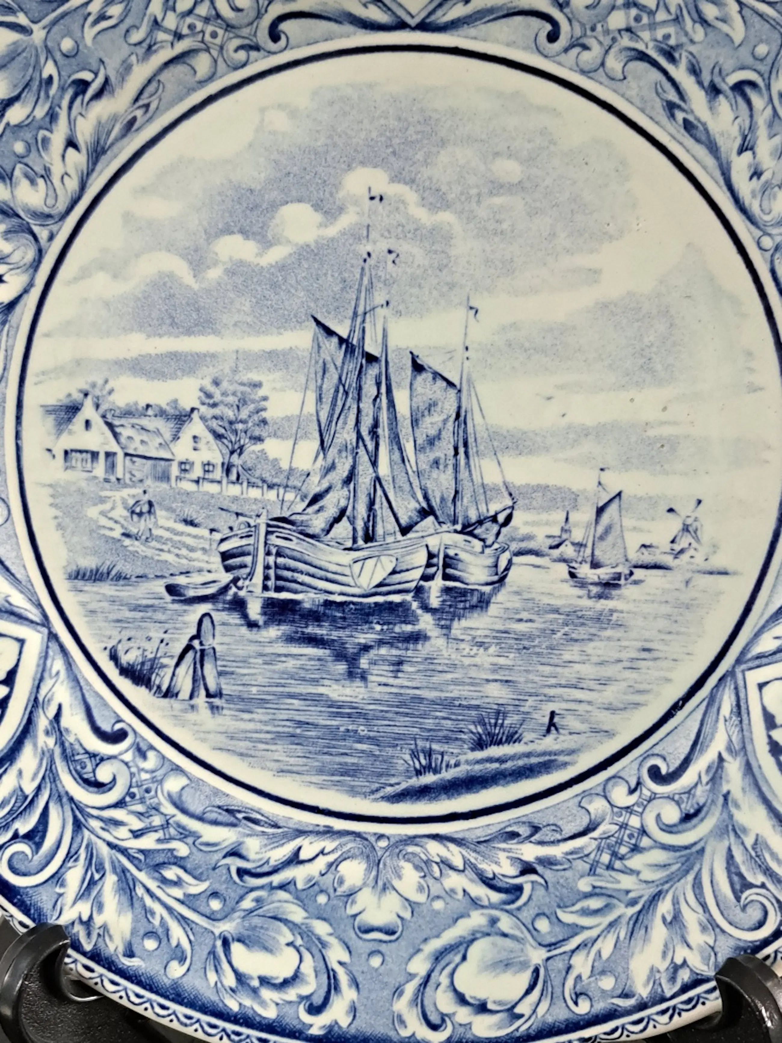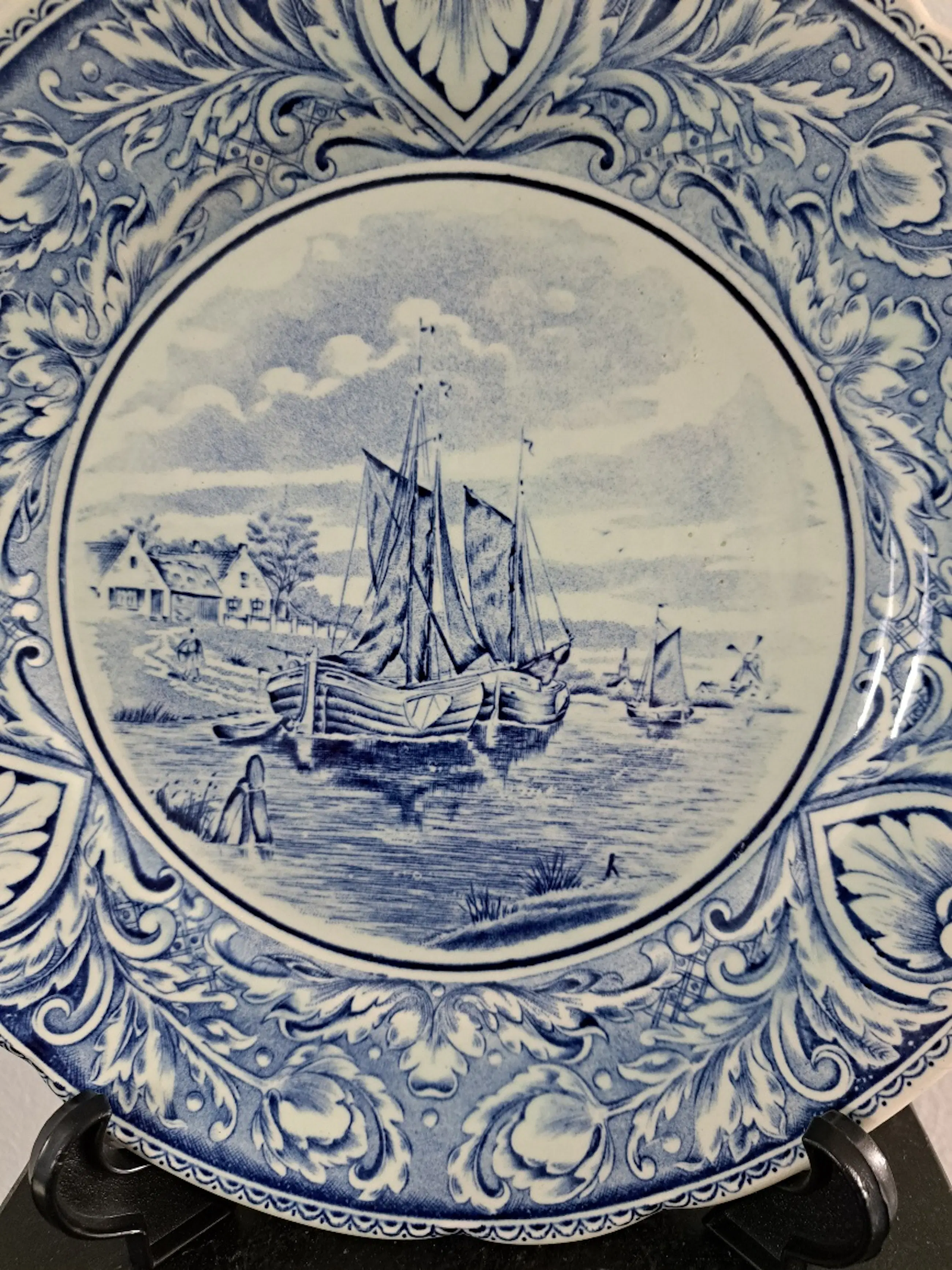 Mooi gedecoreerd Wandbord met voorstelling van oude Zeilboten , Boerderij en Molen Rondom de afbeelding zit een prachtig gedecoreerde rand met een Bloem motief