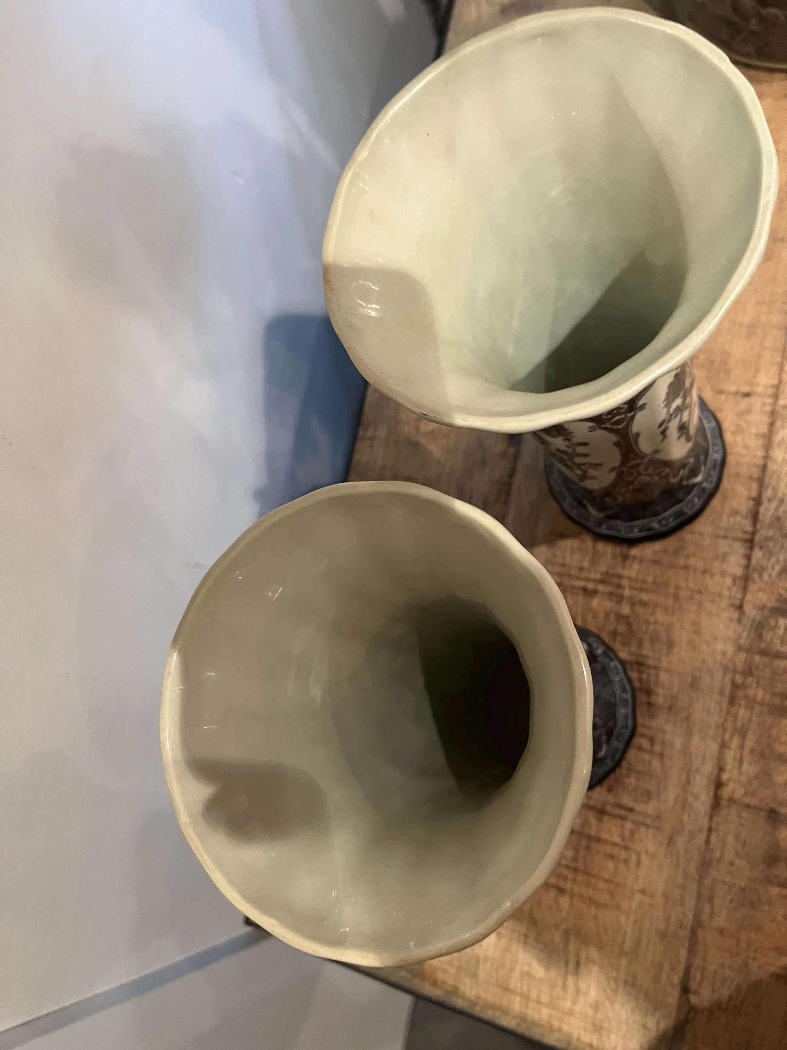 deksel-vaas is 24cm doorsnee en is 40 cm (inclusief deksel) hoog de trompet-vazen van 9 cm doorsnee in het midden, uitlopend tot 13 cm boven in. Ze zijn 26 cm hoog.