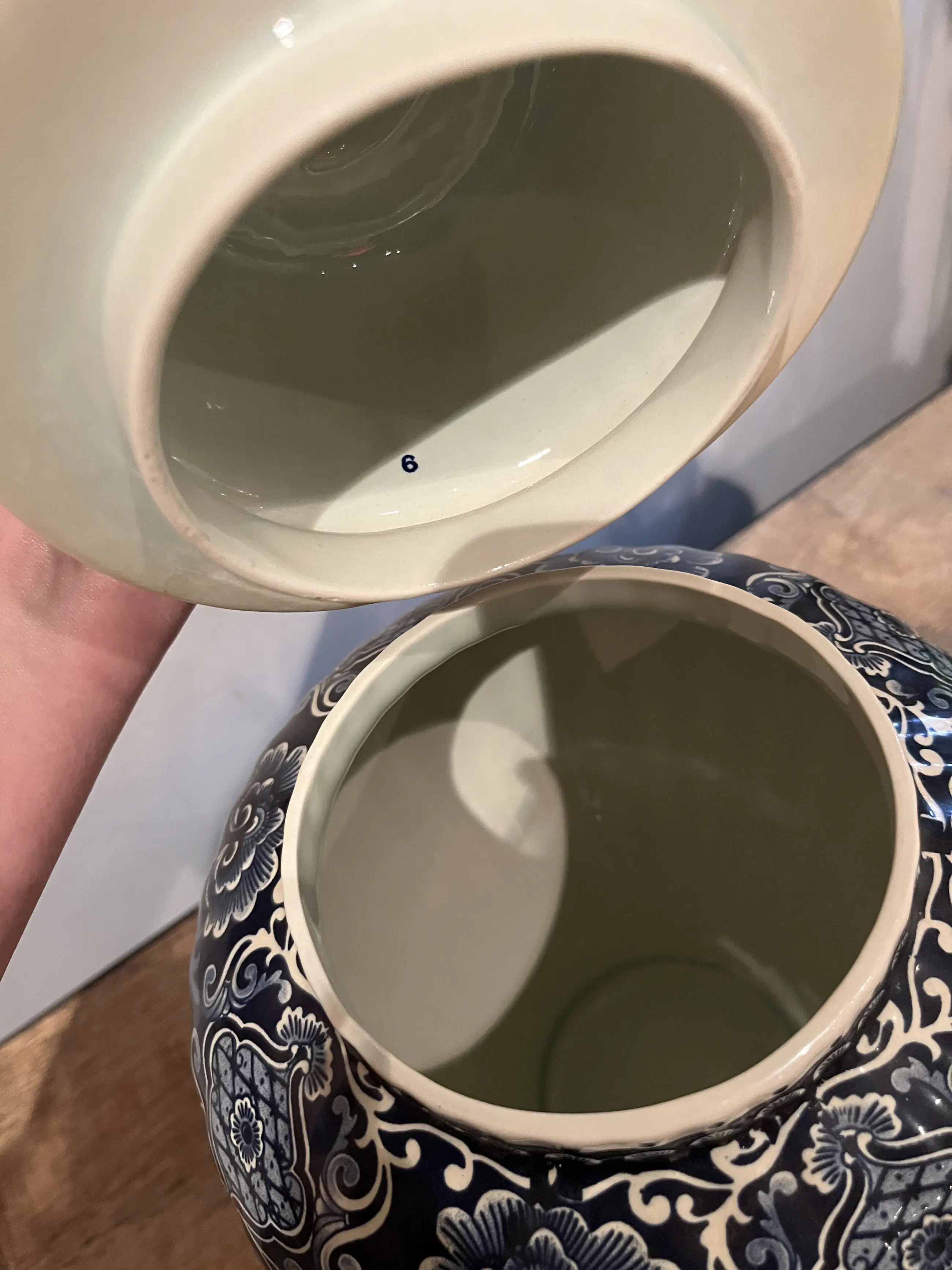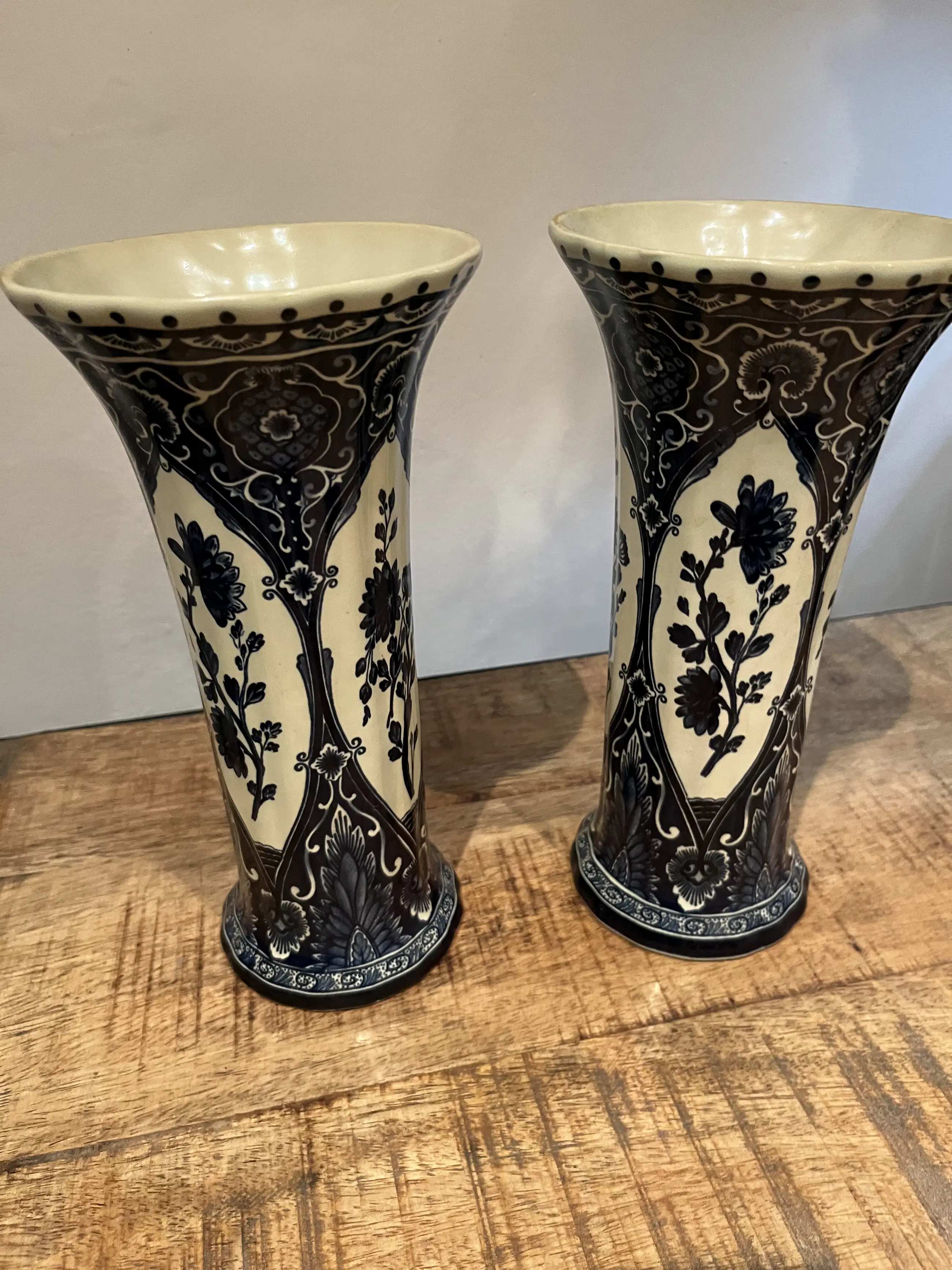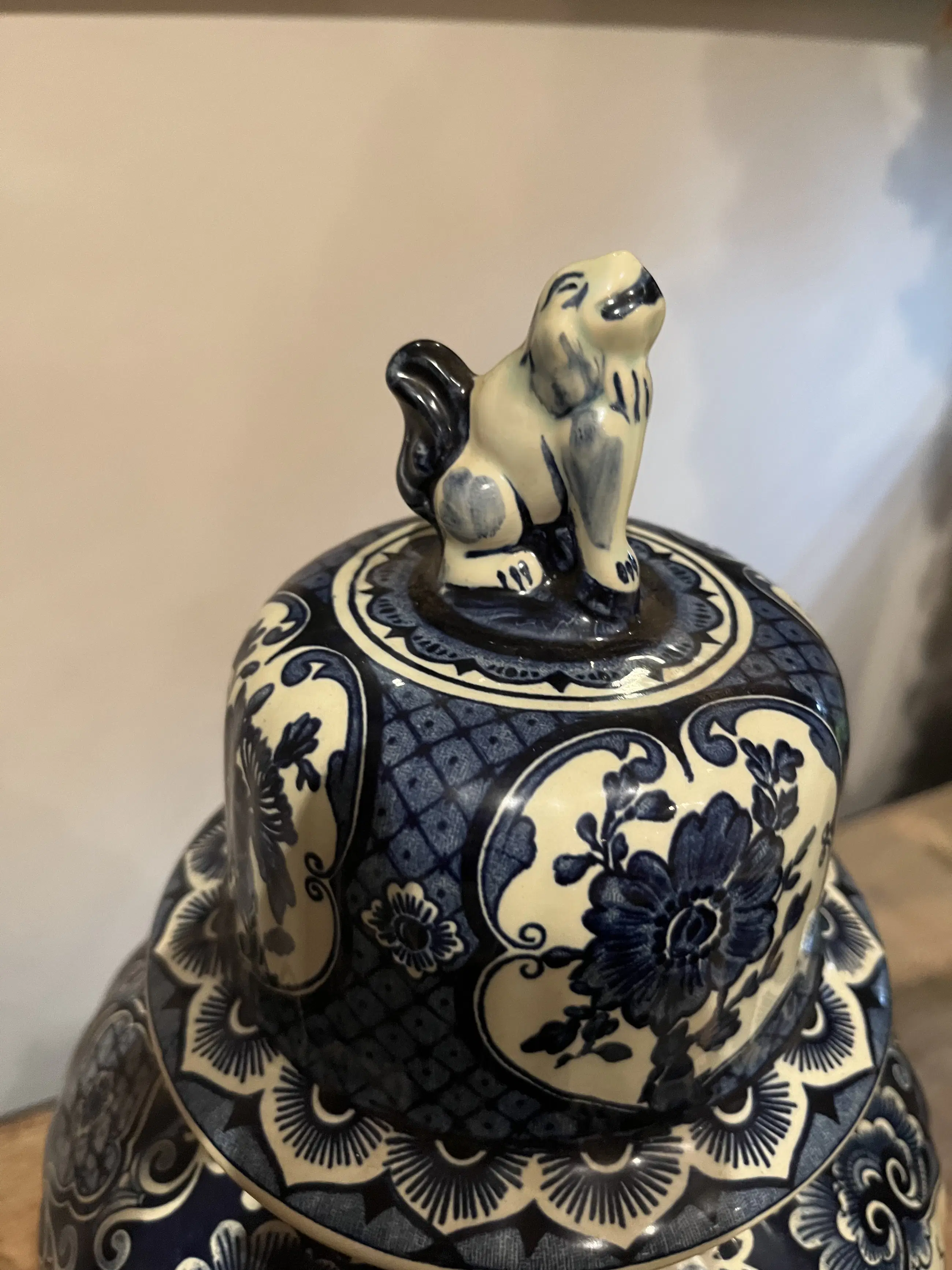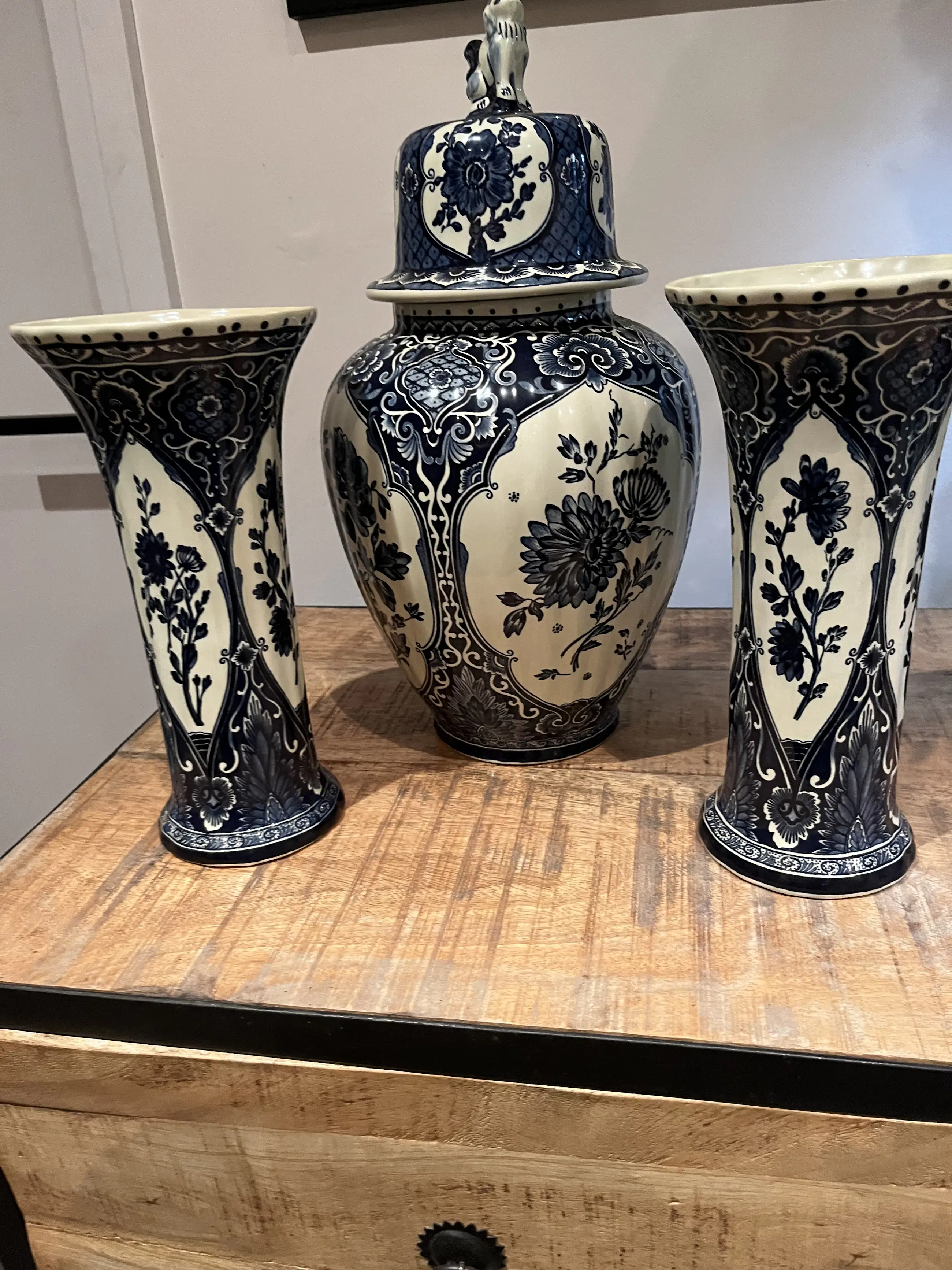 De vazen hebben bloemen decoratie. Op de deksel van de grootste vaas zit een dier