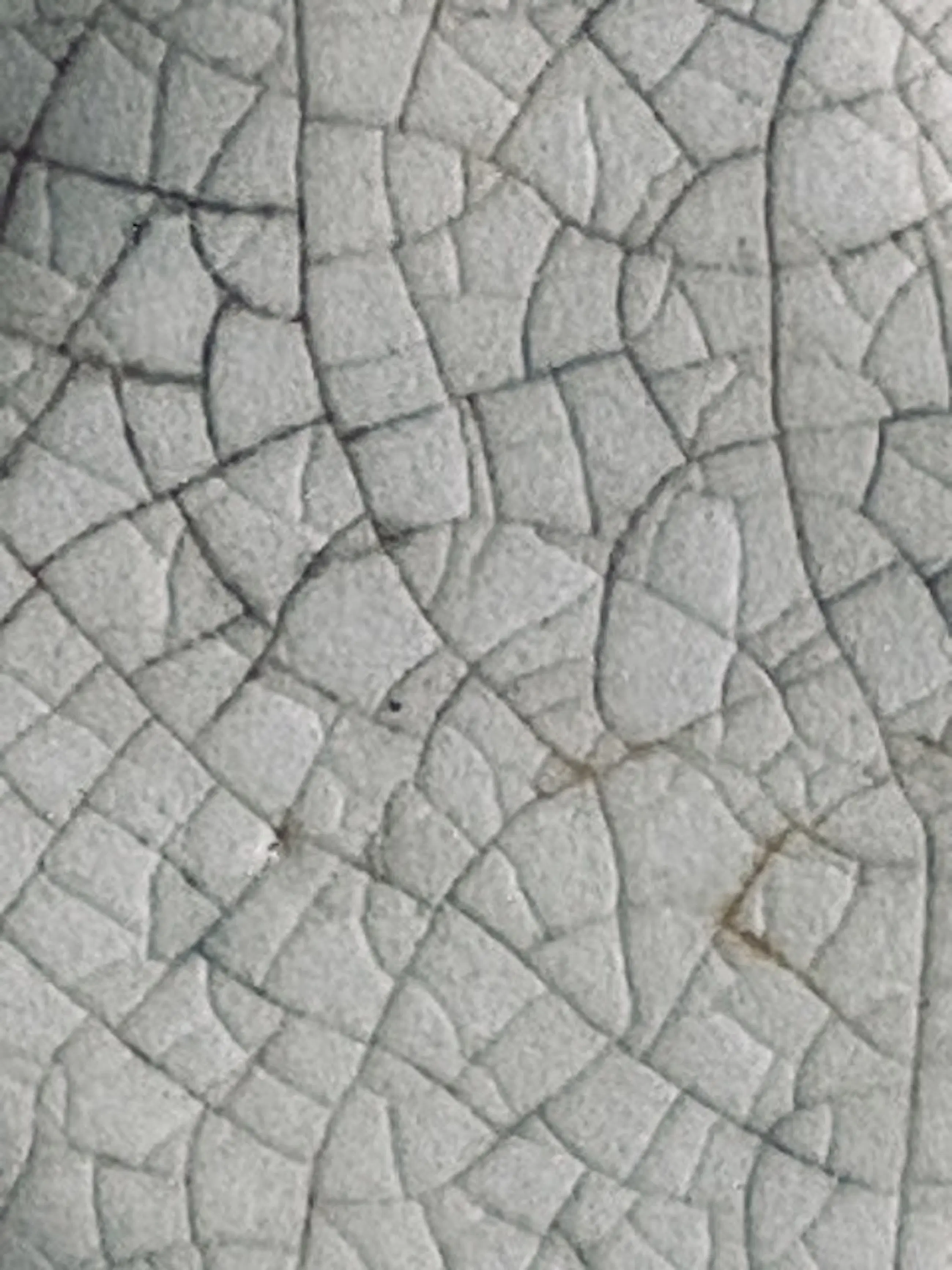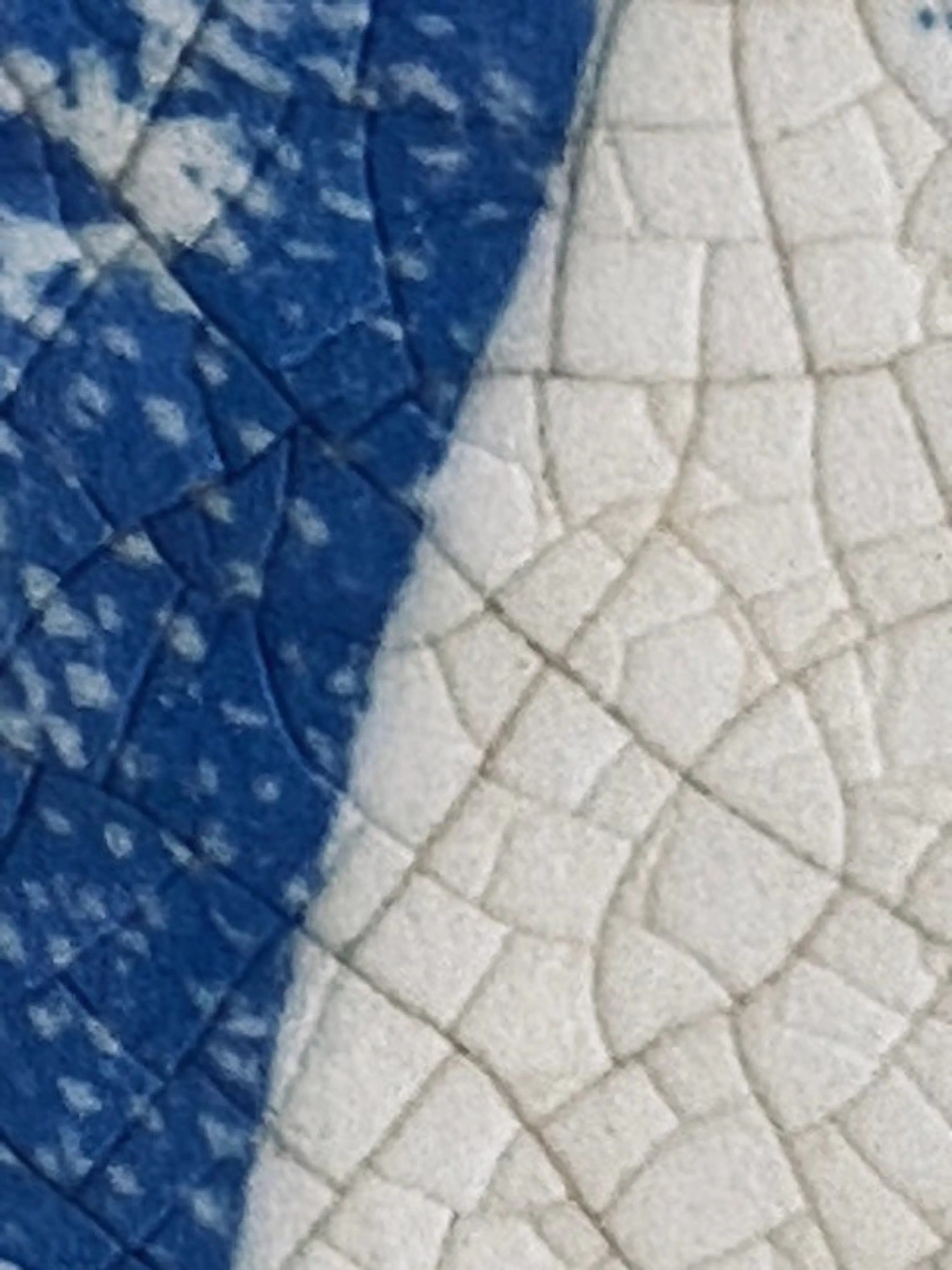 door een boom, waterpartij en landelijke bebouwing. Het craquelé-glazuur