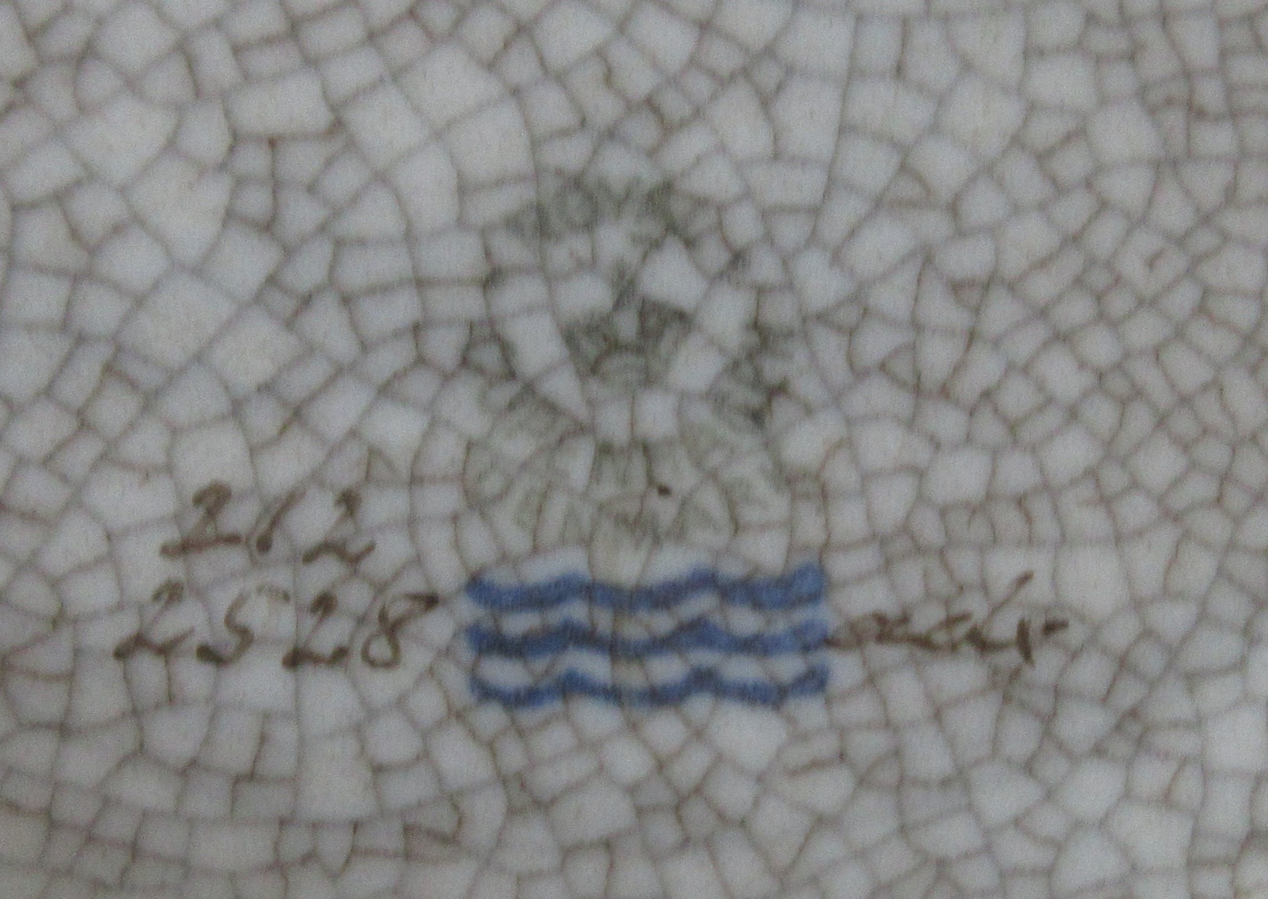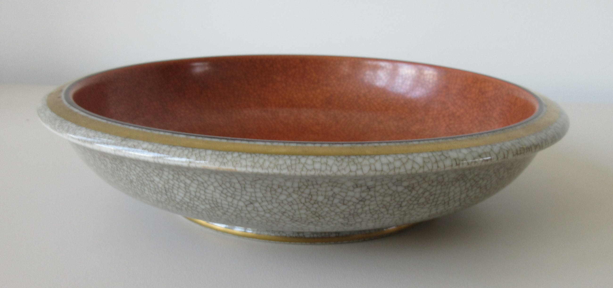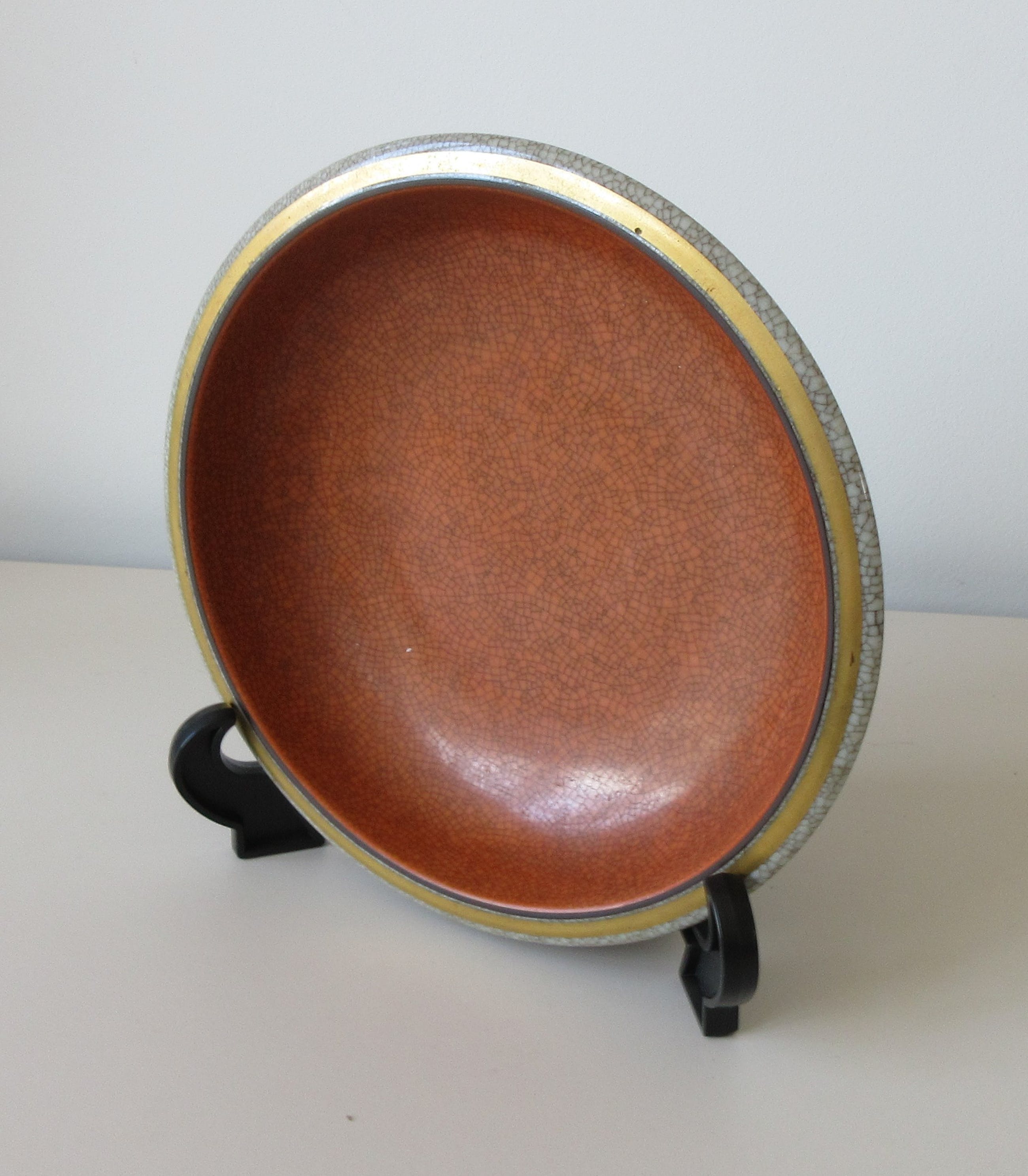Art deco oranje en grijze porseleinen craquele schaal - ontwerp Thorkild Olsen. In prima onbeschadigde conditie. Voorzien van blindmerk en signatuur aan de achterzijde.