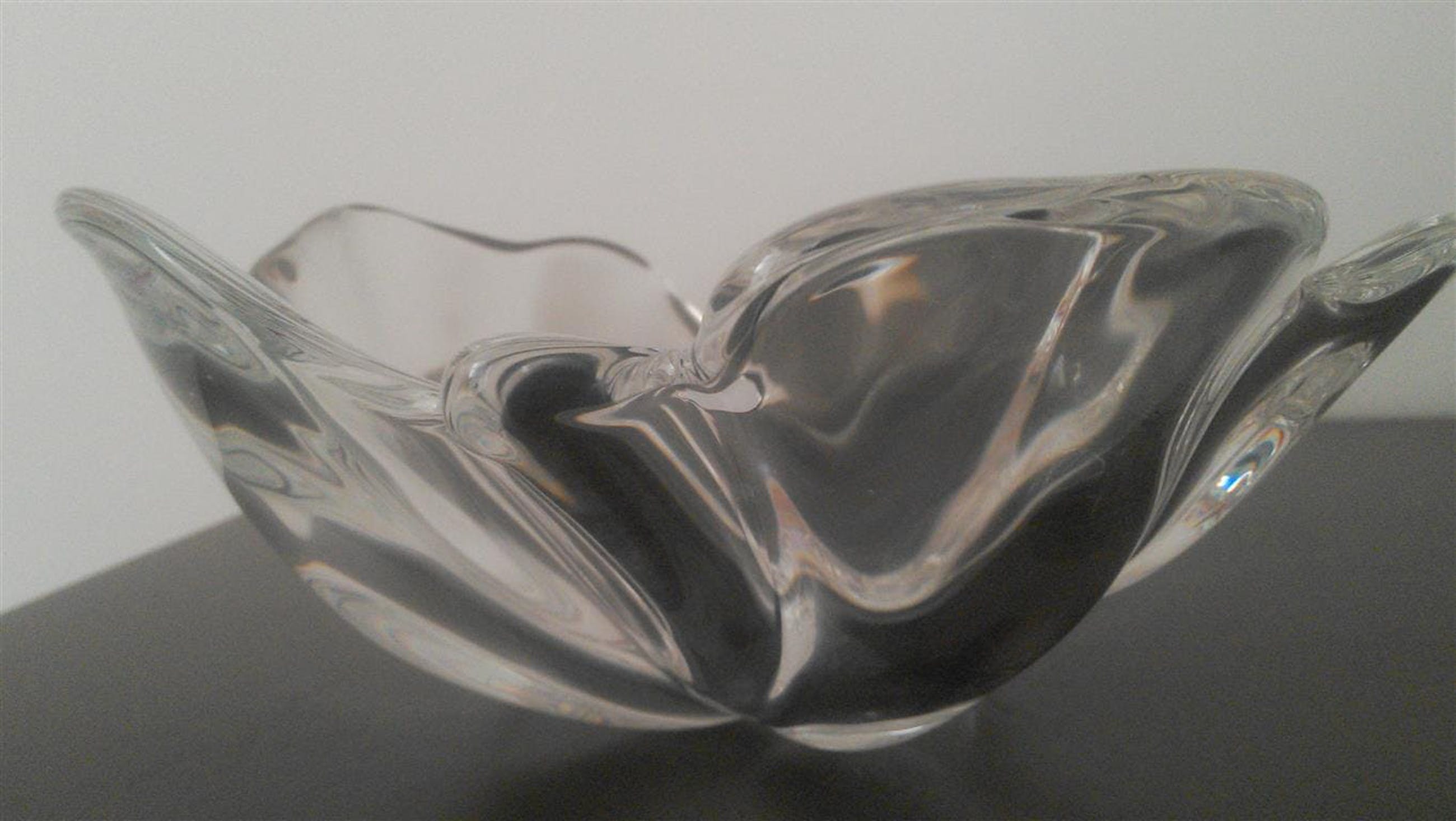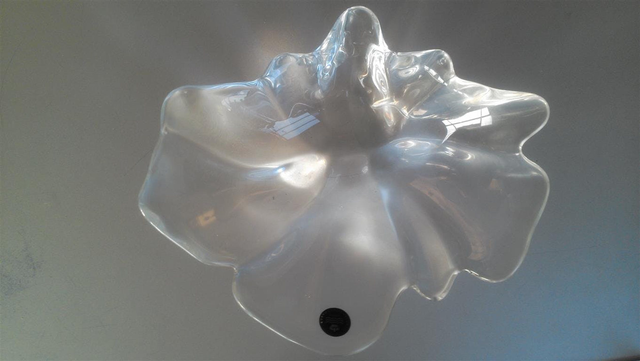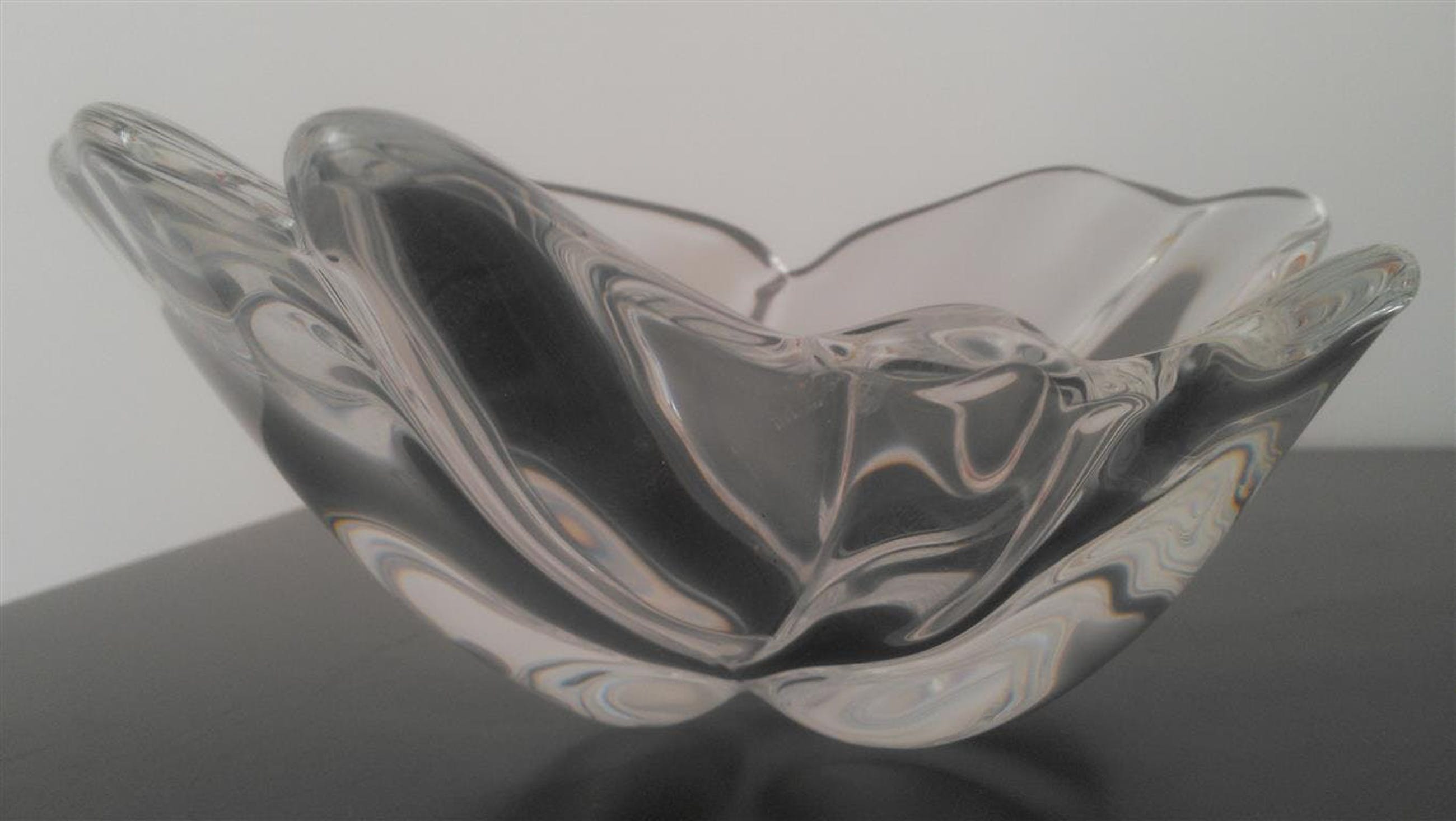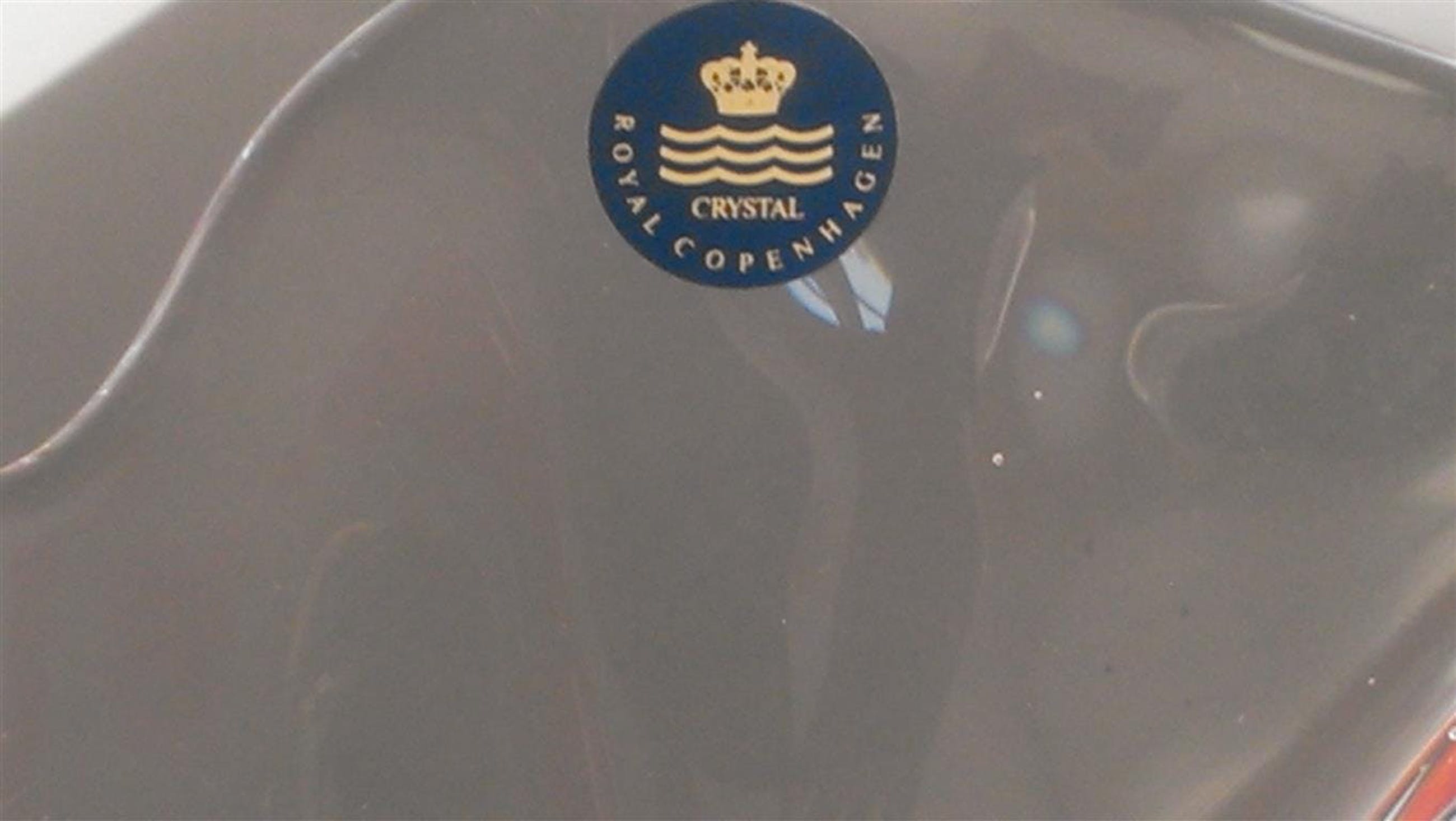 Met sticker met vermelding Royal Copenhagen Crystal Elegante schaal Natura in bladvorm, Staat op de nerven van 5 bladen