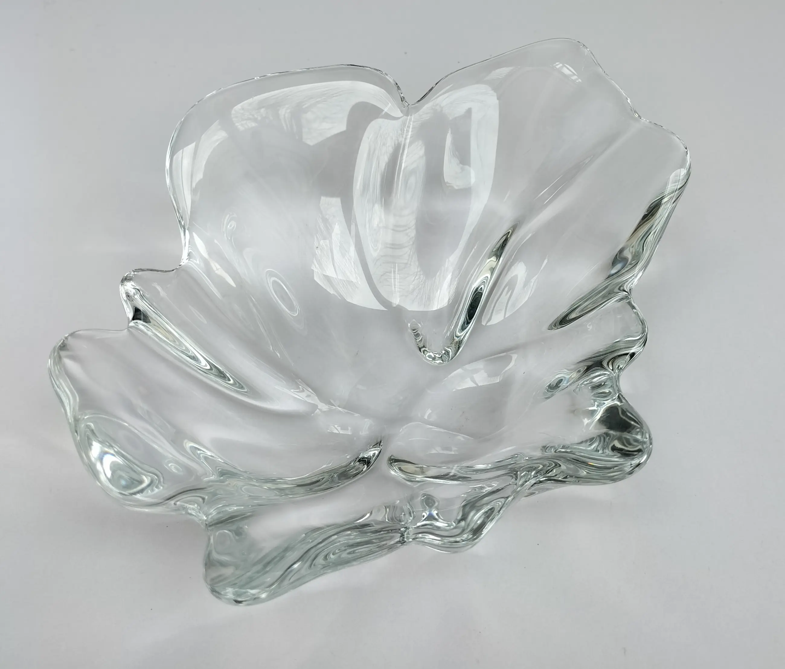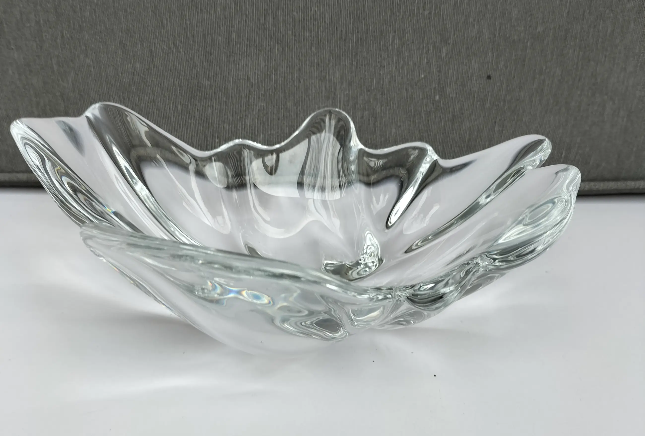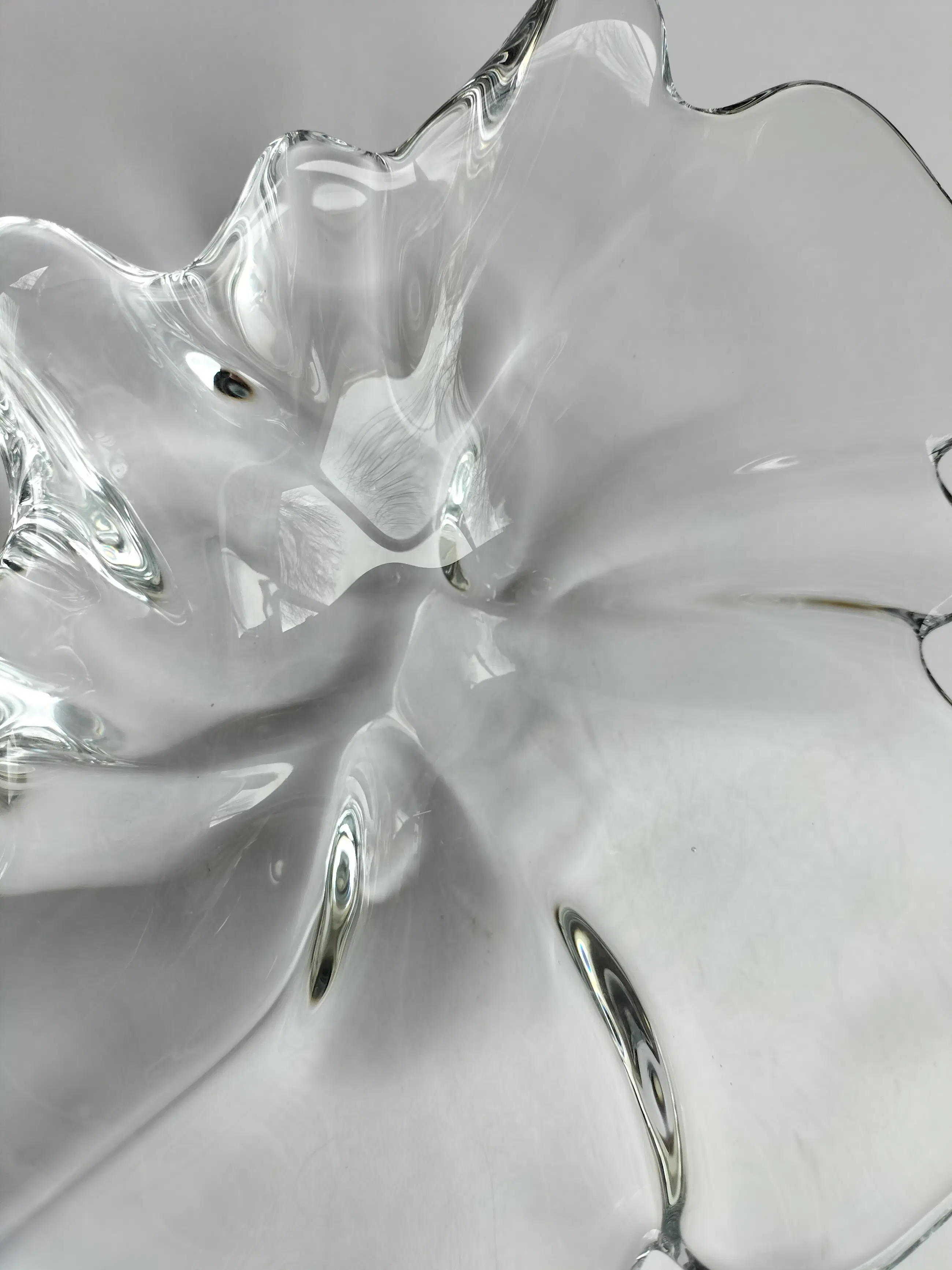 Mooie kristallen schaal naar het ontwerp van Ole Kortzau. Dik helder glas met een apart glanzend effect, het glas lijkt wel satijn/fluweelachtig. De schaal heeft de vorm van een blad of bloem en bezit golvende randen die niet overal even hoog zijn. Het ontwerp staat ook wel bekend onder de naam "Natura". In werkelijk uitstekende staat met zeer minimale gebruikssporen. Een bijzonder en decoratief object dat met zorg verpakt en verzonden zal worden.