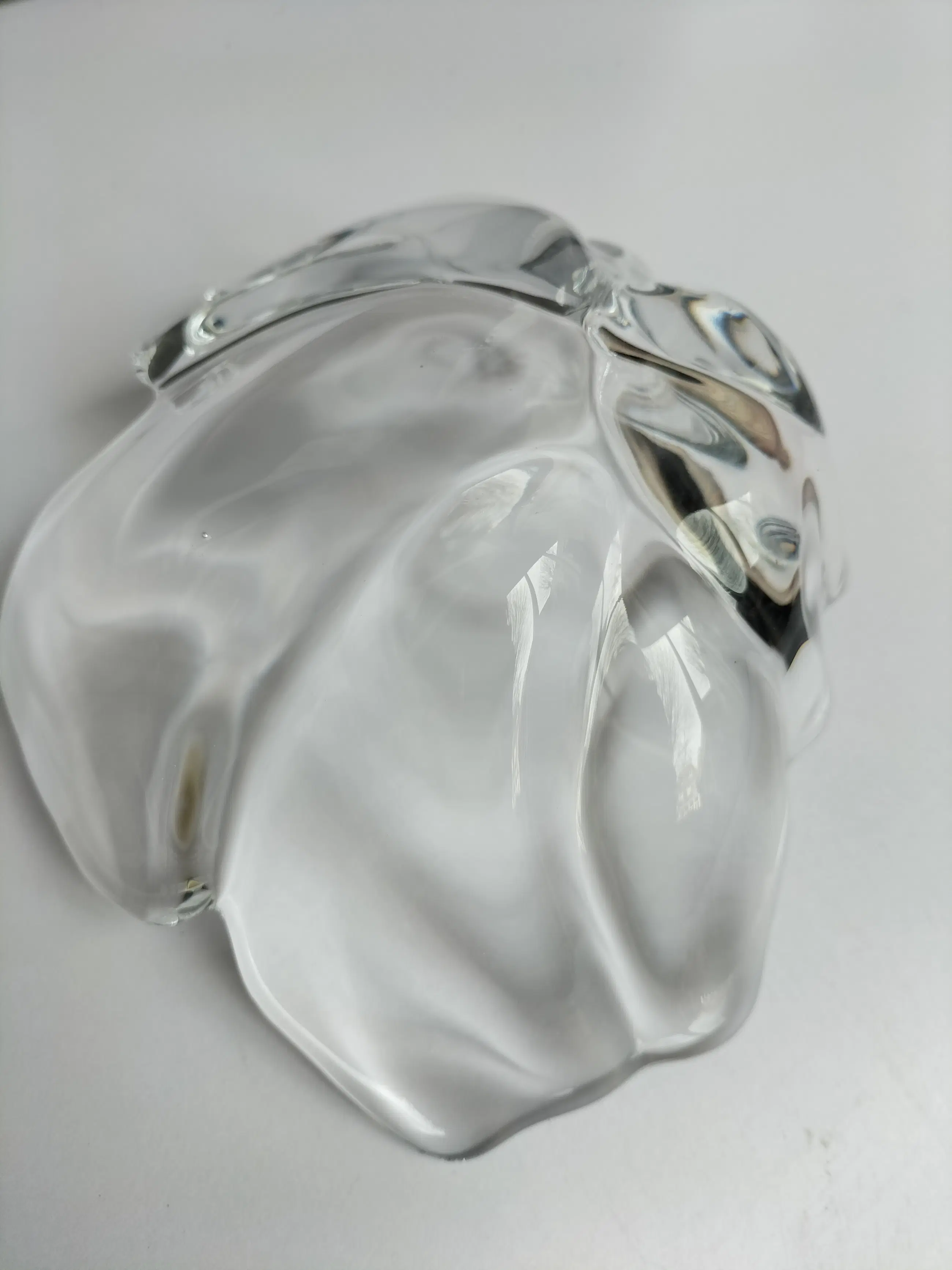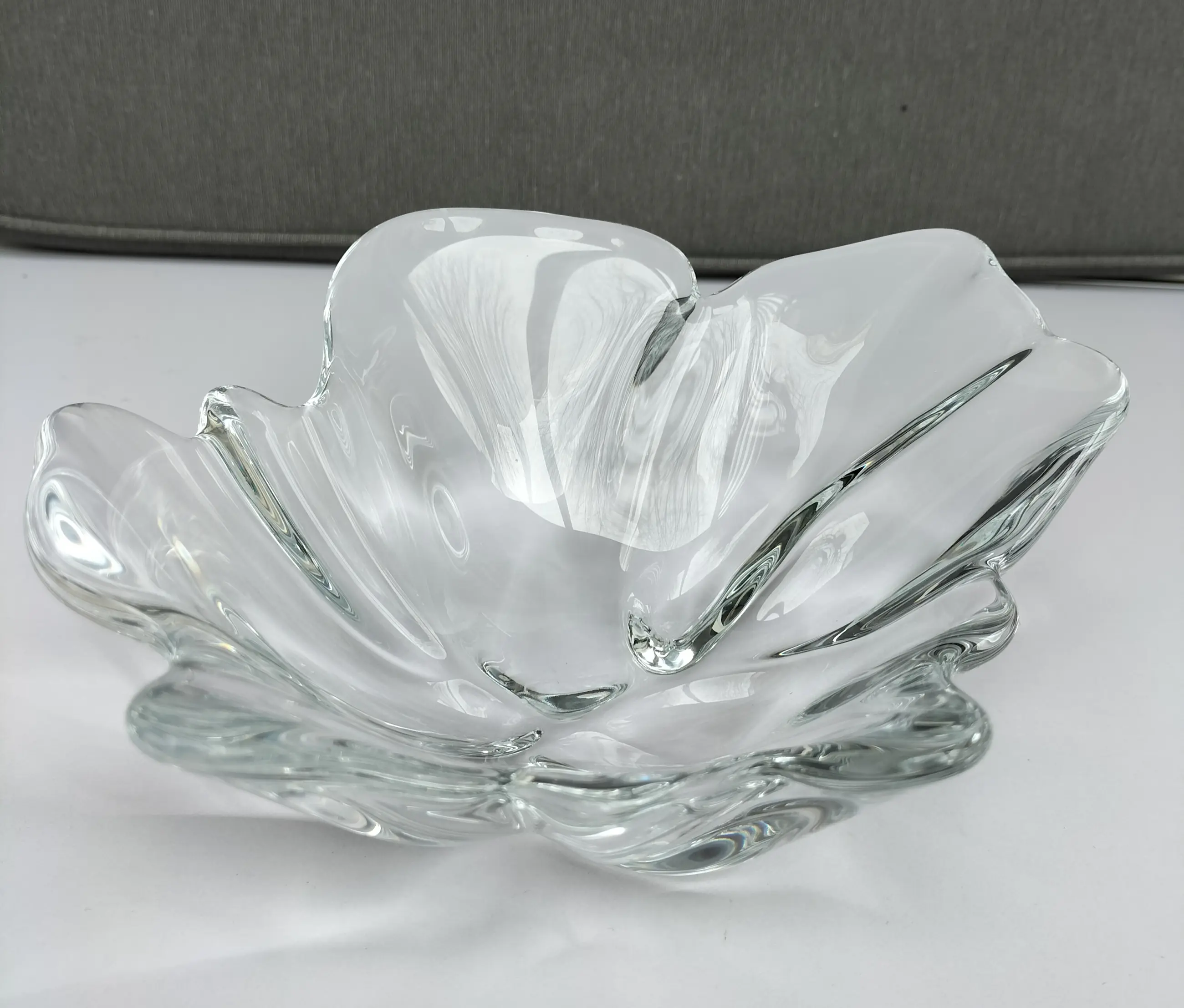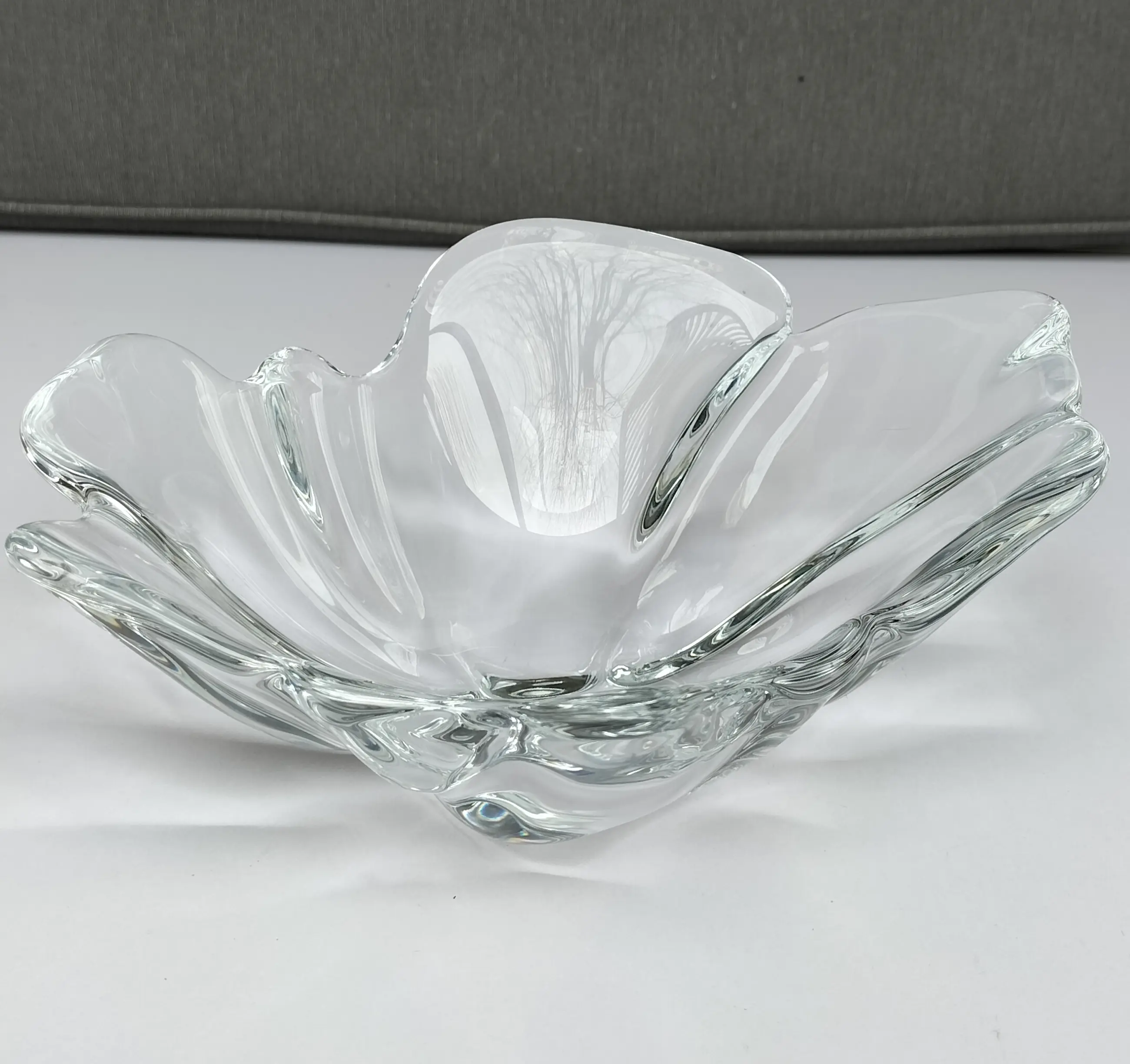 Mooie kristallen schaal naar het ontwerp van Ole Kortzau. Dik helder glas met een apart glanzend effect, het glas lijkt wel satijn/fluweelachtig. De schaal heeft de vorm van een blad of bloem en bezit golvende randen die niet overal even hoog zijn. Het ontwerp staat ook wel bekend onder de naam "Natura". In werkelijk uitstekende staat met zeer minimale gebruikssporen. Een bijzonder en decoratief object dat met zorg verpakt en verzonden zal worden.