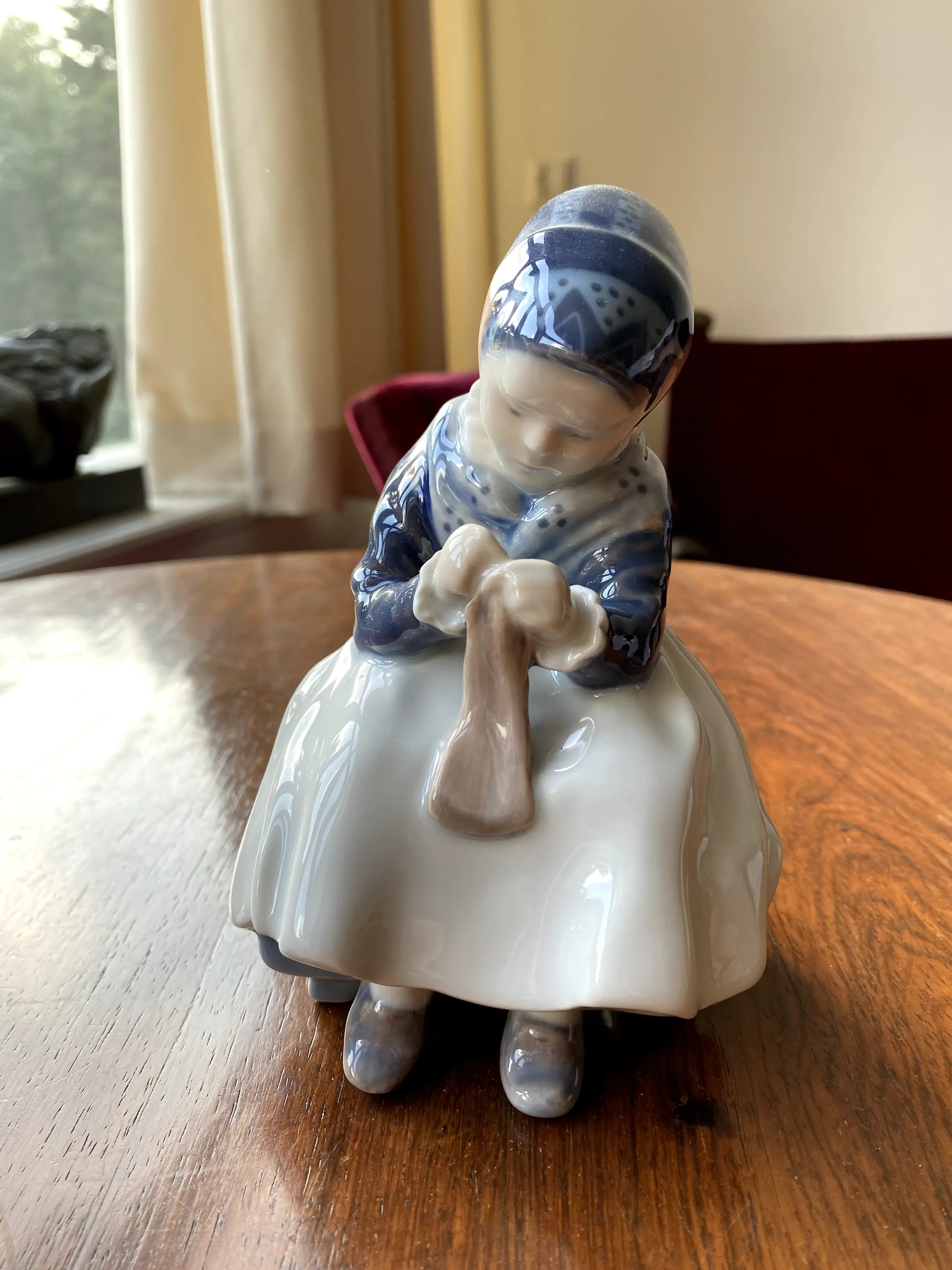 Keramiek beeldje van een meisje in klederdracht die aan het handwerken is.