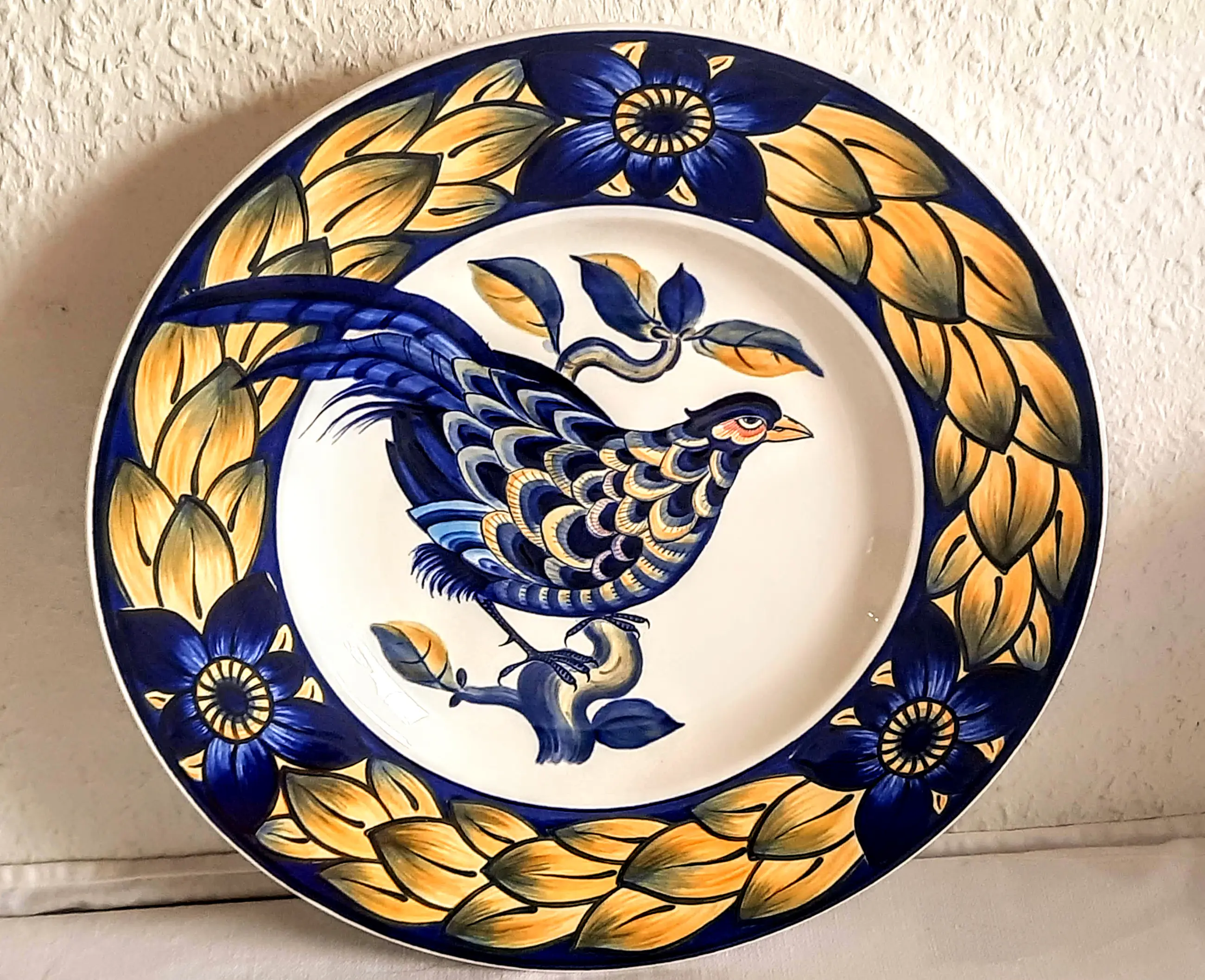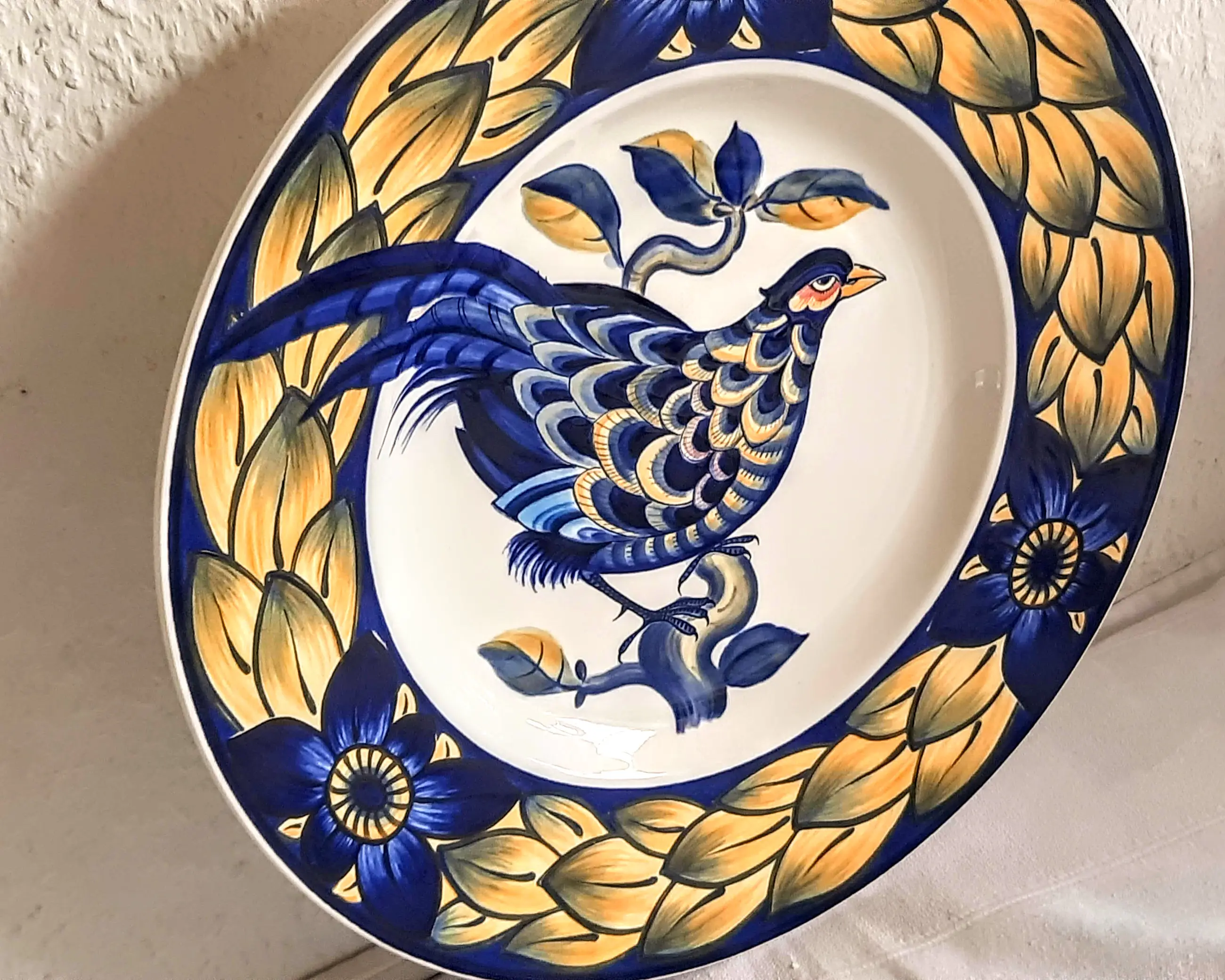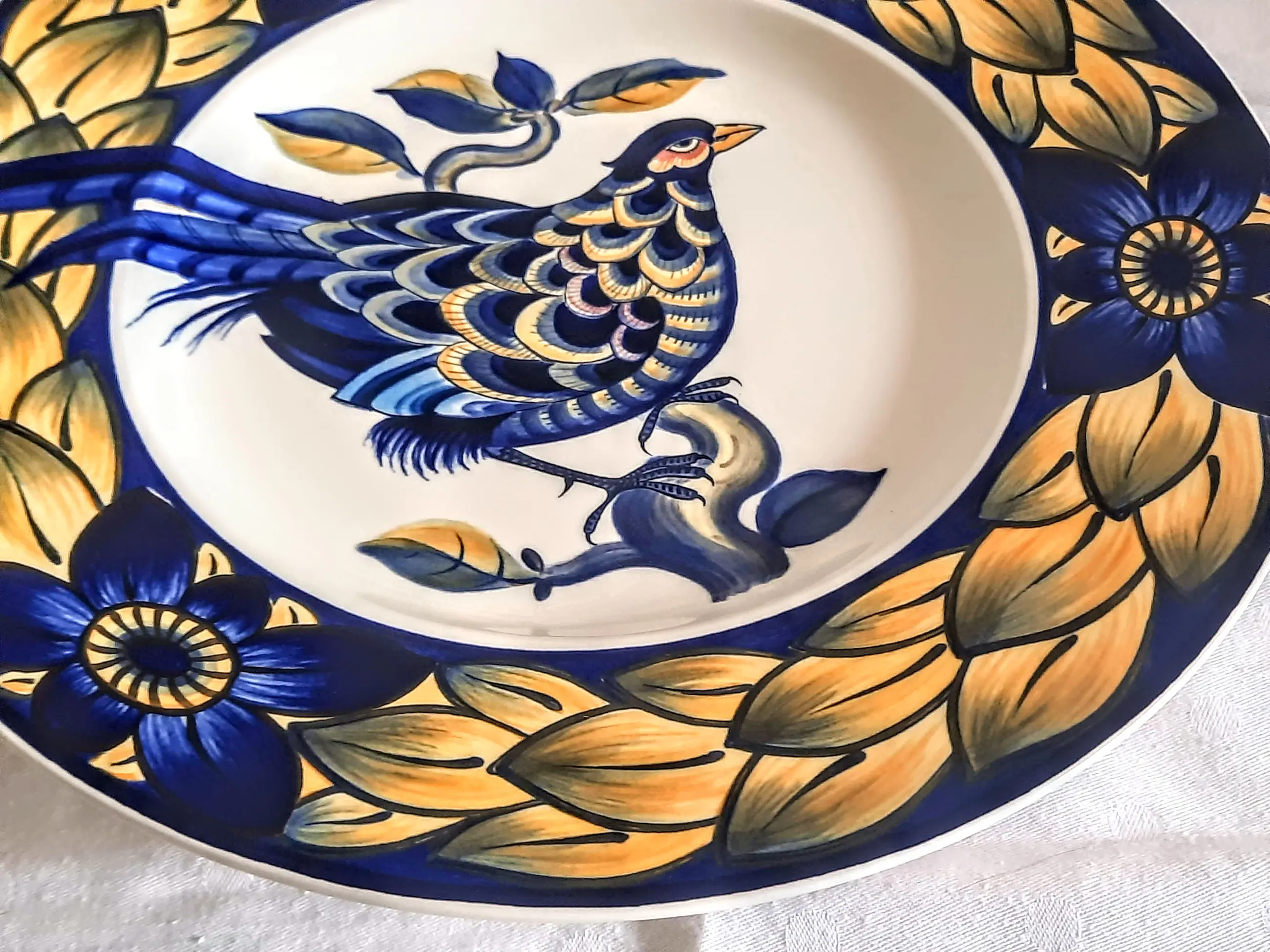 Het bord toont een blauwe fazant omringd door blauwe bloemen en geelgroene bladeren, bekend als het beroemde Blauwe Fazant-patroon, ontworpen in 1978 door de Deense keramiek- en schilder Christian Joachim Petersen.
