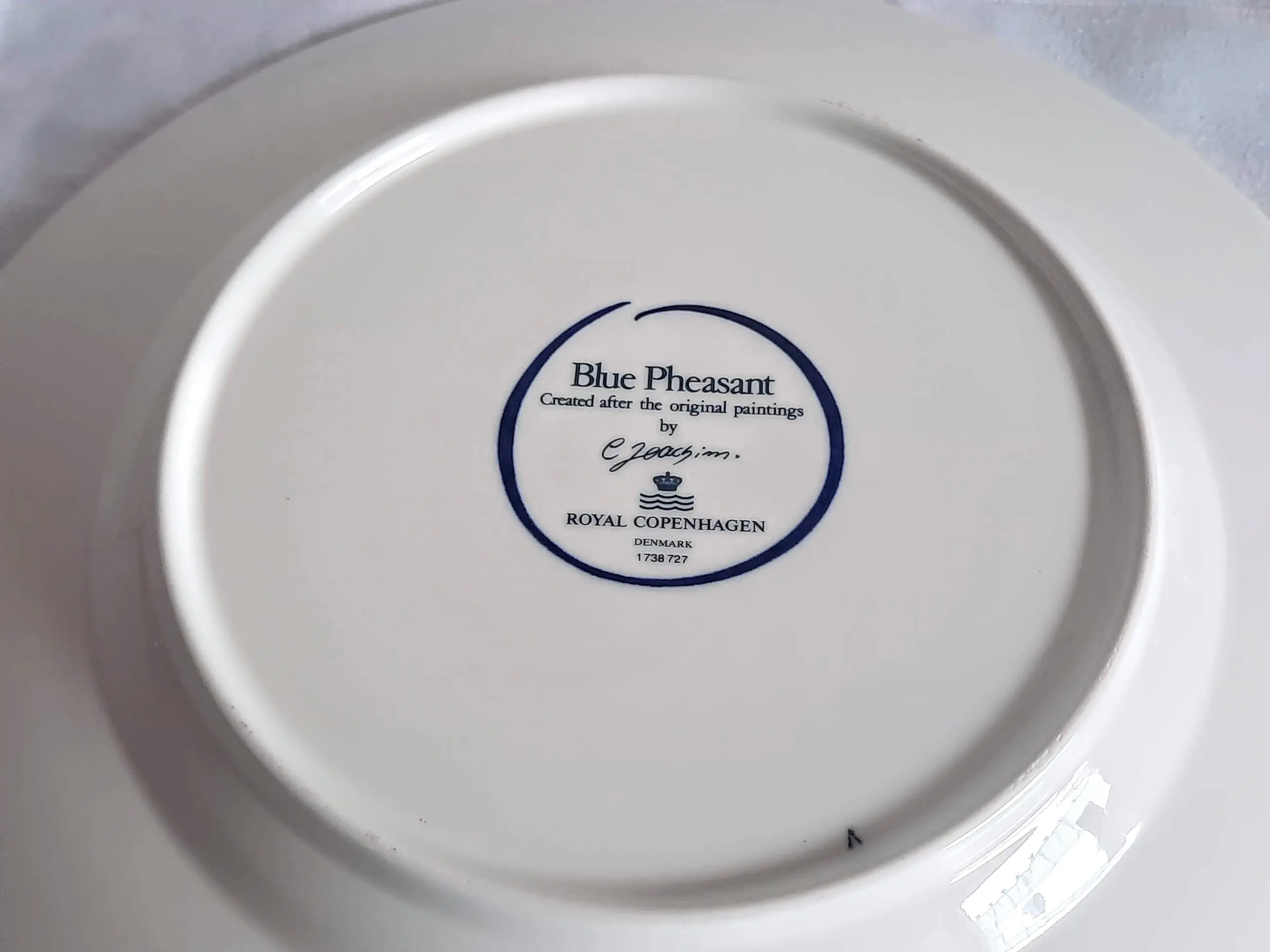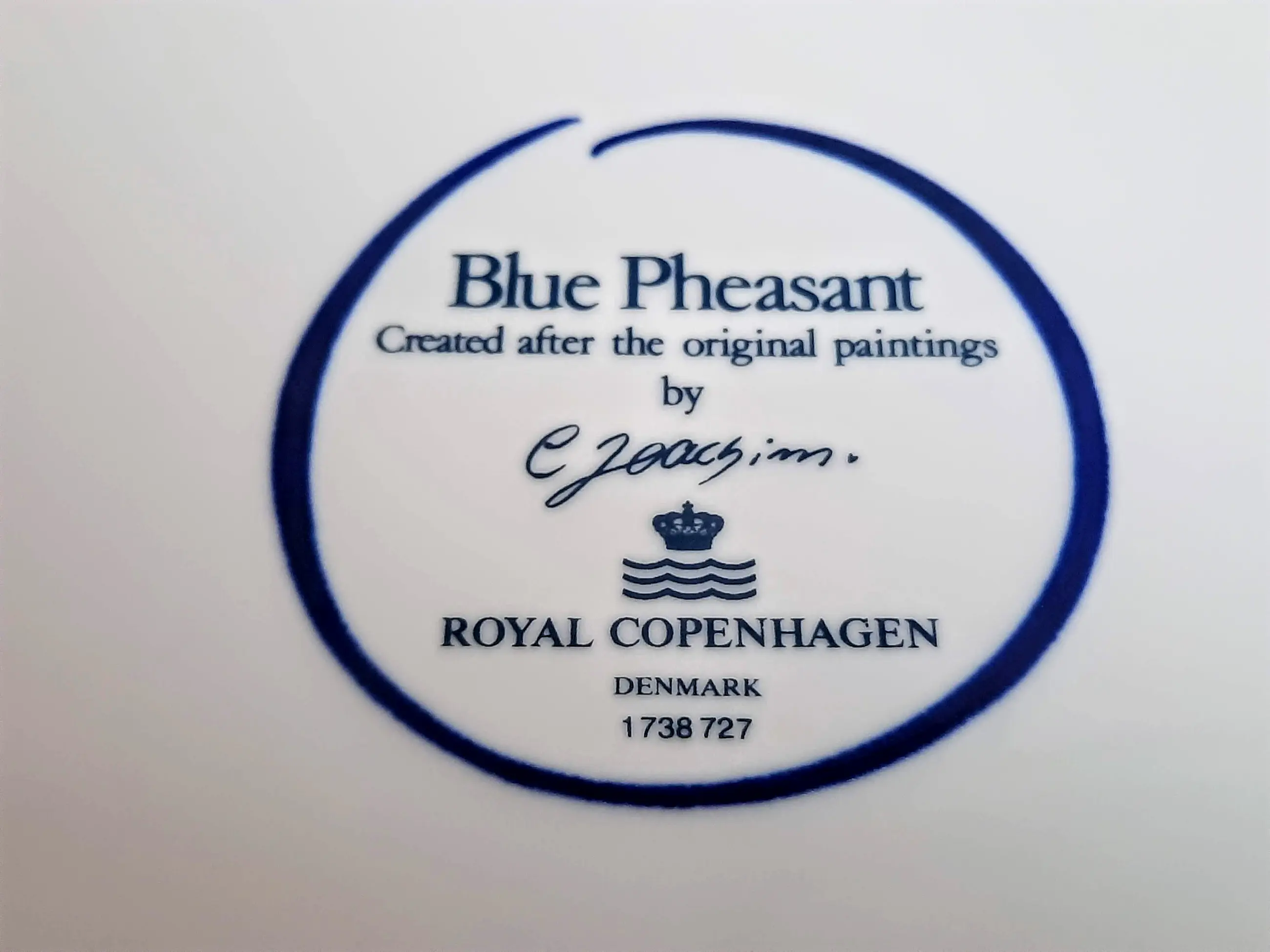 Het bord heeft een diameter van 28 cm, een hoogte van 4 cm en is aan de onderkant gemerkt met de stempel "Blue Pheasant, Created after The original paintings by "e Joachim " (for Christian Joachim Petersen) Royal Copenhagen Denmark".