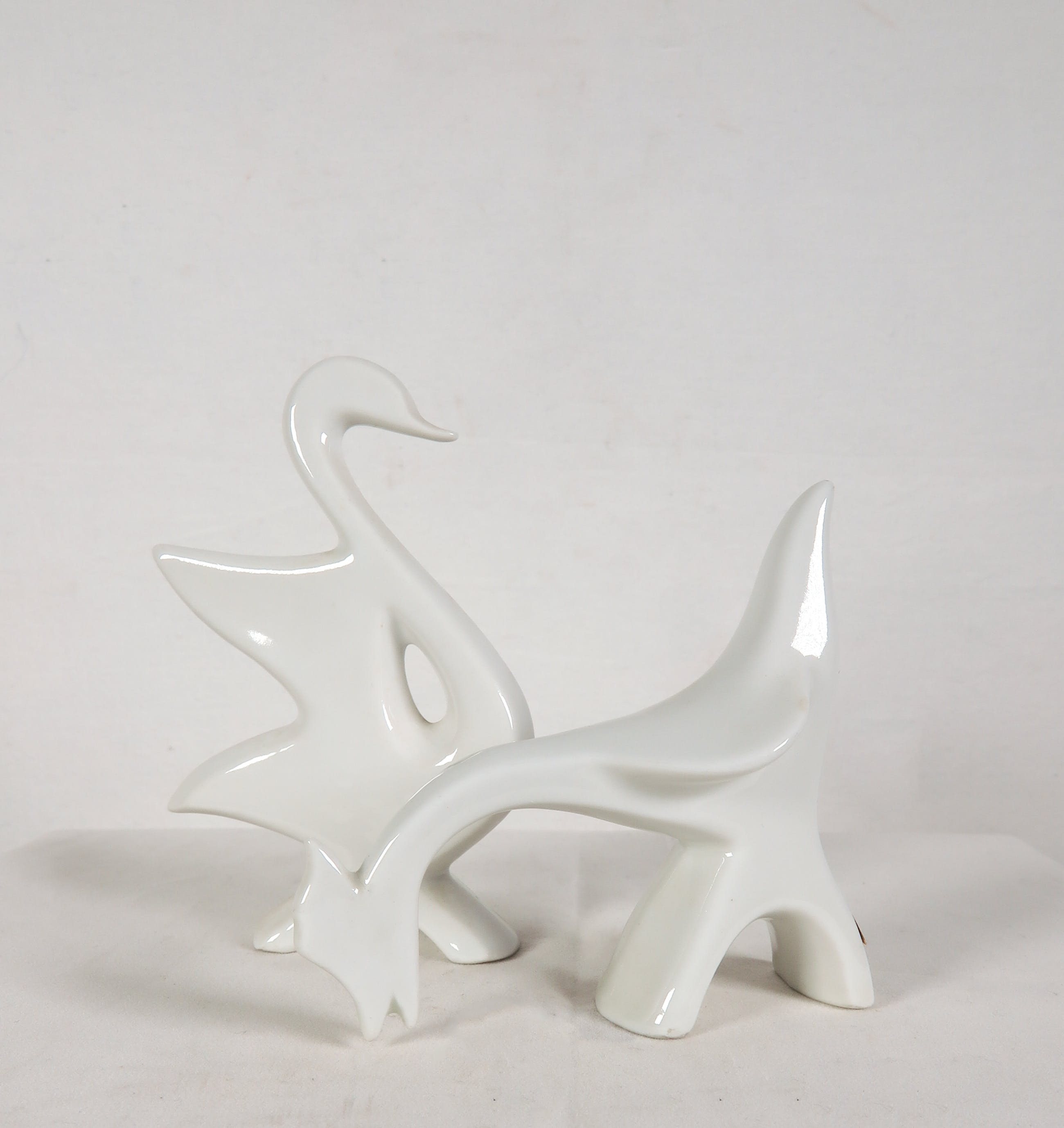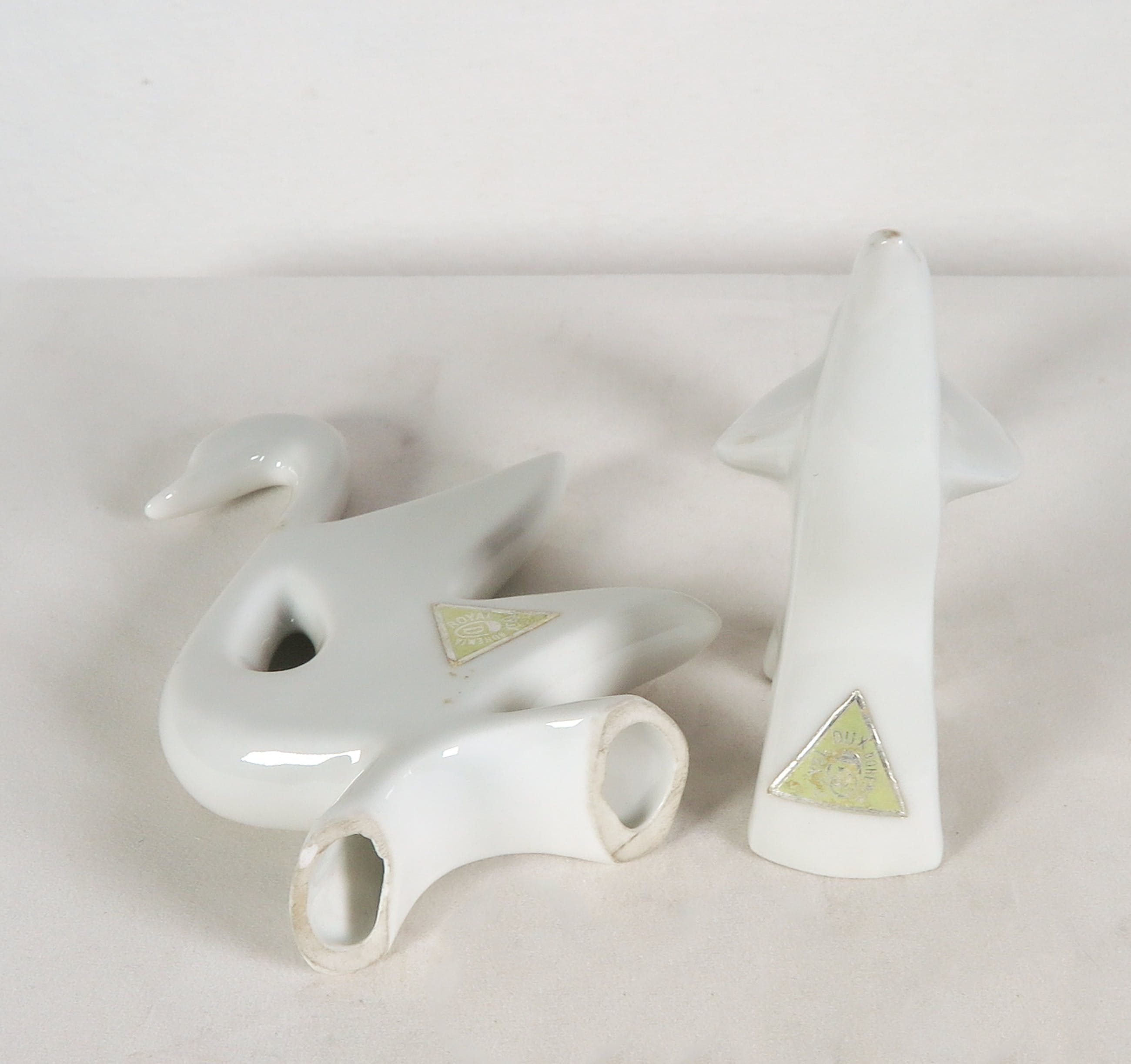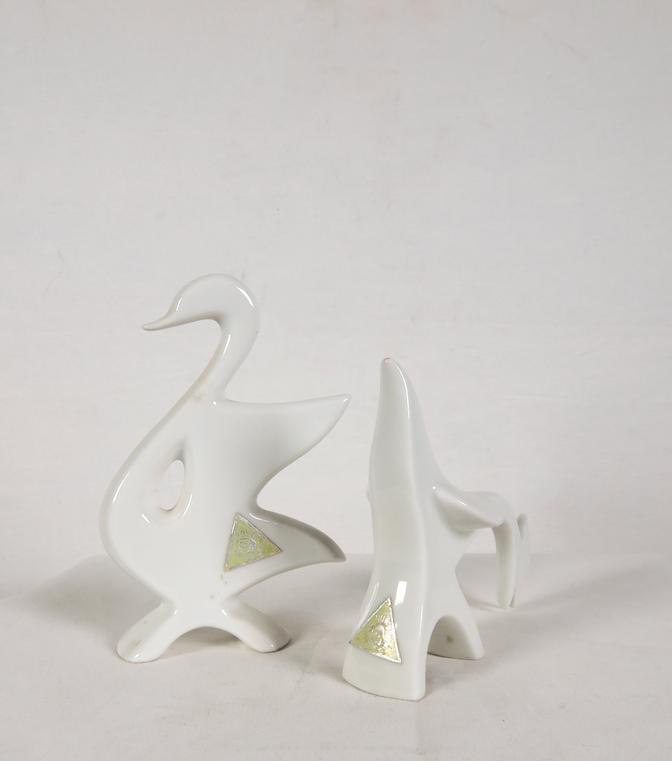| ein wenig Anschlag auf den Figuren, kann durch Saubermachen entfernt werden. Am Fuss des Schwans ist ein ganz kleines Stückchen weg gebrochen und ebenfalls am Schwanz des Huhns. | |||||||||||