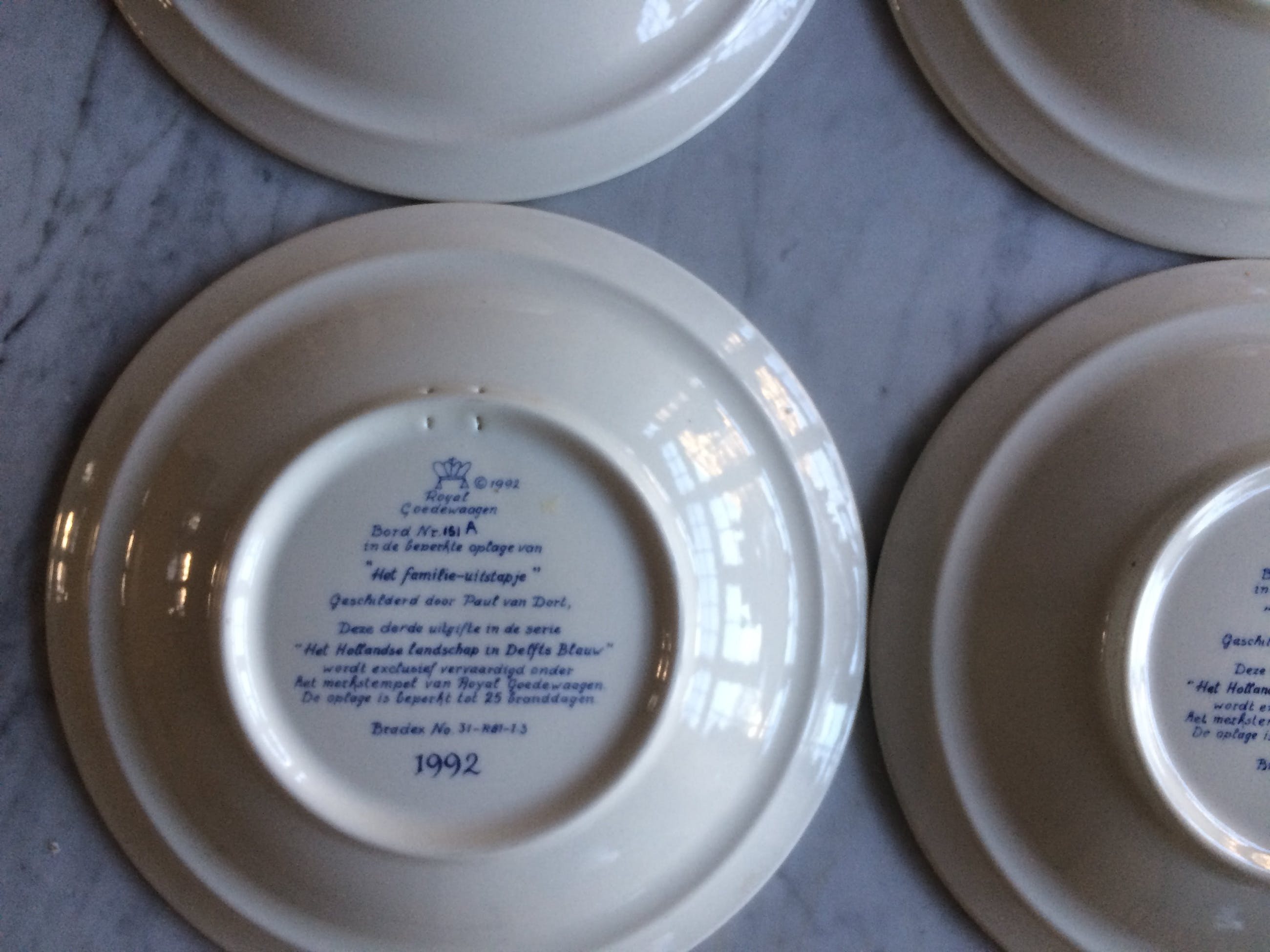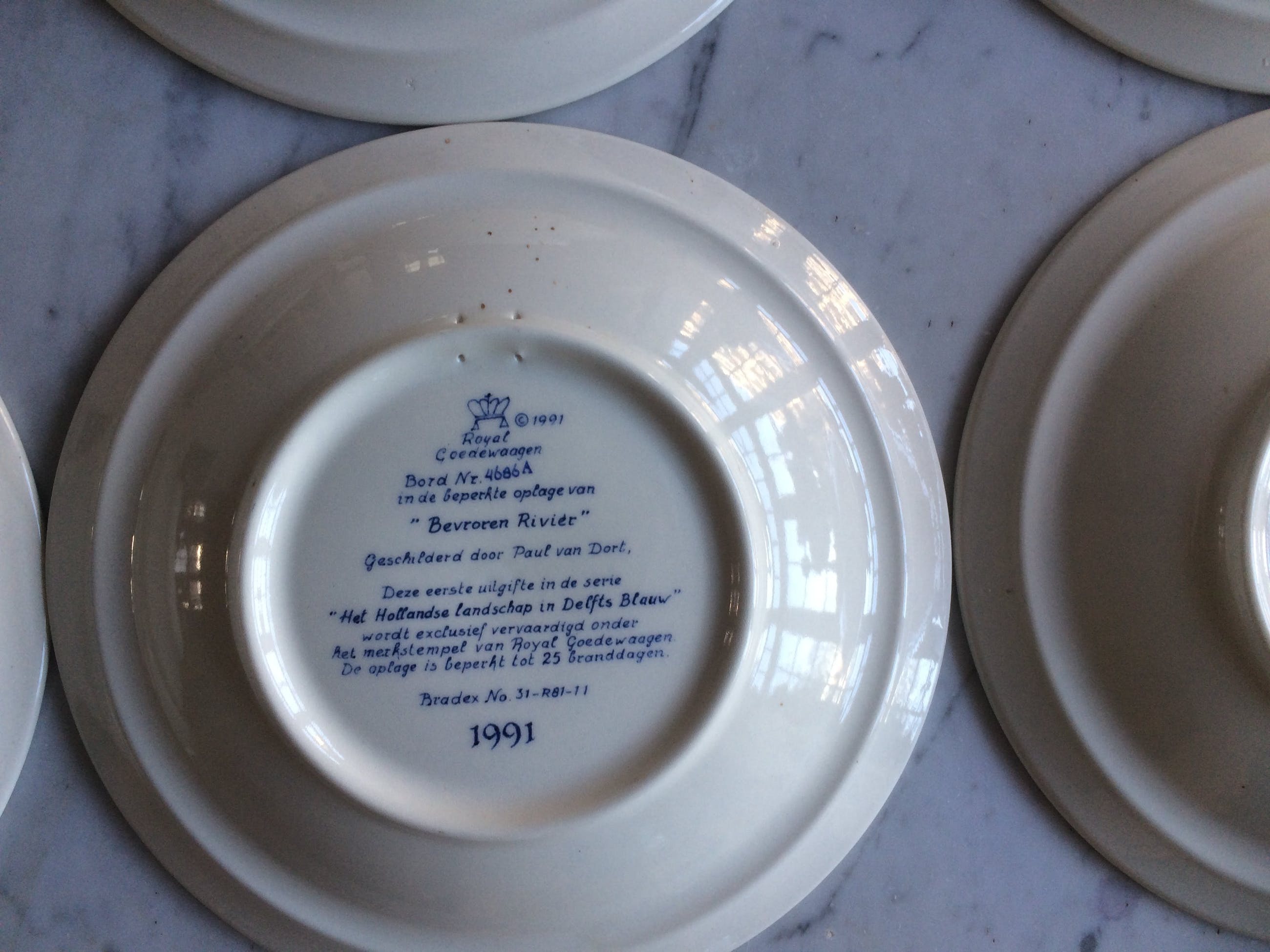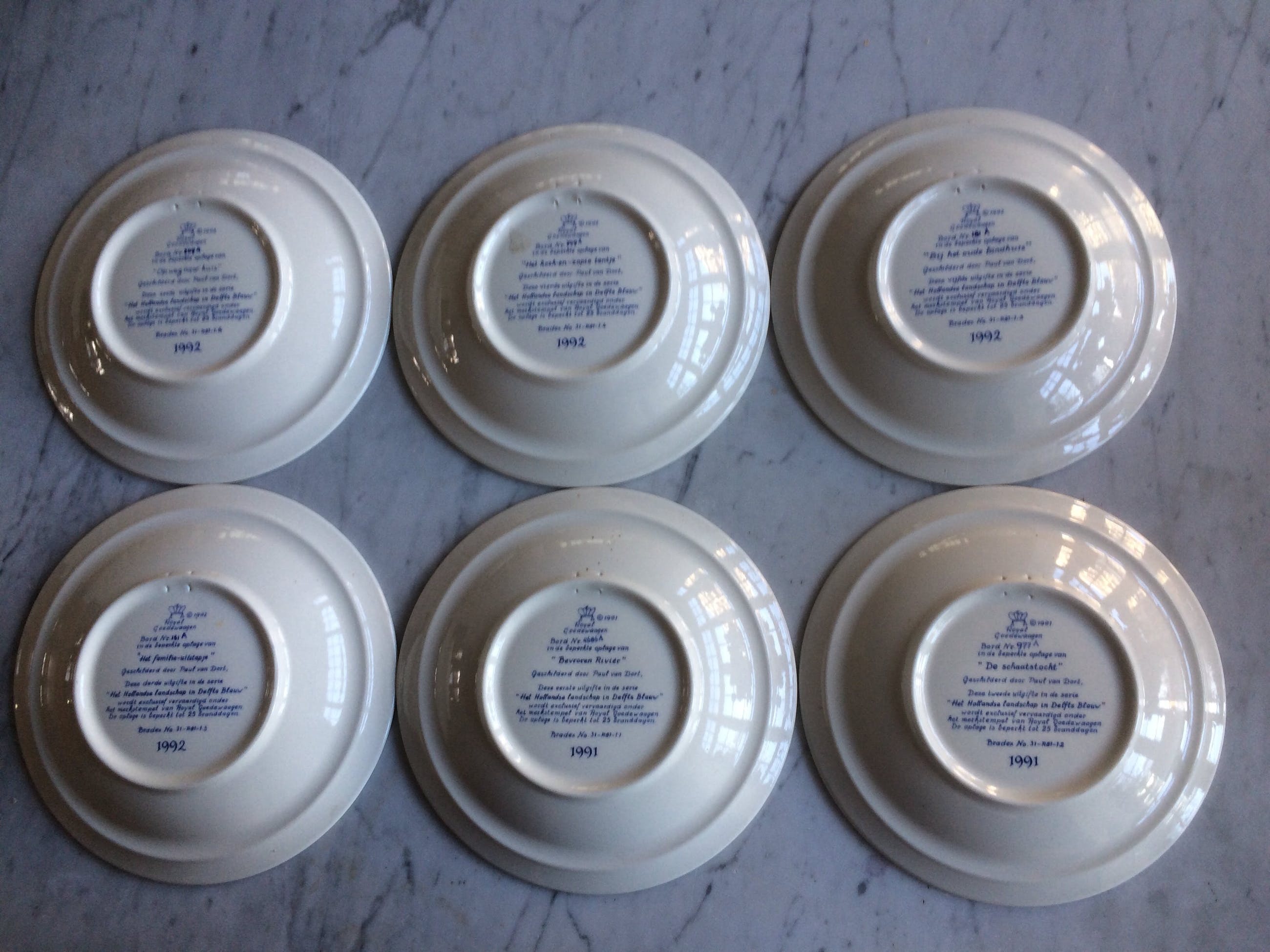 6 ongebruikte delftsblauwe wand-borden uit de serie “ Het Hollandse Landschap in Delfts Blauw.” Het zijn 6 verschillende rustieke plekken in Nederland. Alle voorstellingen geschilderd doorde bekende kunstenaar Paul van Oort. Hij heeft de borden gesigneerd. De borden zijn getiteld, genummerden in beperkte oplage gemaakt. Verzending per PostNL ( k.k. )Ophalen in Rotterdam op afspraak. LAATSTE KANS !!!