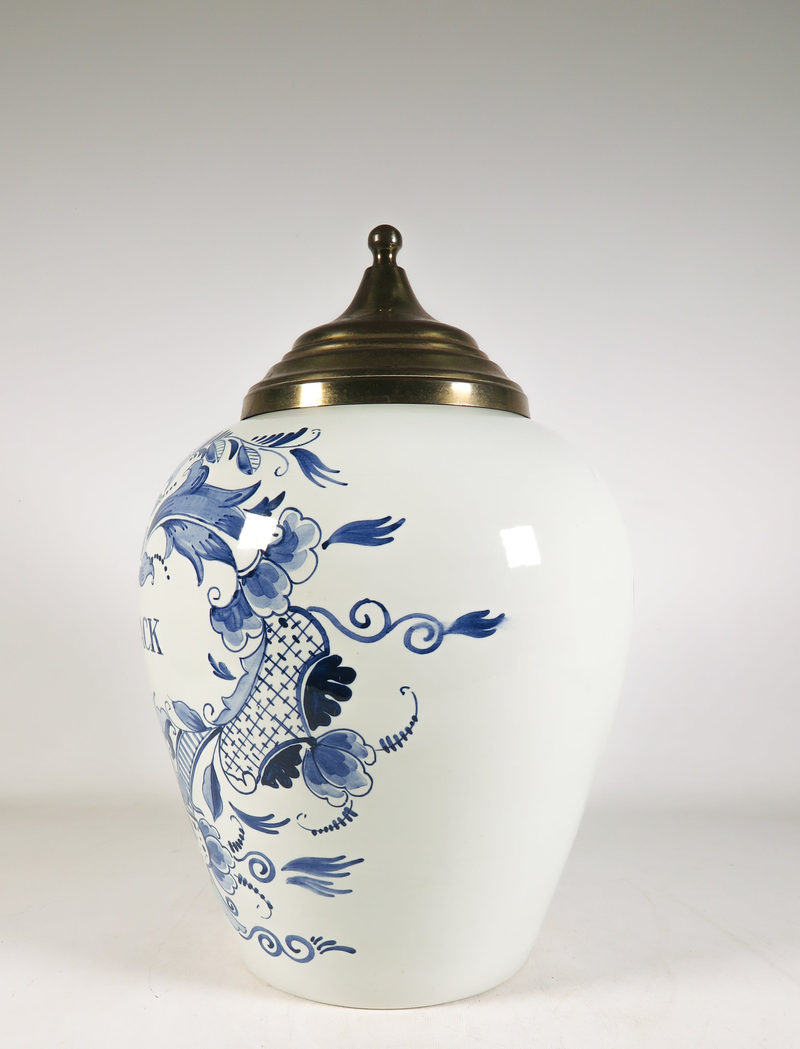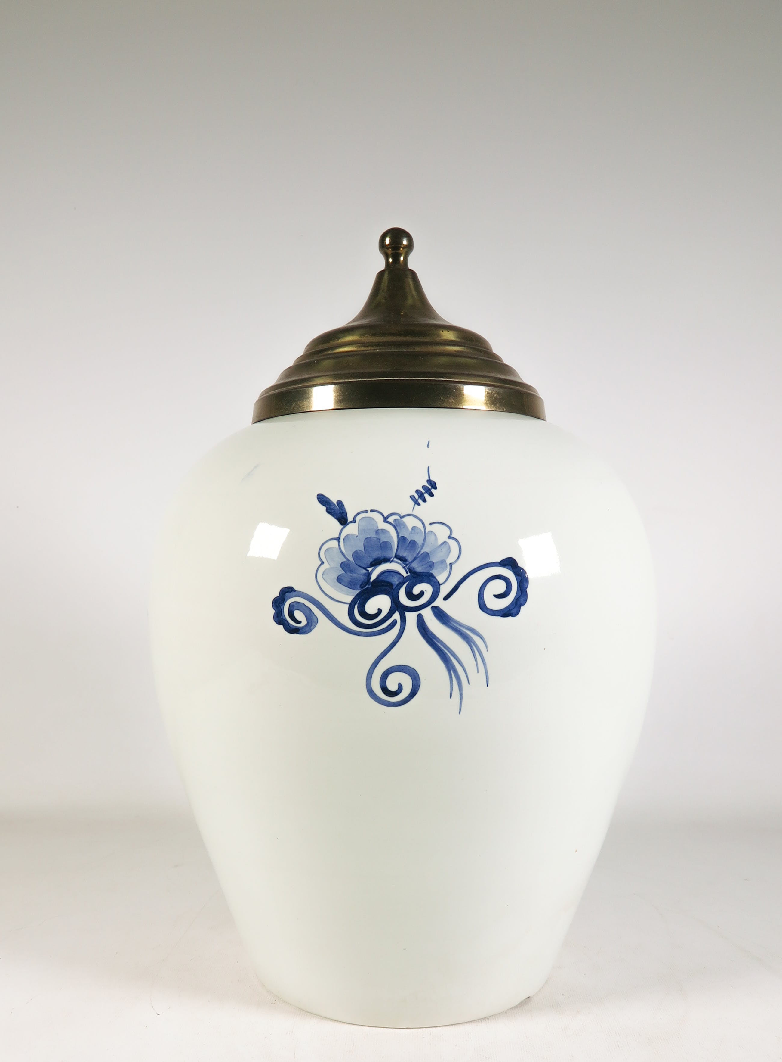 | Over het algemeen in goede staat. Aan de binnenzijde craquelé in het glazuur. Langs de onderste mist een scherf, te zien op de foto van de onderzijde van de pot. | |