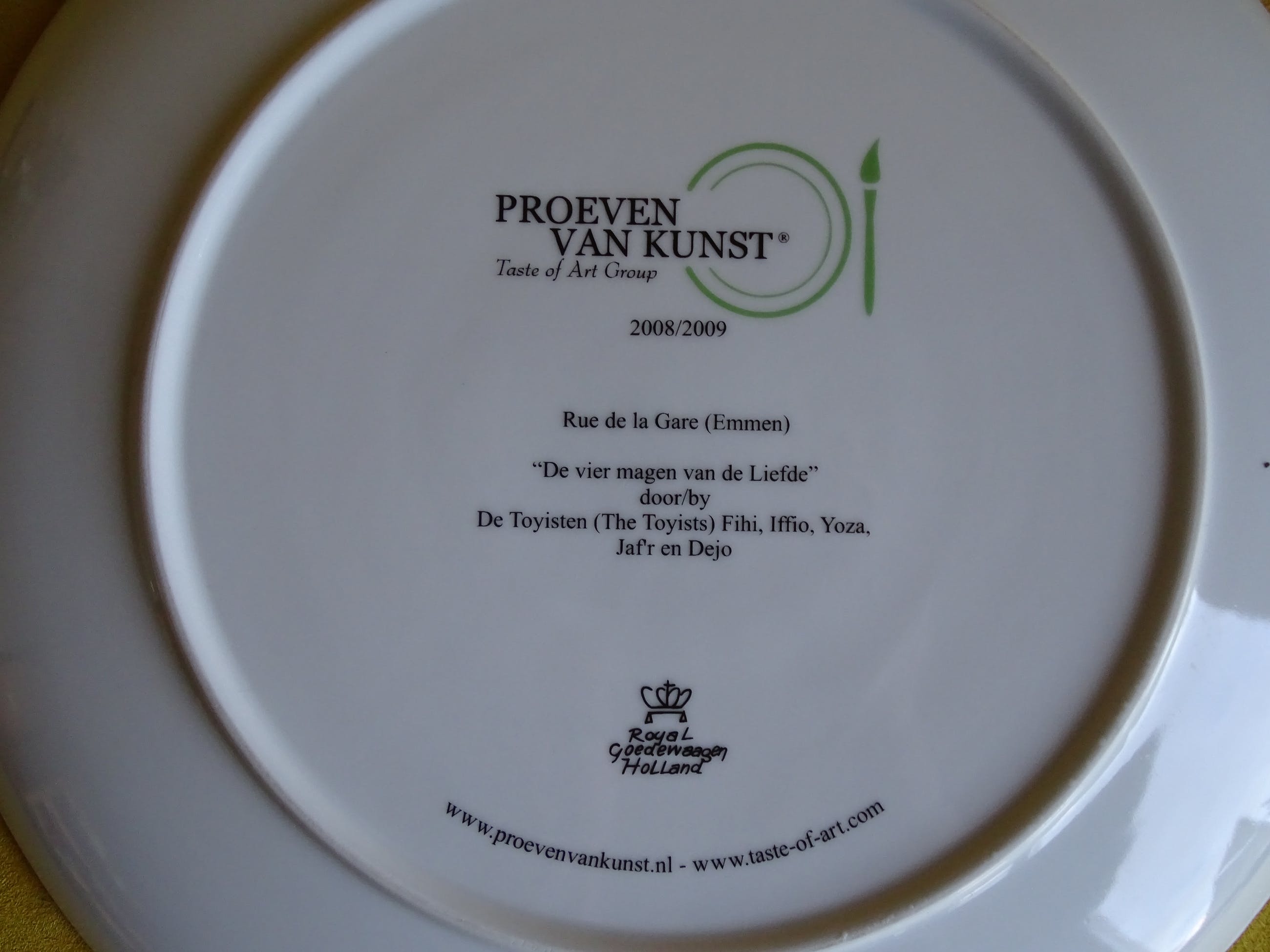 Porseleinen bord van De Toyisten voor Royal Goedewaagen.Bord is naar een schilderij van de genoemde kunstenaars.
