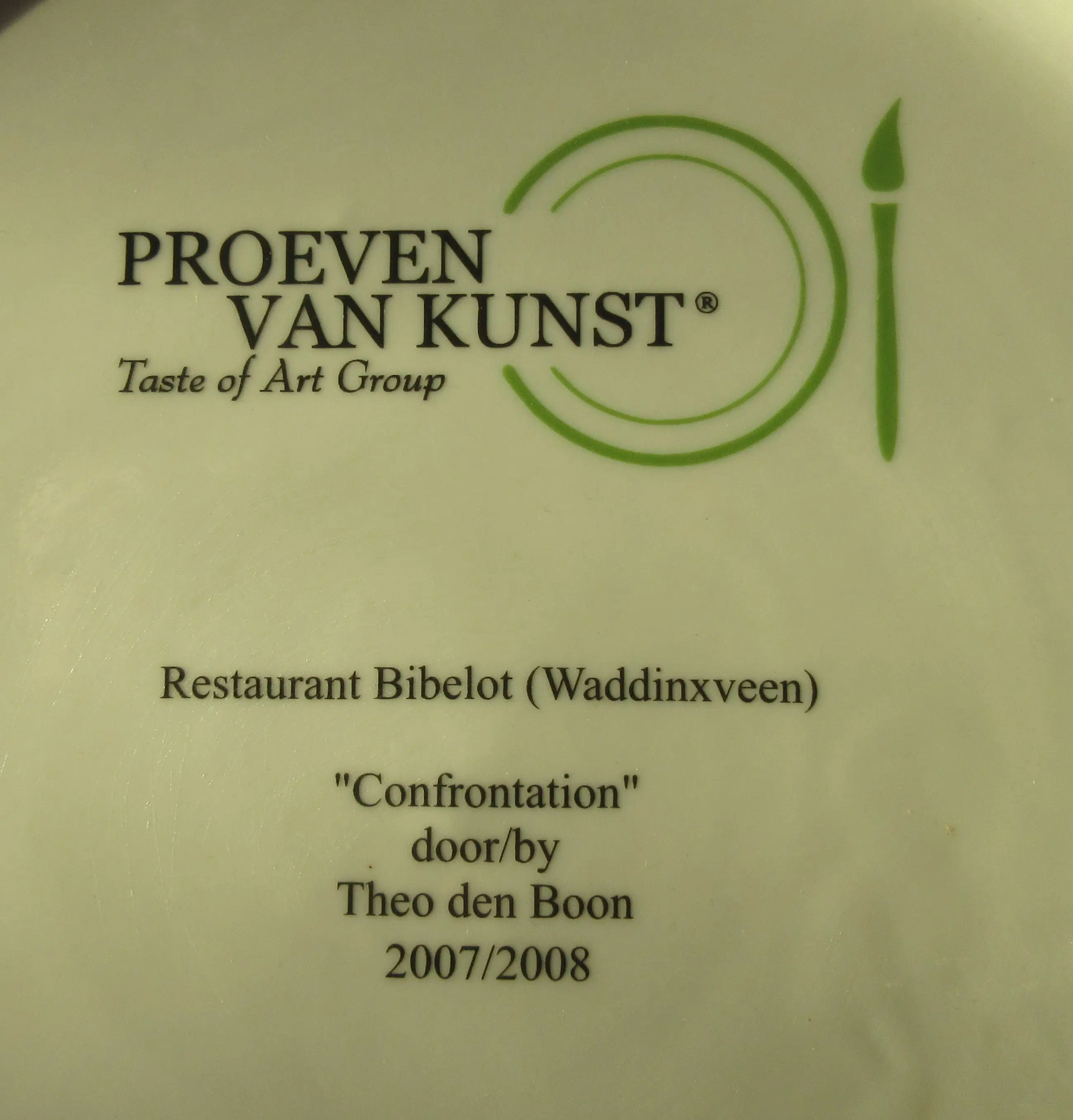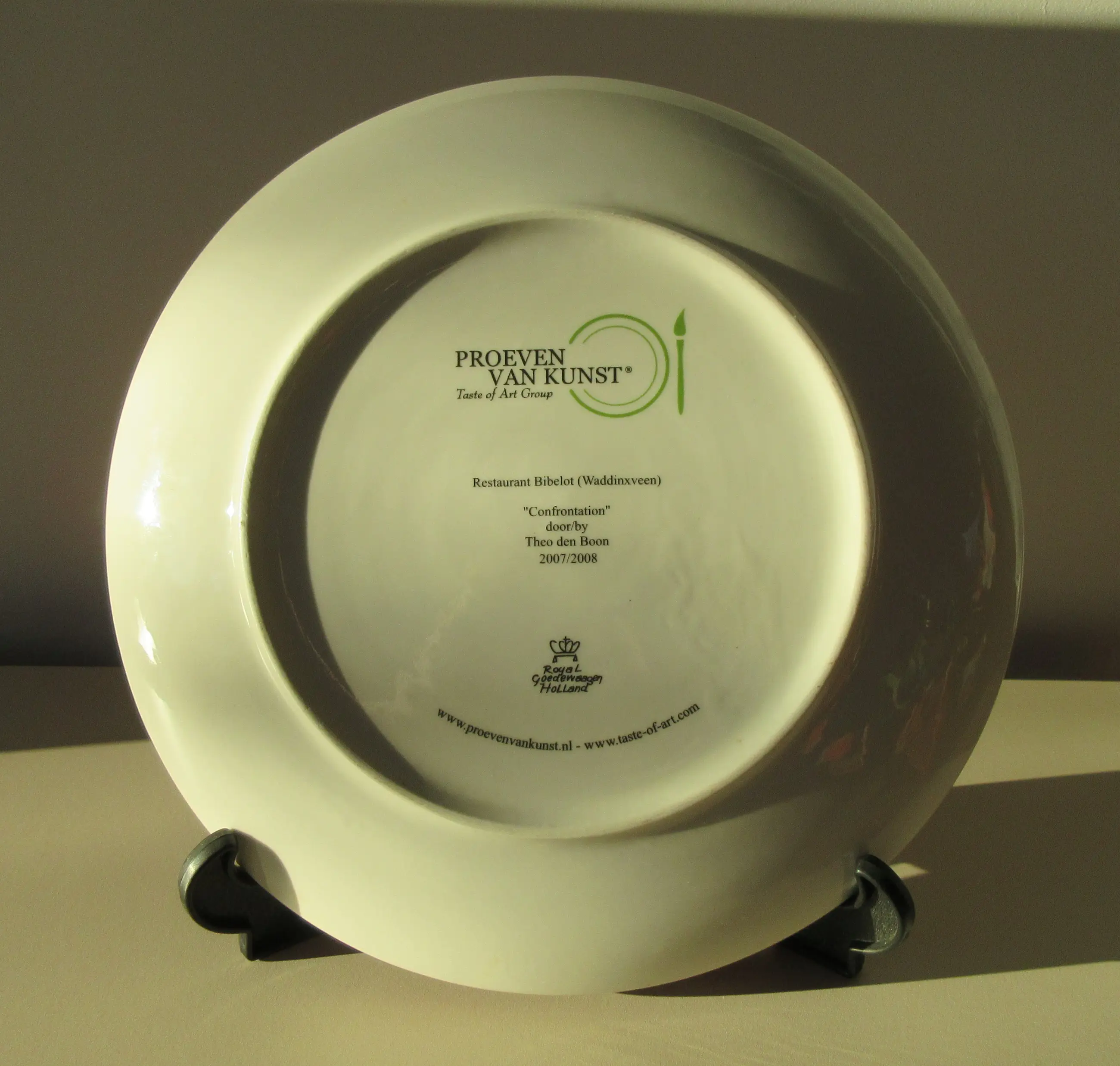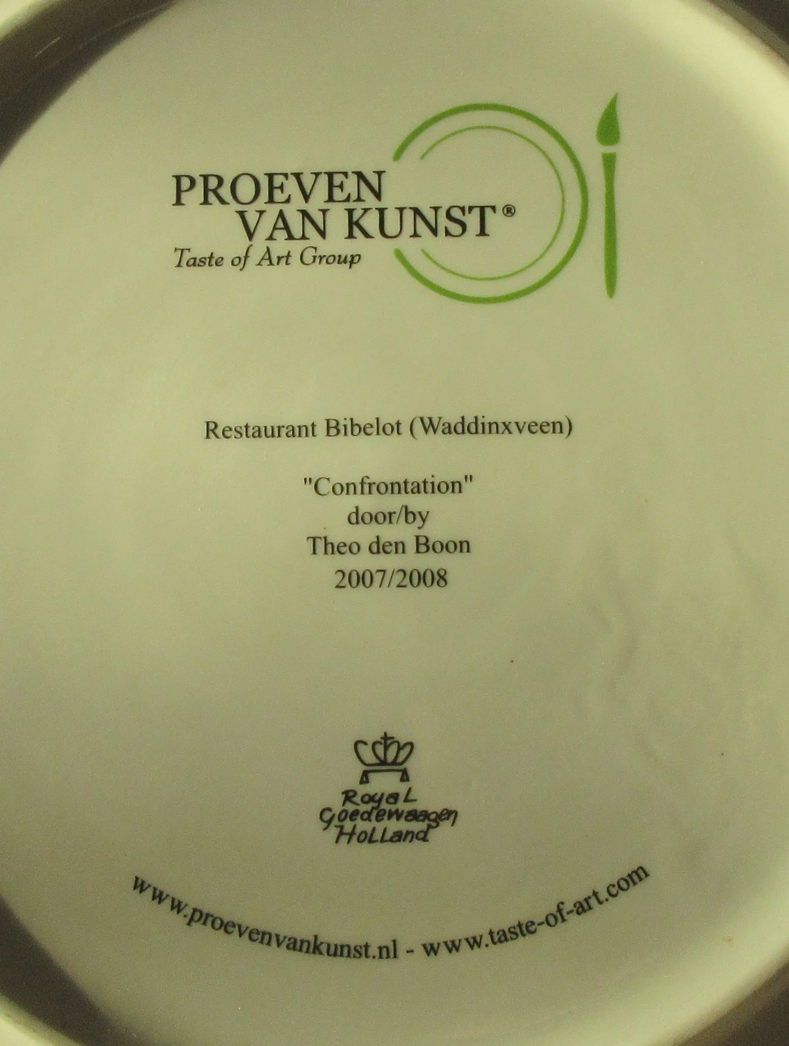 Platelen bord Confrontation - ontworpen door Theo den Boon in 2007-2008 in de serie Proeven van Kunst voor restaurant Bibelot in Waddinxveen. Het bord is uitgevoerd bij de Royal Goedewaagen. Aan de voorzijde is het bord gesigneerd en het is aan de achterzijde gemerkt en voorzien van jaartallen en allerlei tekst.