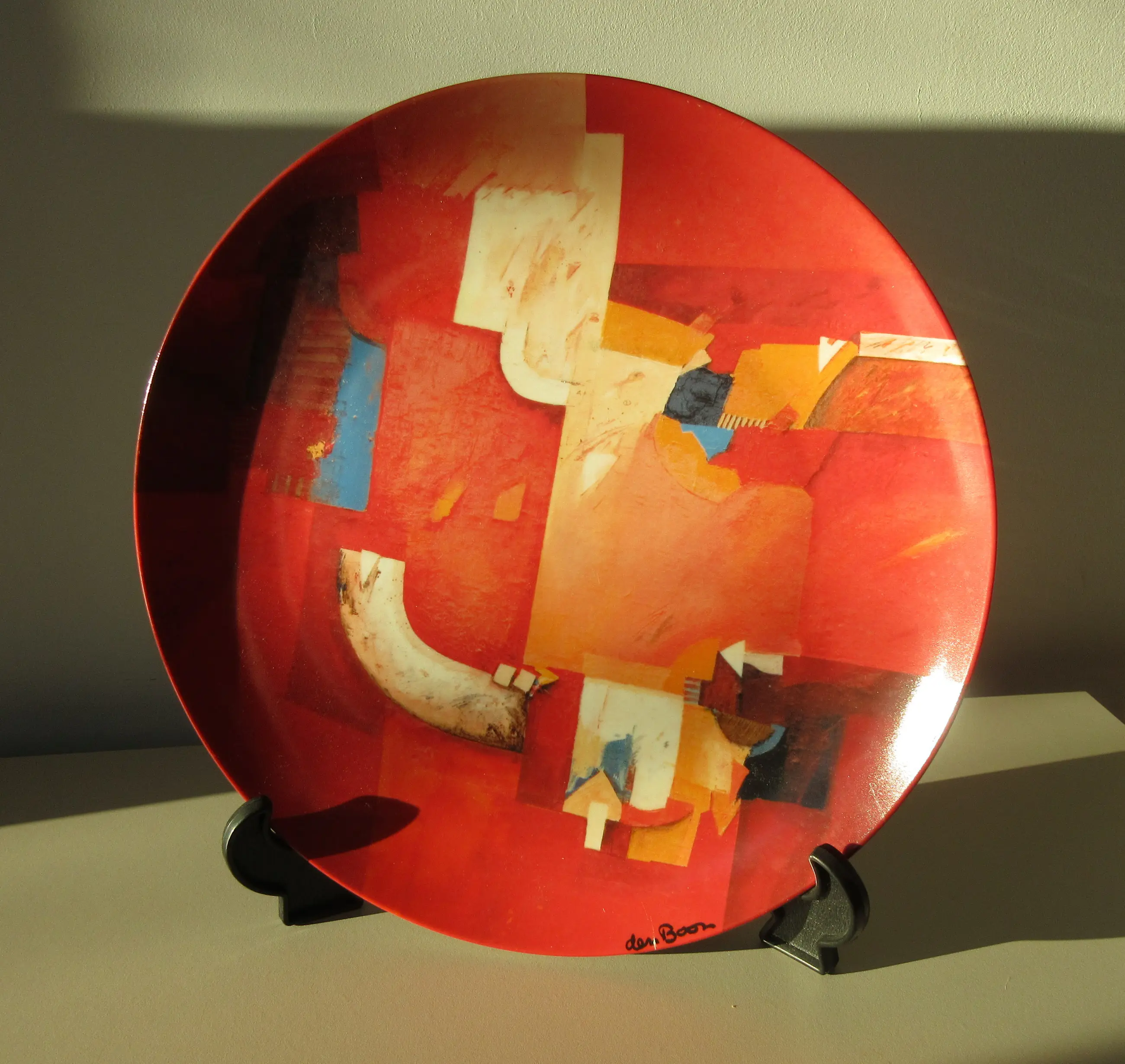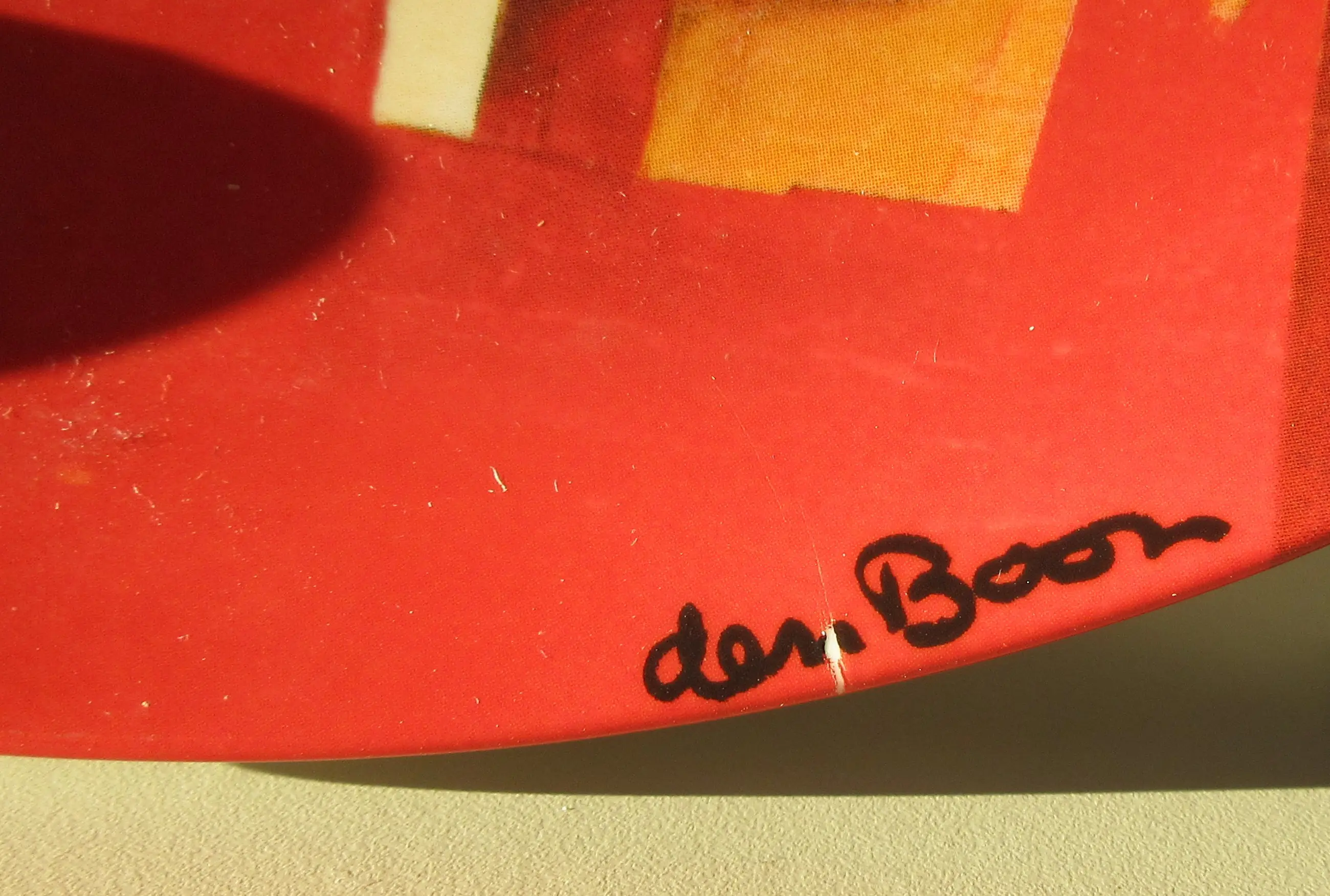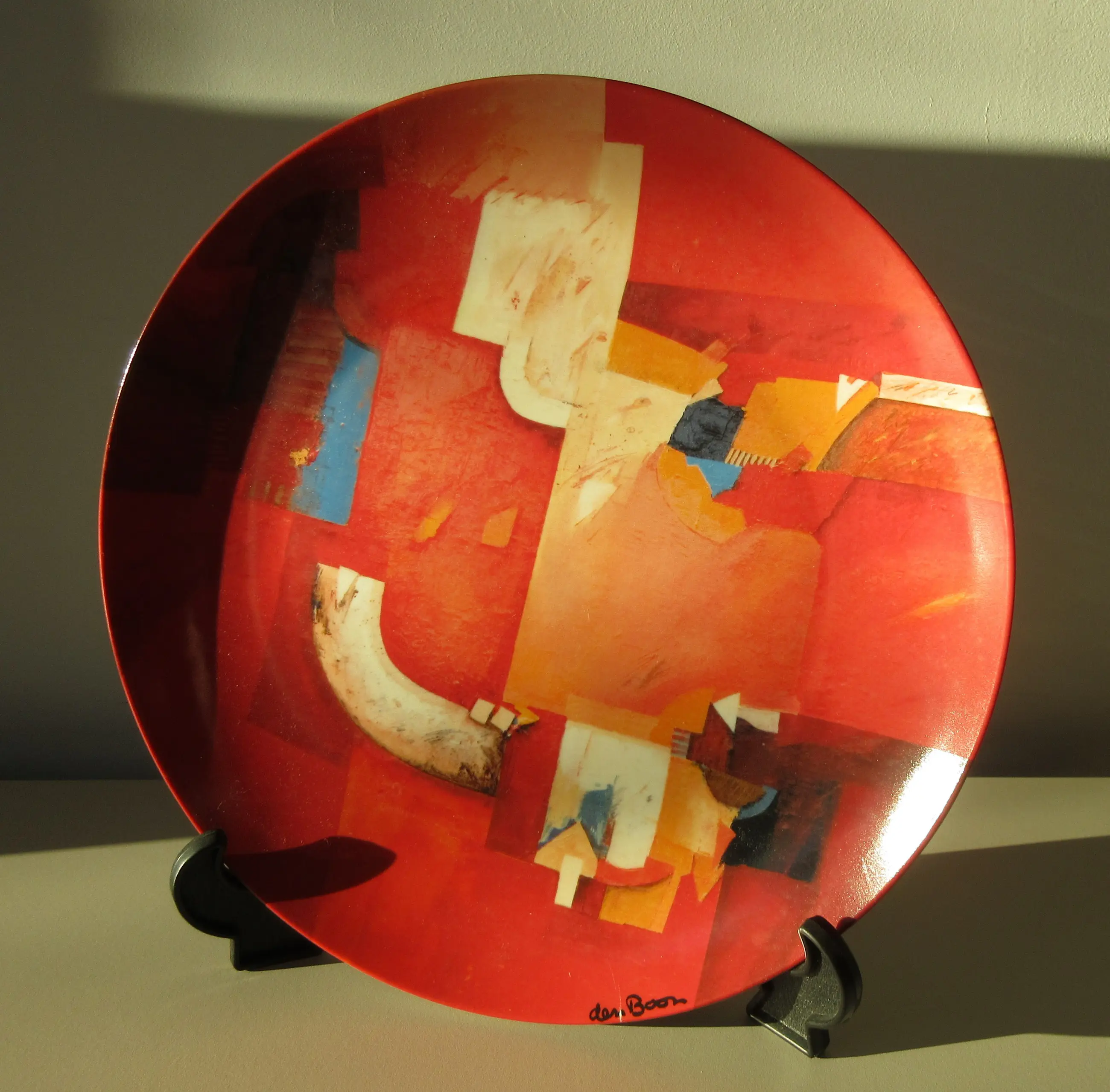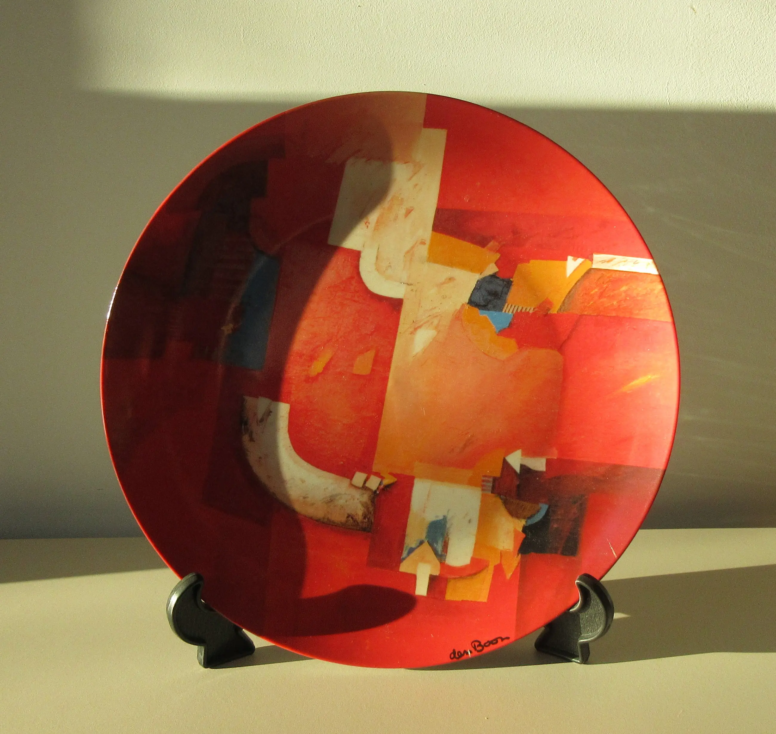 Platelen bord Confrontation - ontworpen door Theo den Boon in 2007-2008 in de serie Proeven van Kunst voor restaurant Bibelot in Waddinxveen. Het bord is uitgevoerd bij de Royal Goedewaagen. Aan de voorzijde is het bord gesigneerd en het is aan de achterzijde gemerkt en voorzien van jaartallen en allerlei tekst.