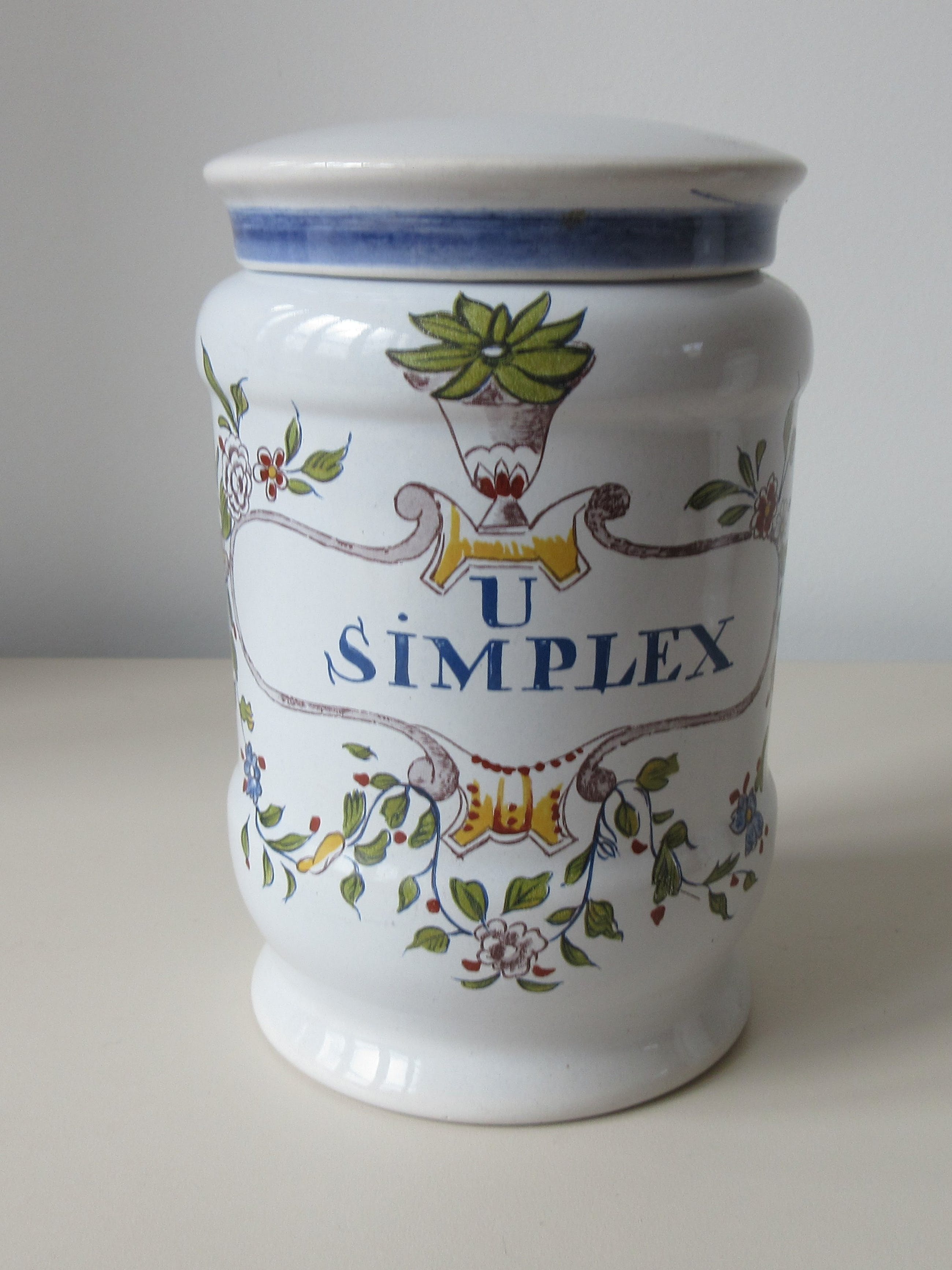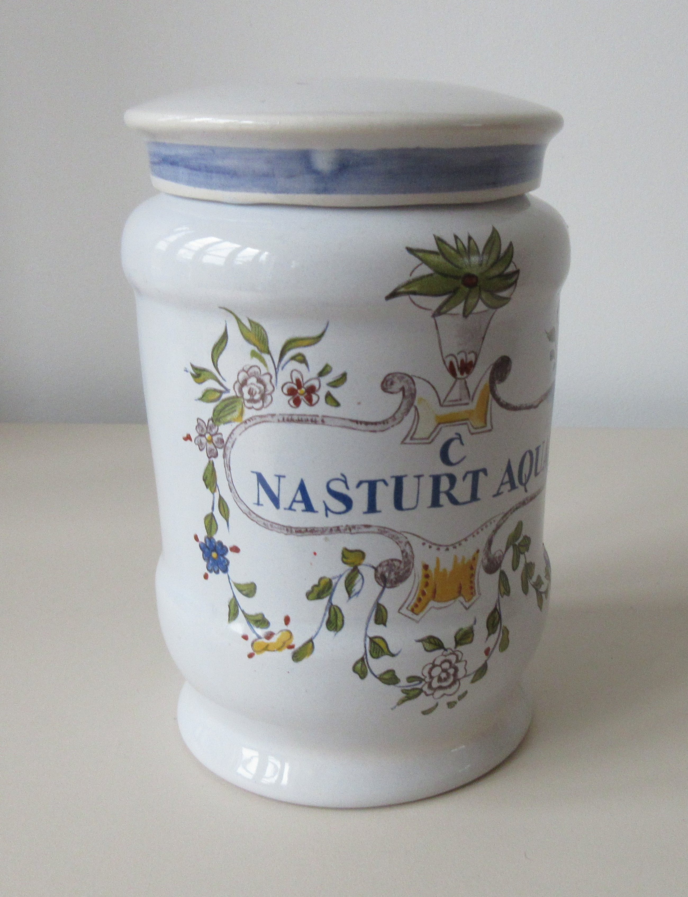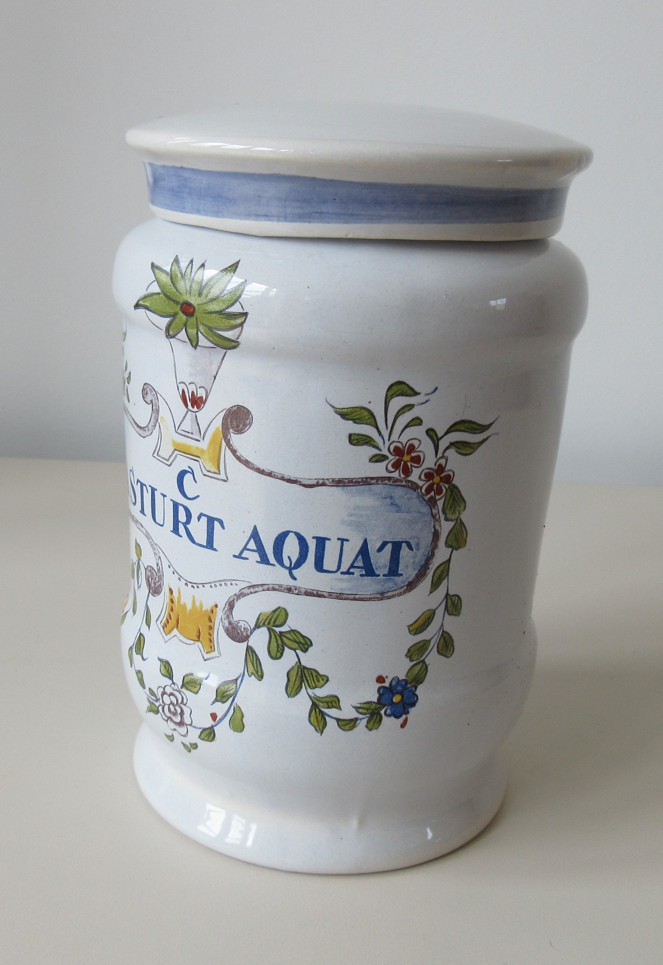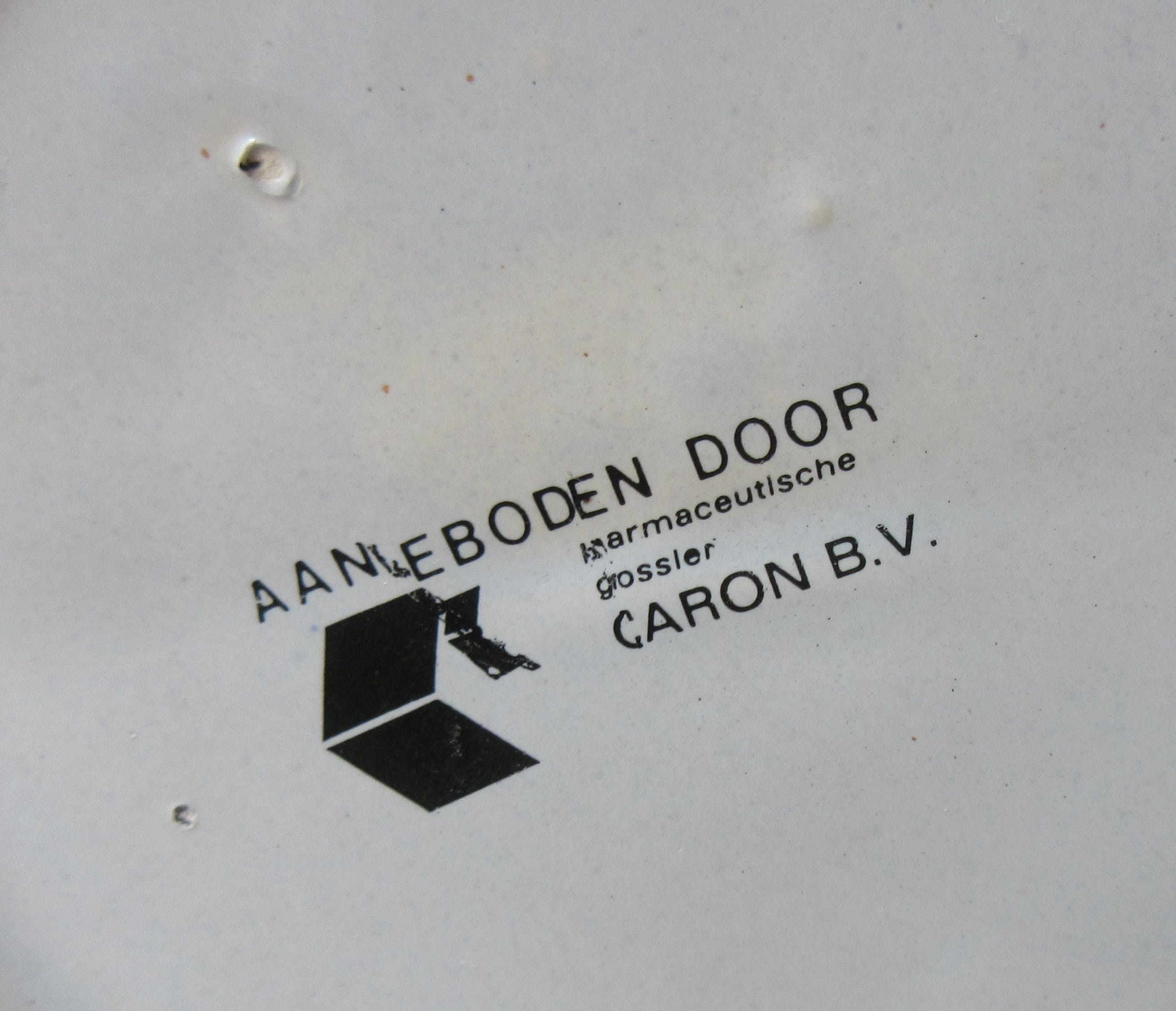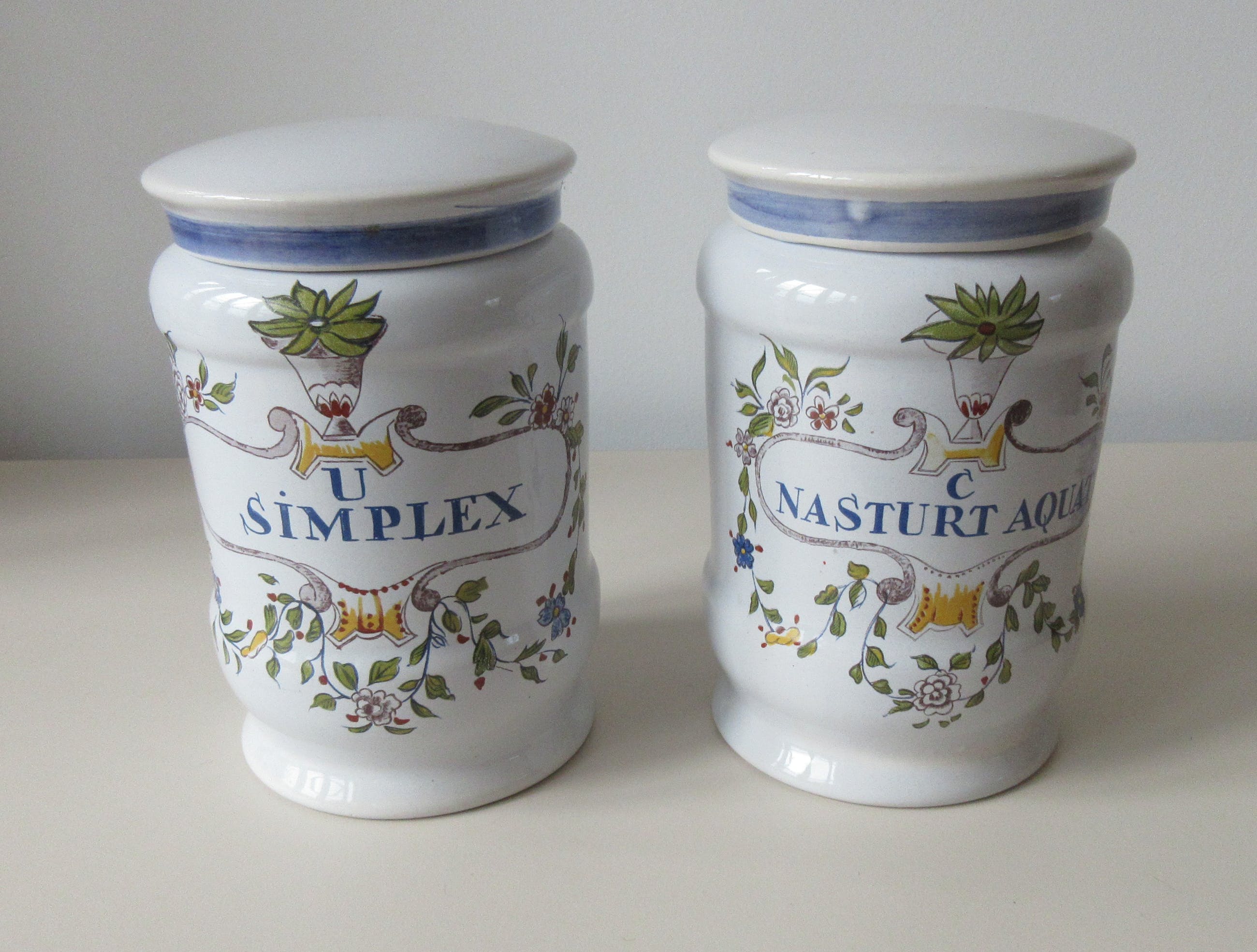 Twee replica's van antieke Majolica apothekerspotten uitgevoerd Door Goedewaagen Gouda platelen voor de firma Caron B.V. Een van de deksels heeft een haarlijn verder in prima conditie. Niet gemerkt door Goedewaagen wel voorzien van het Logo van Caron B.V. op de onderzijde.