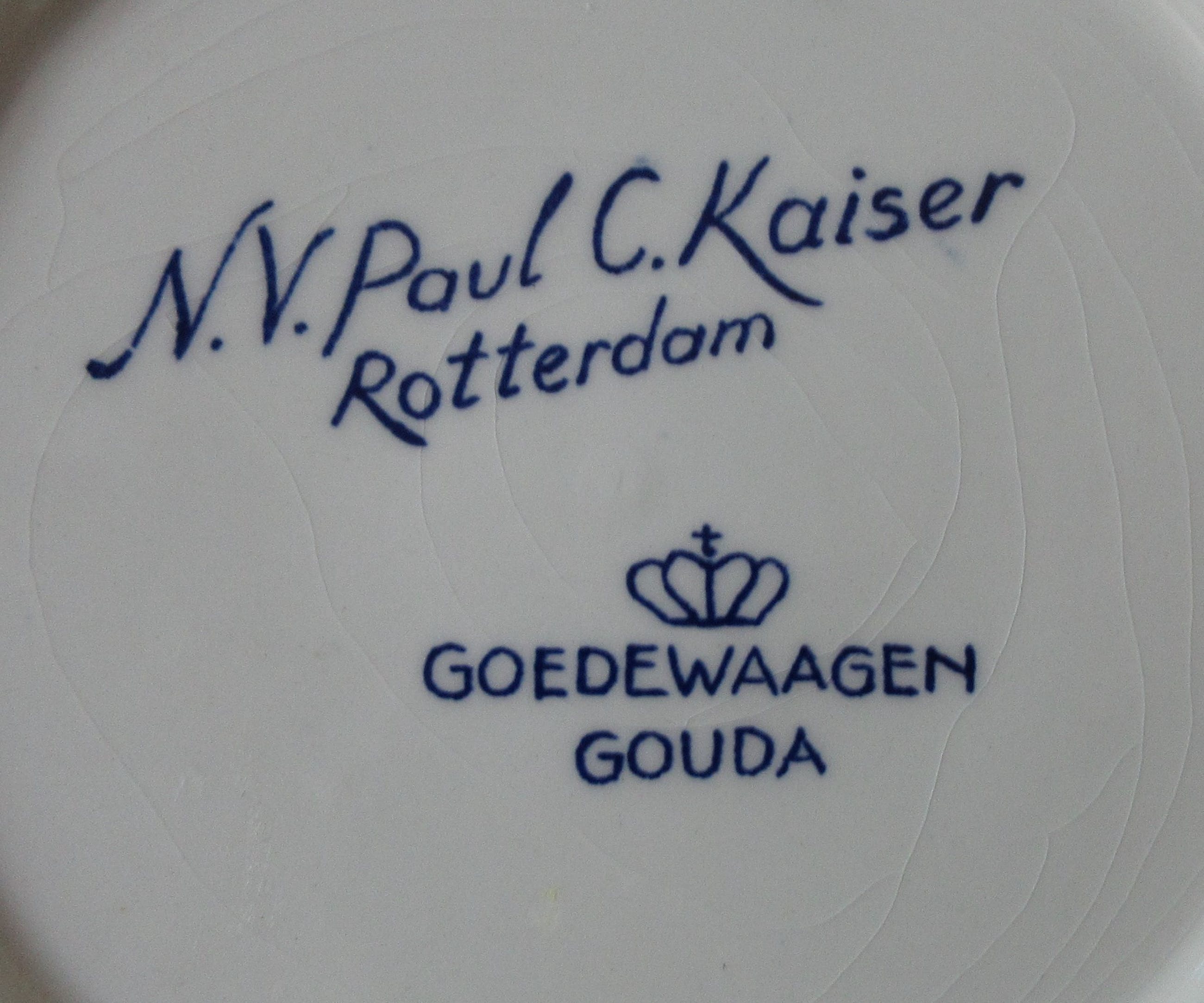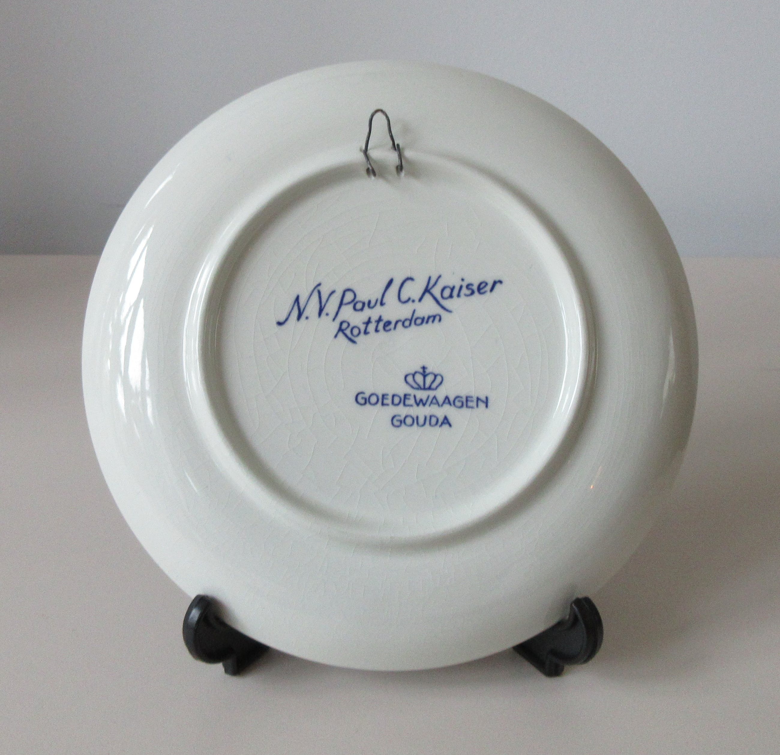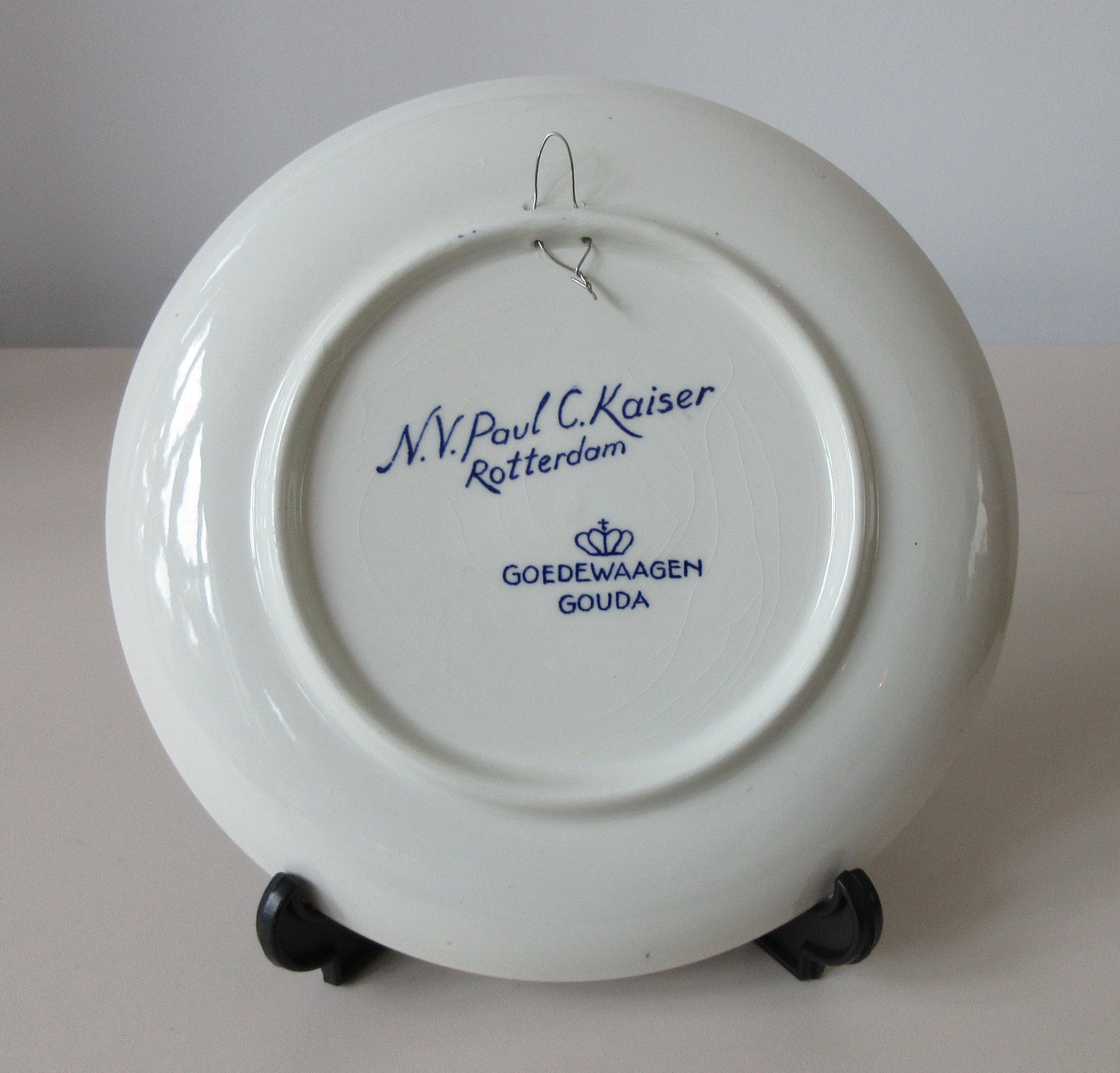 Koninklijke Goedewaagen - Twee platelen sierbordjes 'Hooimaand' en 'Wijnmaand' voor N.V. Paul C. Kaiser Rotterdam (2) - KeramiekNederland - 1920-1949Twee oude sierborden, gemaakt door de Koninklijke Goedewaagen uit Gouda. Het betreft de Hooimaand (September) en de Wijnmaand (Oktober). De borden zijn met de hand beschilderd in polychrome kleuren. Op de achterkant is te zien dat de borden zijn vervaardigd voor Bakkerij Paul C. Kaiser uit Rotterdam, landelijk voornamelijk bekend geworden door hun beschuit met het beeldmerk van Paula in rood silhouet met hoepelrok. In zeer goede onbeschadigde conditie, alleen het glazuur het lichte craquelé.