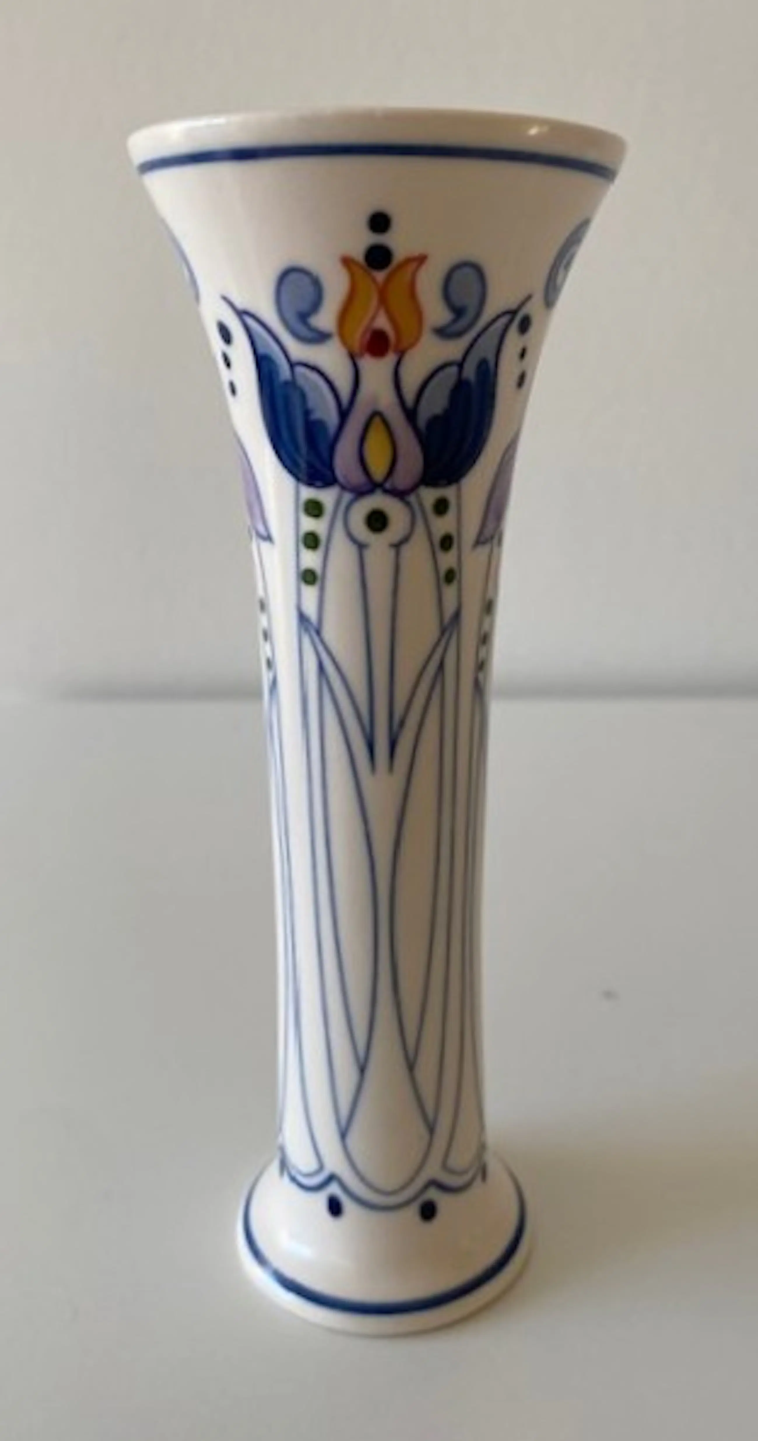 - Schitterende smalle vaas "Amata"met handgeschilderd art nouveau decor *) Limited edition 699/999 tbv Holland Amerika Lijn (HAL). - Reclame item Royal Goedewaagen /Holland Amerika Lijn (jubileum world cruises ms Amsterdam 2008)
