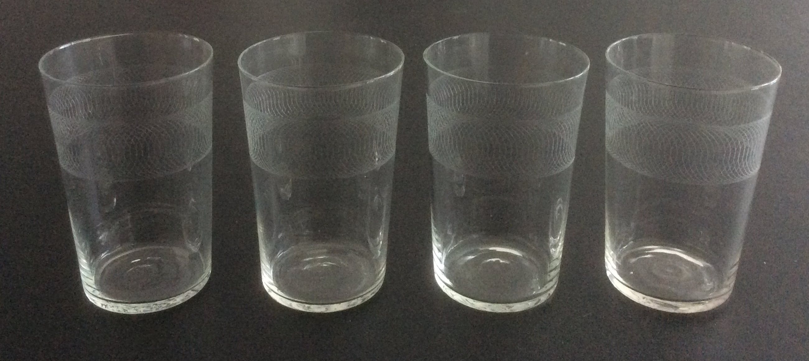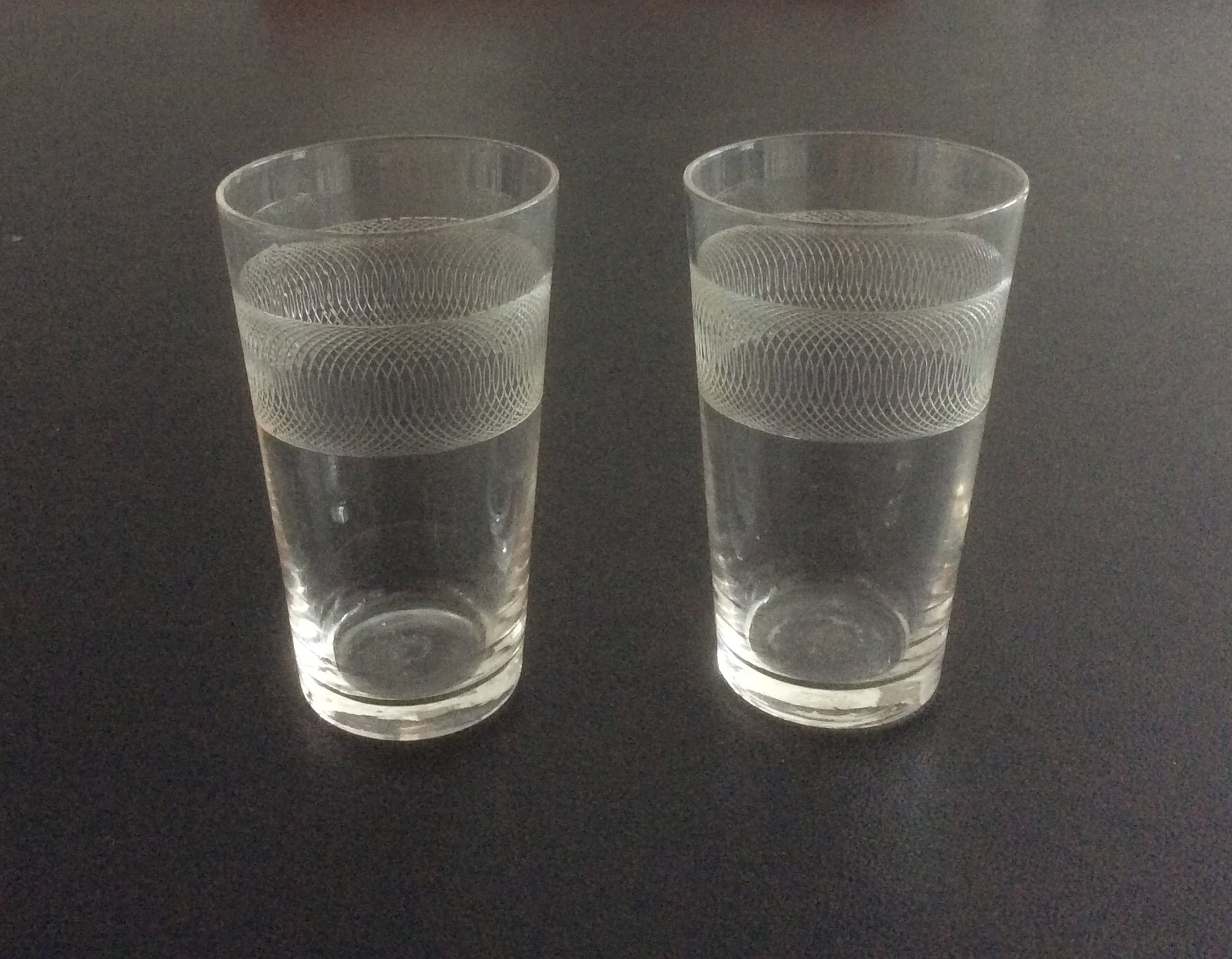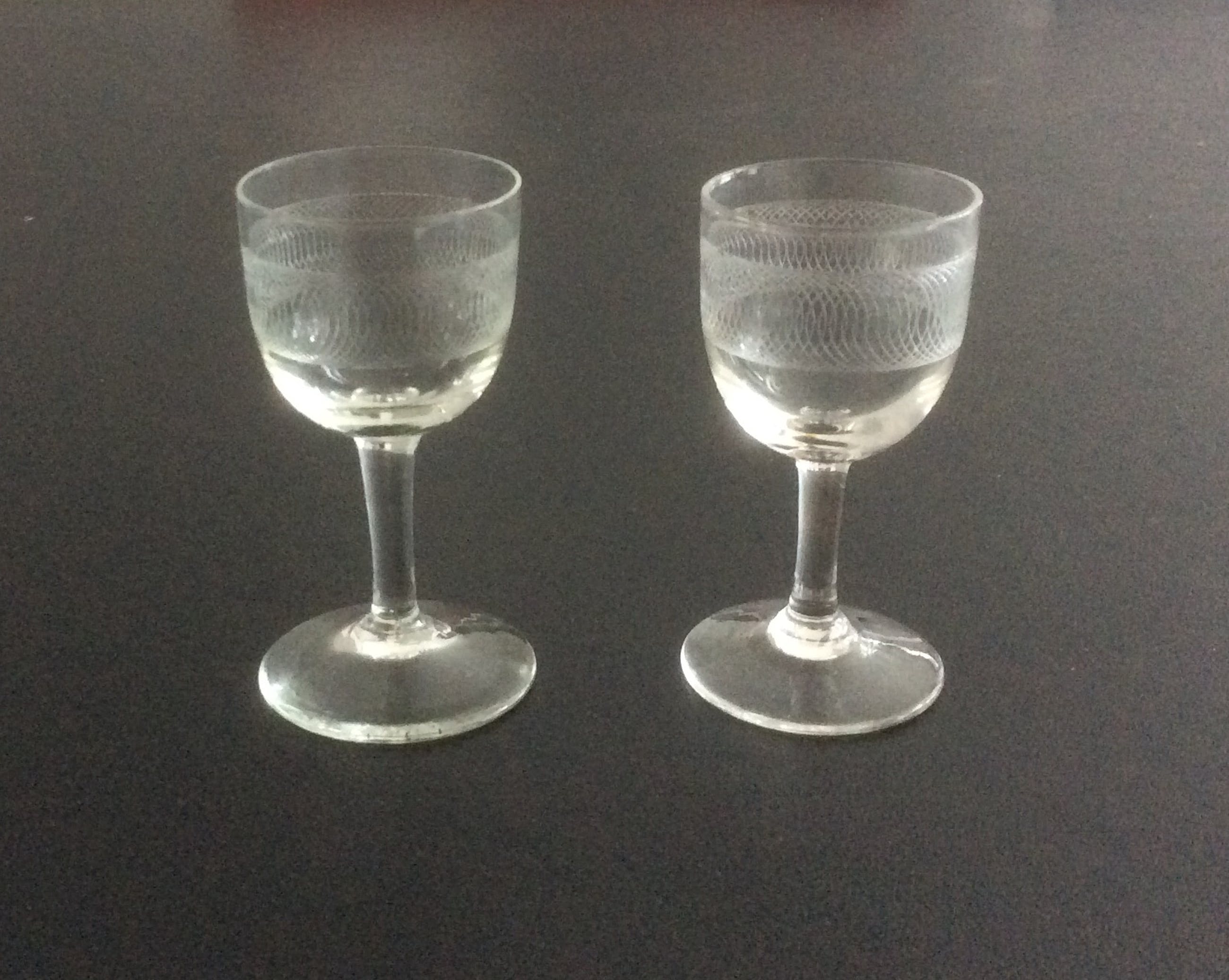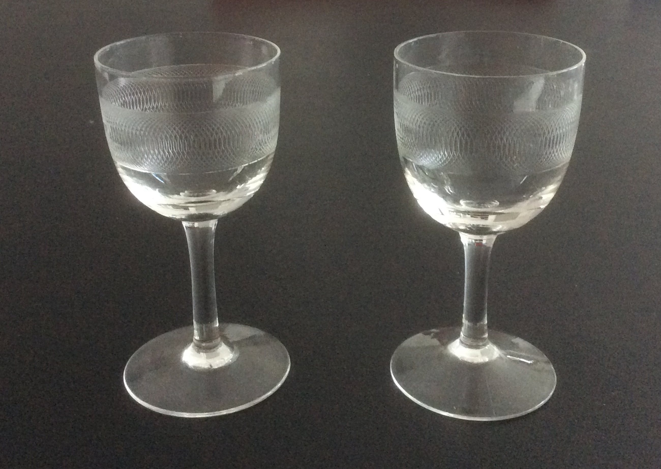 2 likeurglaasjes (er is een heel klein verschil in grootte), hoogte 9,5 cm. 2 port/sherry glazen, hoogte 11 cm. 2 jus d’orange glazen, hoogte 9,3 cm 4 grote waterglazen, hoogte 11cm.