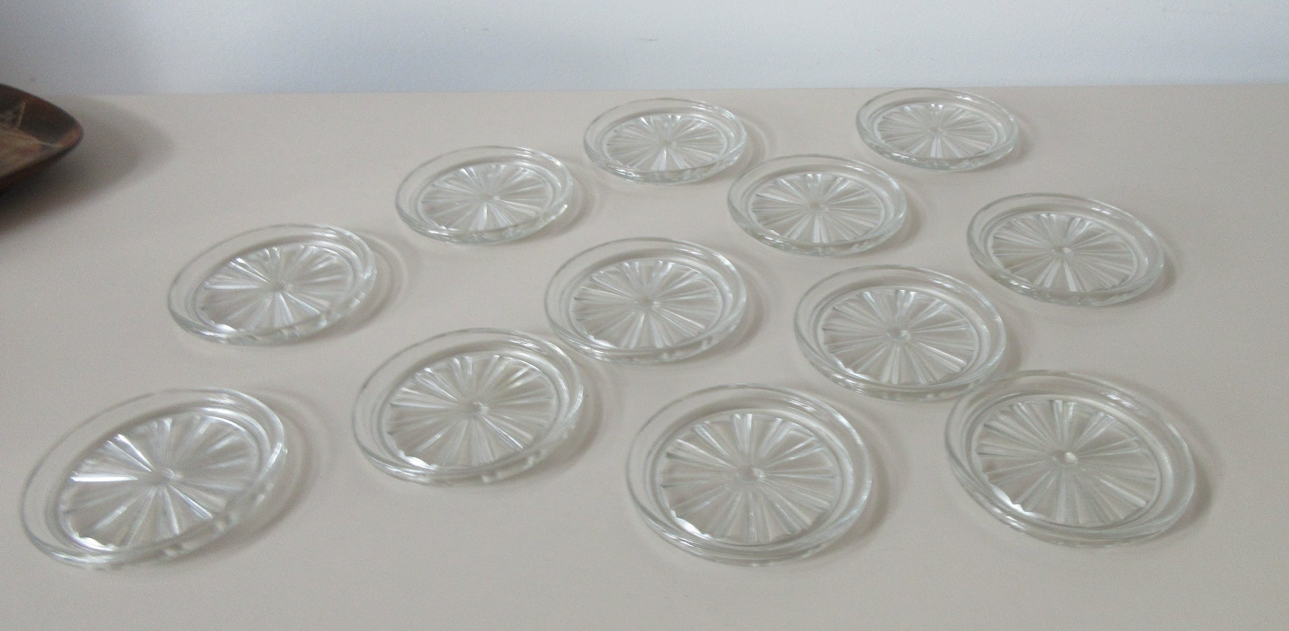12 persglazen kelkbakjes in originele verpakking van Royal Leerdam uit de jaren'50. De bakjes hebben de vorm van een sinaasappelschijfje en zijn in onbeschadigde conditie, zo ook de blauw kartonnen cilinder doos waar ze in zitten.