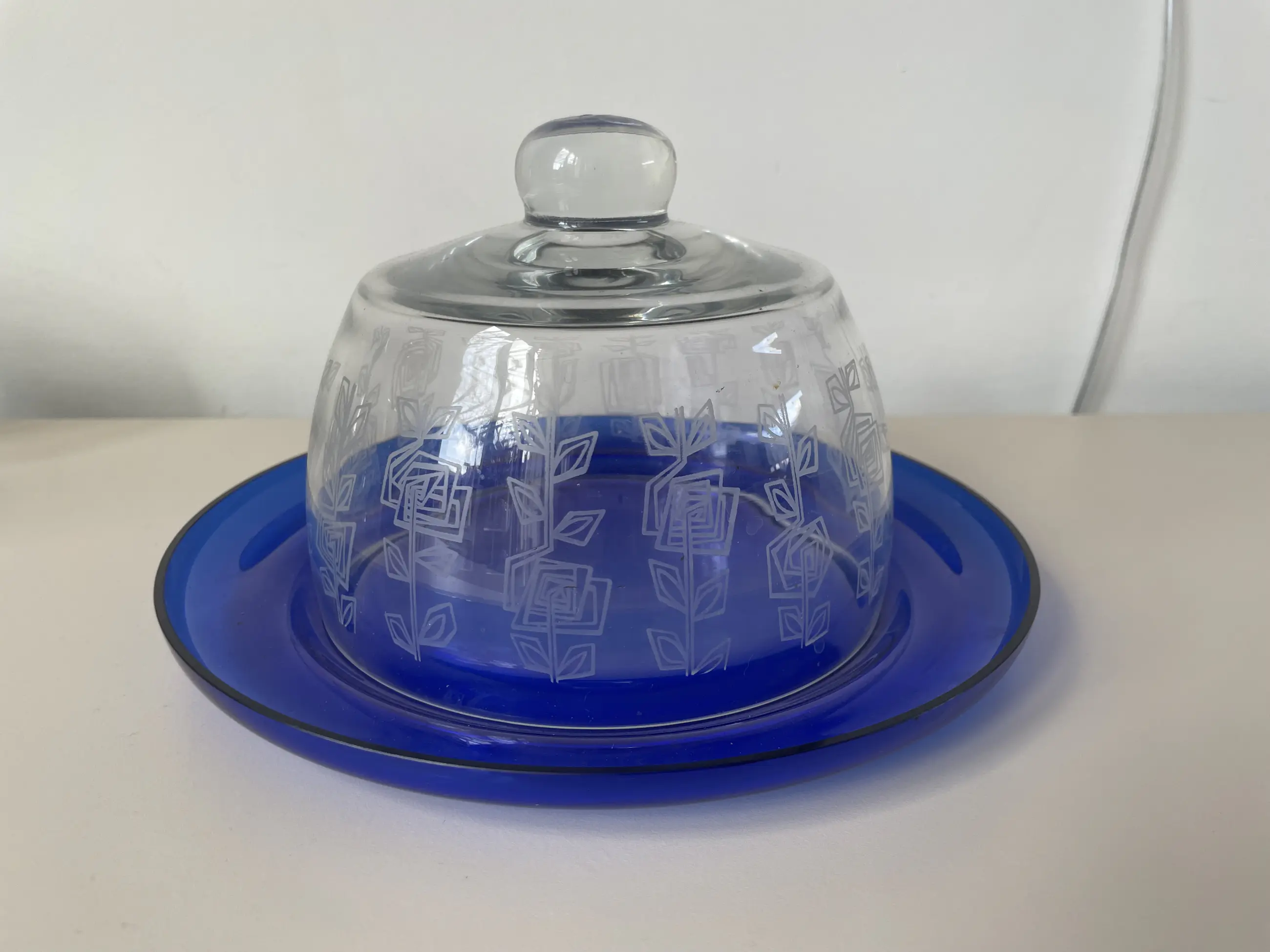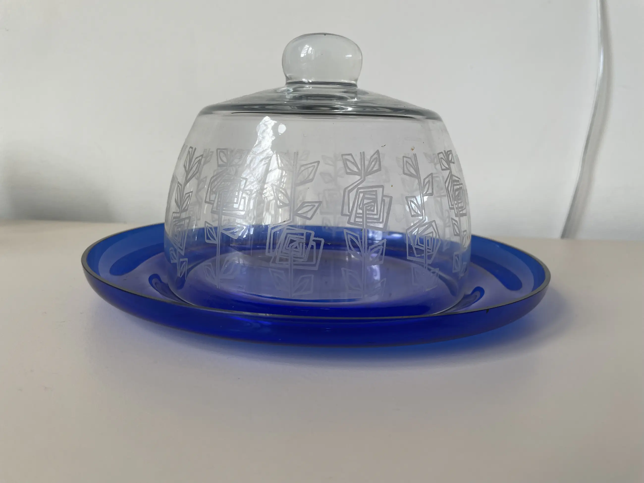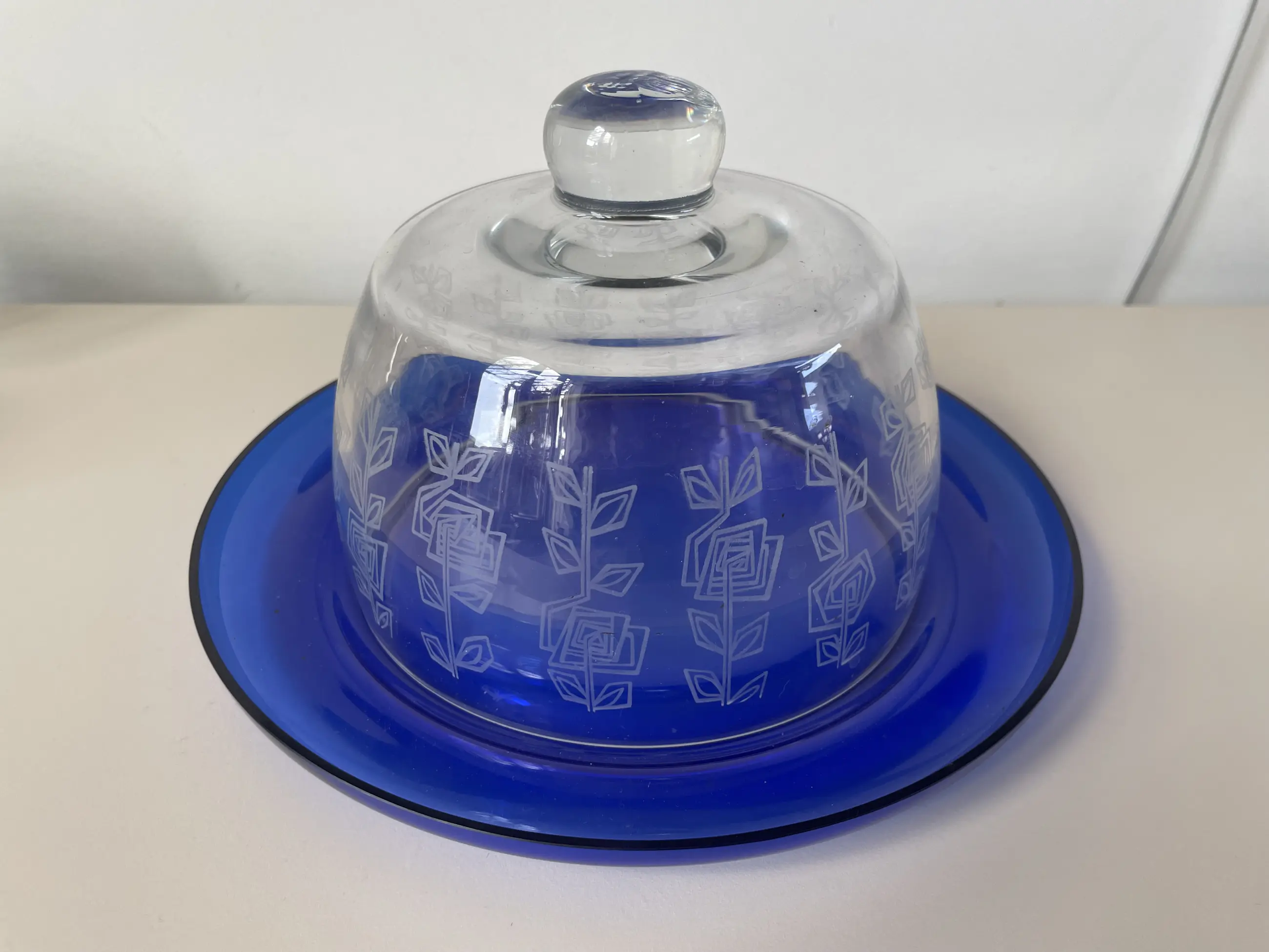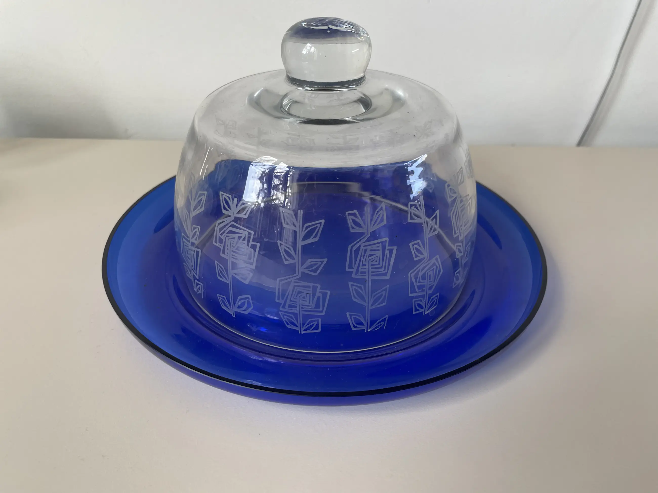 Smaakvol ontworpen glazen botervloot of kaasstolp met blauw onderbord en blank glazen stolp gedecoreerd met gestileerde rozen. Niet gemerkt. Maker of ontwerper dus onbekend. In zeer goede conditie.