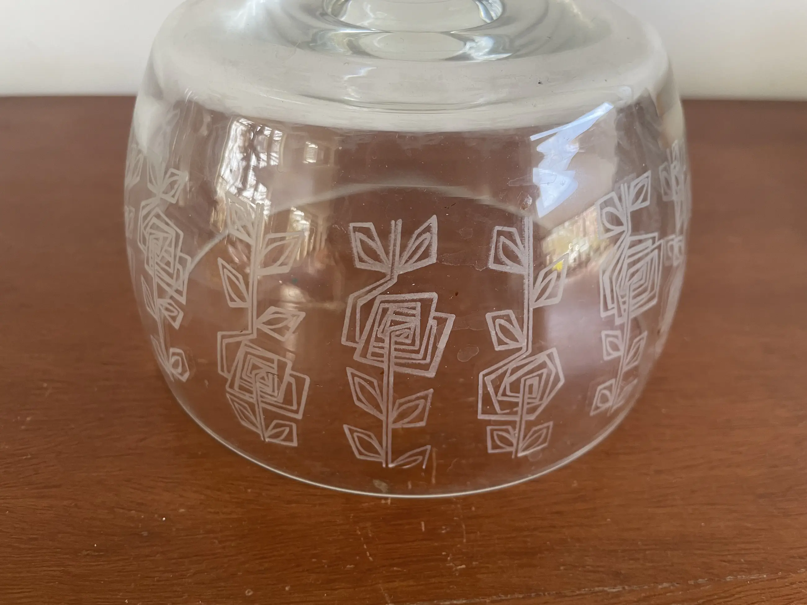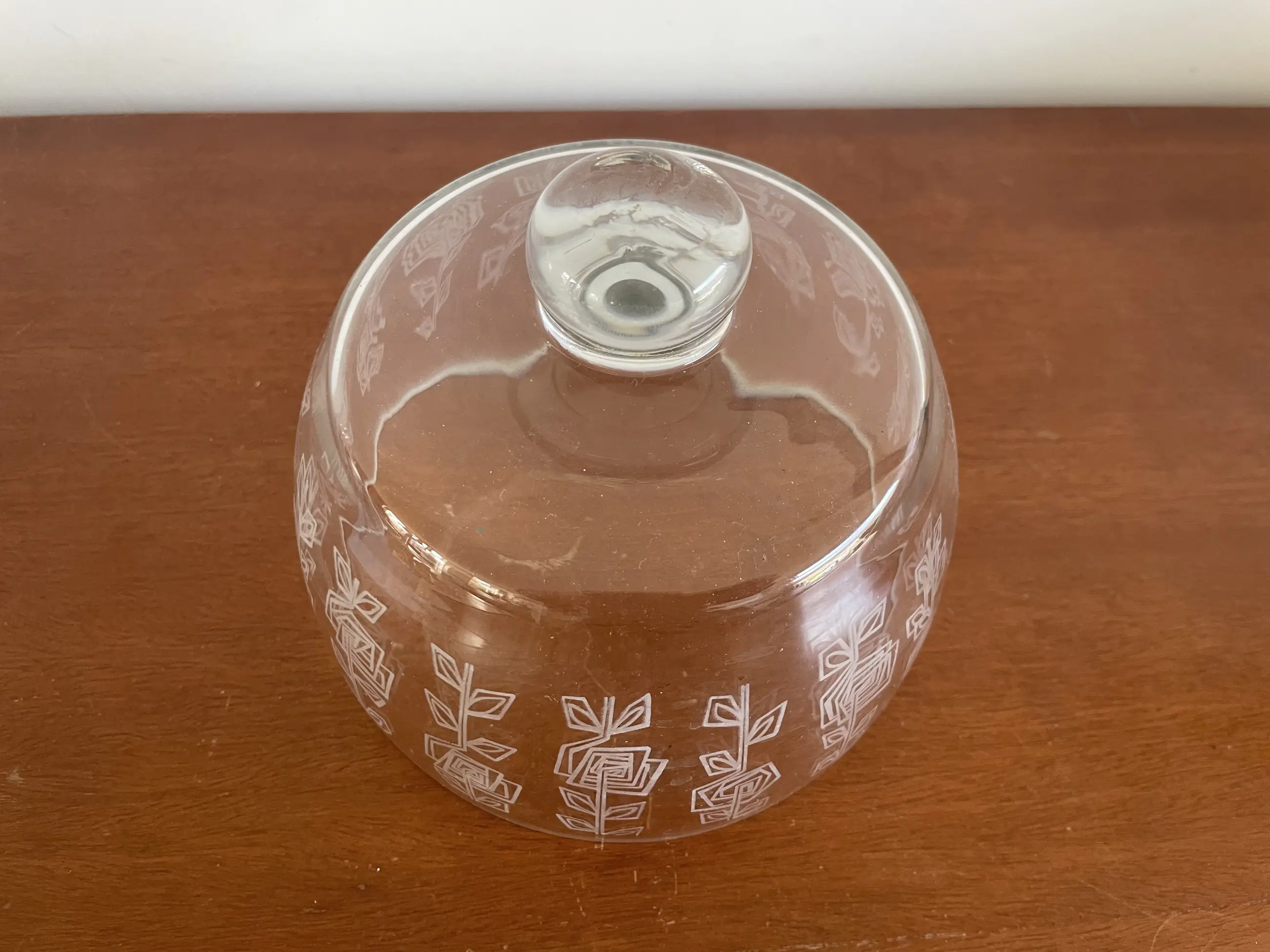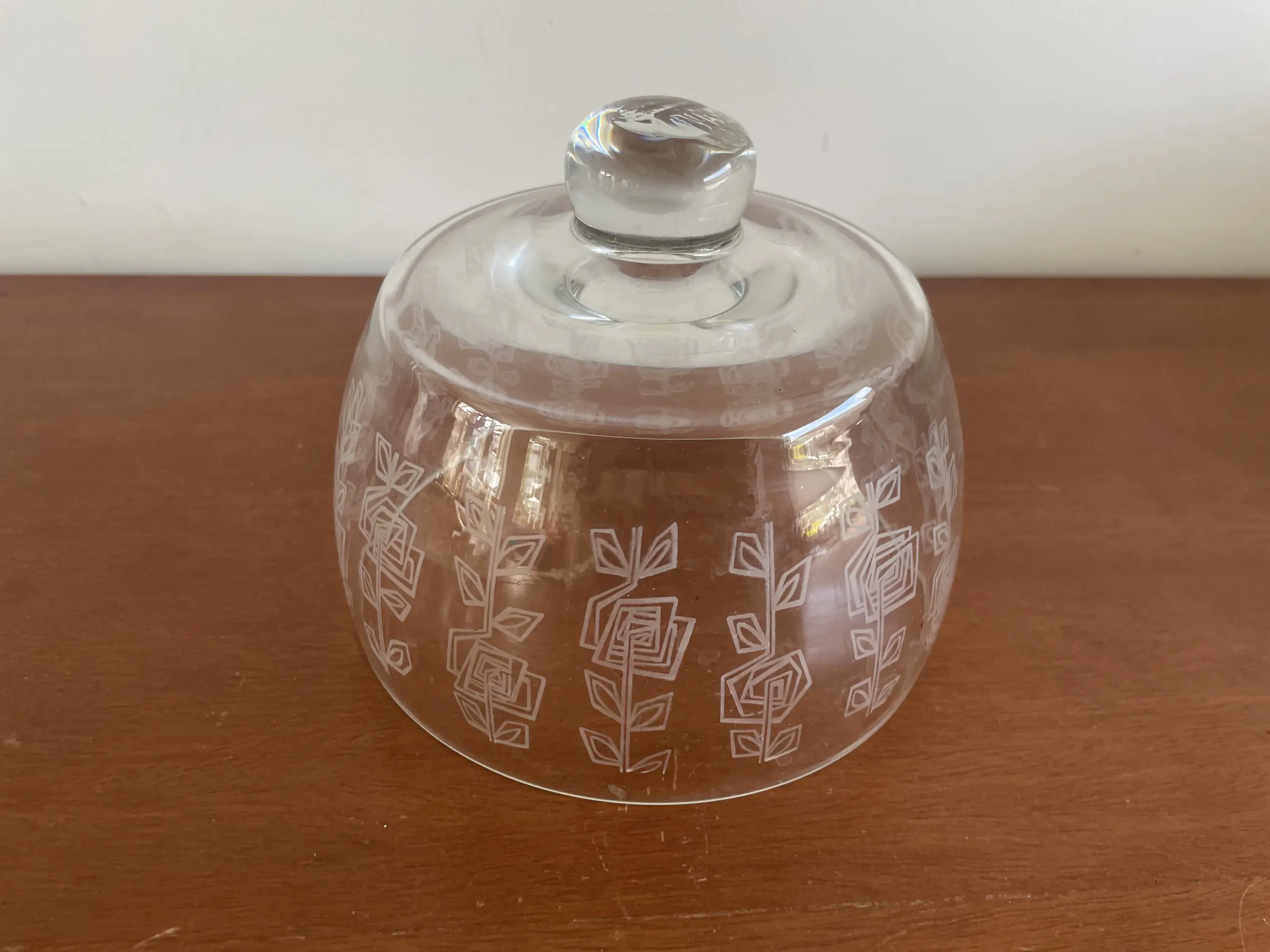 Smaakvol ontworpen glazen botervloot of kaasstolp met blauw onderbord en blank glazen stolp gedecoreerd met gestileerde rozen. Niet gemerkt. Maker of ontwerper dus onbekend. In zeer goede conditie.