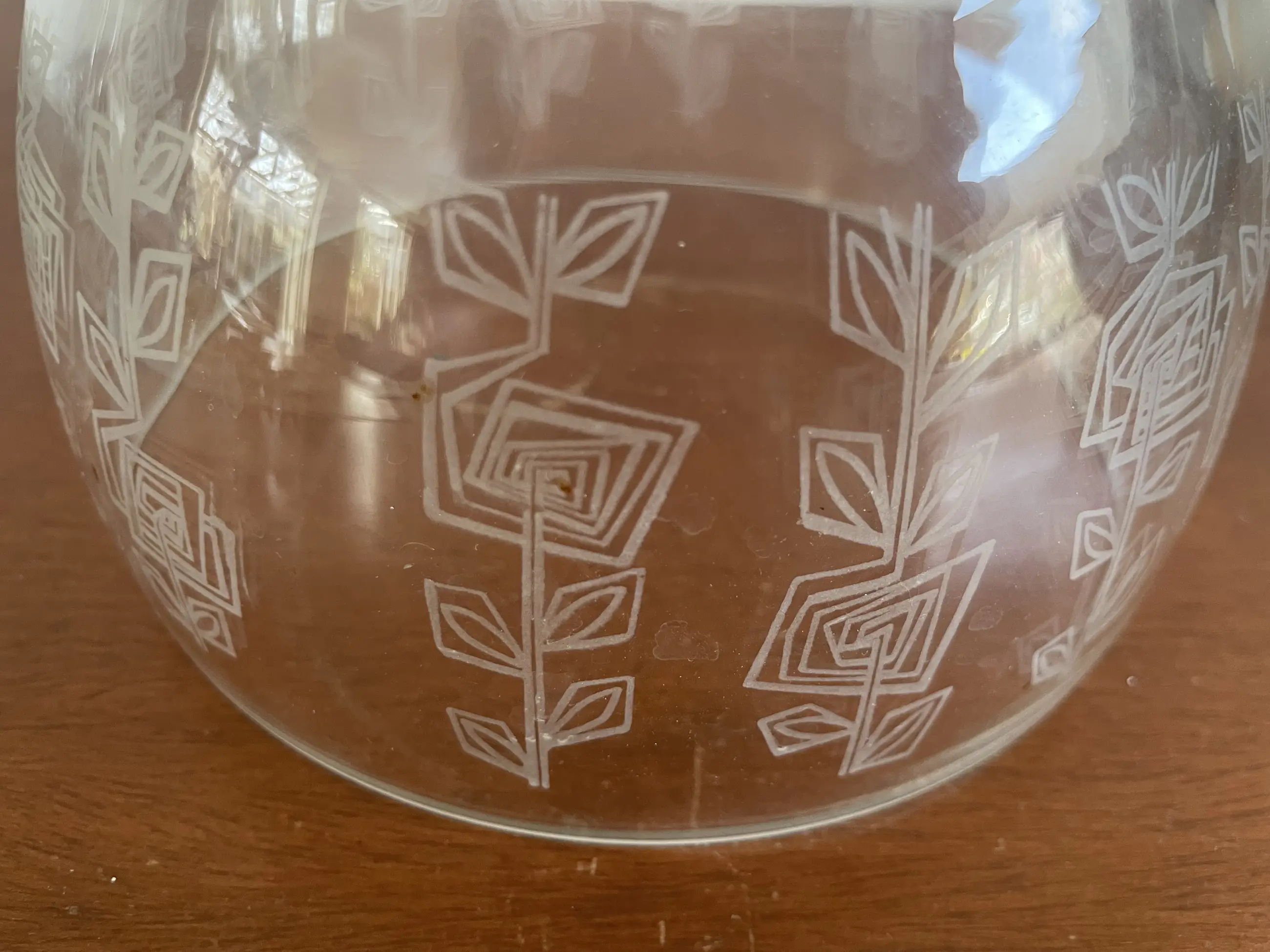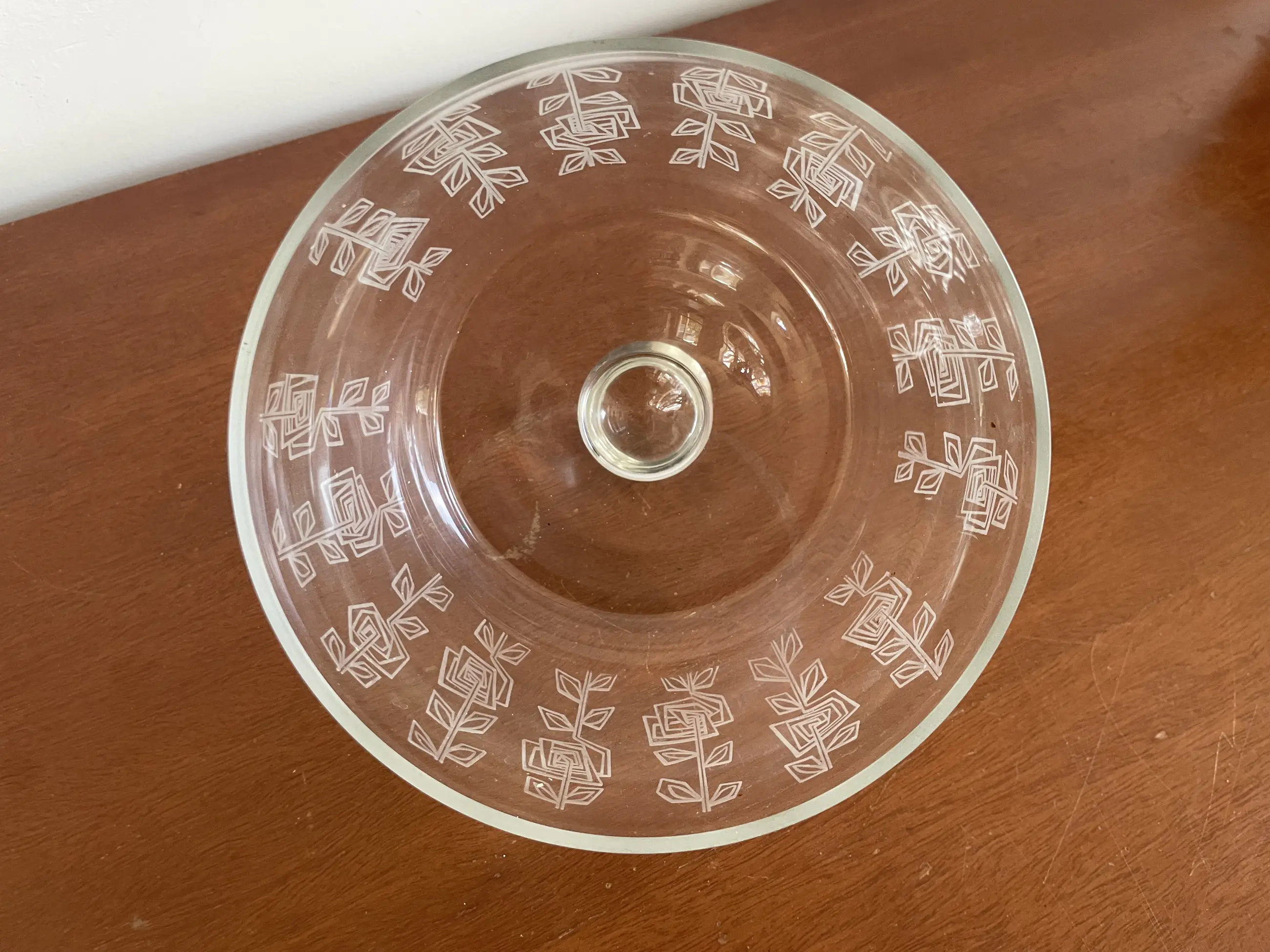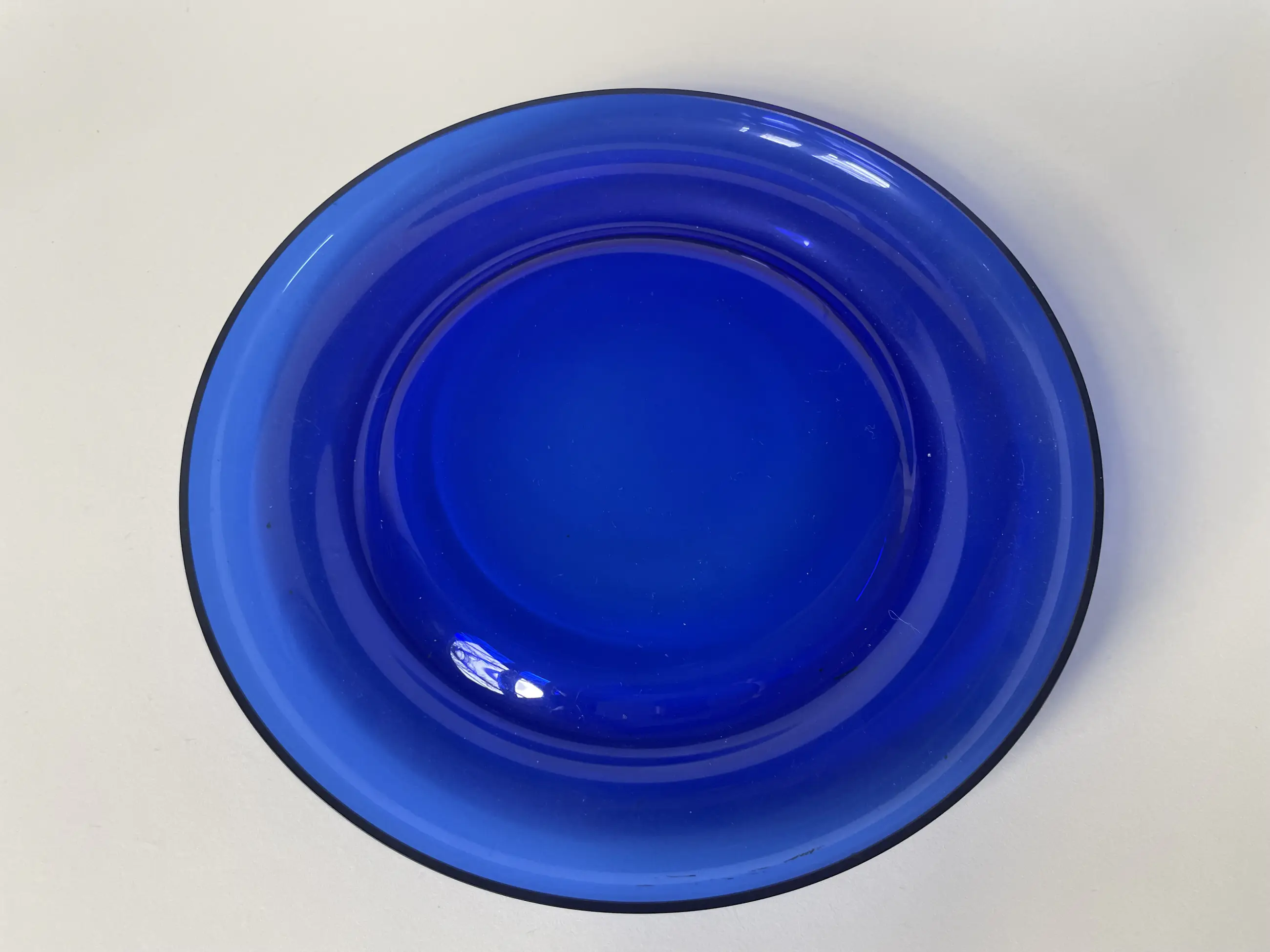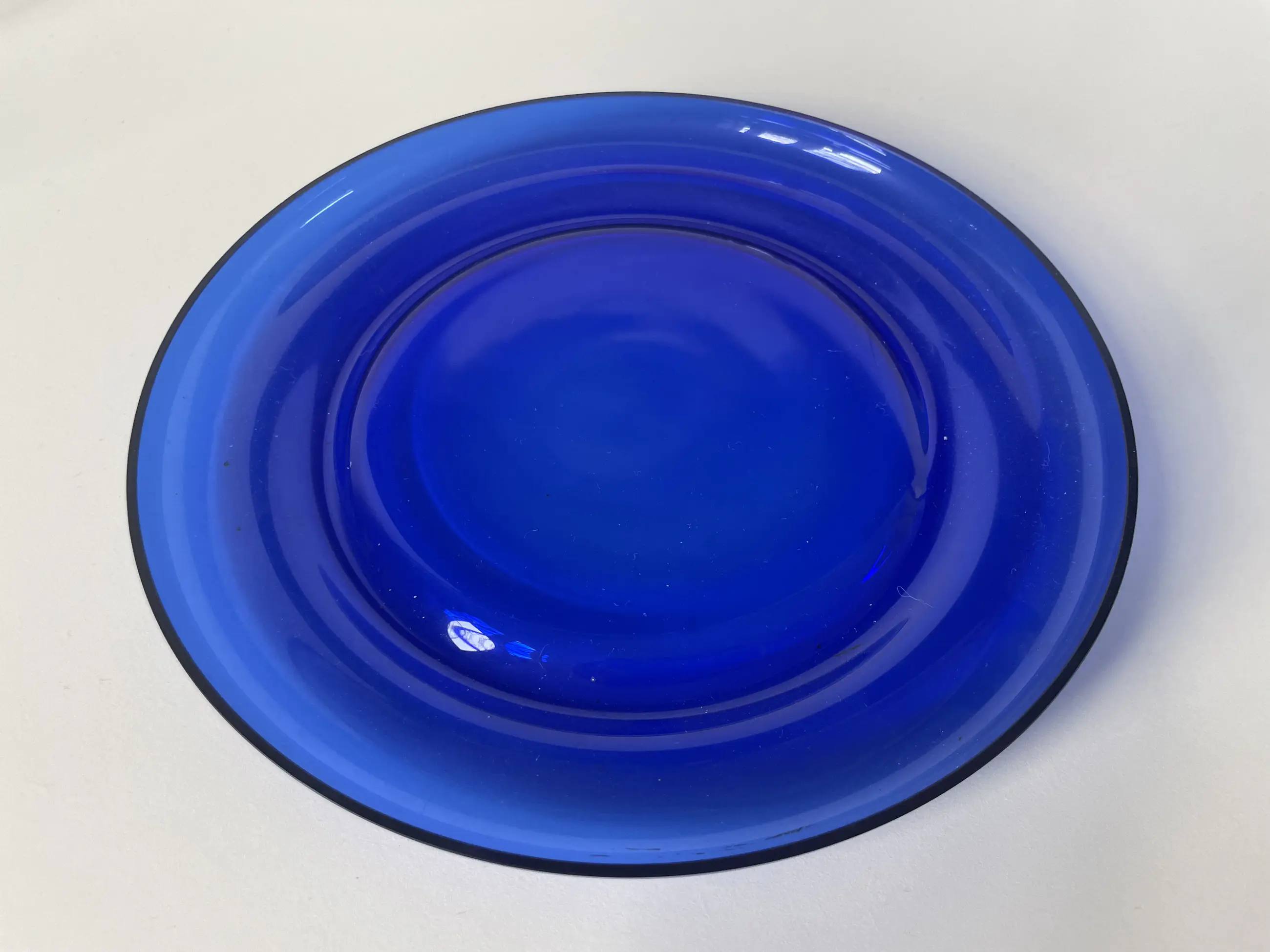 Smaakvol ontworpen glazen botervloot of kaasstolp met blauw onderbord en blank glazen stolp gedecoreerd met gestileerde rozen. Niet gemerkt. Maker of ontwerper dus onbekend. In zeer goede conditie.
