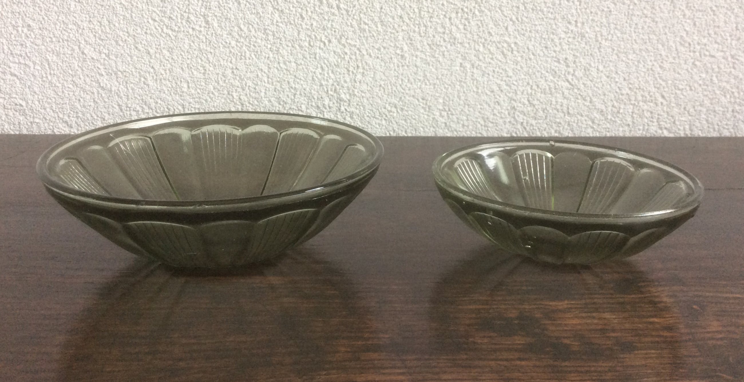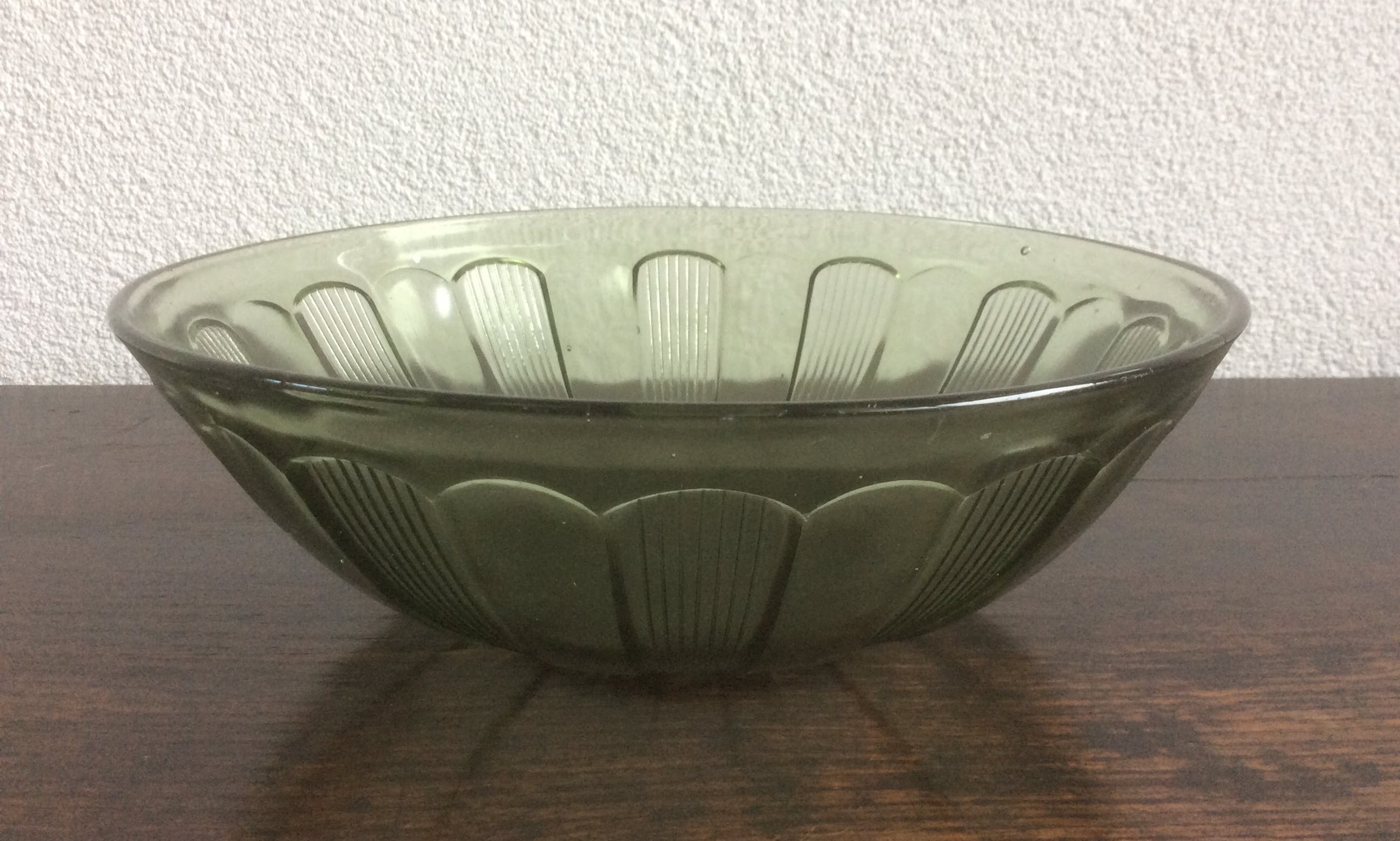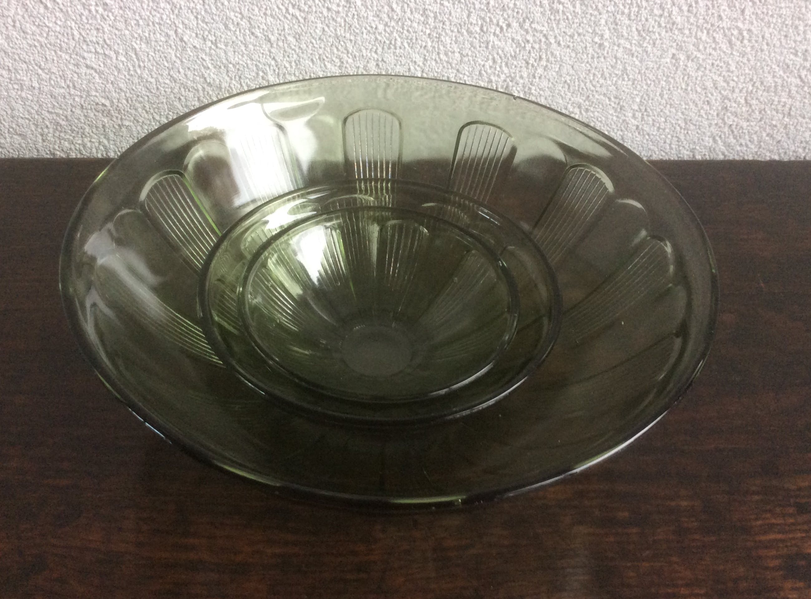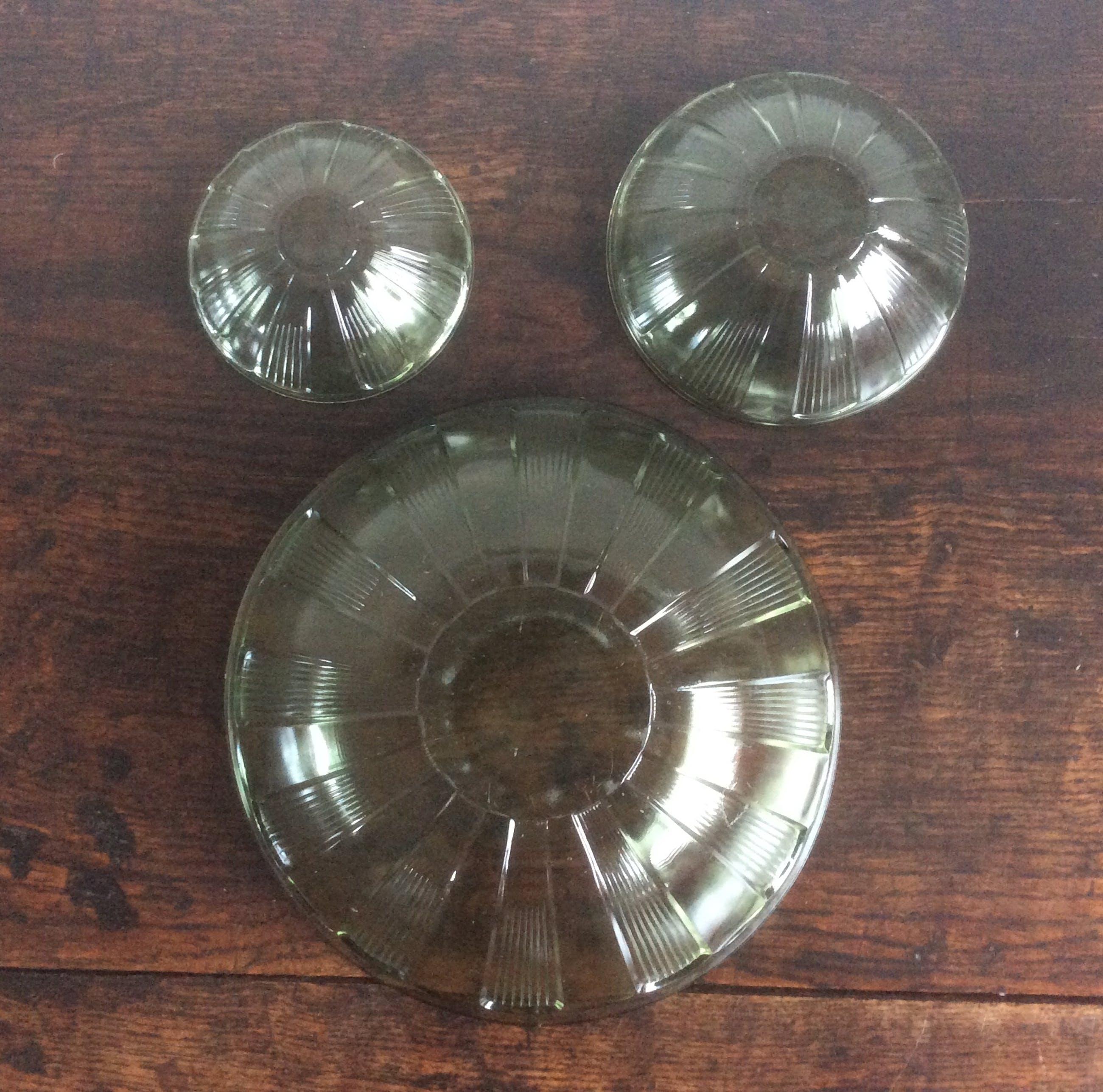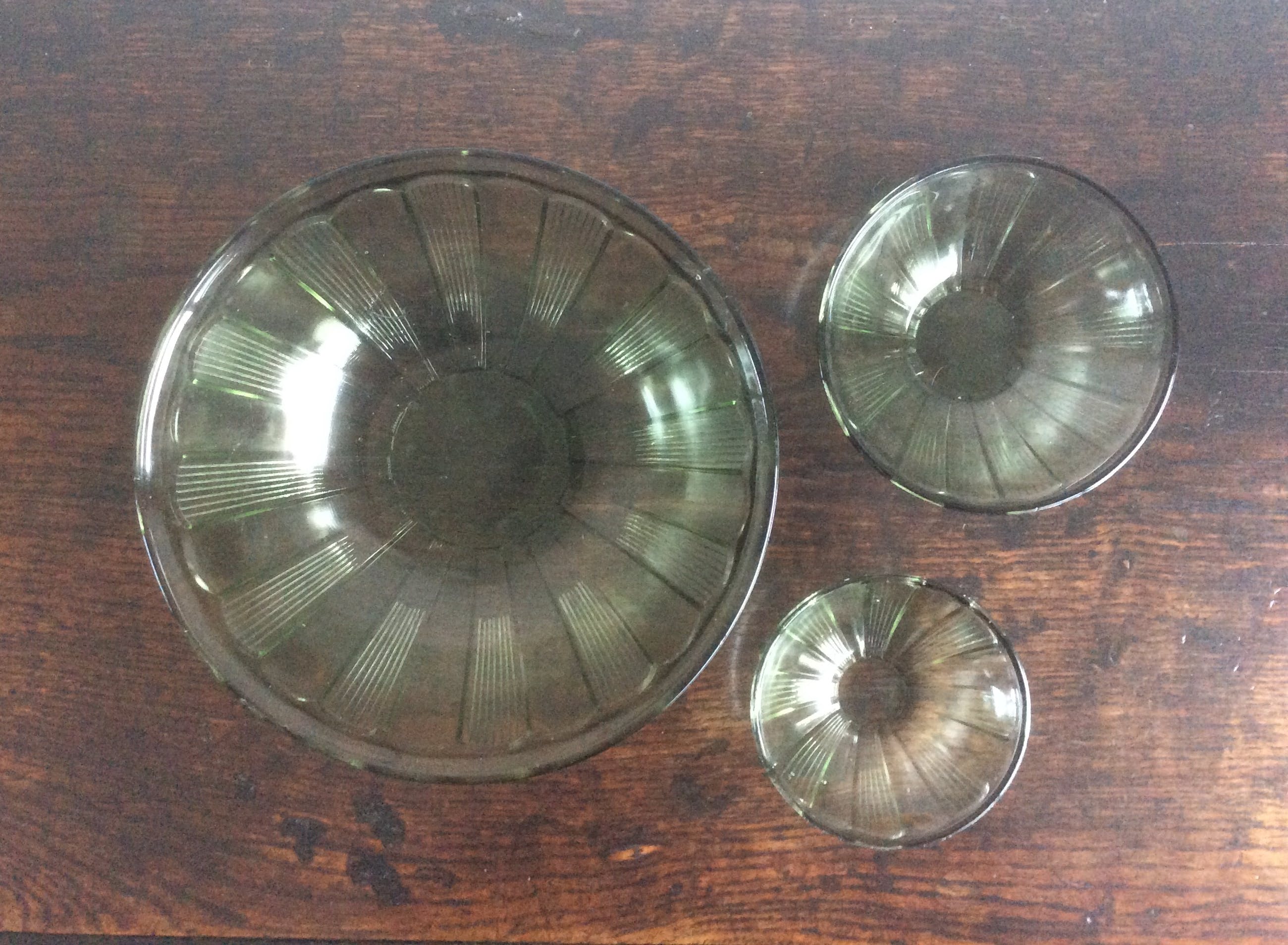 Drie groene nestschalen in verschillende maten. De schalen hebben een doorsnede van 23 cm, 13,5 cm en 10,5 cm. Alle schalen zijn gaaf.
