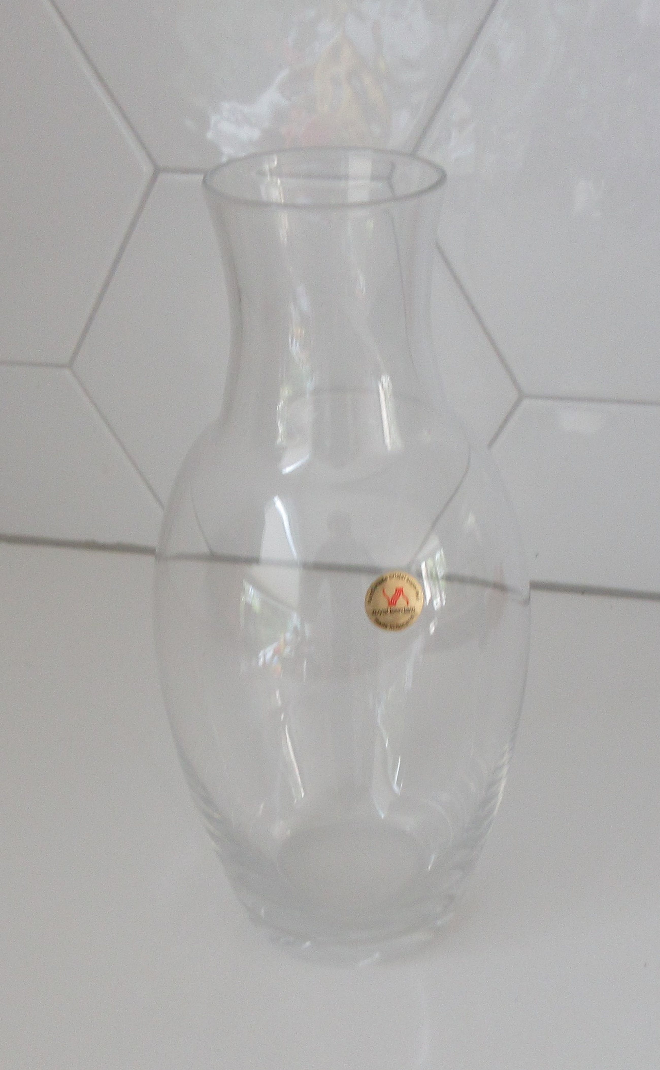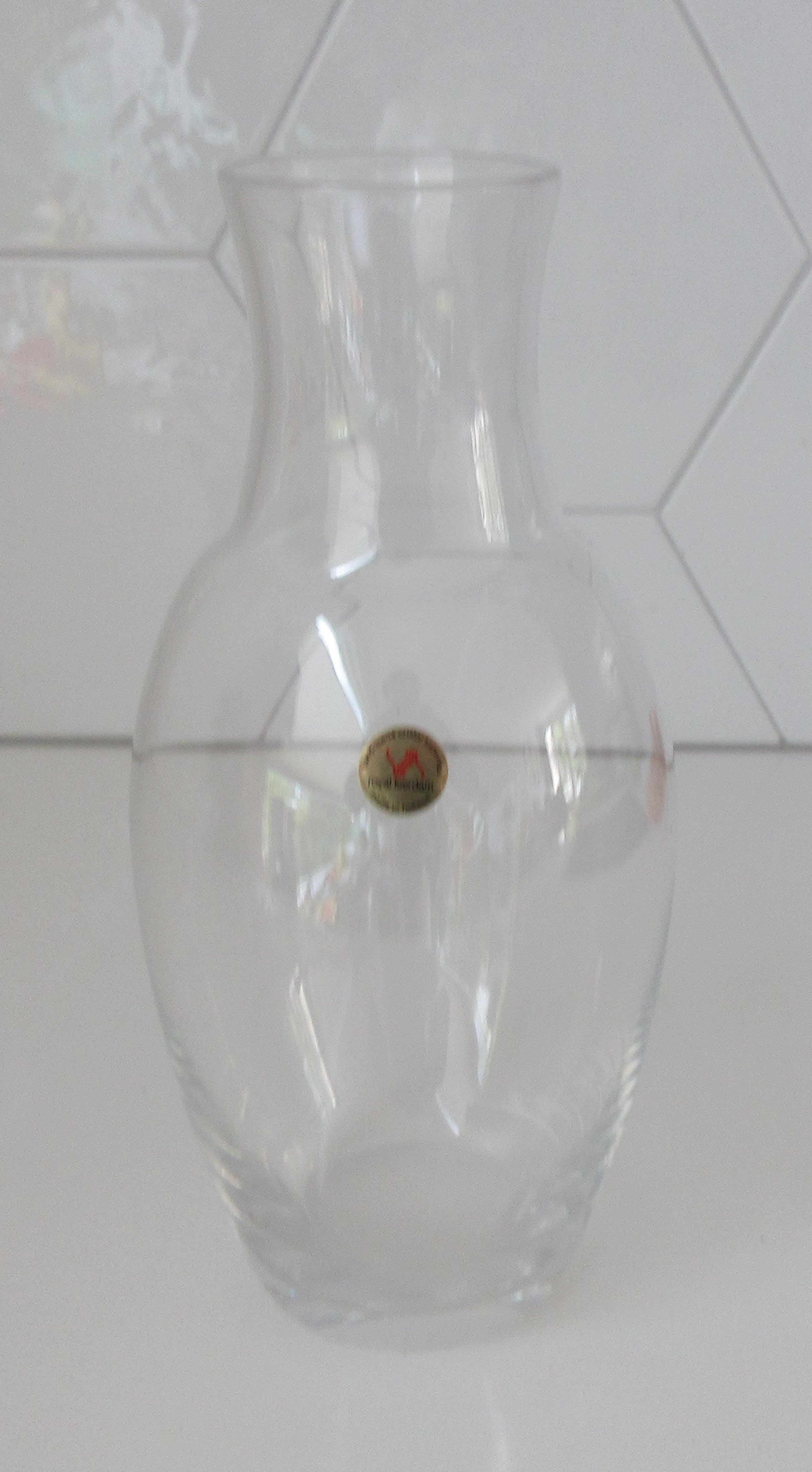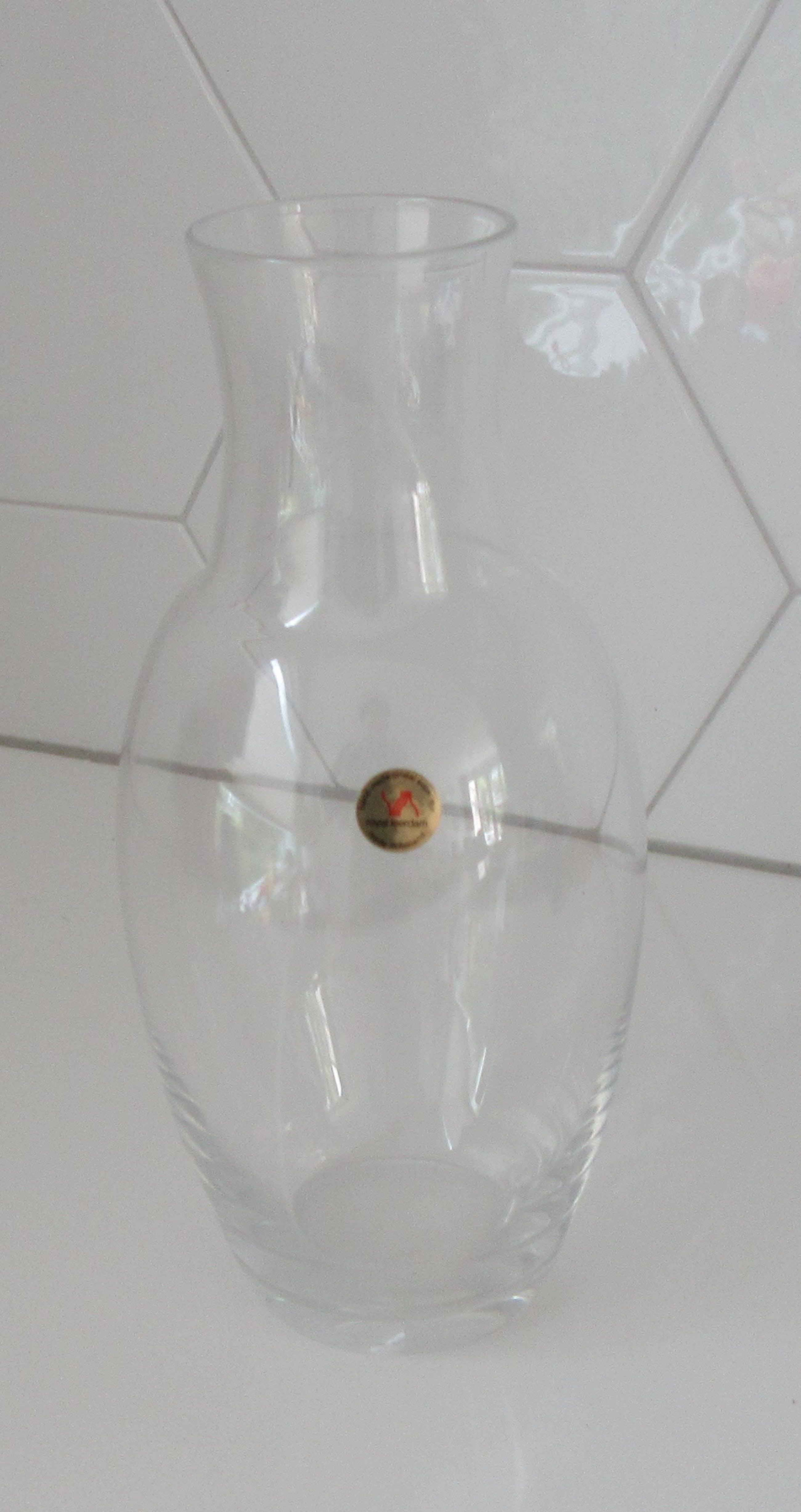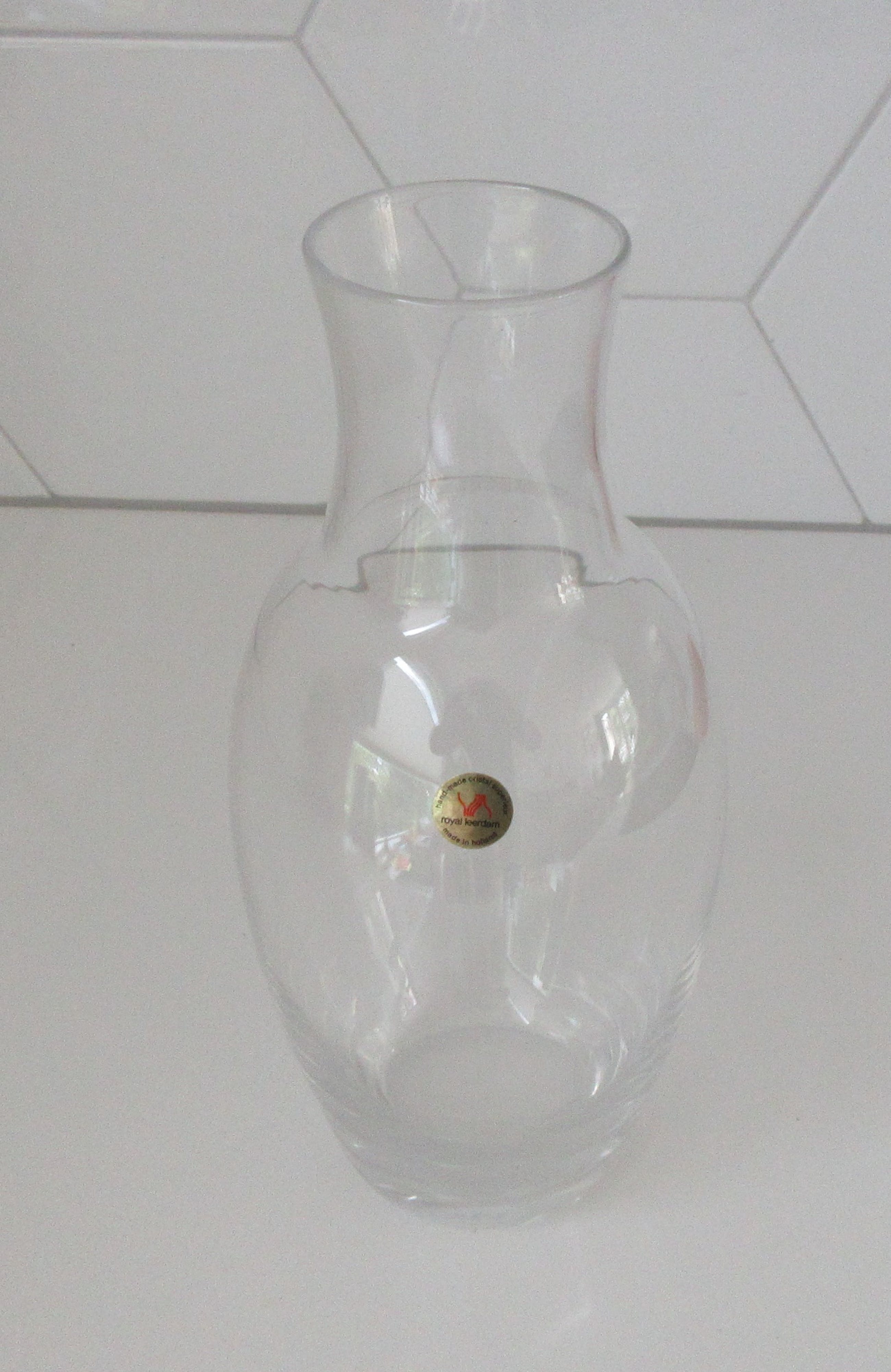 Elegante Blank kristallen vaas uitvoering Royal Leerdam. Uitgevoerd voor de firma Hydron, etsmerk van het bedrijf op de bodem. Ontwerper onbekend kan mogelijk Floris Meydam of Siem van der Marel zijn. Gemerkt met een gouden merksticker. Heeft een zware gepolijste bodem wat ongewoon is voor een vaas van Royal Leerdam.