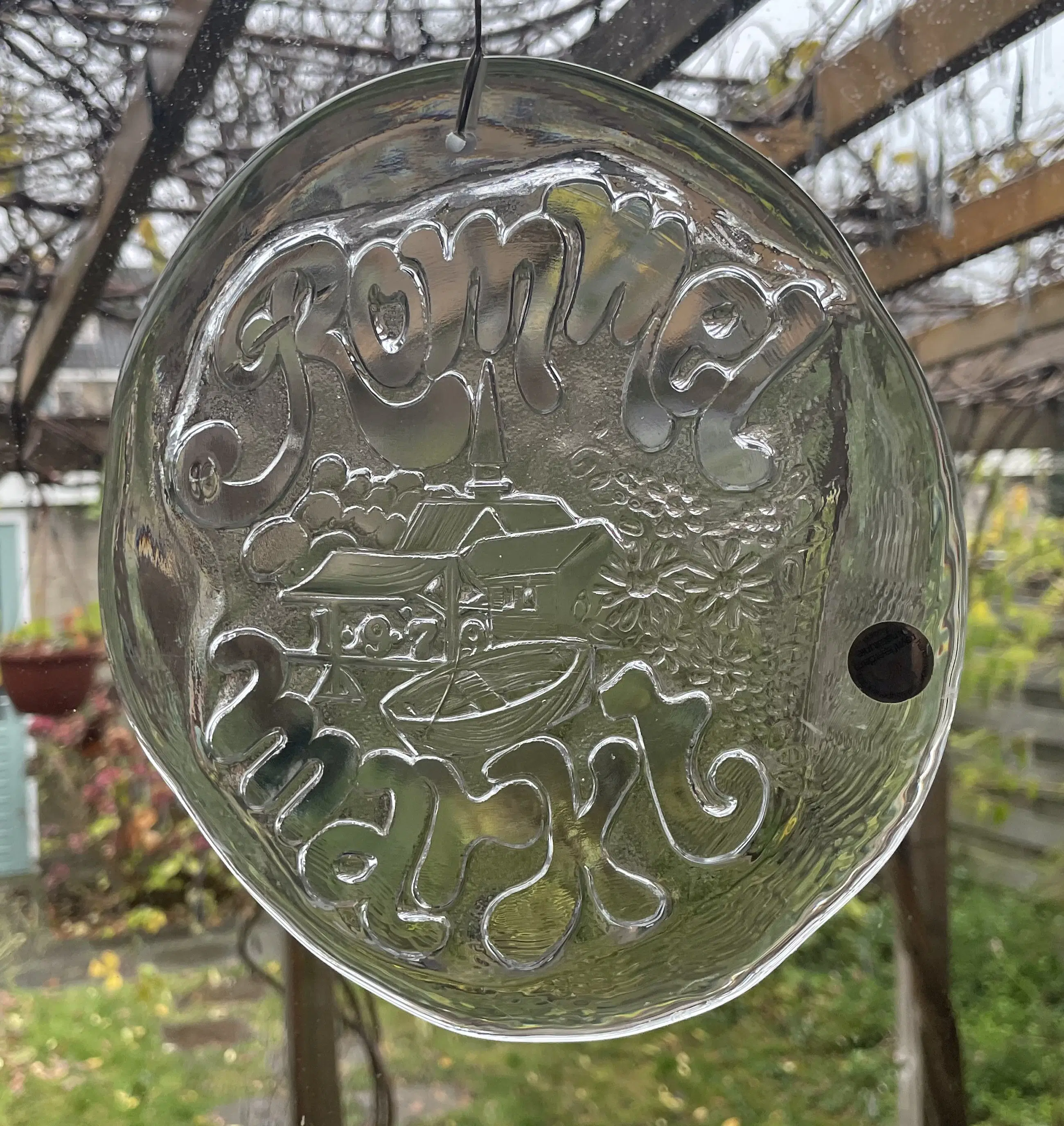 Vintage zeldzame en wat bijzondere grote glazen raamhanger van Royal Leerdam-Kristalunie met in typische jaren’70 letters de tekst; “Rommelmarkt en het jaartal 1979”. Verse is er een plaats of dorp te zien aan het water met een bootje en een boothuis? Mogelijk is dit Leerdam zelf. In perfecte conditie en voorzien van origineel papieren label.