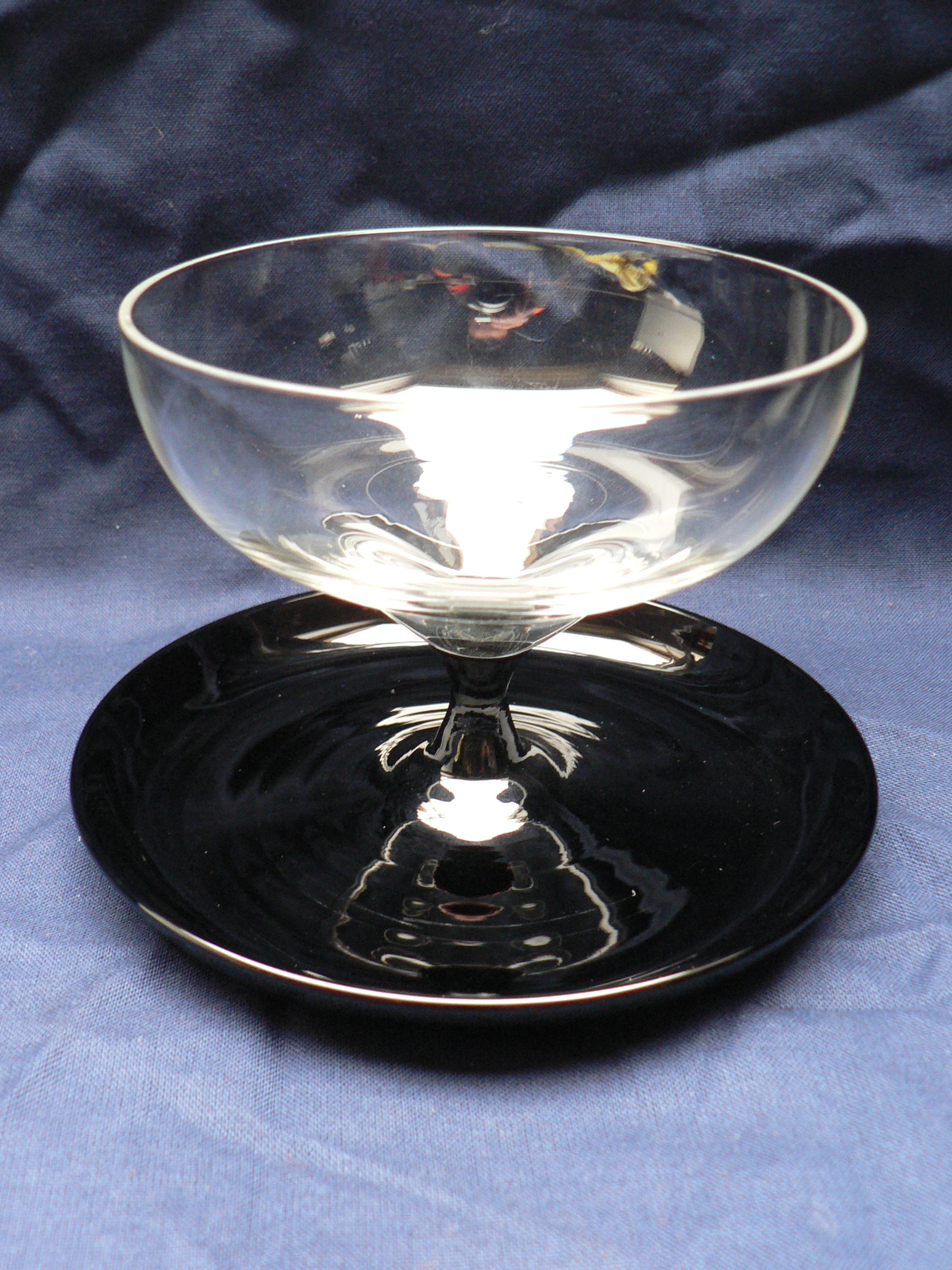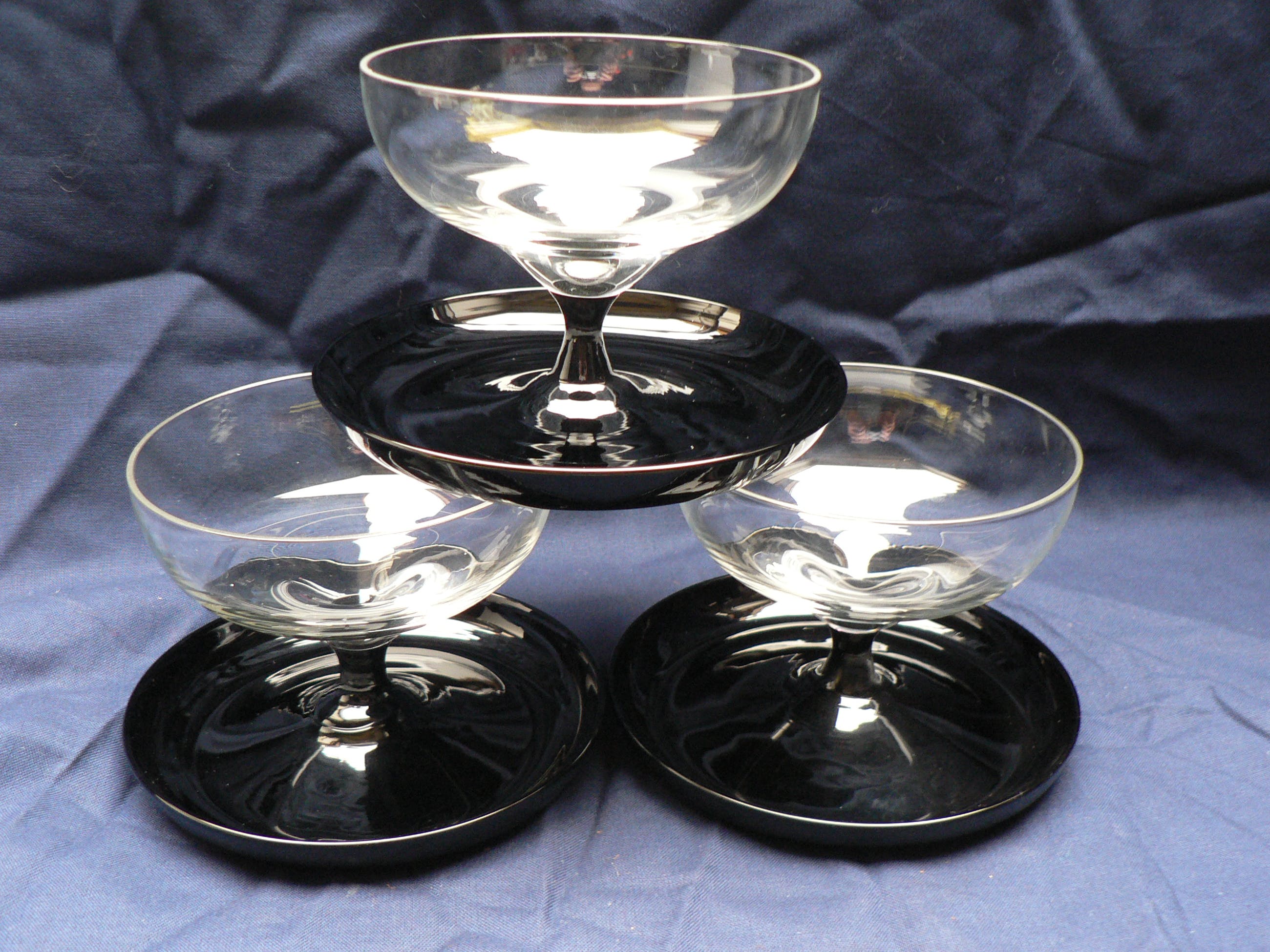 Drie ijscoupes van blank glas op zwarte voet. Periode circa 1930 - 1940. Vermoedelijk AD Copier voor Leerdam.