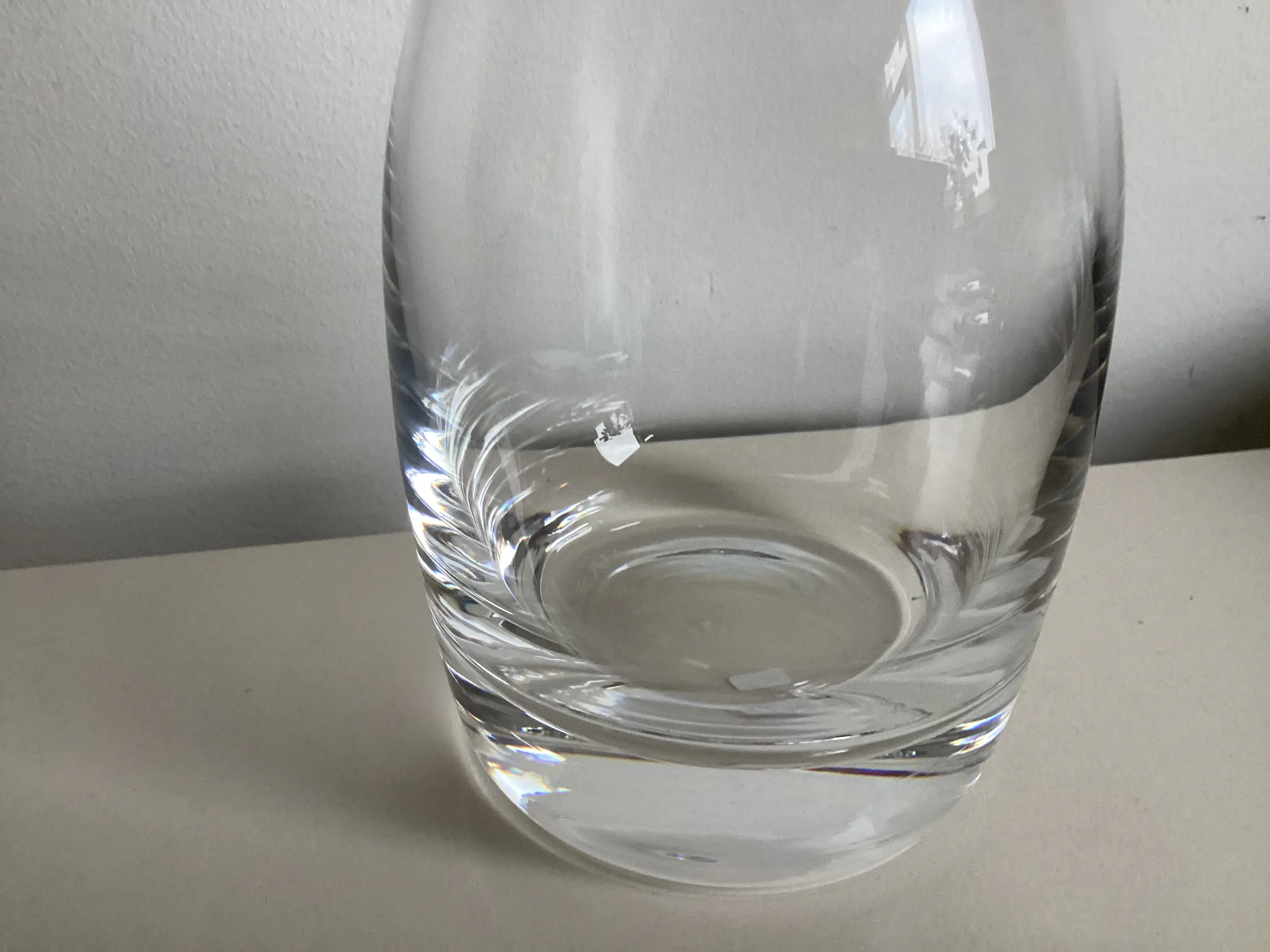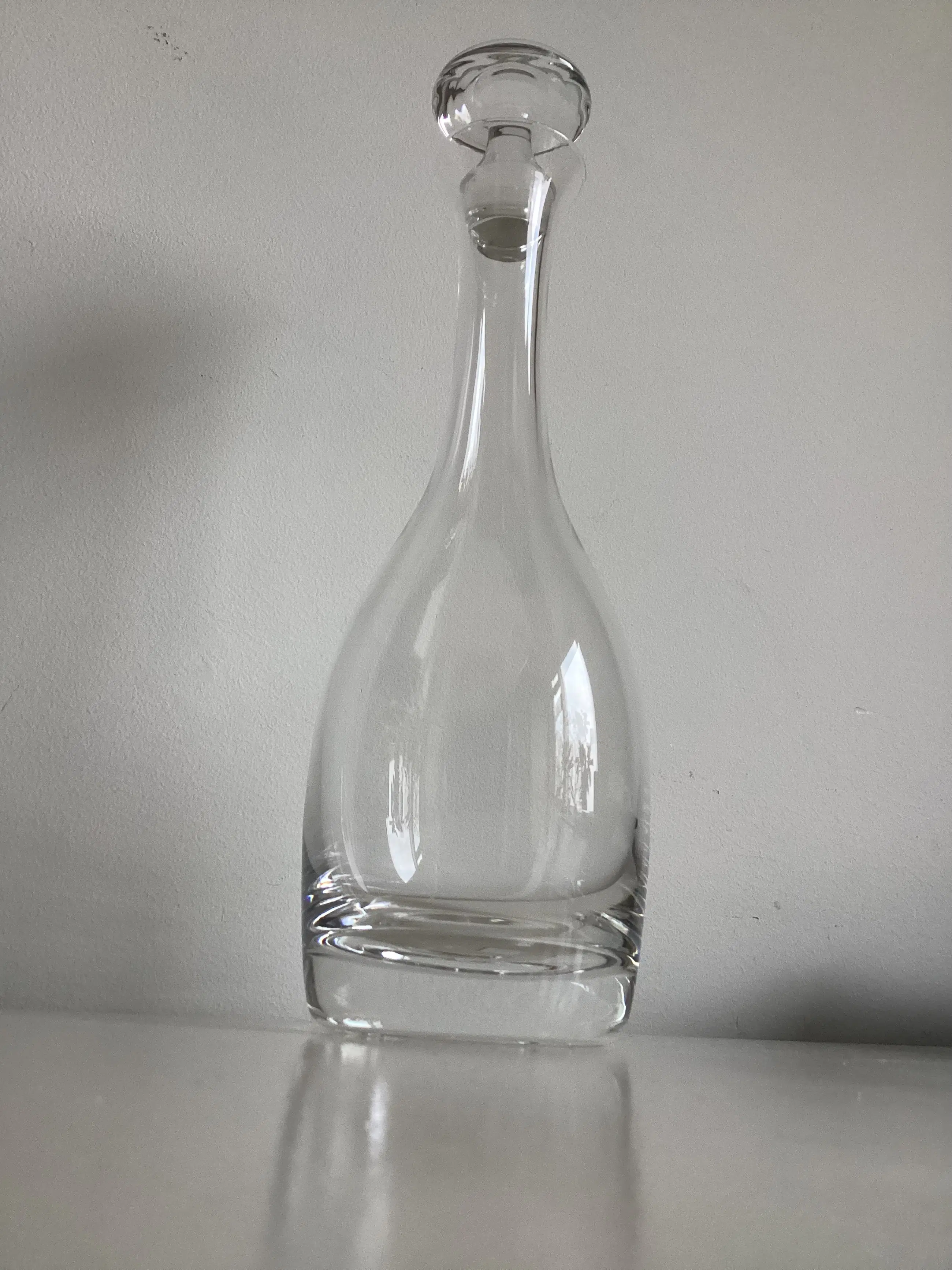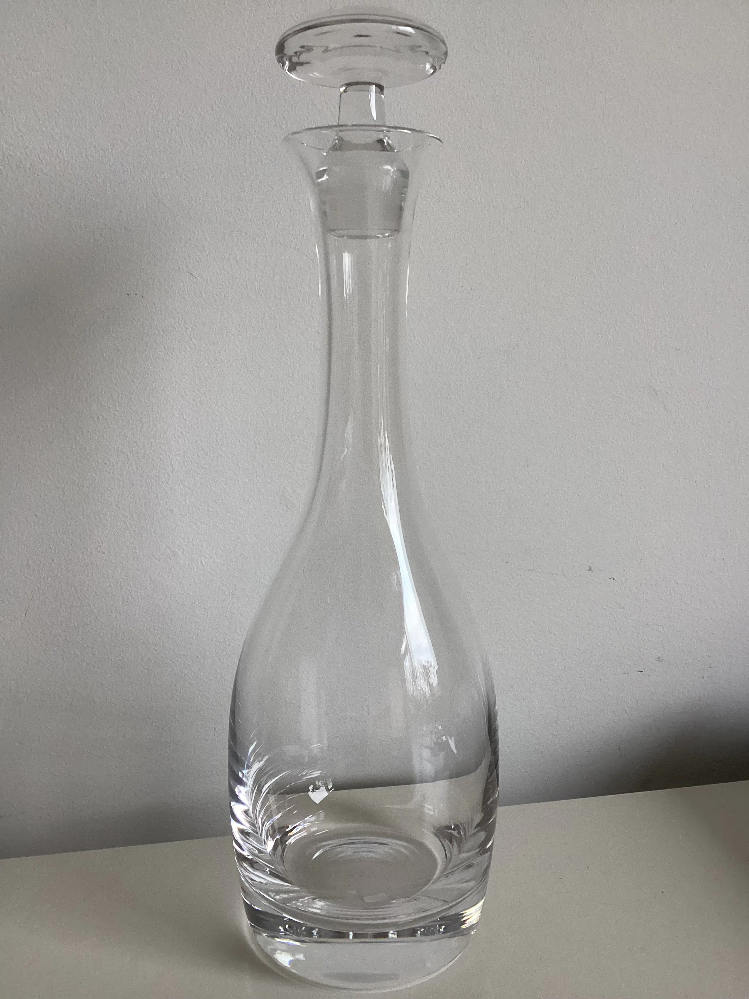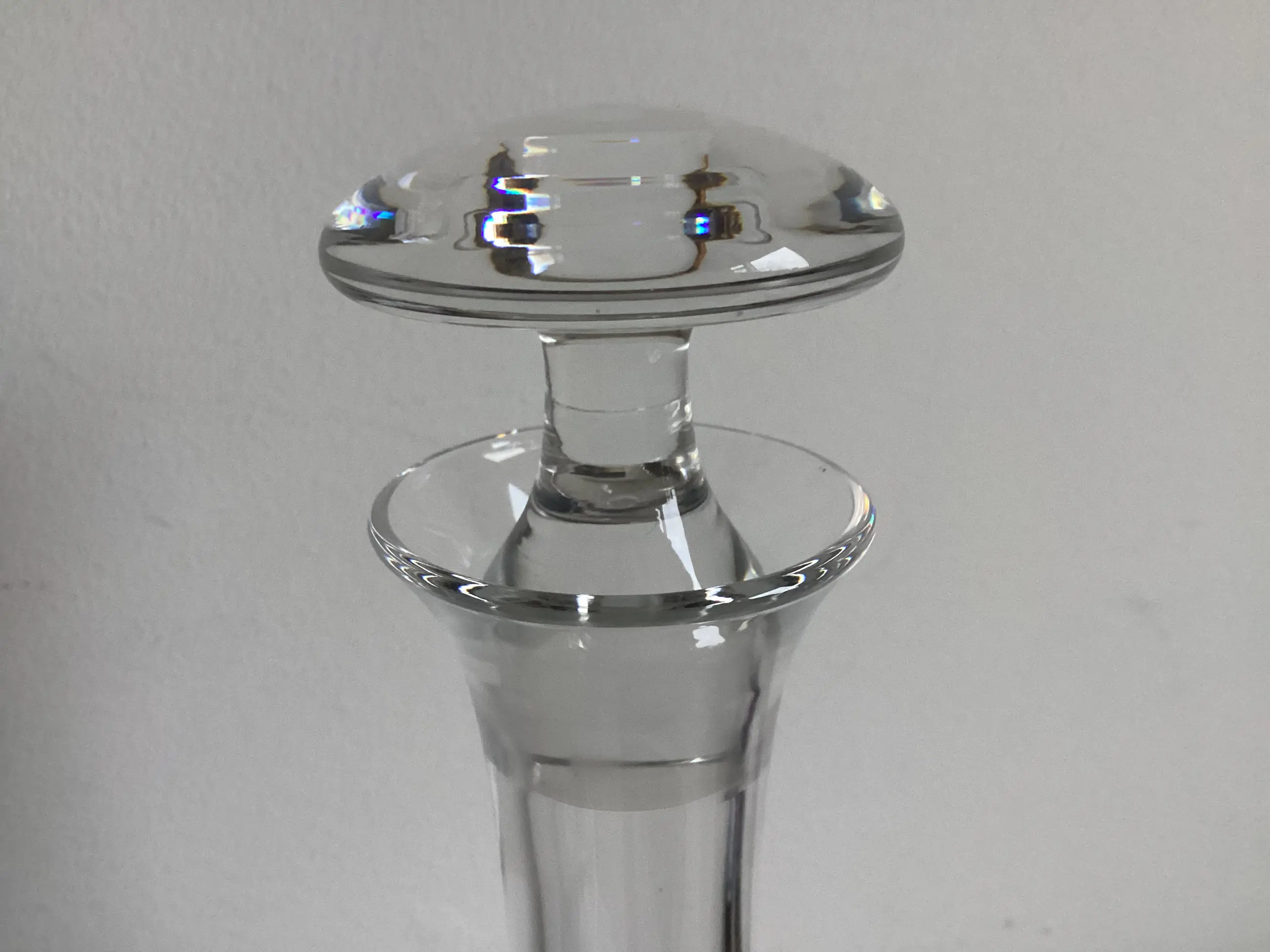 Fraaie karaf van Leerdam: Florence. Compleet met stop. Van merkteken voorzien onderop, tevens genummerd 127 onderop plus op stop. Hoogte 35,5 cm. Afgezien van minuscuul stipje aan de bovenrand (productiefoutje of stootplekje) in onberispelijke staat ( zie voorlaatste detail foto).