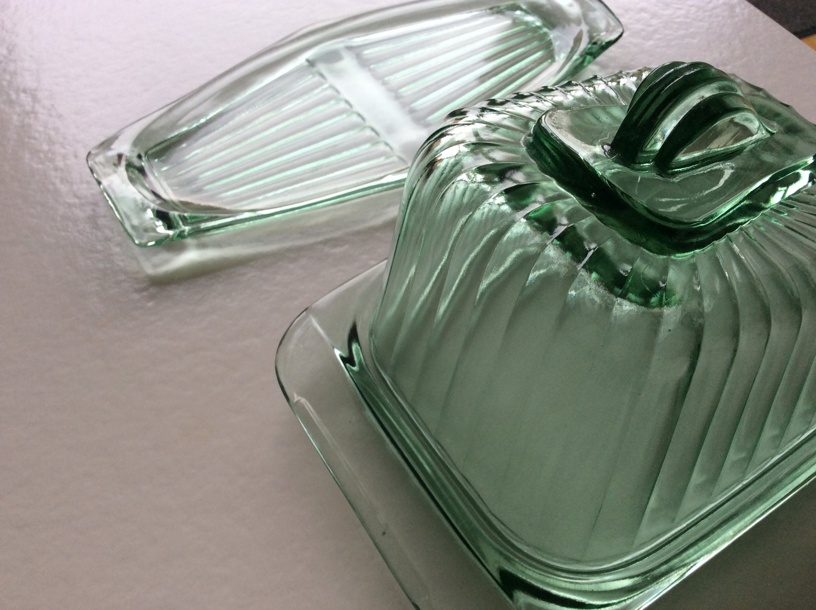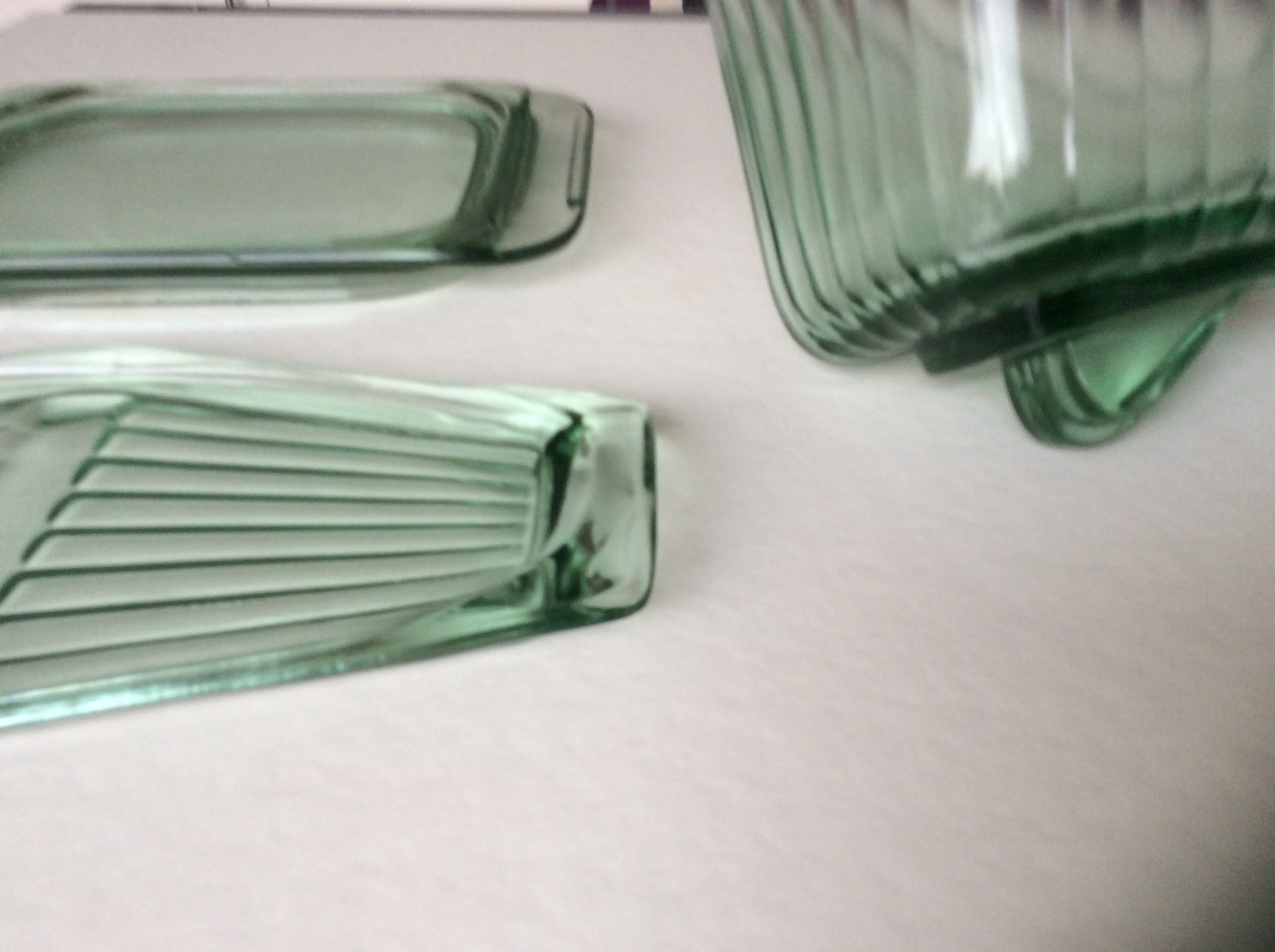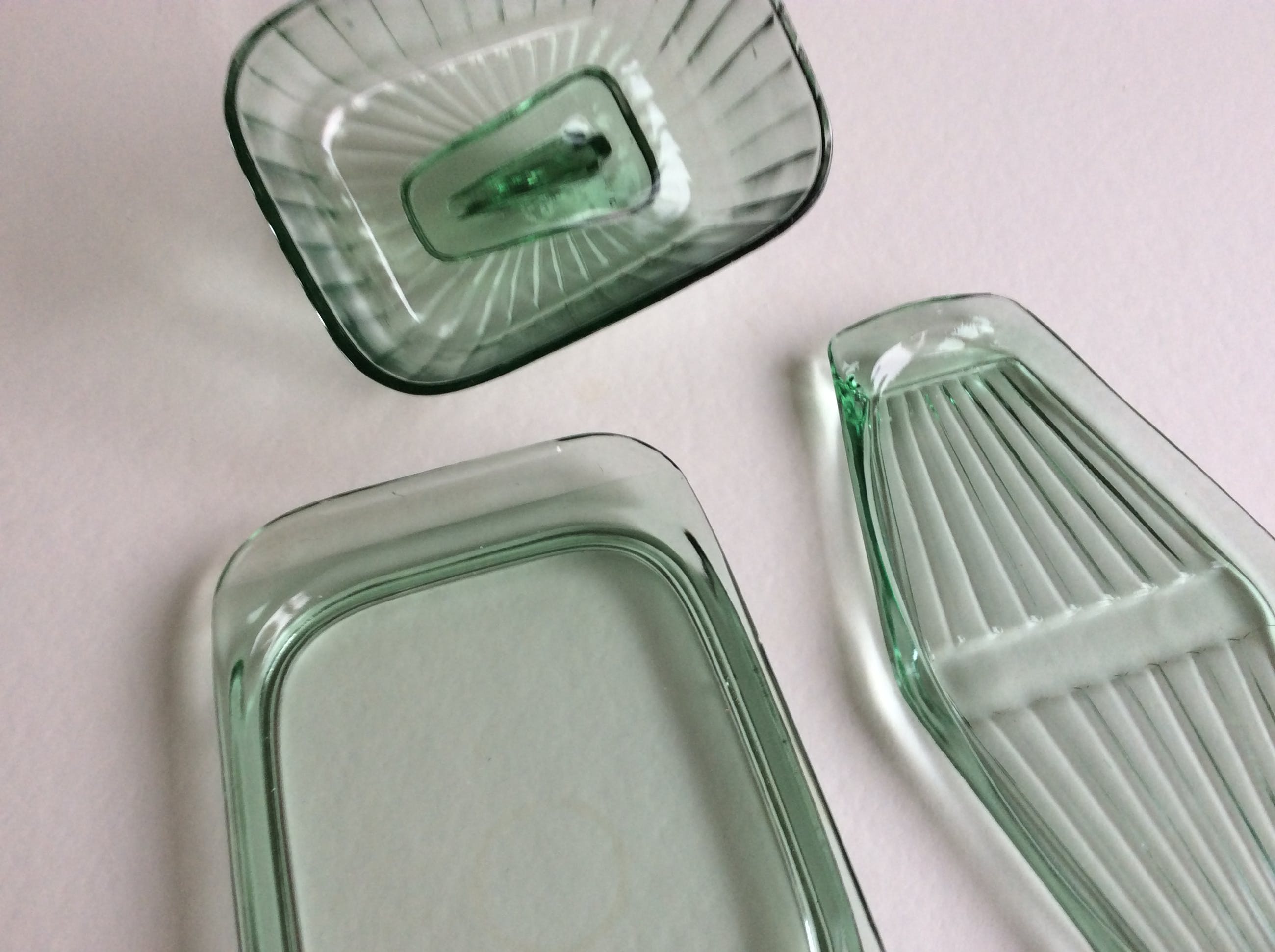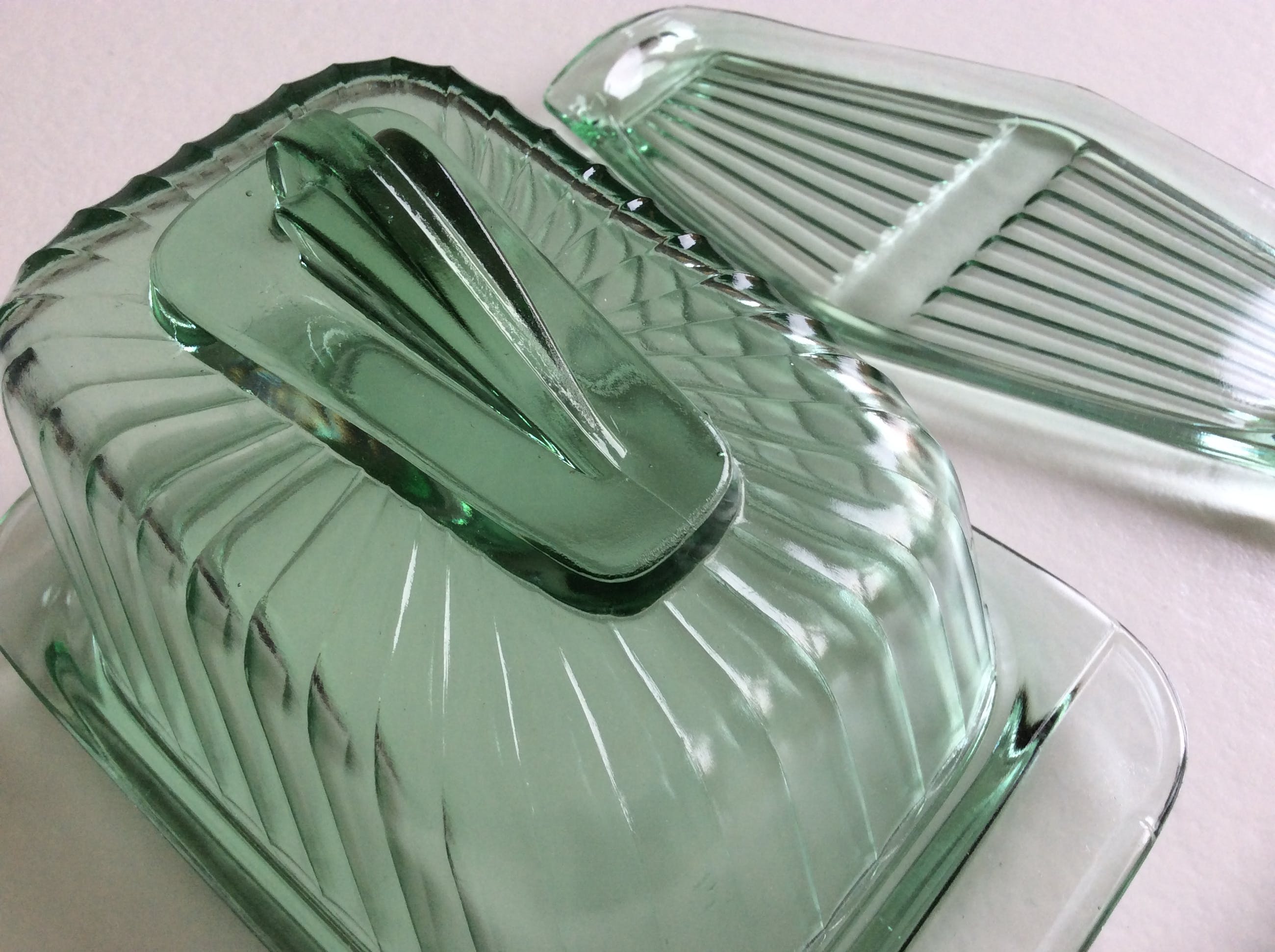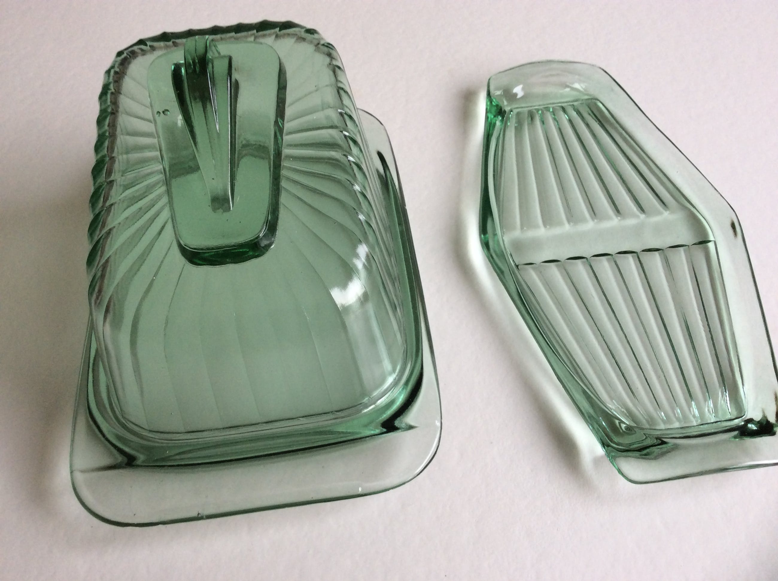Royal Leerdam Neerlandia kaasslede (h 14 cm, l 23 cm) en onderschotel, 1939.Kleur: helder groen.Goede staat, zeer lichte gebruikssporen bij onderschotel.