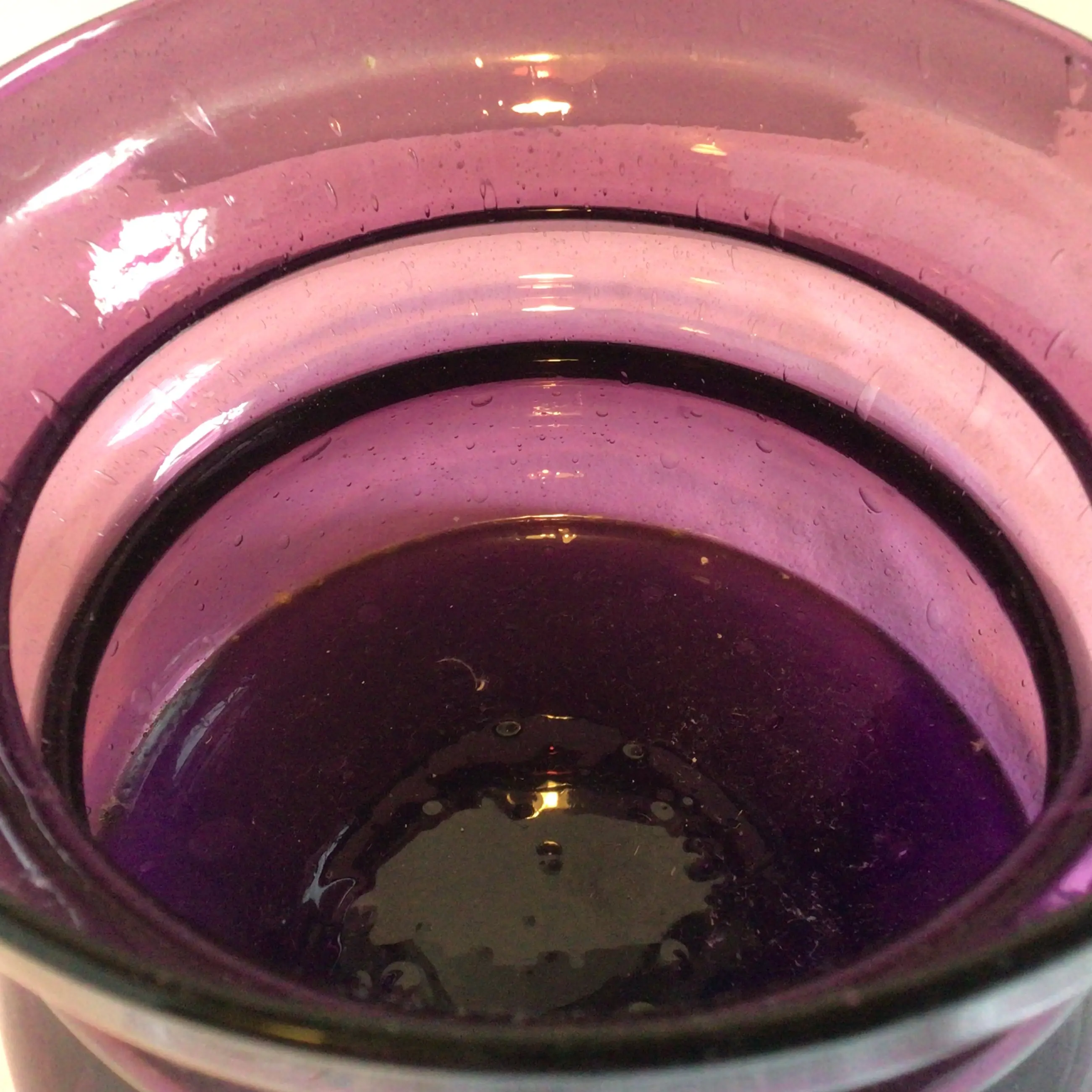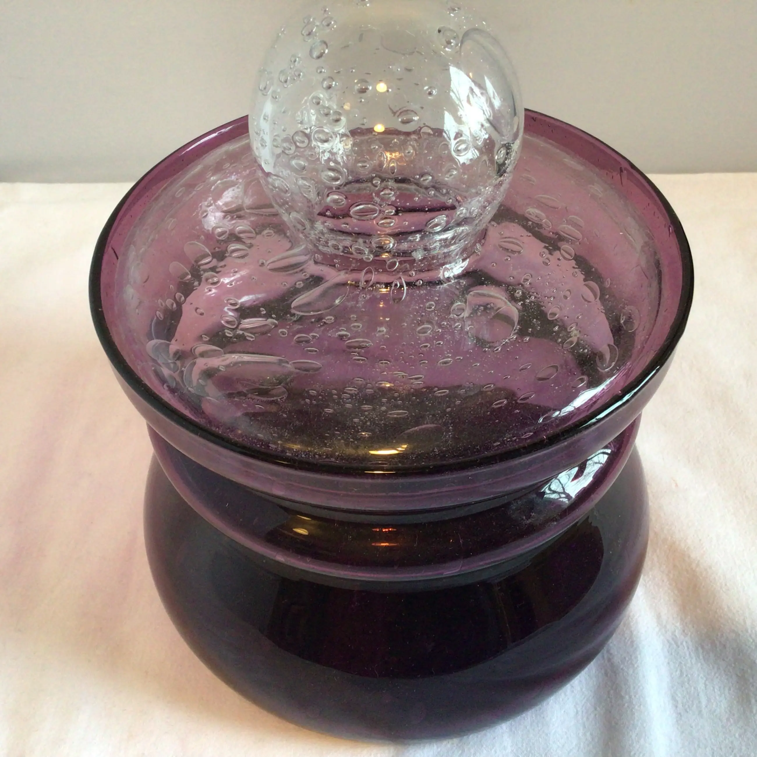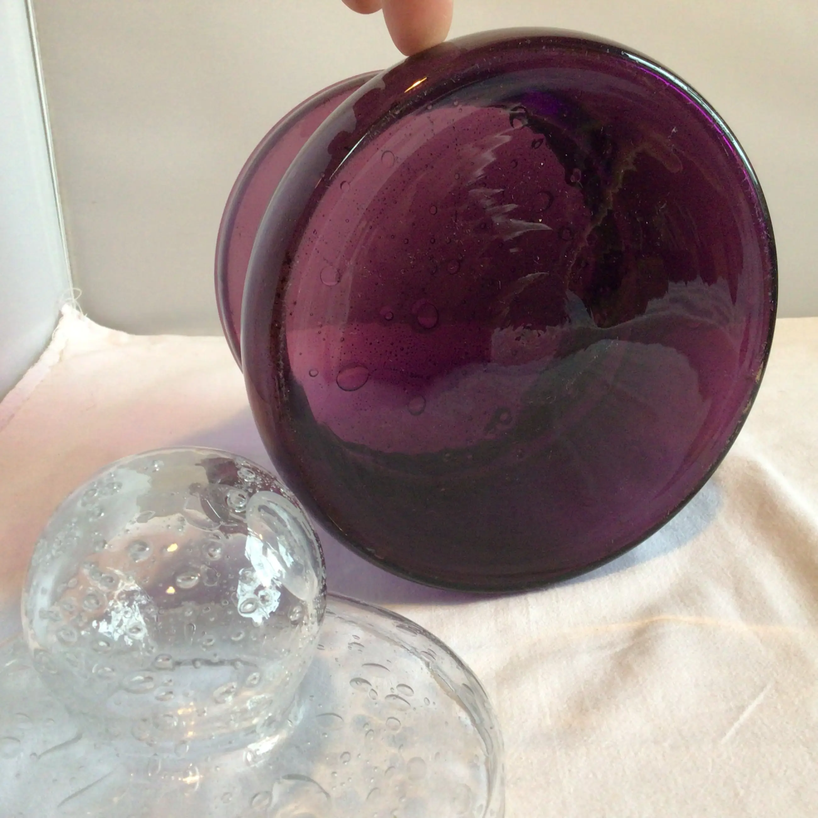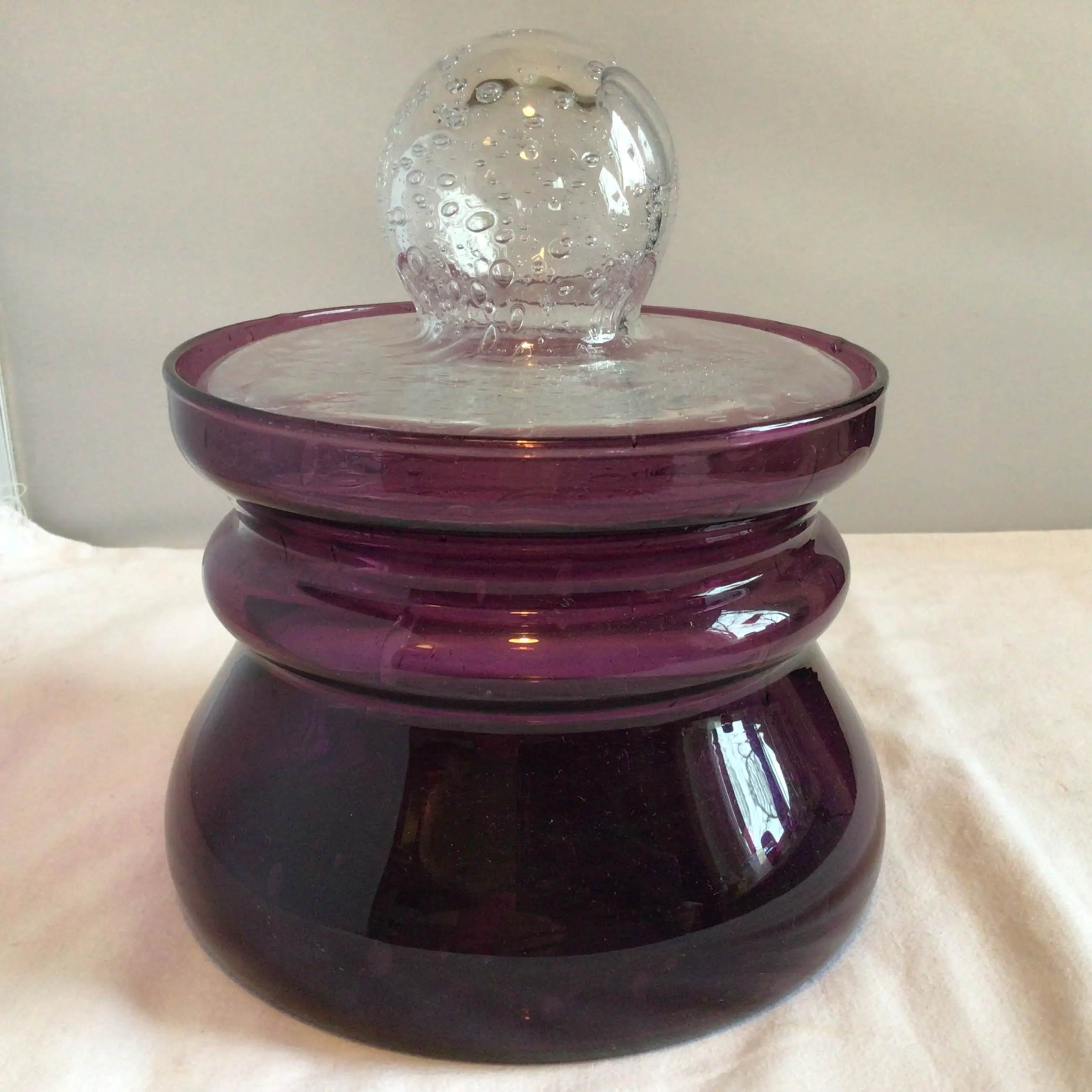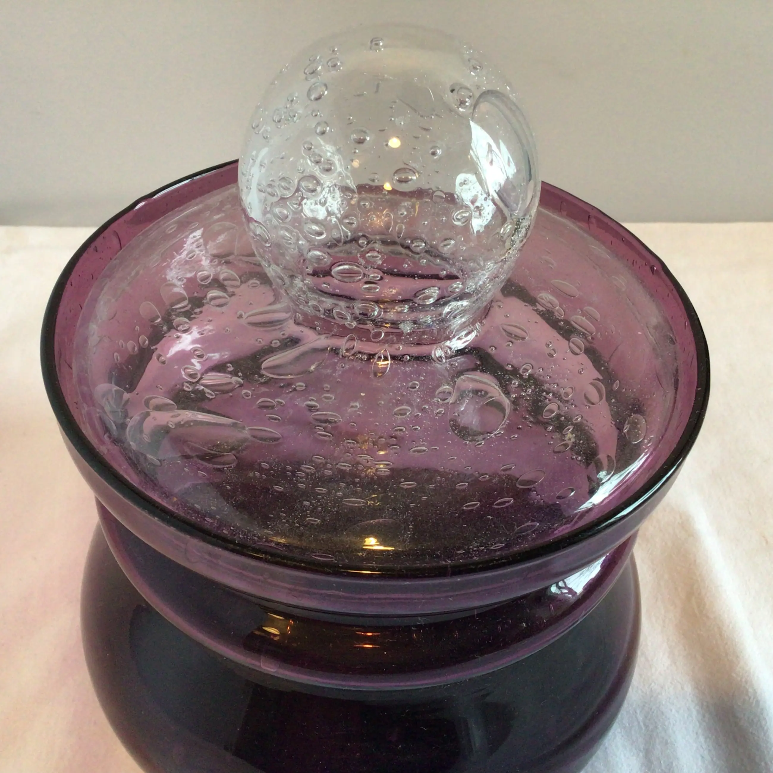 Prachtige paarse dekselpot, koekdoos van Royal Leerdam . In perfecte staat. In het glas zijn er mooie bellen te zien. Zeer mooi item.