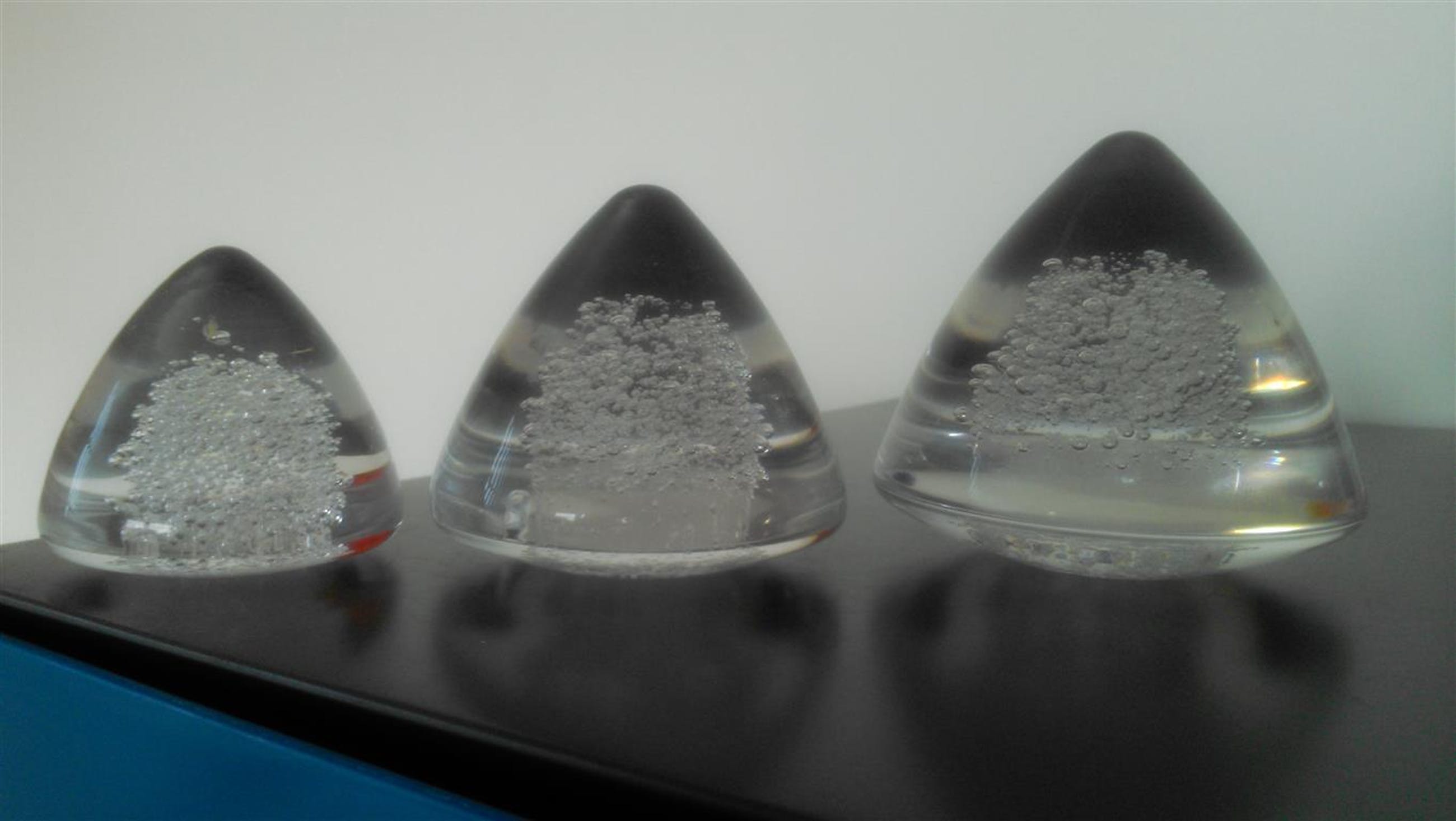 Glaskunstenaar Siem van der Marel Geboren: 1944 Vlaardingen Siem van der Marel was vanaf 1966 als ontwerper verbonden aan de Glasfabriek Leerdam van zijn hand zijn deze kegels De grootste 8 cm hoog en 9 cm in doorsnede is gemerkt "Royal Leerdam SvdM" De middelste is gemerkt met logo Leerdam 7 cm hoog en 7,5 in doorsnede De kleinste 6 cm hoog en 6 cm in doorsnede is niet gemerkt