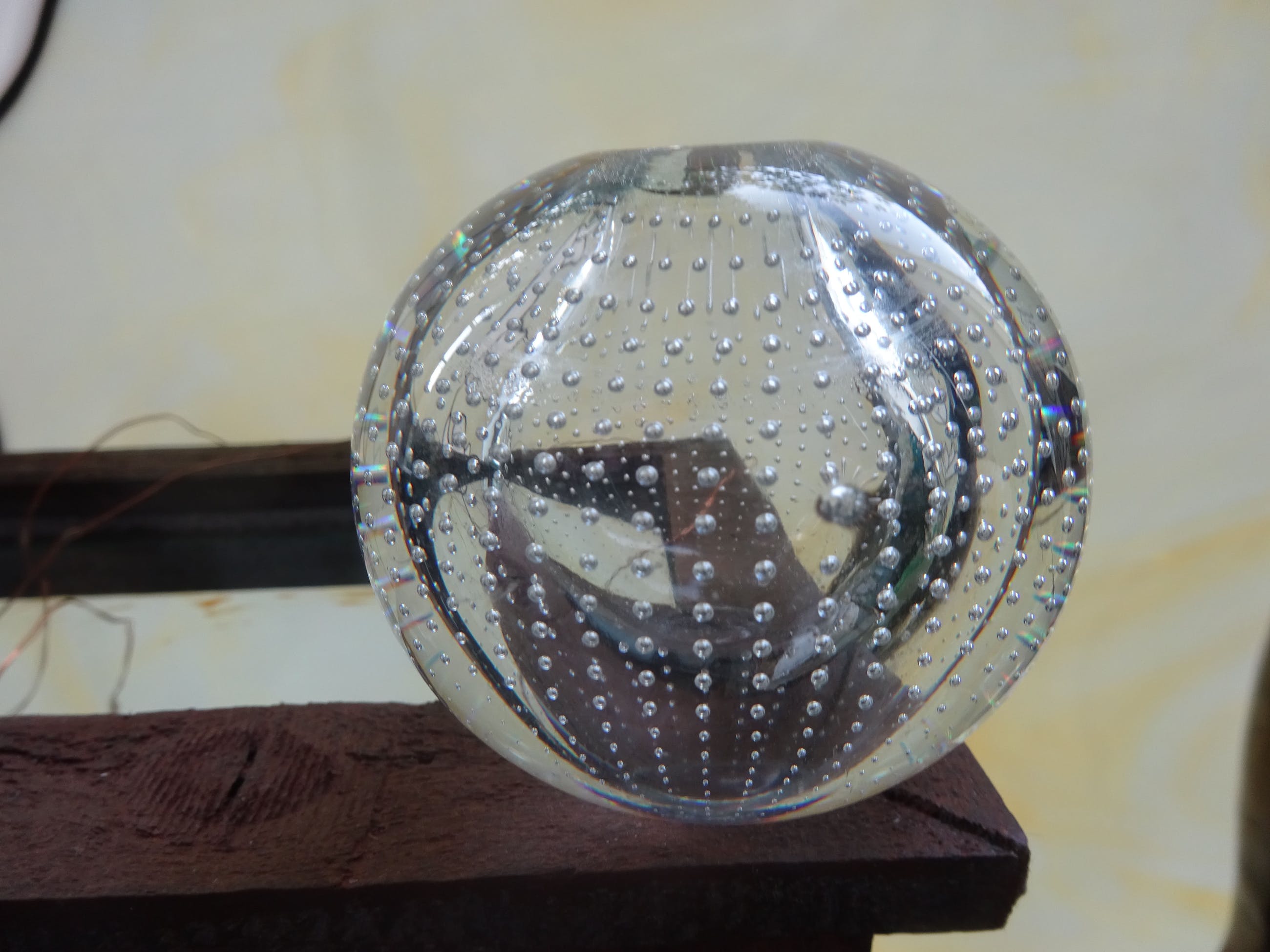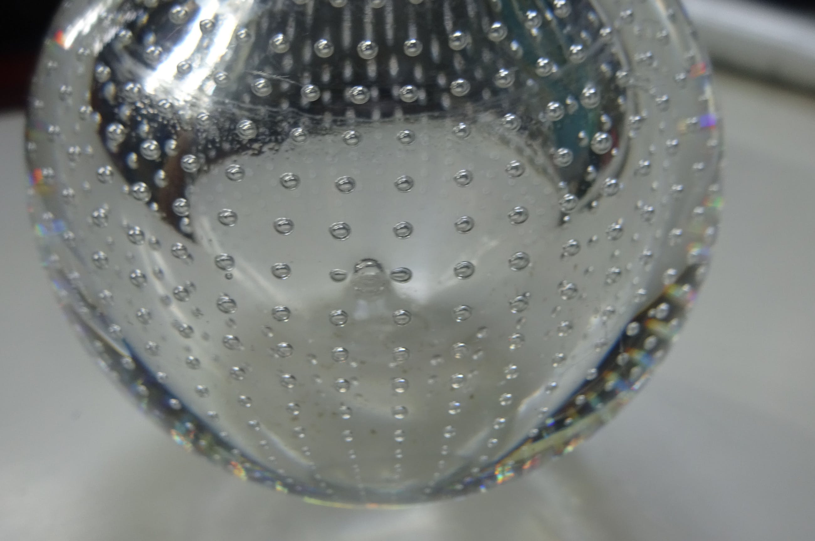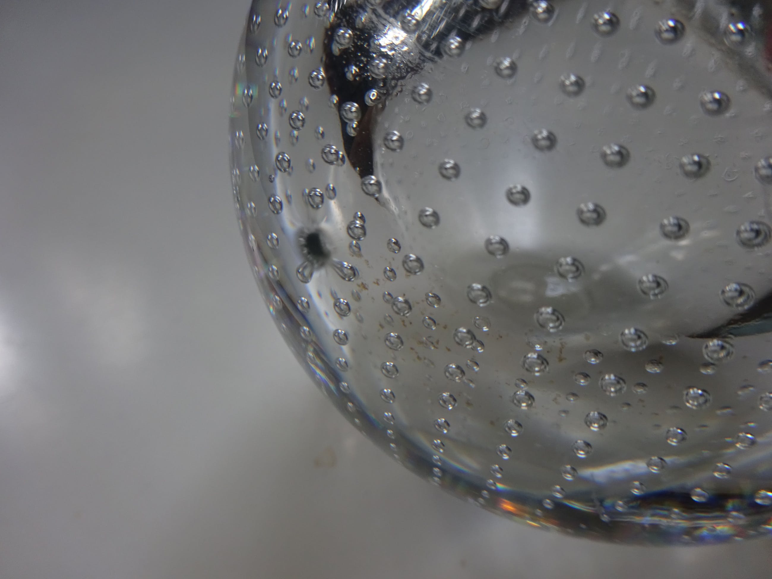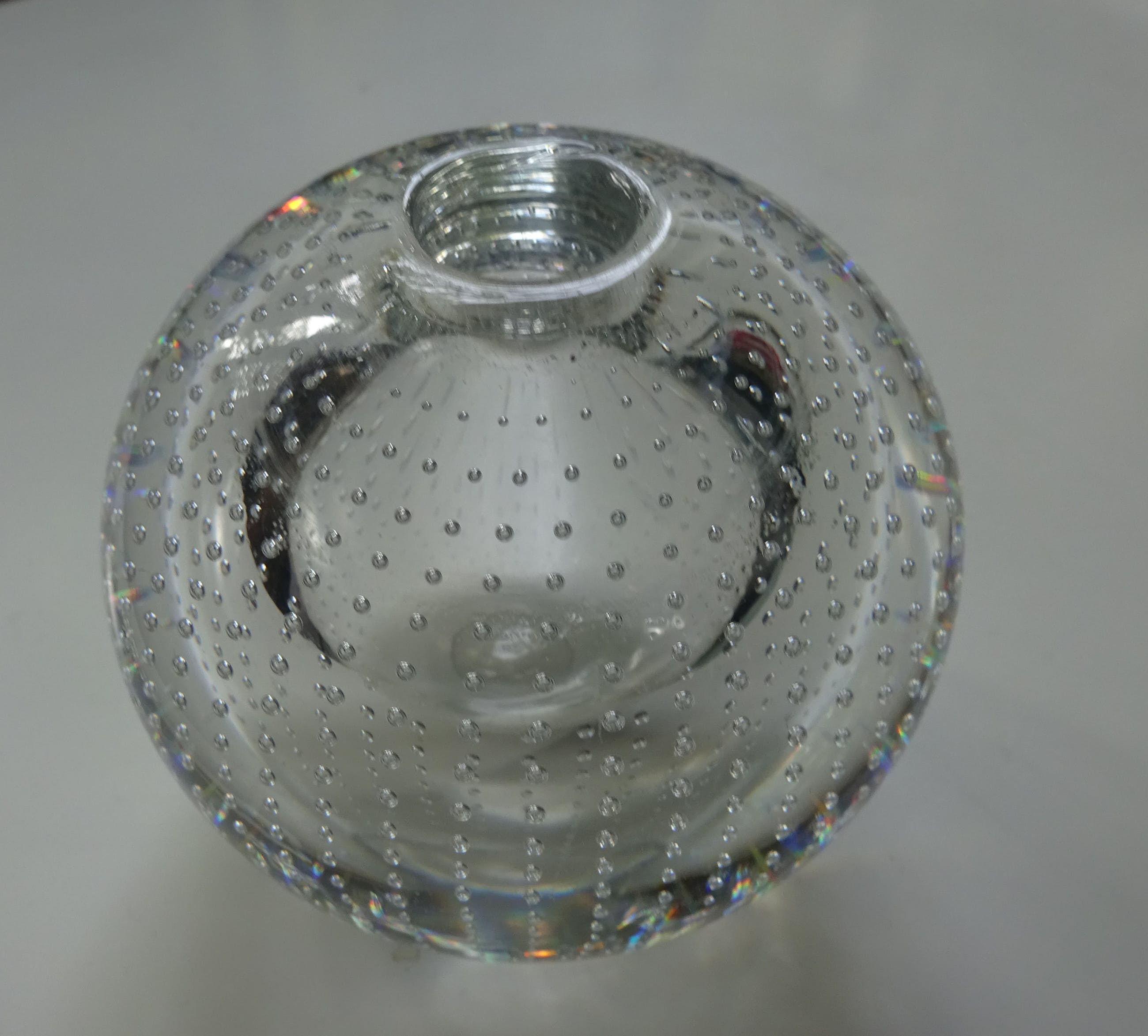 Spijkerbolletje-vaasje Uitvoering: Leerdam kristalglas Formaat: kleinste bolletje- solo vaasje Diameter: 6.5 cm Conditie: goede staat, klein origineel belletje aan de buitenzijde ( zie foto)