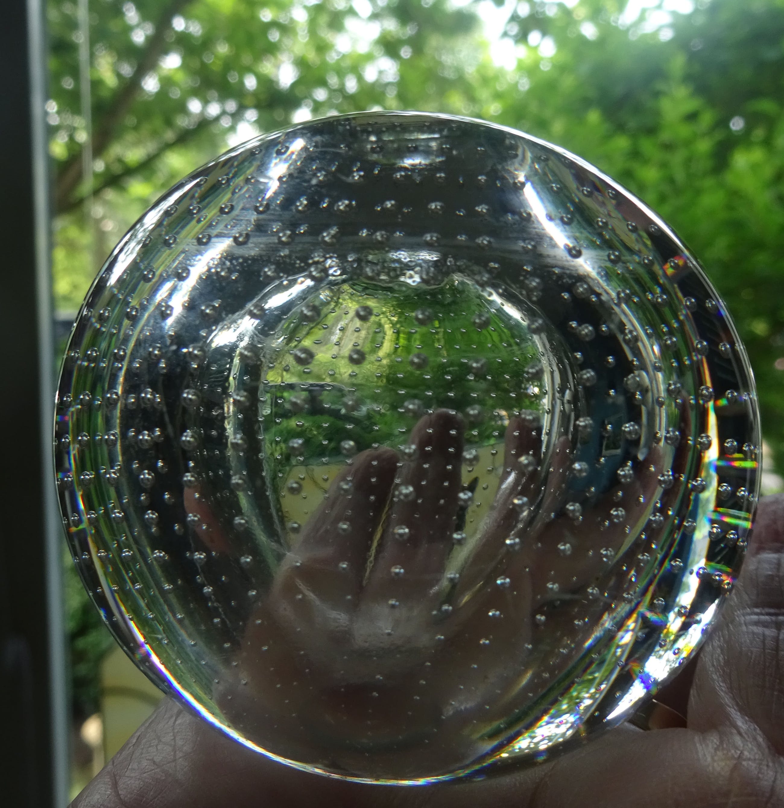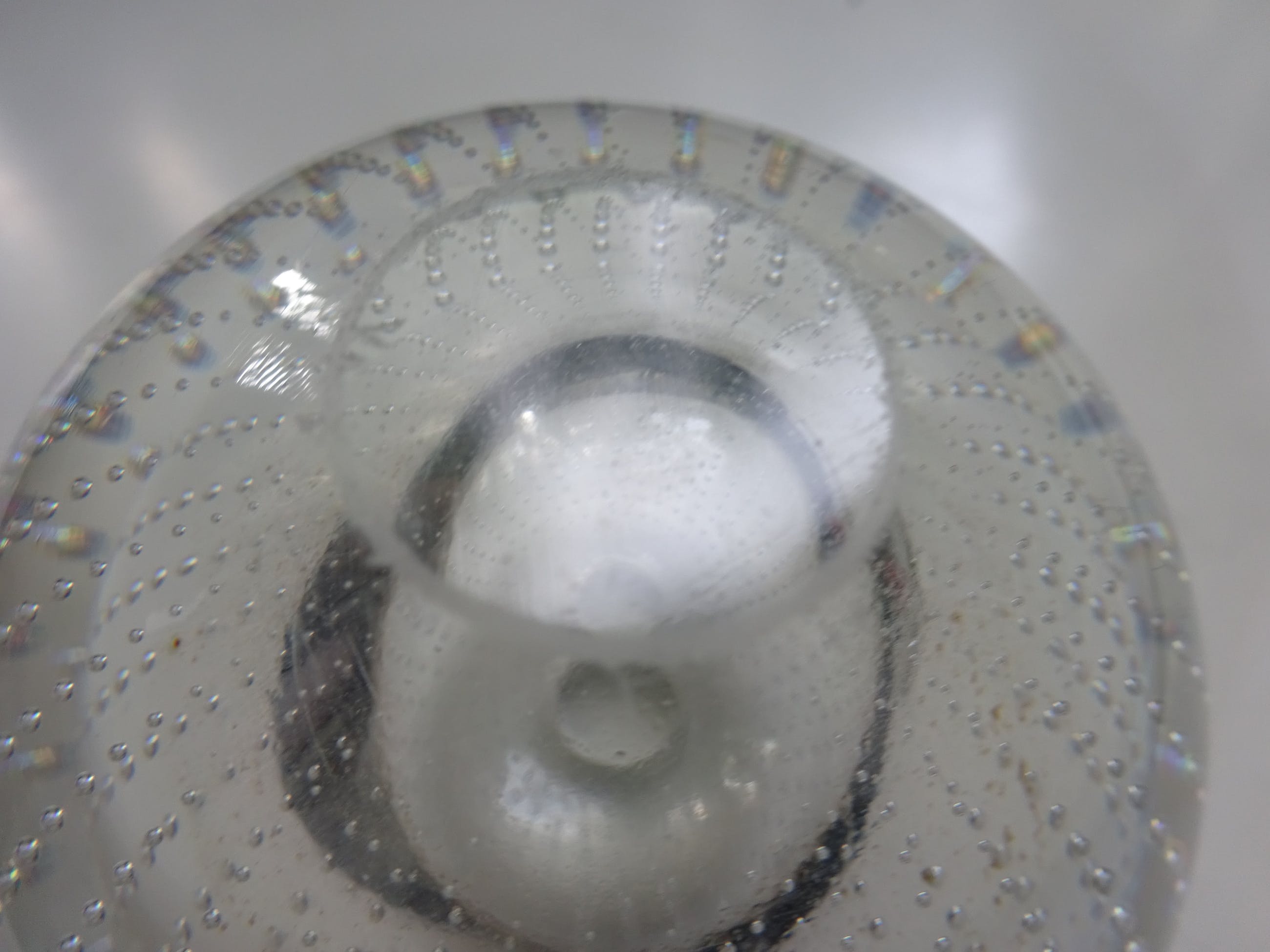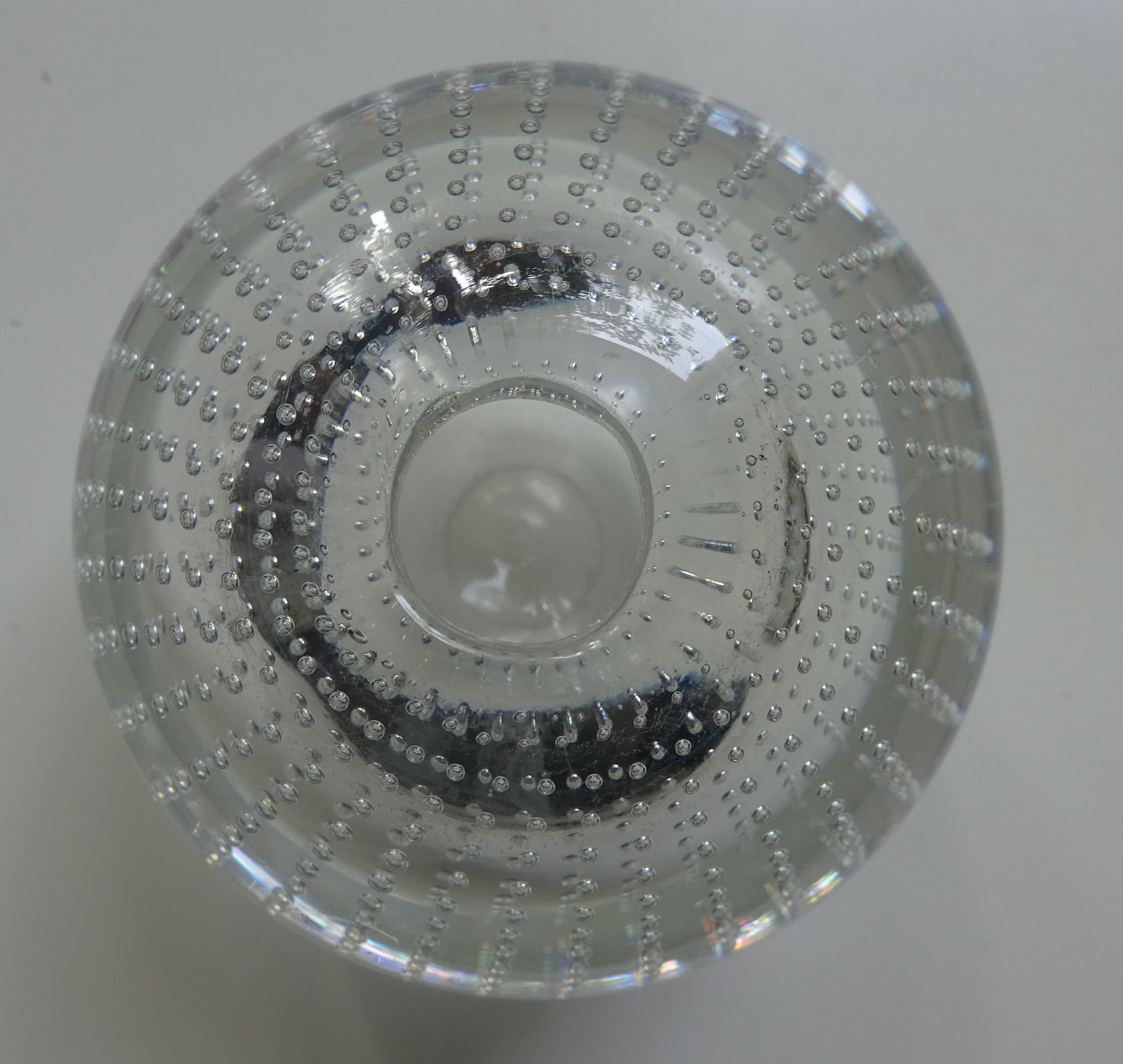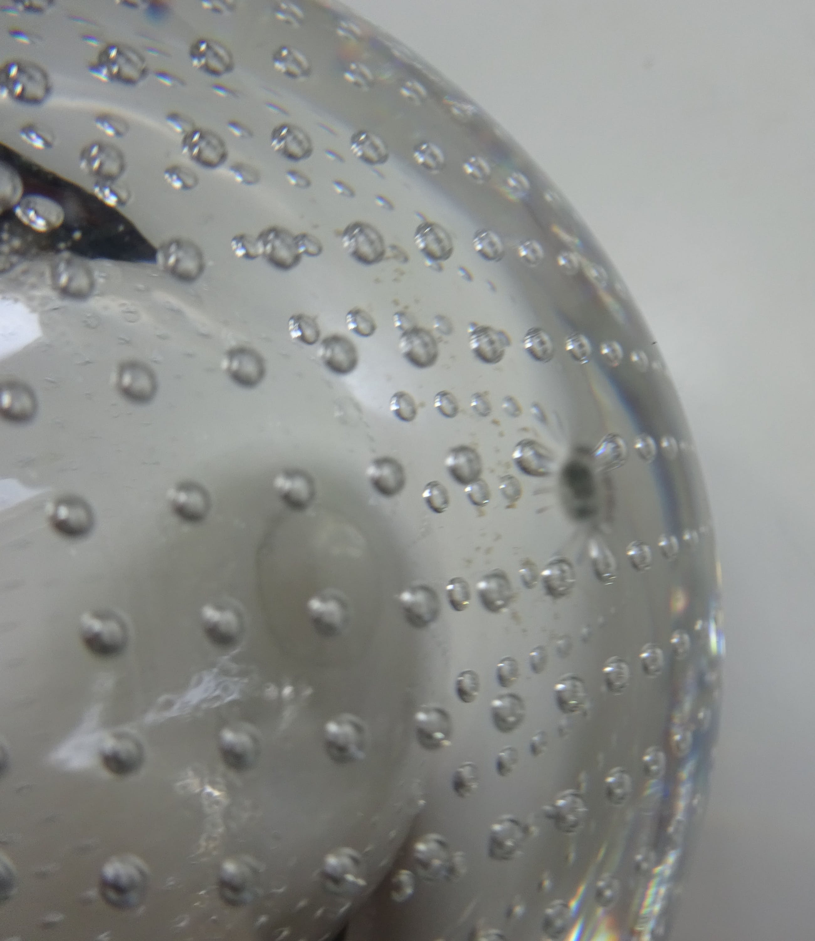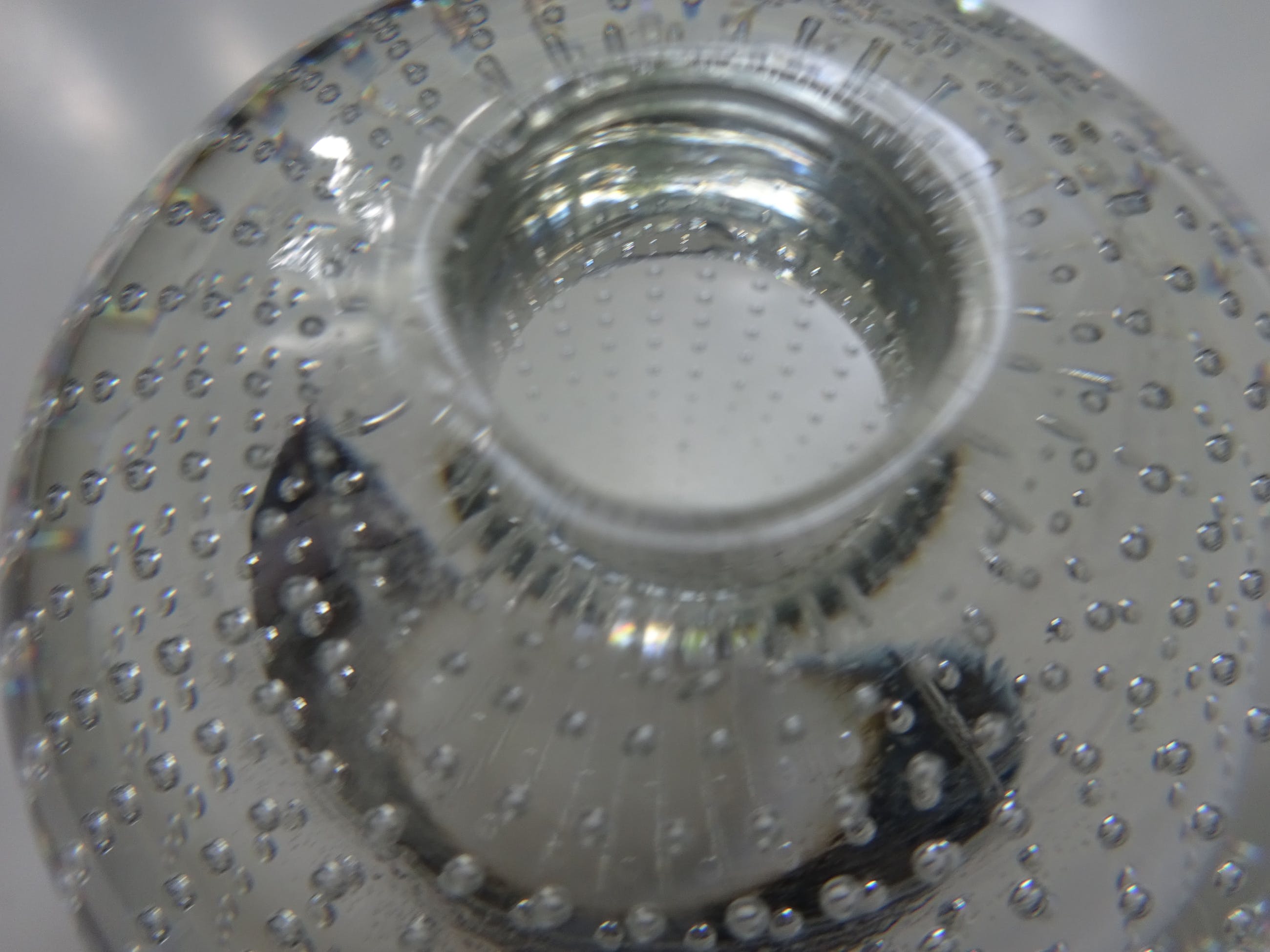 Spijkerbolletje-vaasje Uitvoering: Leerdam kristalglas Formaat: kleinste bolletje- solo vaasje Diameter: 6.5 cm Conditie: goede staat, klein origineel belletje aan de buitenzijde ( zie foto)