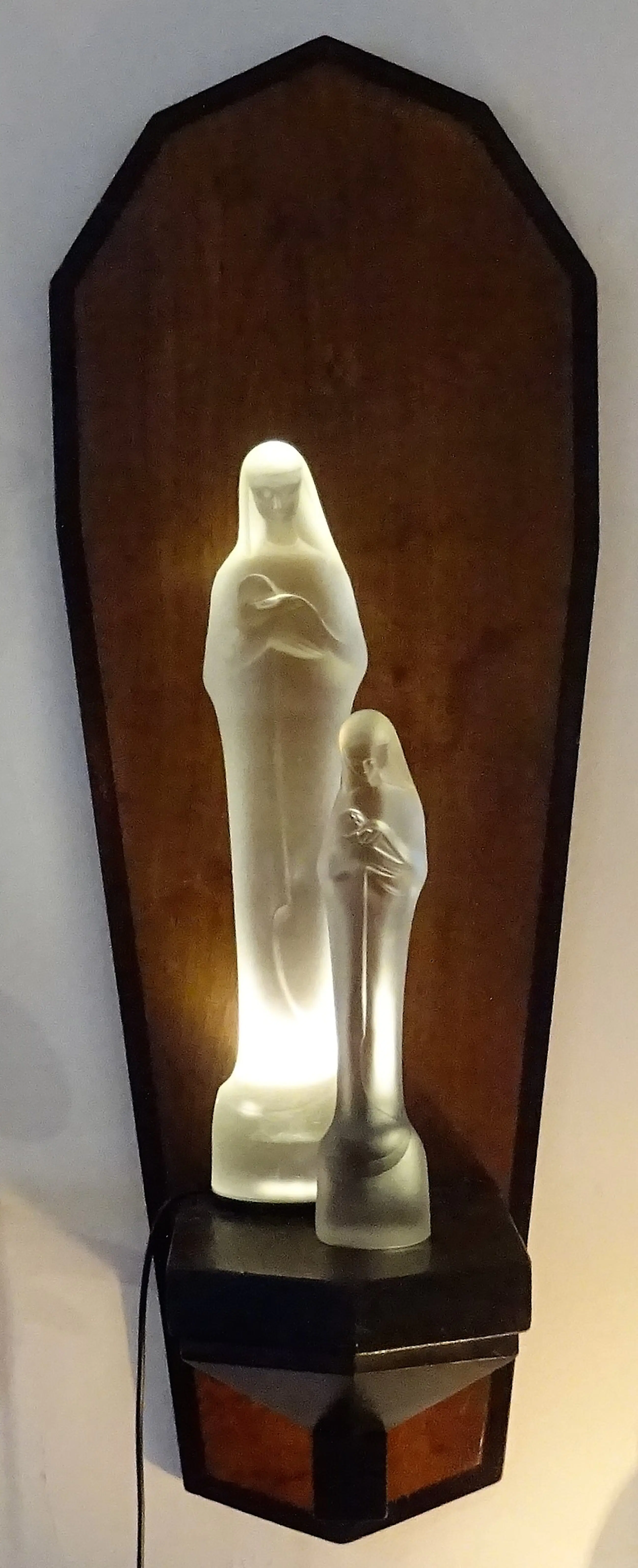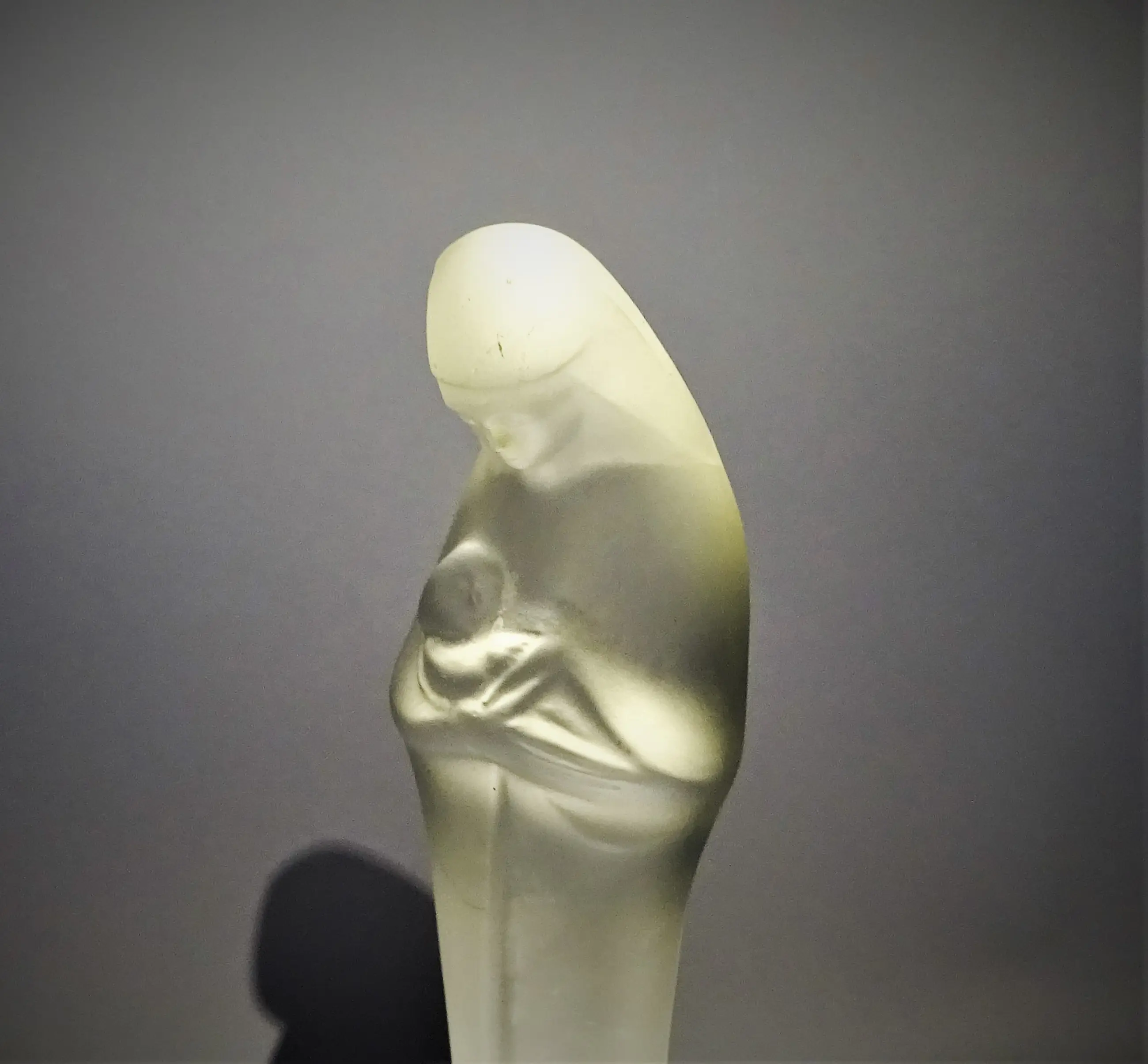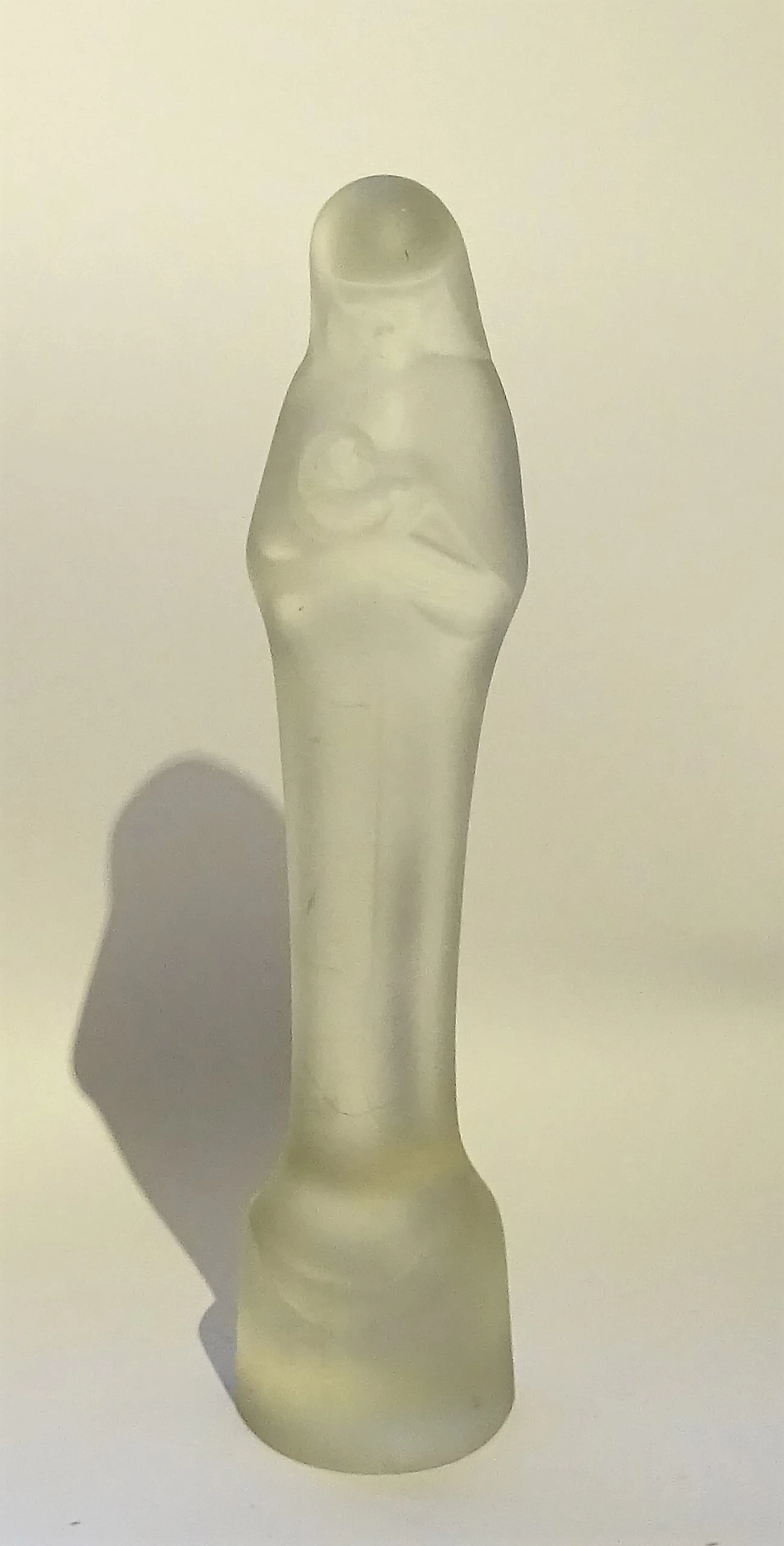 Originele Madonna met kind, ontwerp Stef UIterwaal voor Glasfabriek Leerdam 1929. Oude uitvoering, gesatineerd en massief met merkteken. Wordt geleverd met een nieuwe led verlichting warm wit.