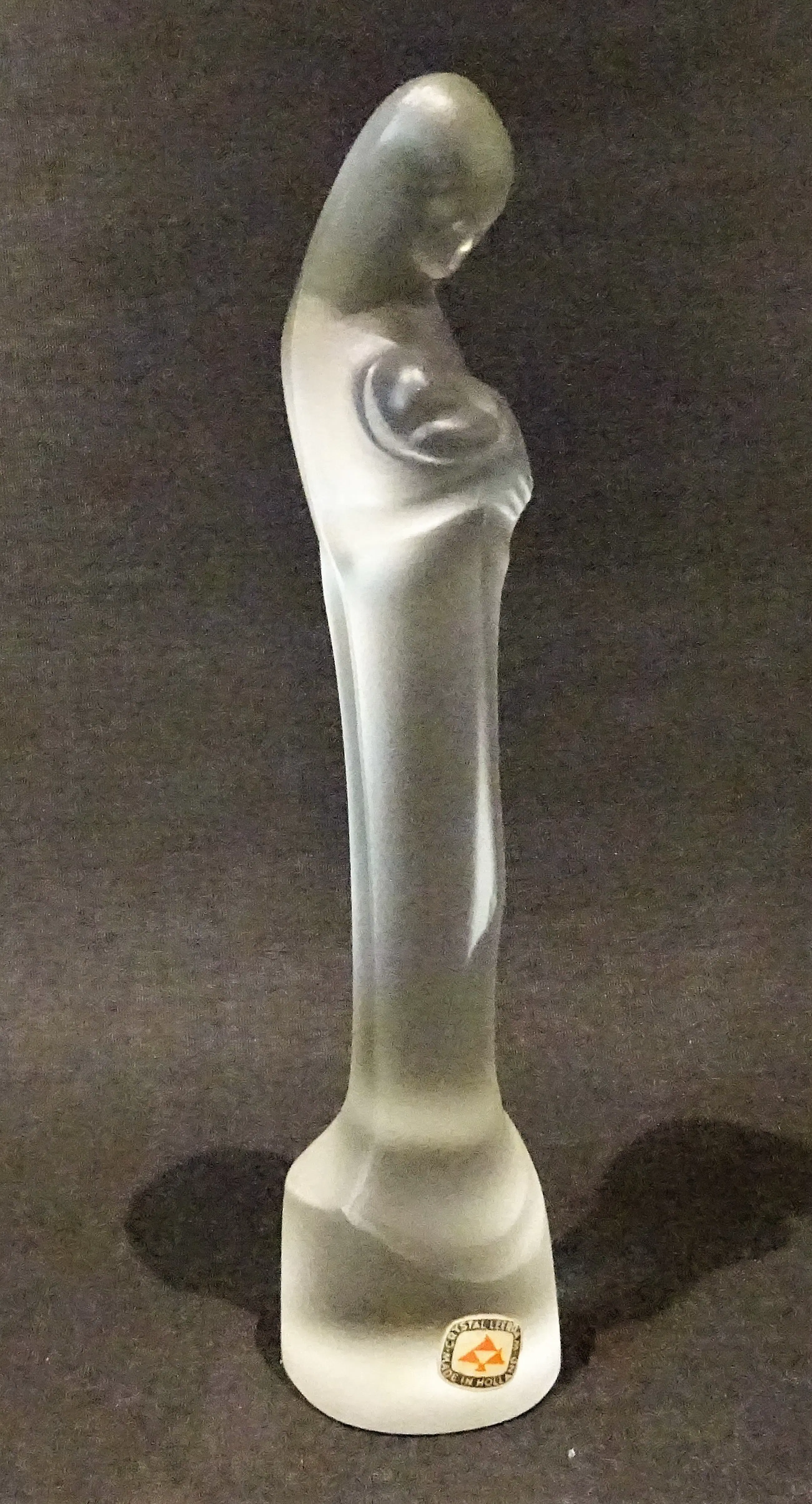 Originele Madonna met kind, ontwerp Stef UIterwaal voor Glasfabriek Leerdam 1929. Oude uitvoering, gesatineerd en massief met merkteken. Wordt geleverd met een nieuwe led verlichting warm wit.