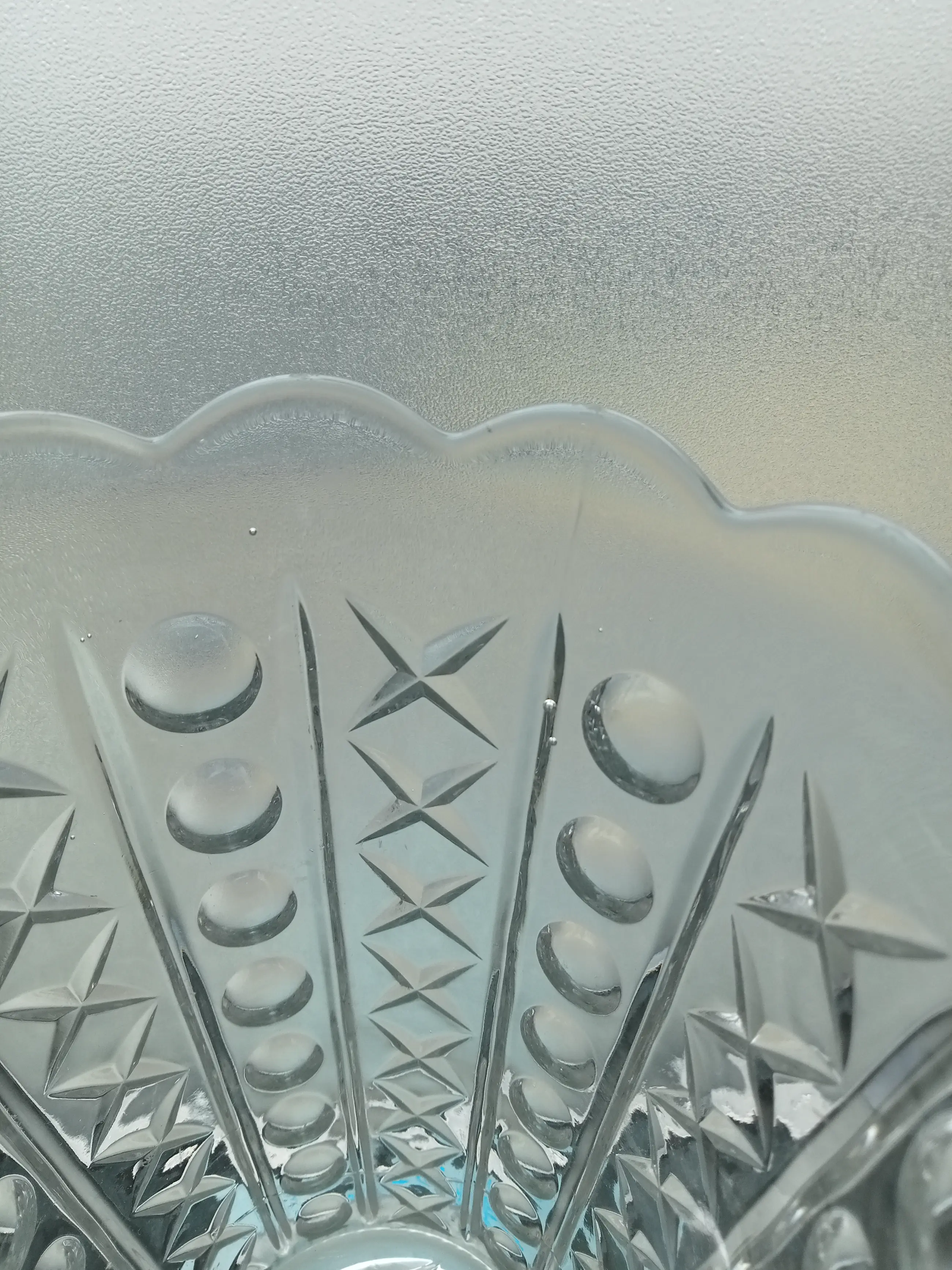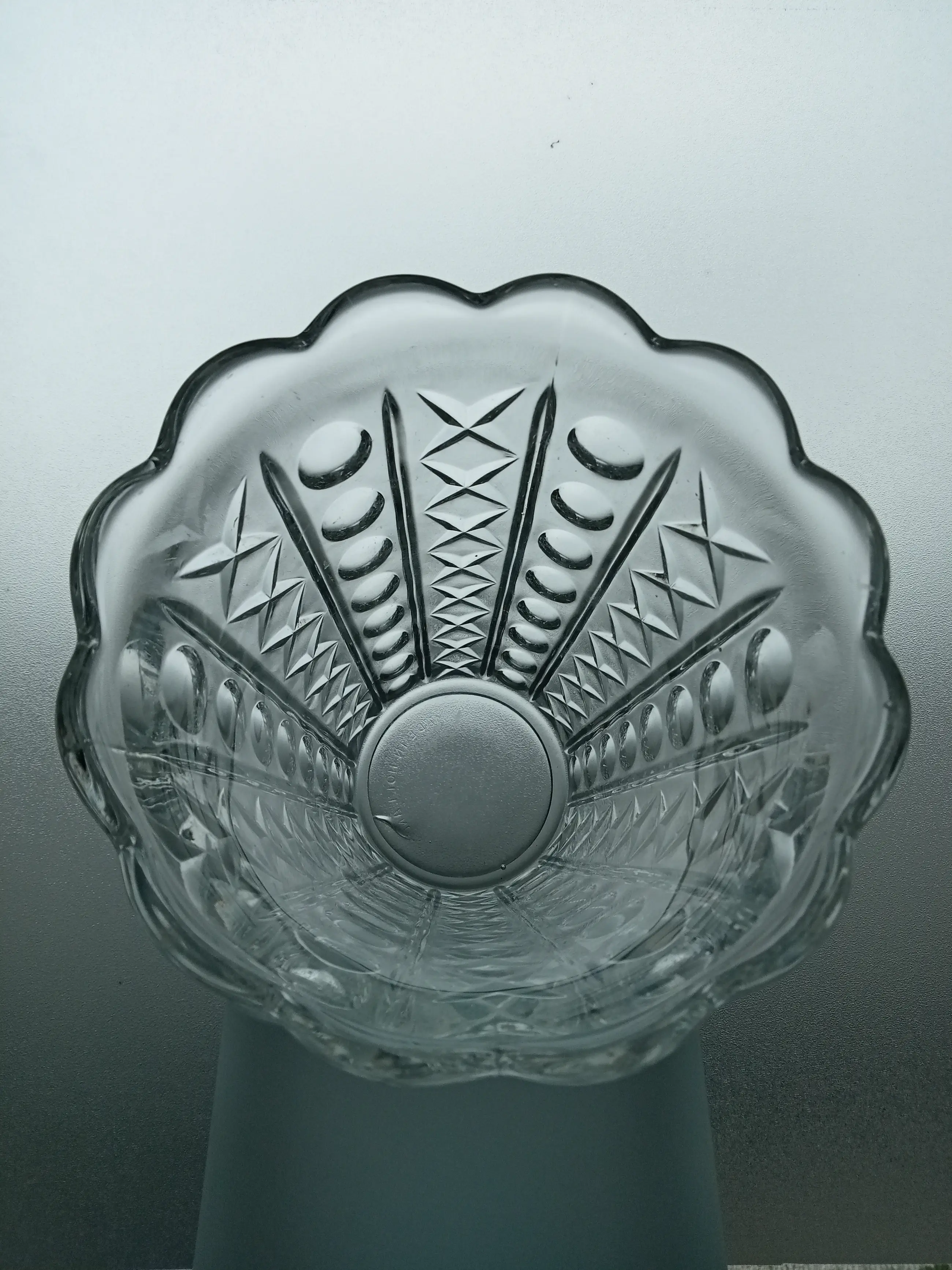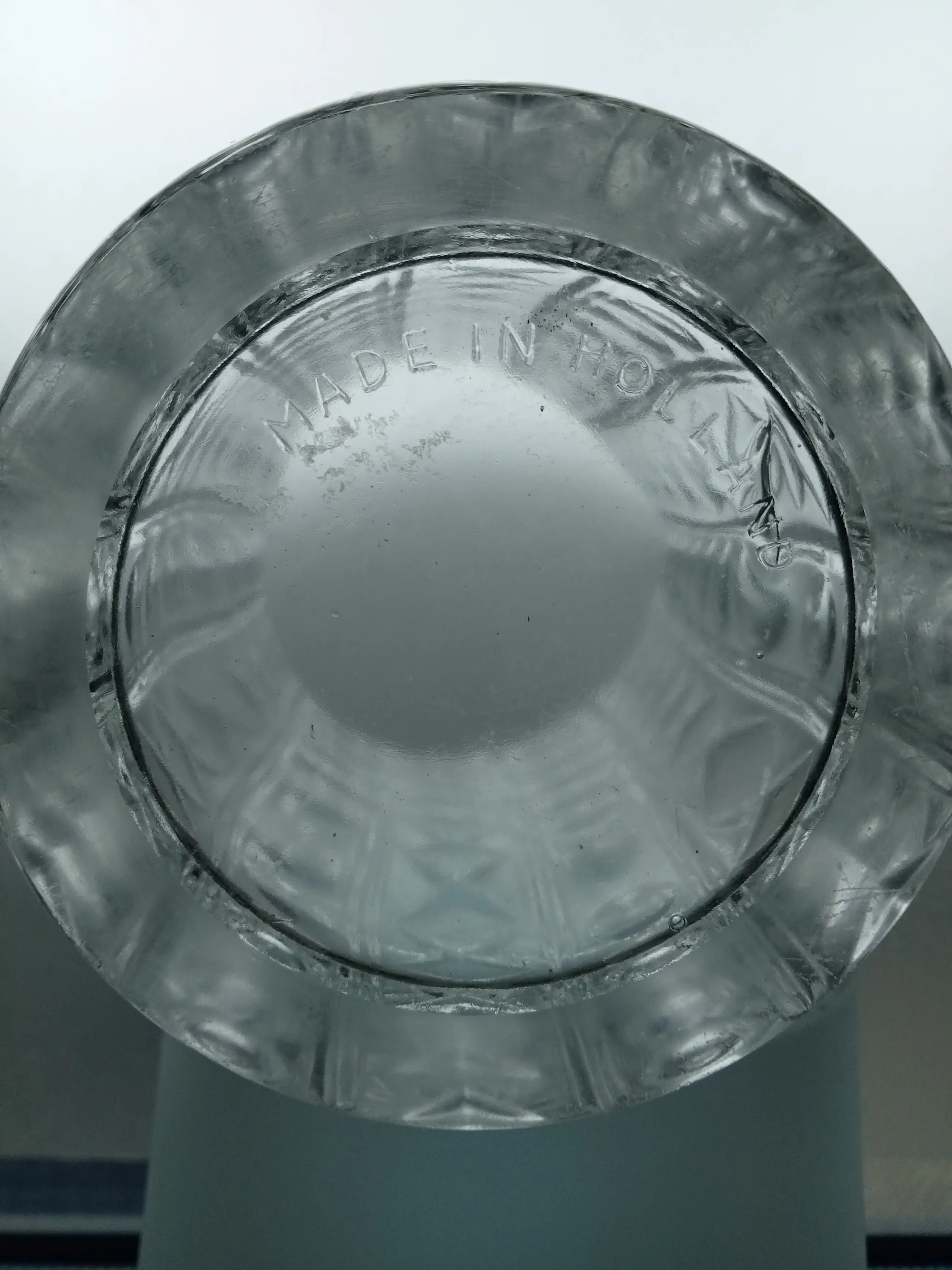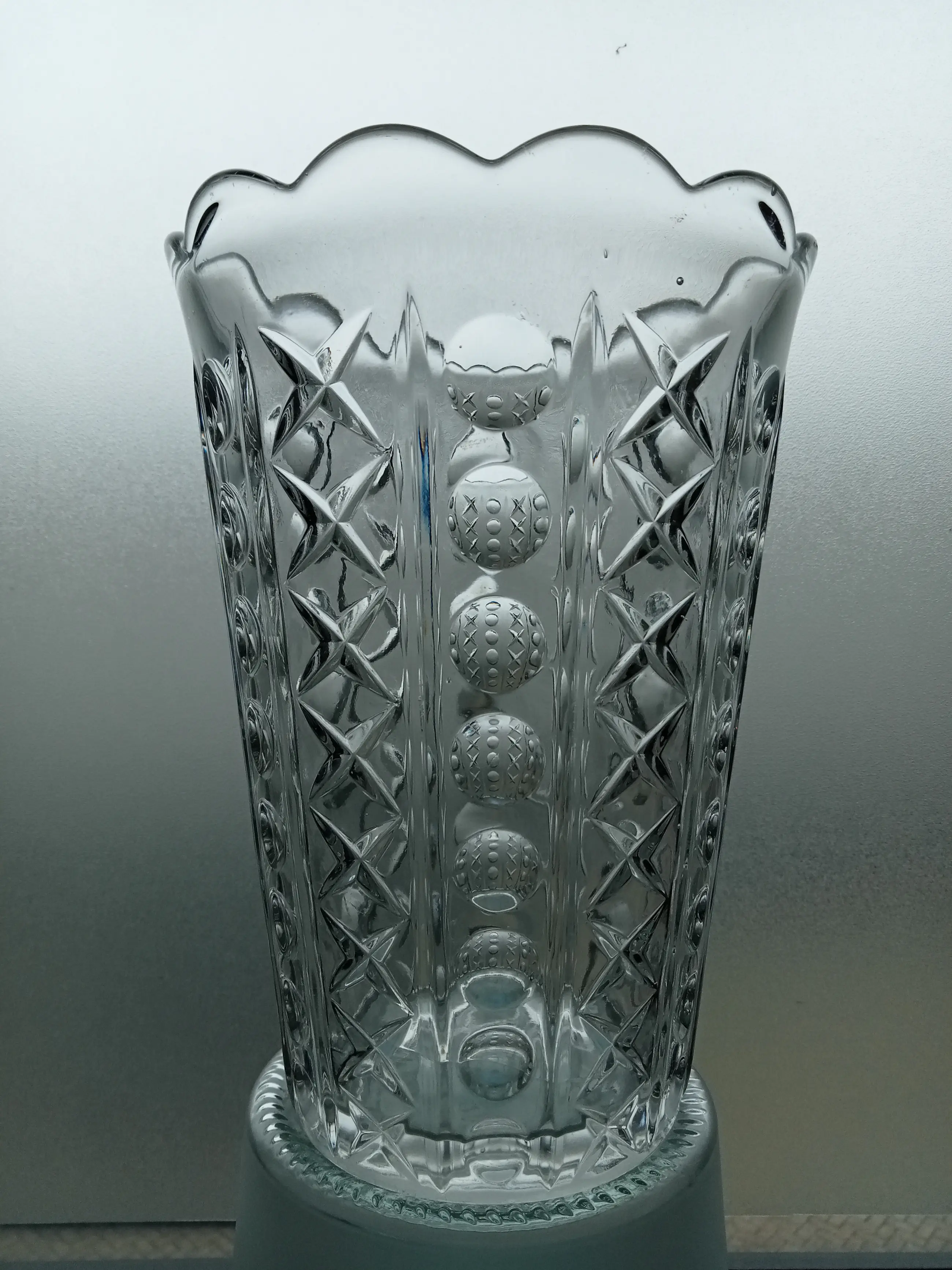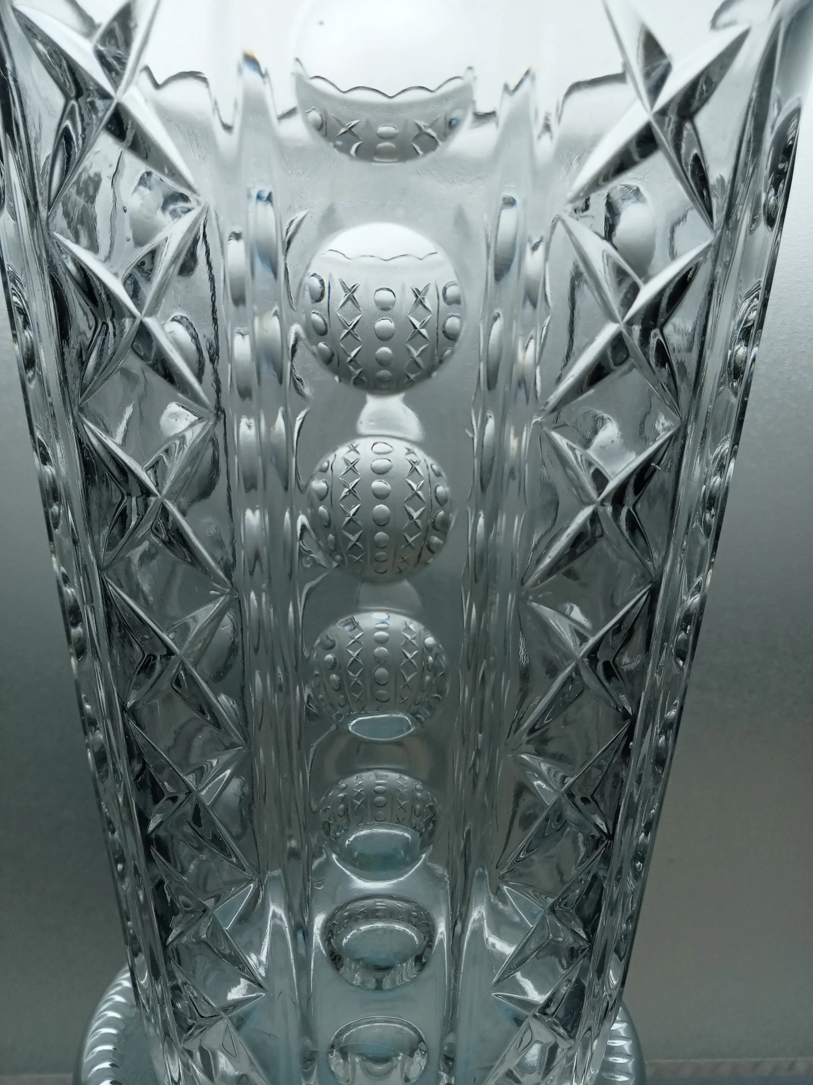 Mooie vaas van helder persglas ontwerp van G.J. Thomassen voor Leerdam glas. Zgn. lensglas ontwerp ook luchtbelletjes waarneembaar.