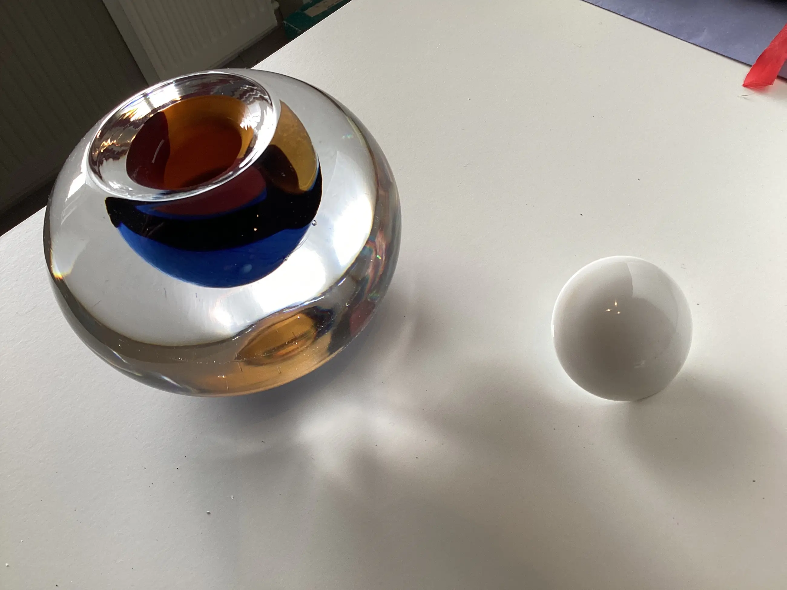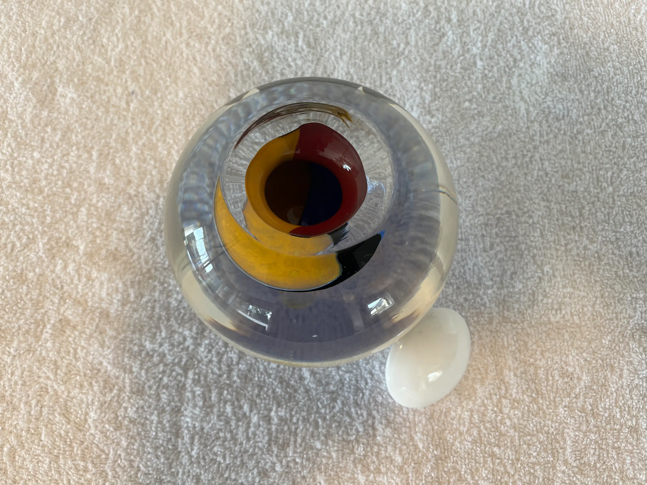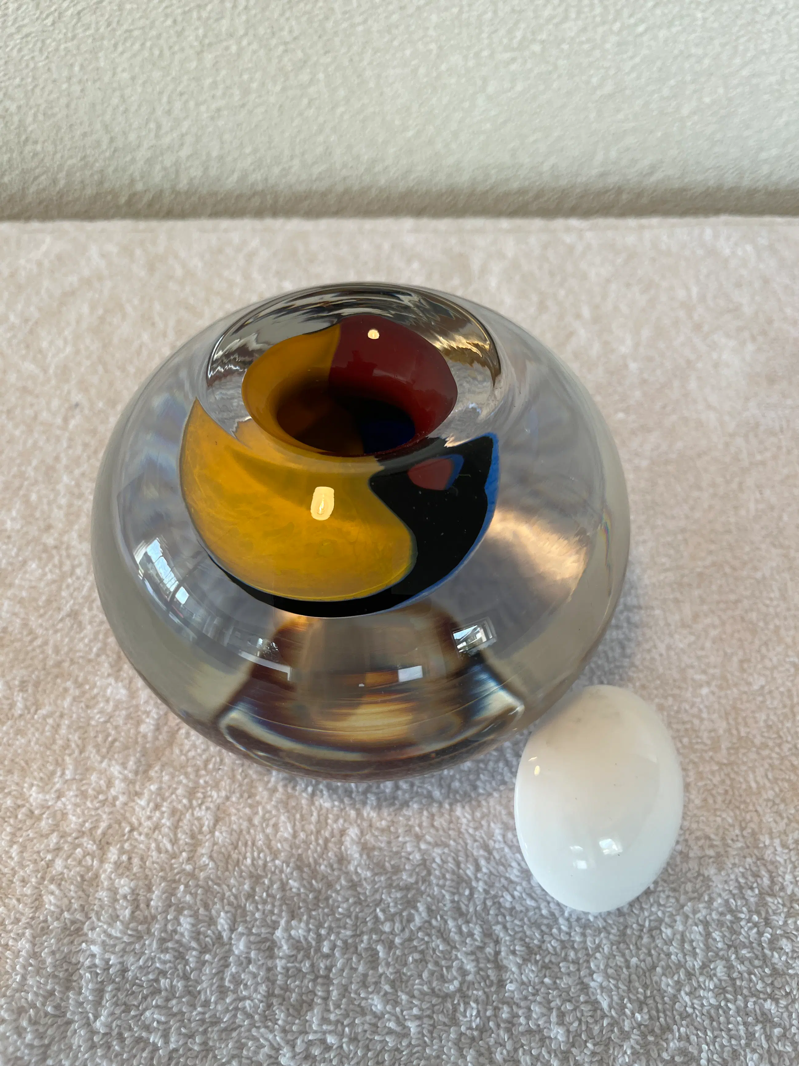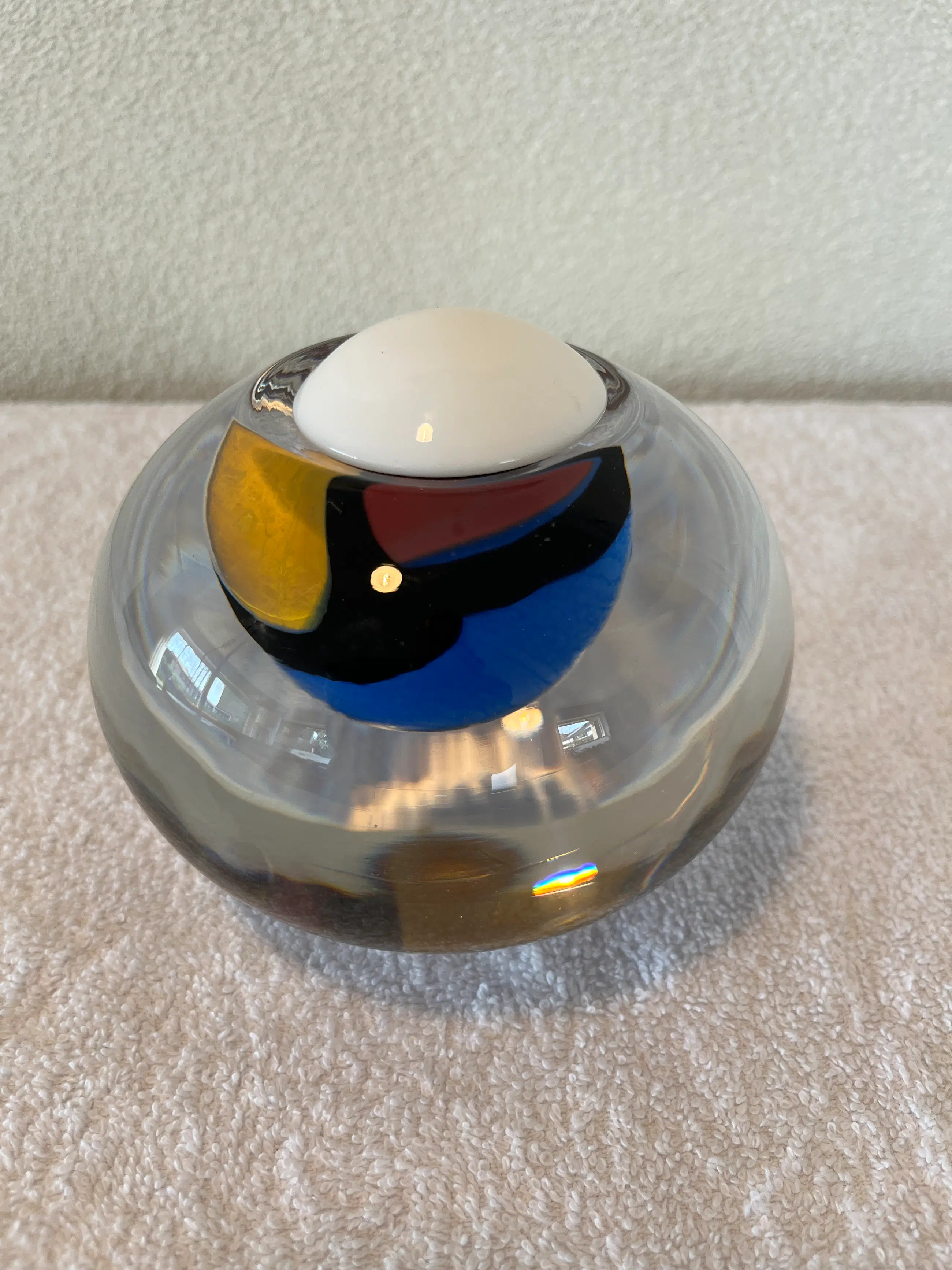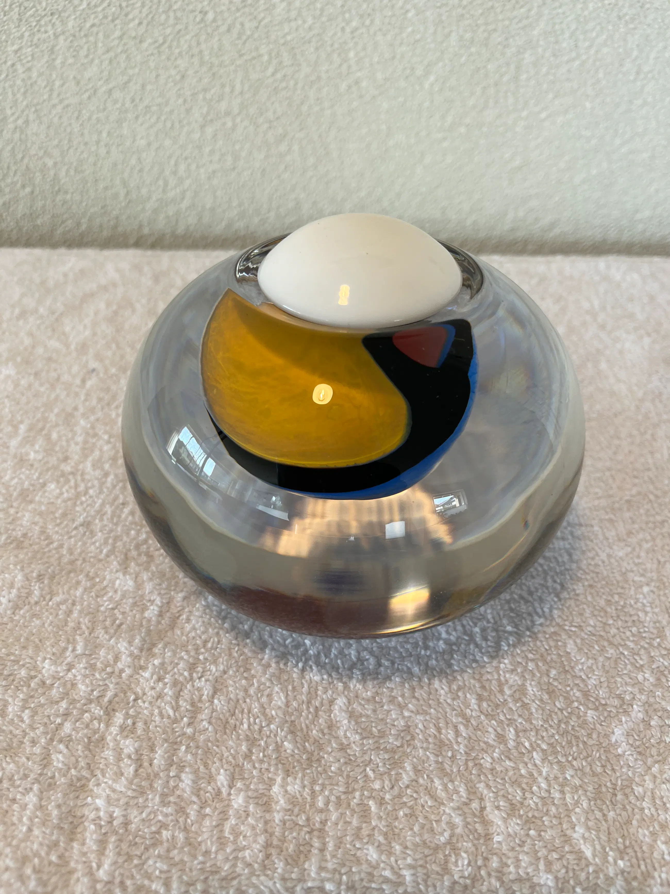 Object blauw/geel/rood/zwart in transparant, dekseltje wit (gesigneerd)