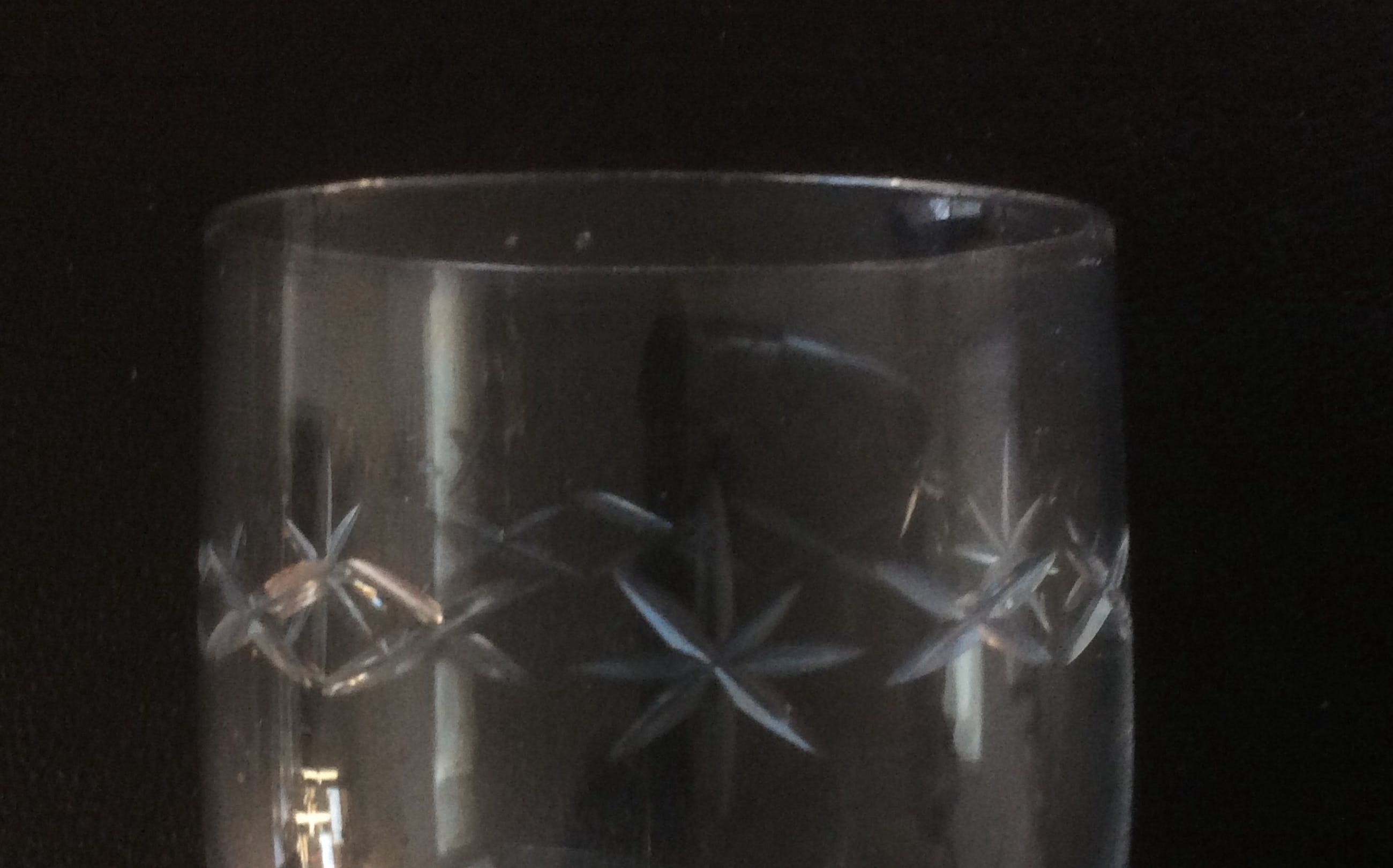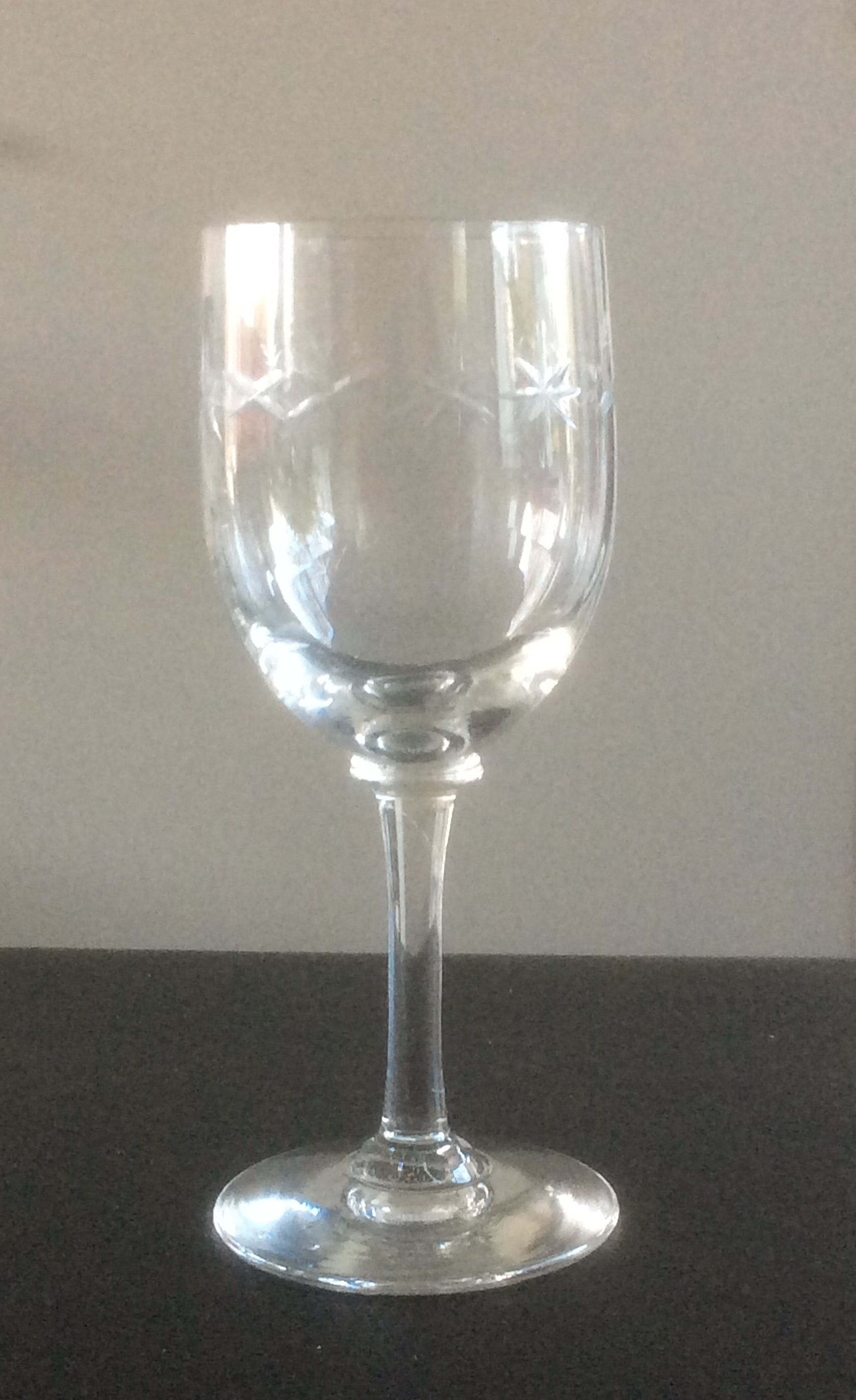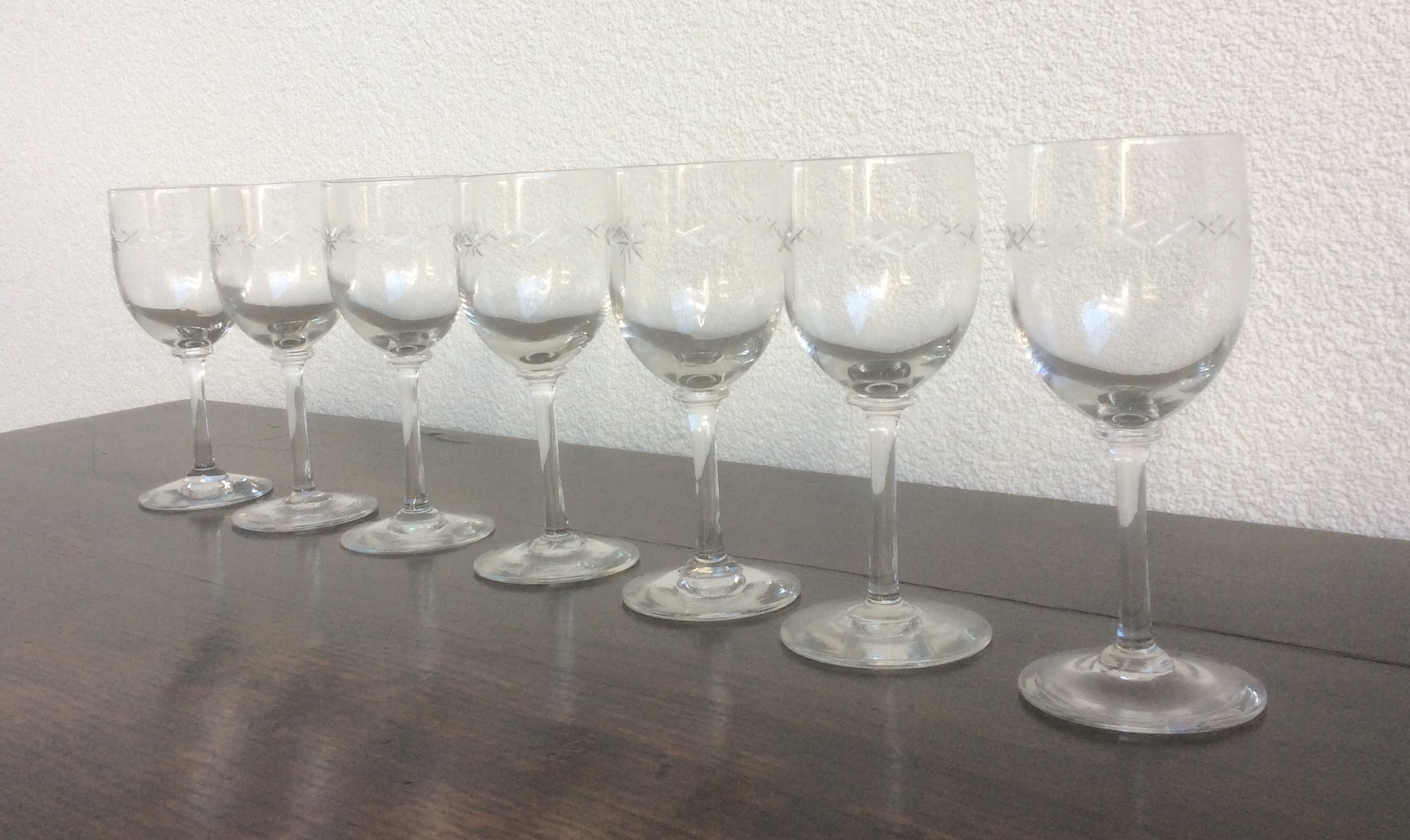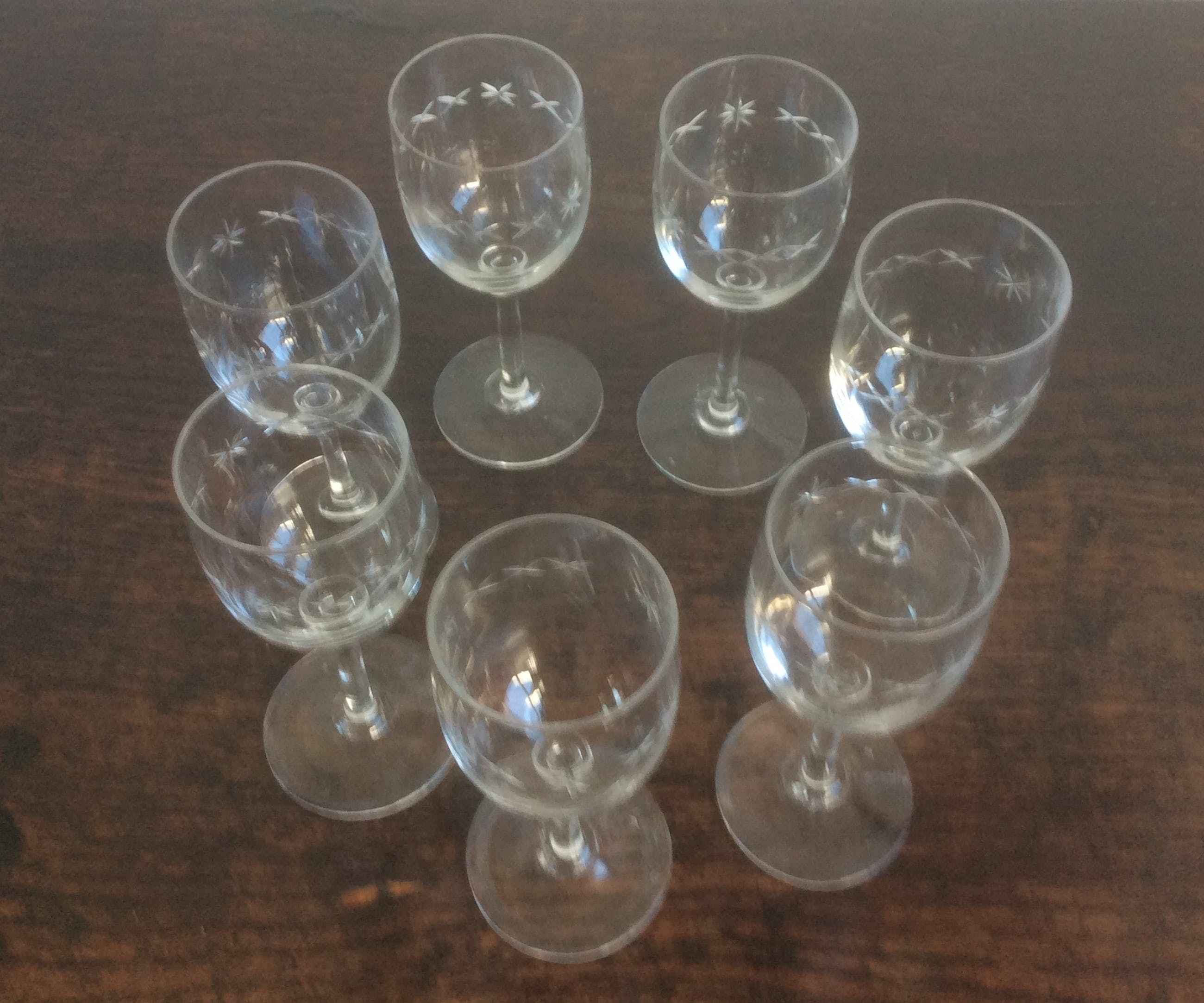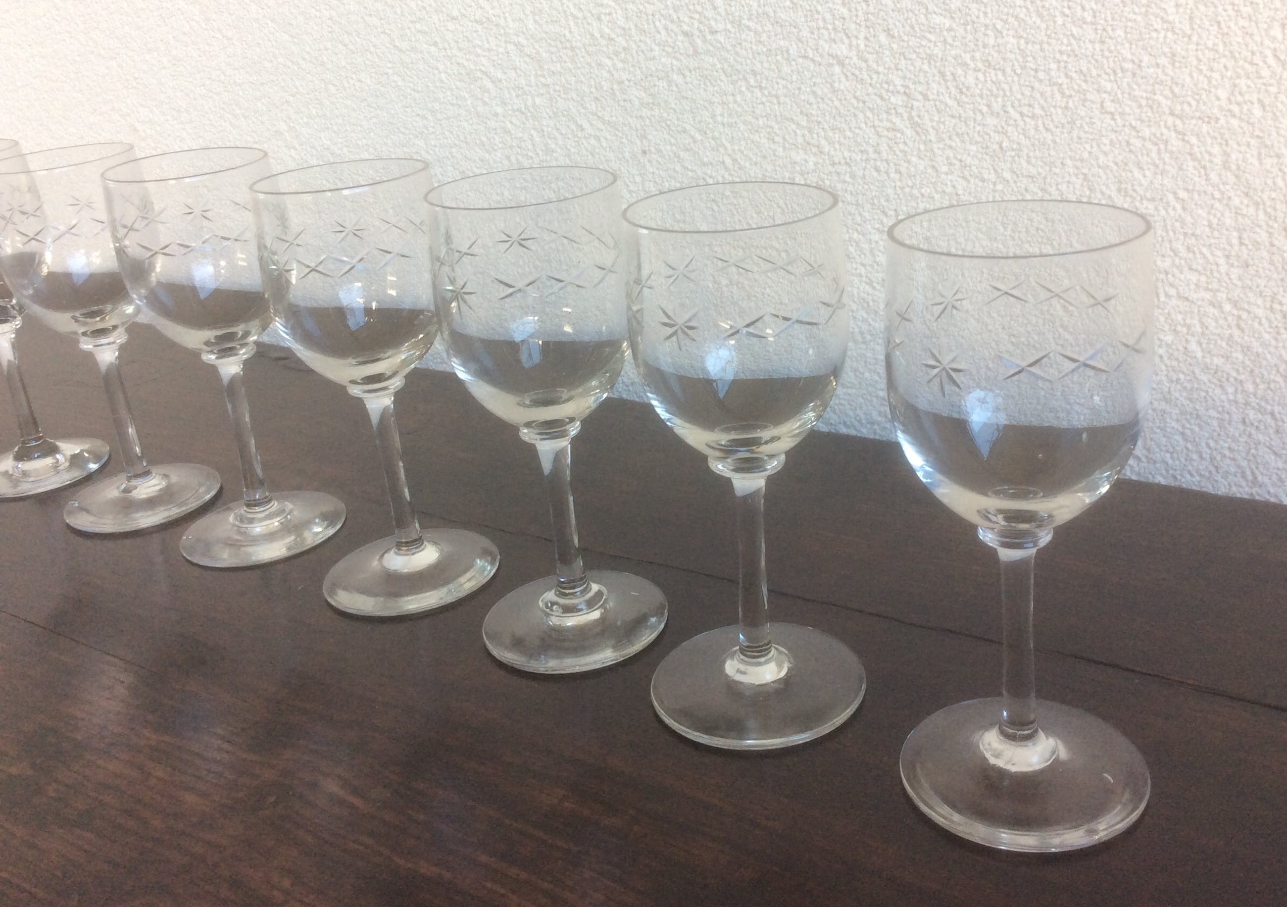 Zeven portglazen van Leerdam uit het begin van de vorige eeuw. In de glazen zit een ingeslepen patroon bestaande uit sterretjes en kruisjes. De glazen hebben een mooie aanzet tussen kelk en steel. (knoop) De hoogte van de glazen is 12,7 cm.