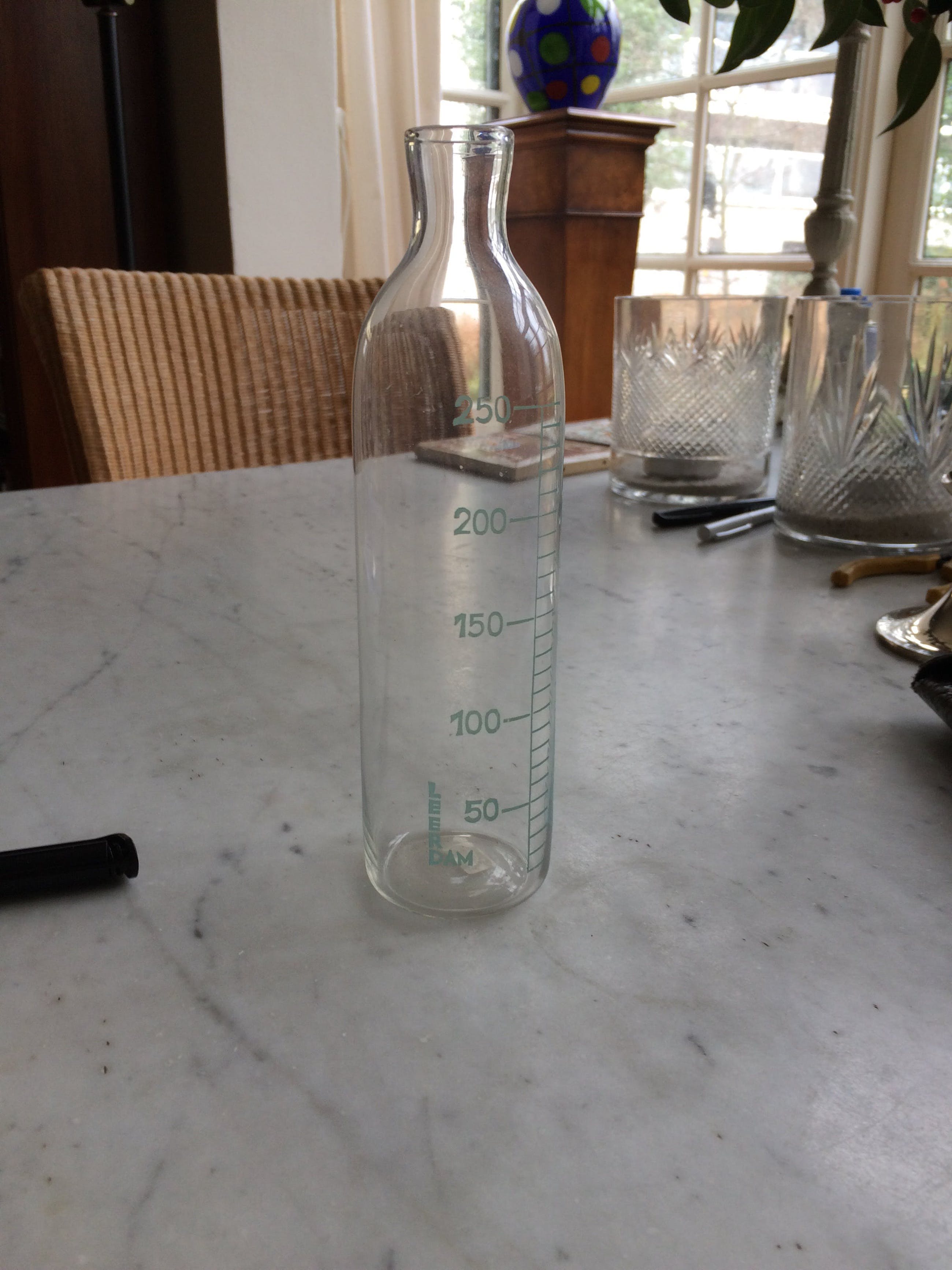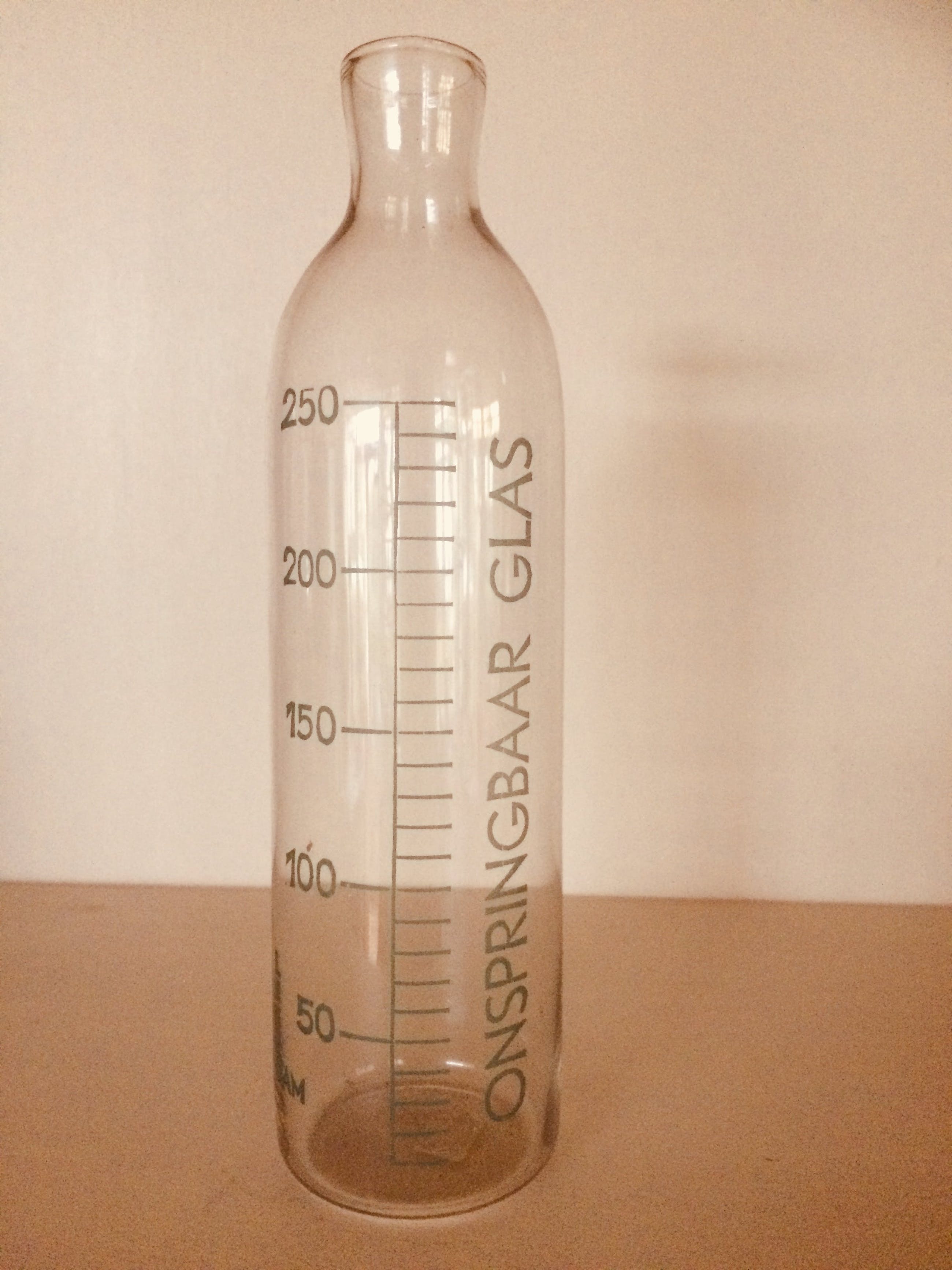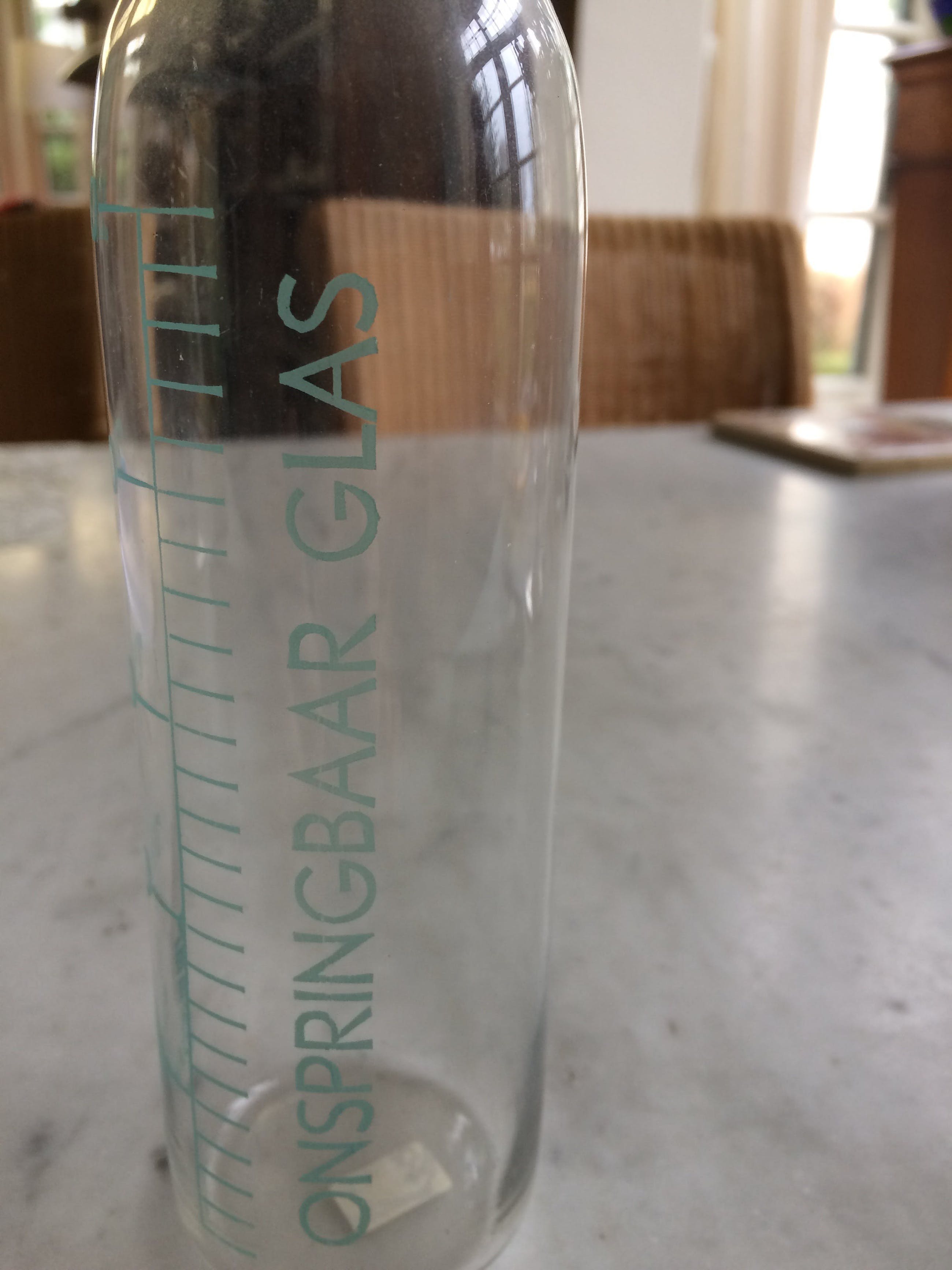 Mooie zuigfles gemaakt door de glas-fabrieken in Leerdam.Op de fles is achtereenvolgens het volgende vermeld :LEERDAM;de inhoudsmaten 50, 100, 150, 200 en 250. ( ml ) en in grote letters:ONSPRINGBAAR GLAS De conditie van de fles is zeer goed!Geen chips, geen aanslag.Een bijzonder item voor Leerdam- verzamelaars.Verzending per PostNL ( k.k. )Ophalen op afspraak.