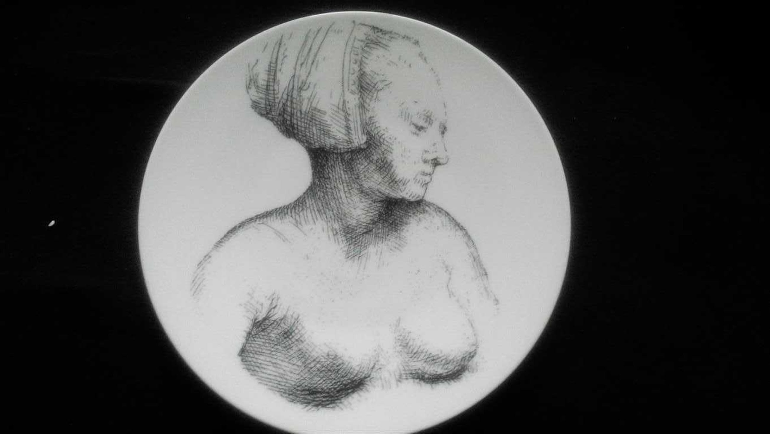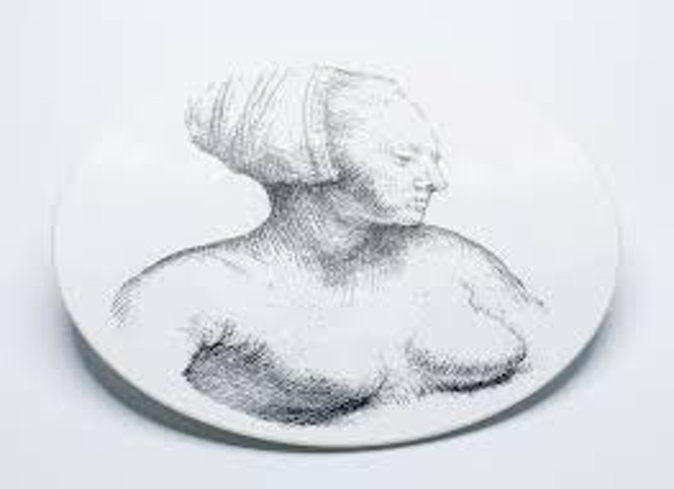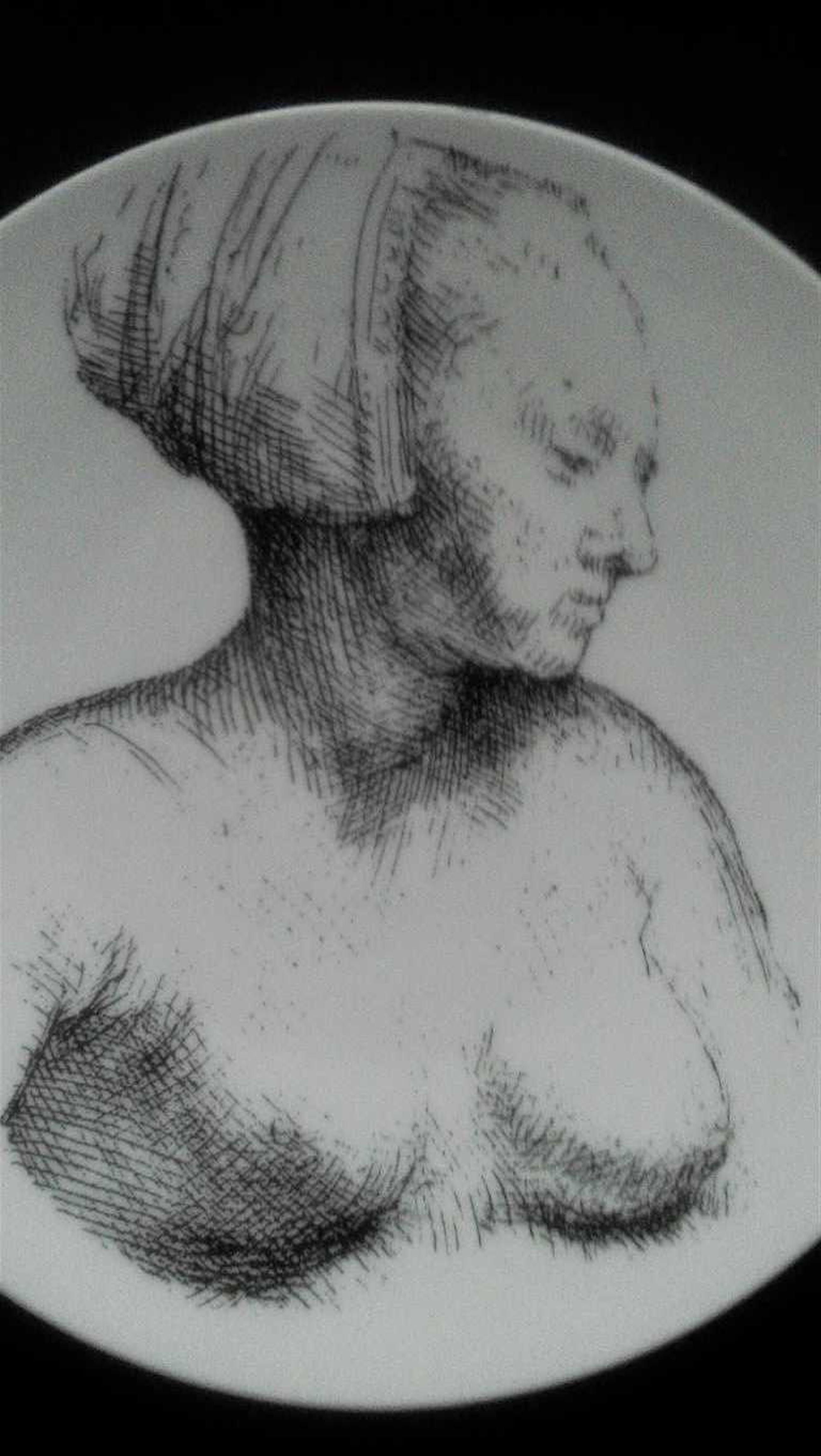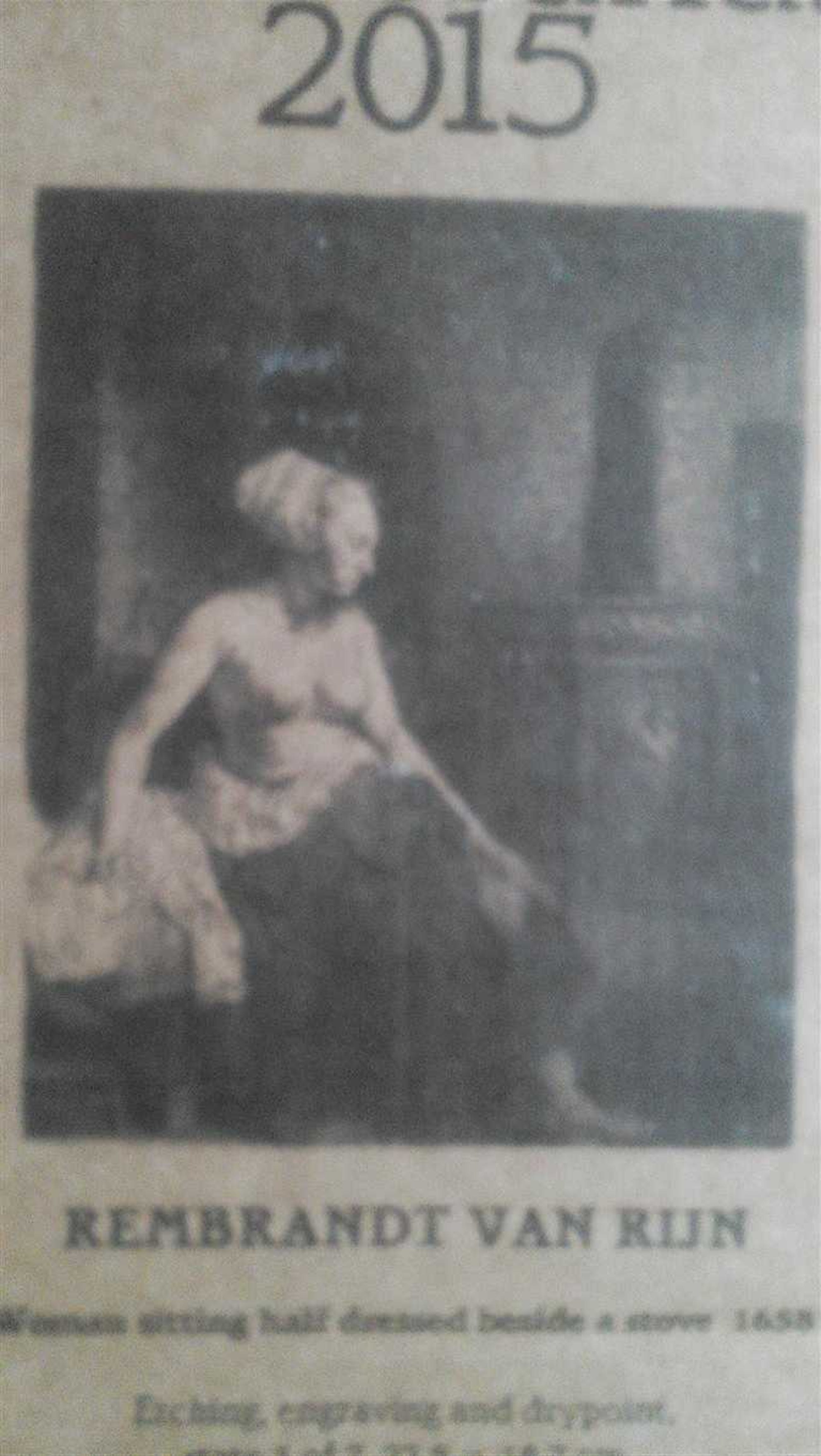 Plate decorated with an etching by Rembrandt B197 Woman sitting half dressed beside a stove, 1658. Etching, dry point and burin, state III (7), 22.8 x 18.7 cm. Around 1658 Rembrandt started to organize sessions of drawing from the female nude. His approach was realistic, as seen here in the casual pose. A detail of this etching is used as decoration on the plate.