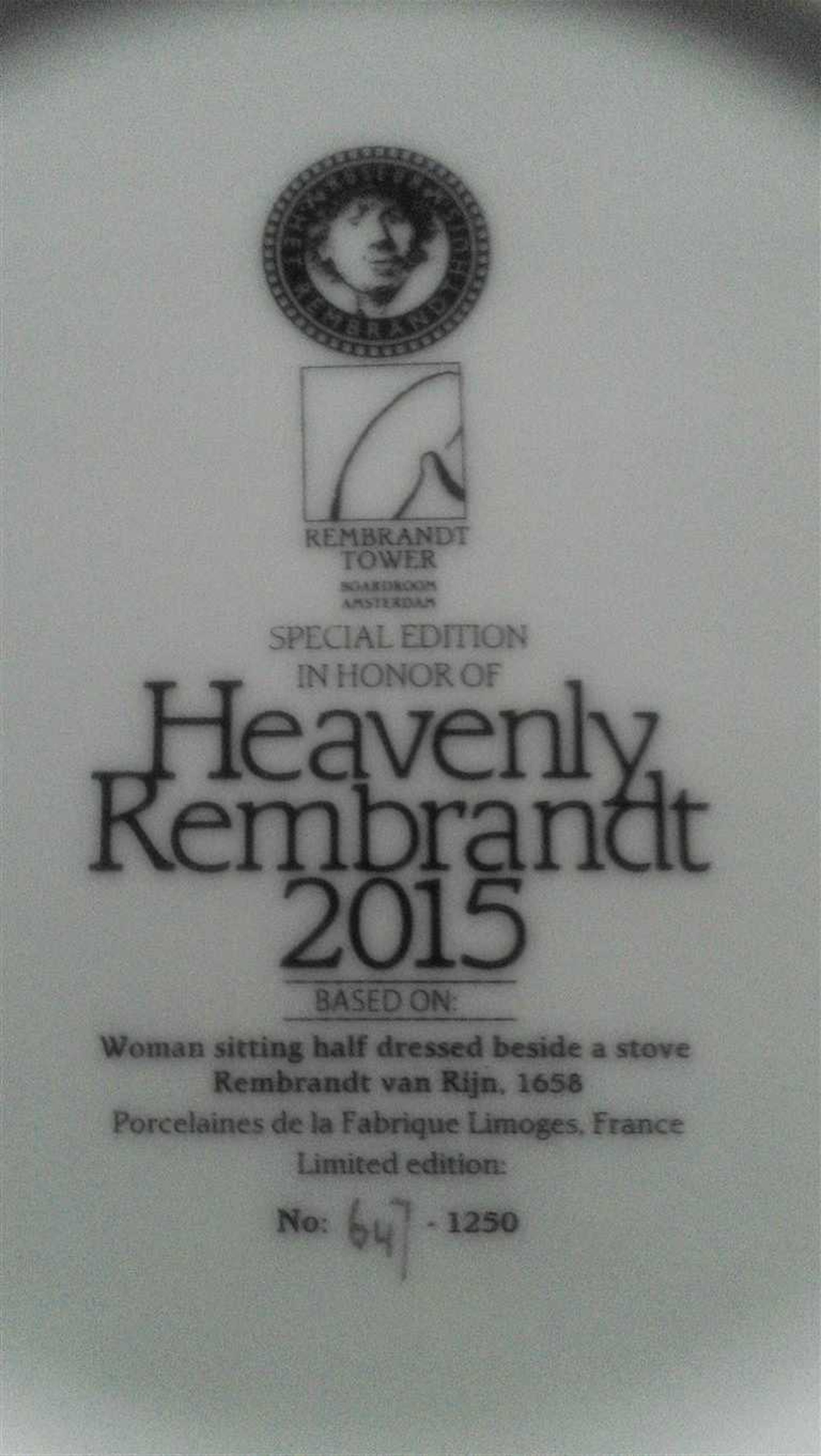 The plate is designed and produced for the Rembrandt Tower Boardroom Amsterdam for a special edition in honor of the dinner Heavenly Rembrandt 2015. It is a limited edition of 1250 pieces. Each plate is numbered.647/ 1250 Produced in the porcelain factory in Limoges, France. The plate has a diameter of 32 cm. Wrapped in a decorated cardboard gift box.