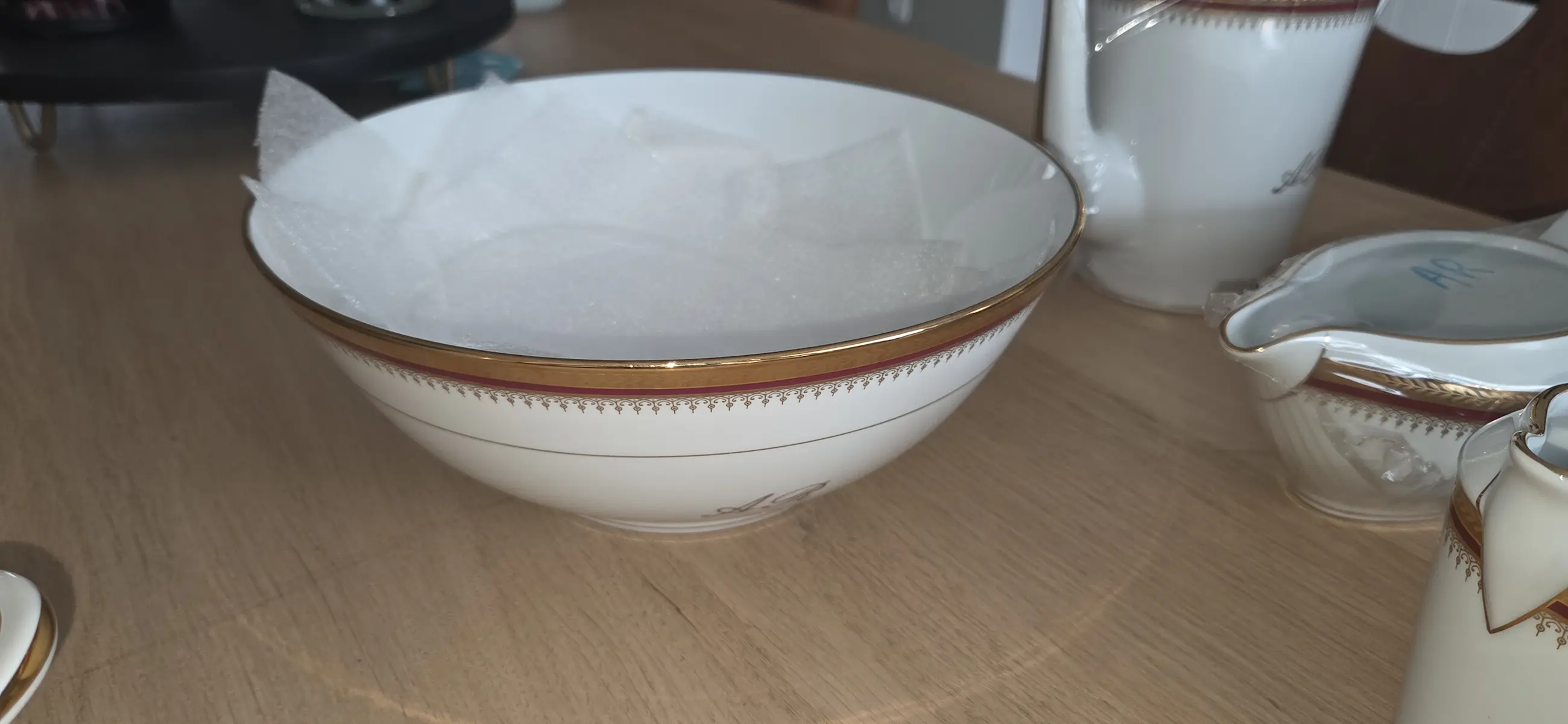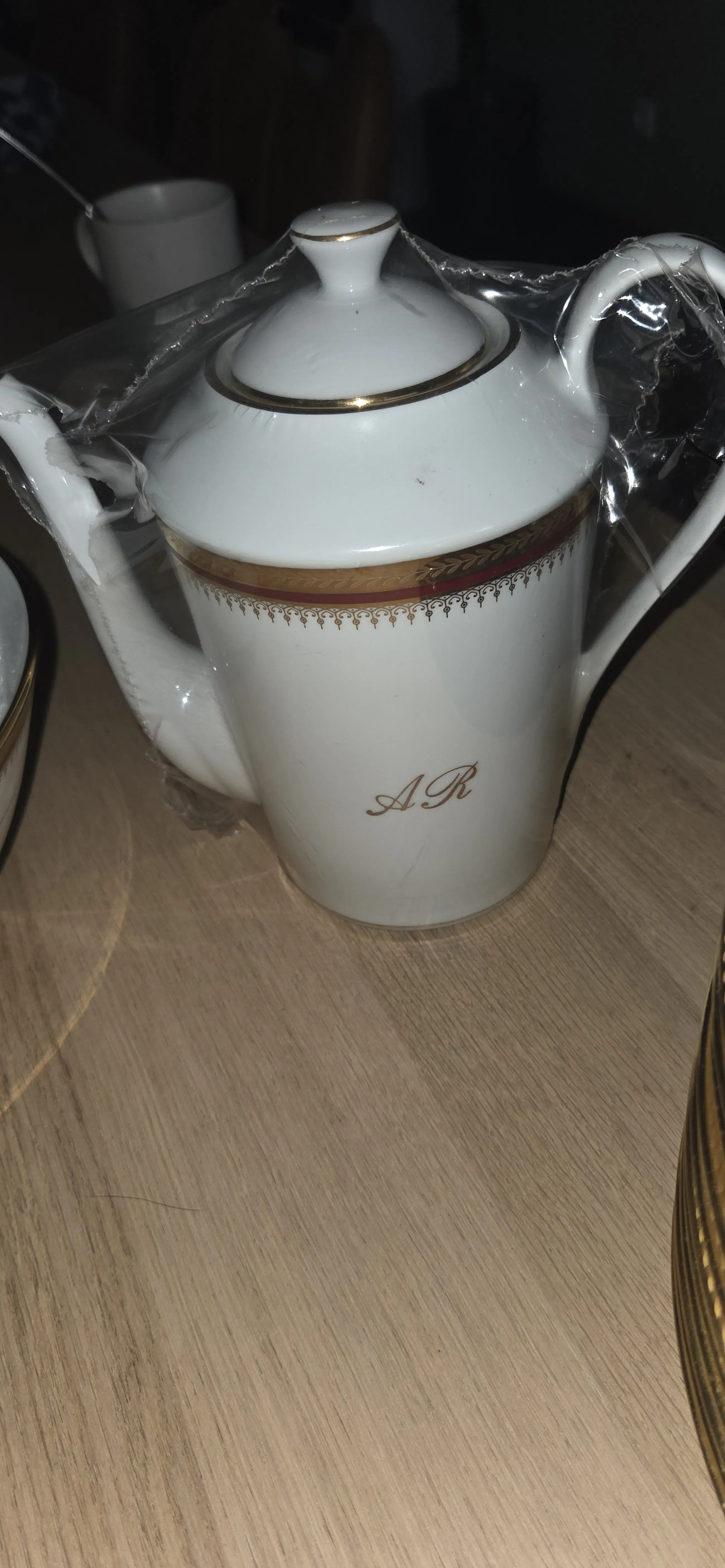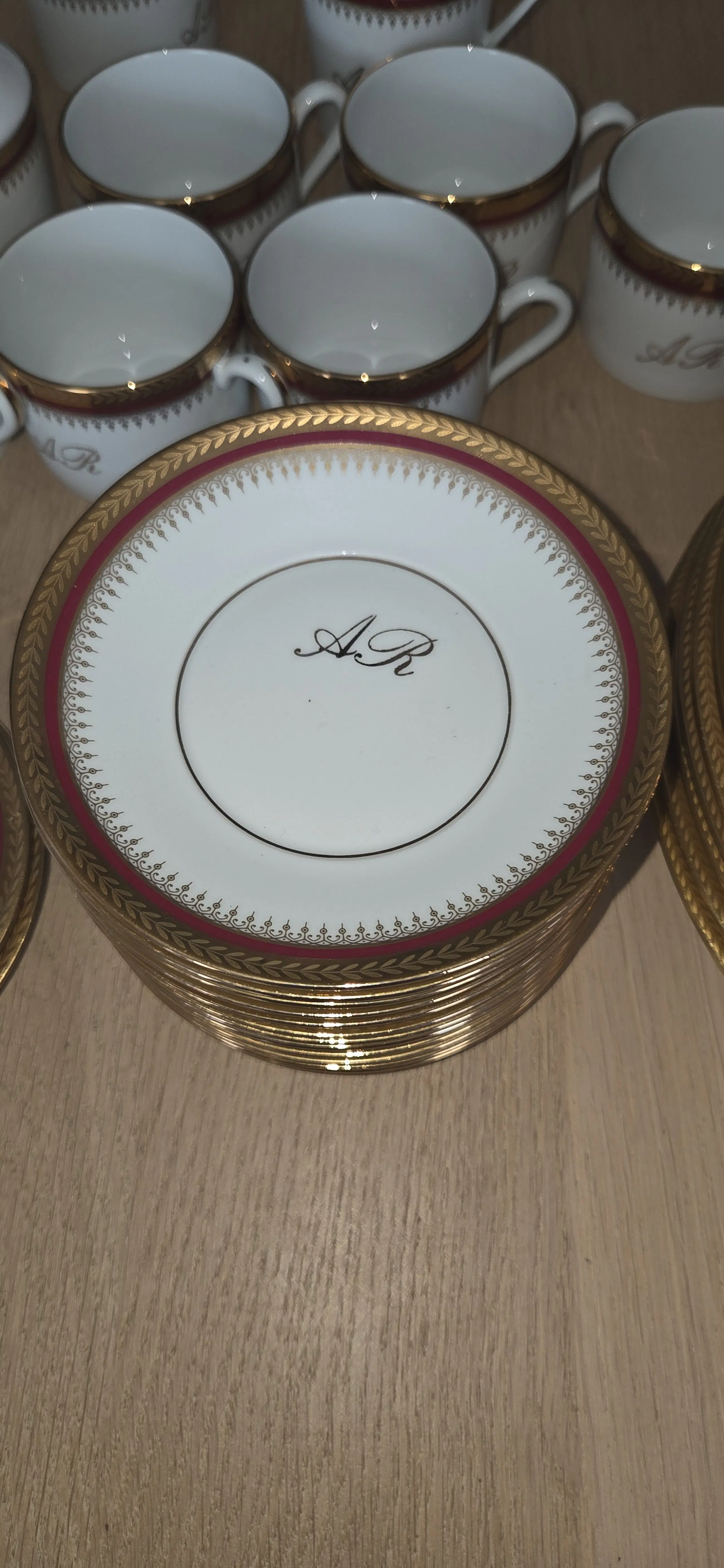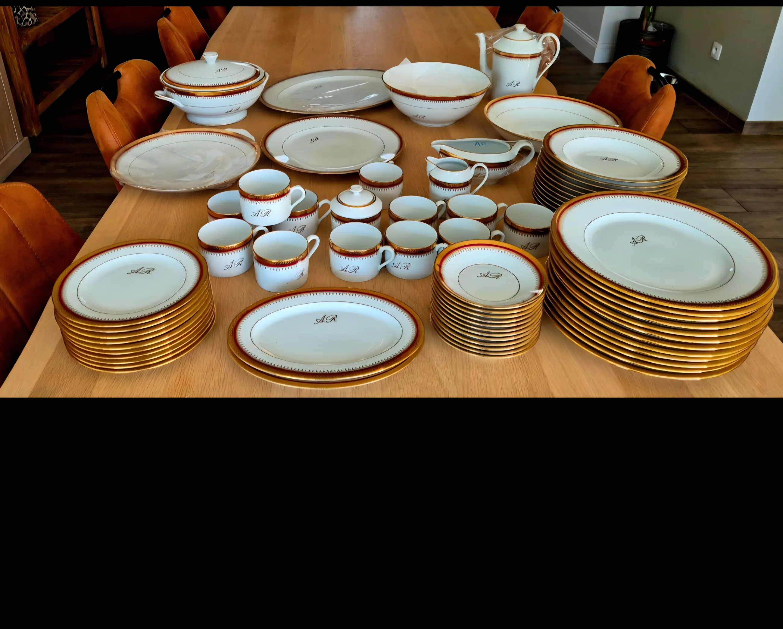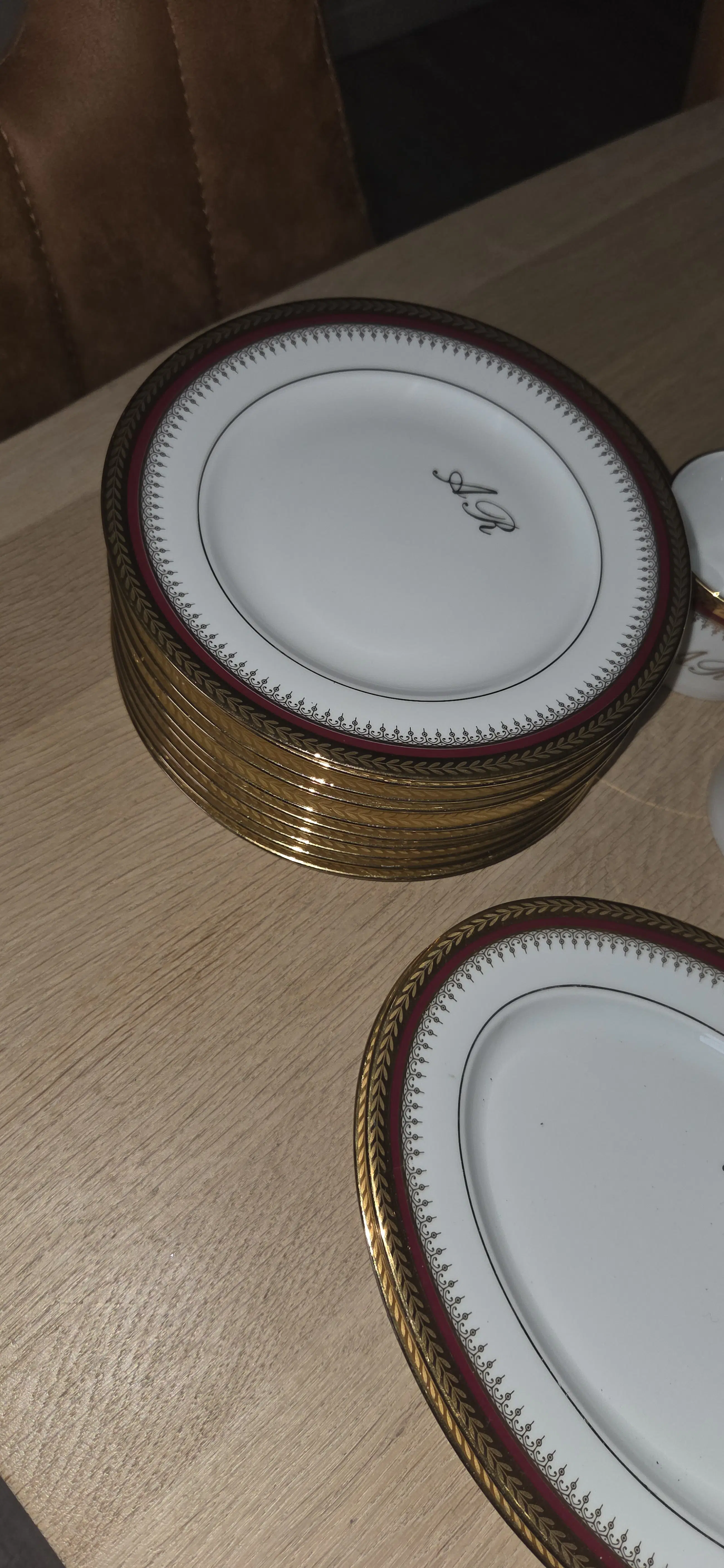 Porselein Servies Limoges Afgewerkt met goudblad. Initialen AR Van elke 12 stuks behalve dessertborden 10 stuks. Soeppan, koffiekan, suikerpot, melkkan schalen ...